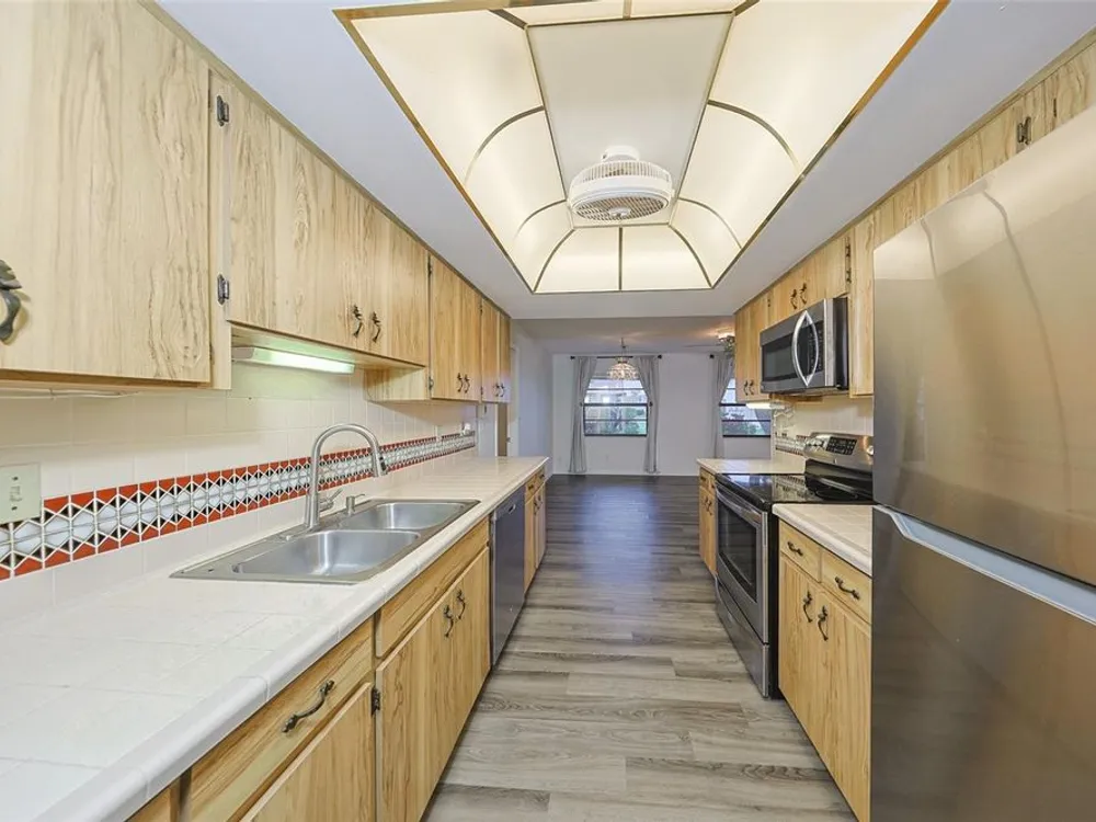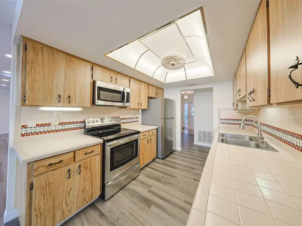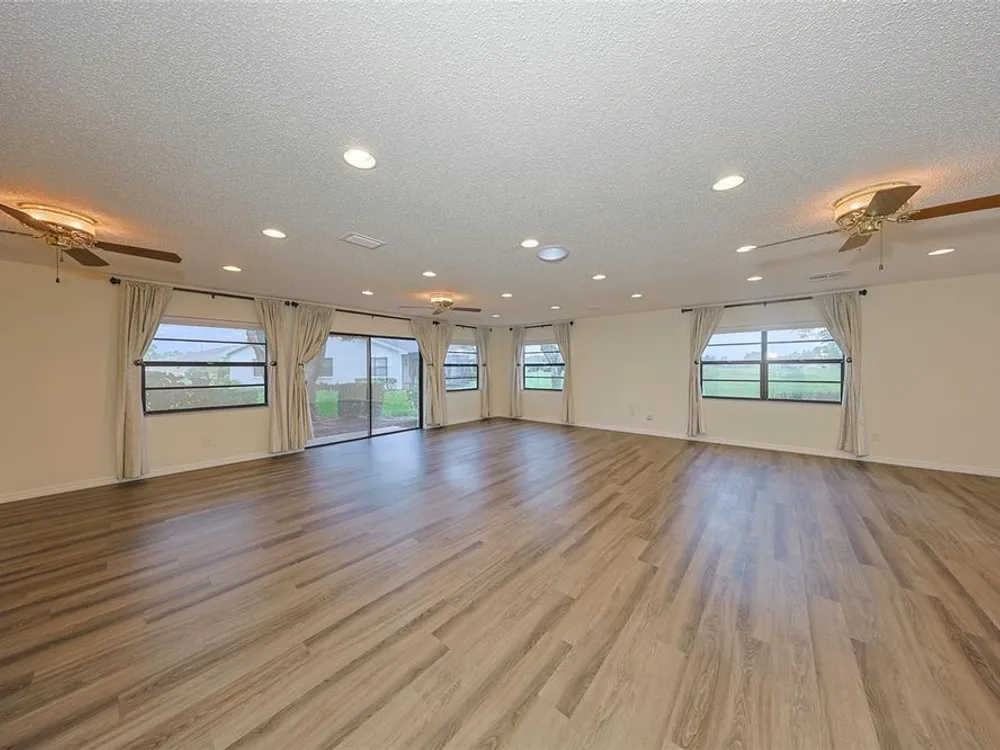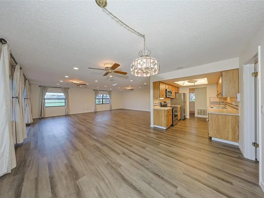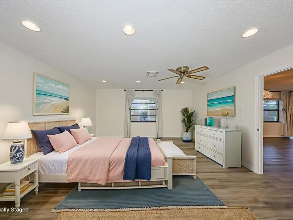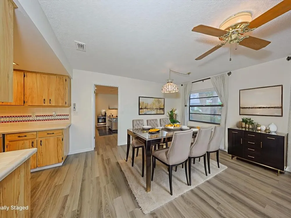 One or more photo(s) has been virtually staged. Discover abundant space and comfort in this expanded Sahara floor plan featuring a desirable split-bedroom layout. Situated in the Gated Community of Kings Point and a part of Sun City Center which was Recognized as the #1 Retirement Community for 2024 by Realtor.com and Travel + Leisure Magazine. This home has been nicely updated for modern living with expansive windows throughout the home offering peaceful views of surrounding green space. All windows have new blinds that may be raised from the bottom or lowered from the top for maximum flexibility. The garage is roomy enough for 2 cars and storage space. A fresh coat of paint was just completed for the exterior. Recent upgrades include new vanities in both the primary and guest bathrooms, luxury vinyl plank flooring (2022), a new electrical panel (2025), new roof (2025), new refrigerator (2025), hot water heater (2021), and HVAC system (2019). The generous primary suite boasts a custom-designed walk-in closet. All walls and ceilings have a fresh coat of paint. Enjoy your morning coffee or evening drink on the inviting screened front porch. Additional highlights include upgraded toilets with bidet attachments in both bathrooms and Updated LED recessed lighting with dimmer switches throughout the main living area. There is room on the back for the addition of a 10 X 25 Screened Lanai. Living in Kings Point means access to a truly resort-style lifestyle. Take advantage of world-class amenities including the North Clubhouse with indoor and outdoor pools, spas, and Veterans Theatre. The South Club has both indoor and outdoor pools and SPA/Hot tub, the popular Sports Bar for watching your favorite team and Palm Court Cafe for breakfast lunch and dinner, plus a fitness center and stained glass studio. Then there is the Nantucket Pool for quiet relaxation and another SPA/Hot tub. The 2020 Centre houses the Ladies Serenity SPA plus a world class fitness center. Other activities include pickleball, golf, lawn bowling, billiards, cards, model railroad, stained glass, pottery, and live shows at the Veterans Theater. The entire community is golf cart accessible for convenient access to shopping, medical facilities, and social events. Luxury, comfort, and community await, welcome to your new home!