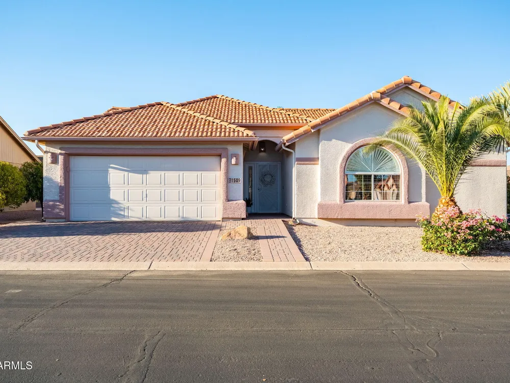 Stunning Catalina model in Sunbird Golf Resort! Rare 3 bed/2 bath home on a desirable corner cul-de-sac lot with over 1900 SF. Beautifully styled w/vaulted ceilings, tile floors, updated kitchen. Granite counters, wood cabinets w/pull-out shelves, breakfast bar, stainless appliances & indoor laundry. Bathrooms are updated, and primary suite offers dual sinks & huge double closet. Large great room, 2-car garage w/cabinets, water softener. Low-maintenance backyard w/extended covered/paved patio, multiple seating areas—perfect for enjoying AZ evenings. Newer A/C (2023). This 55+ active adult community features 18-hole golf, 2 pools, tennis, pickleball, restaurant/bar, fitness center, billiards, game rooms, clubs, & more! Move-in ready to enjoy resort-style living!