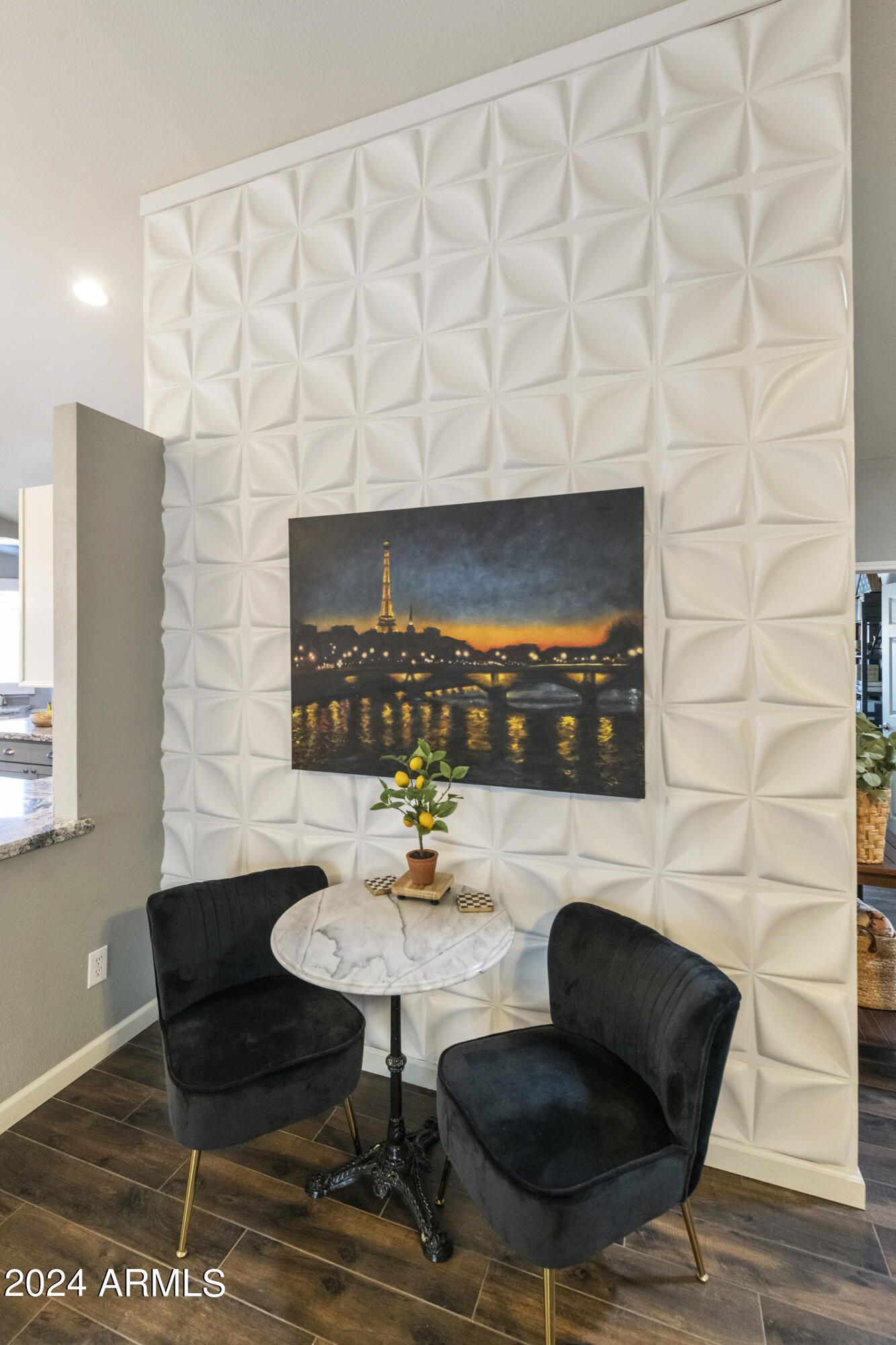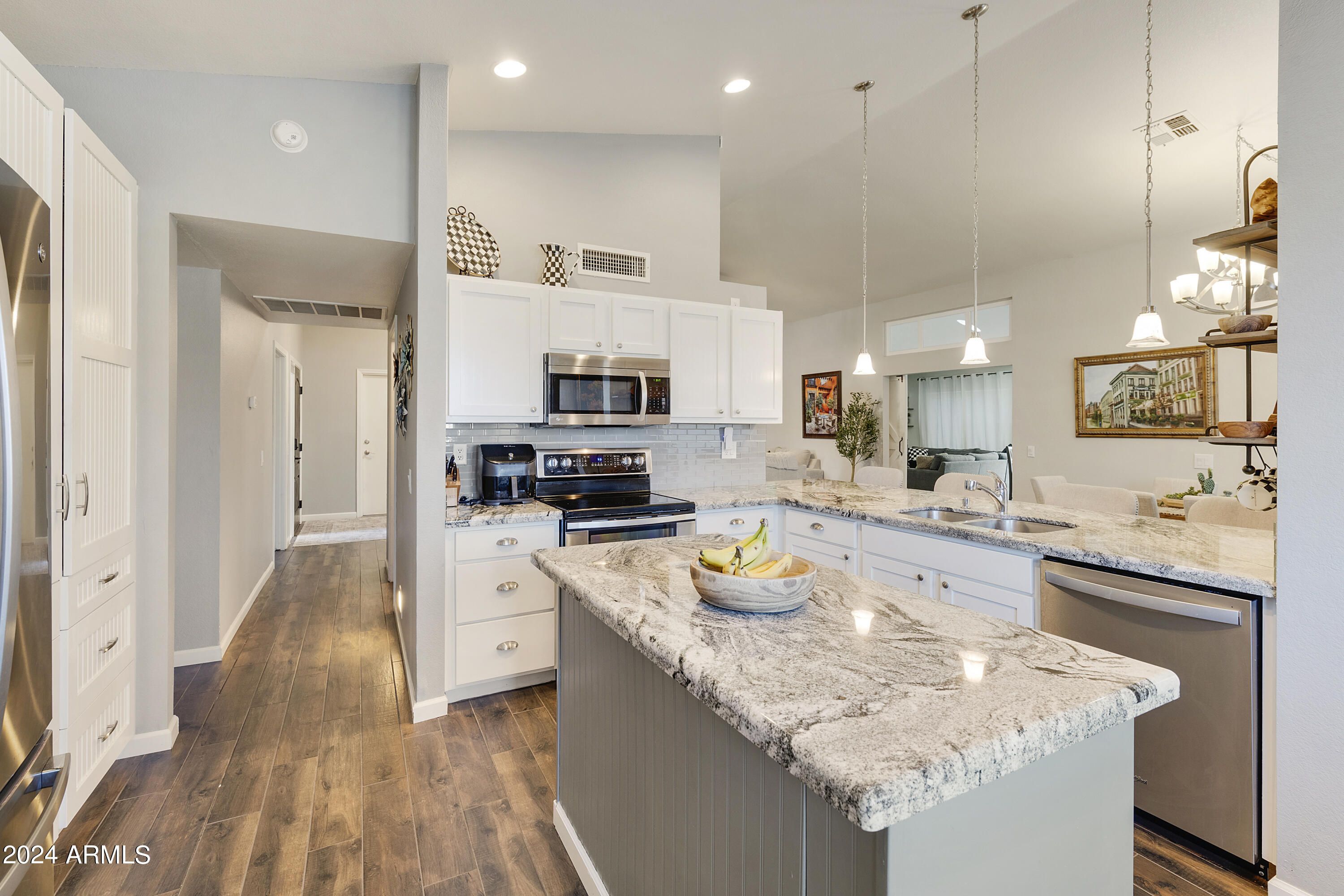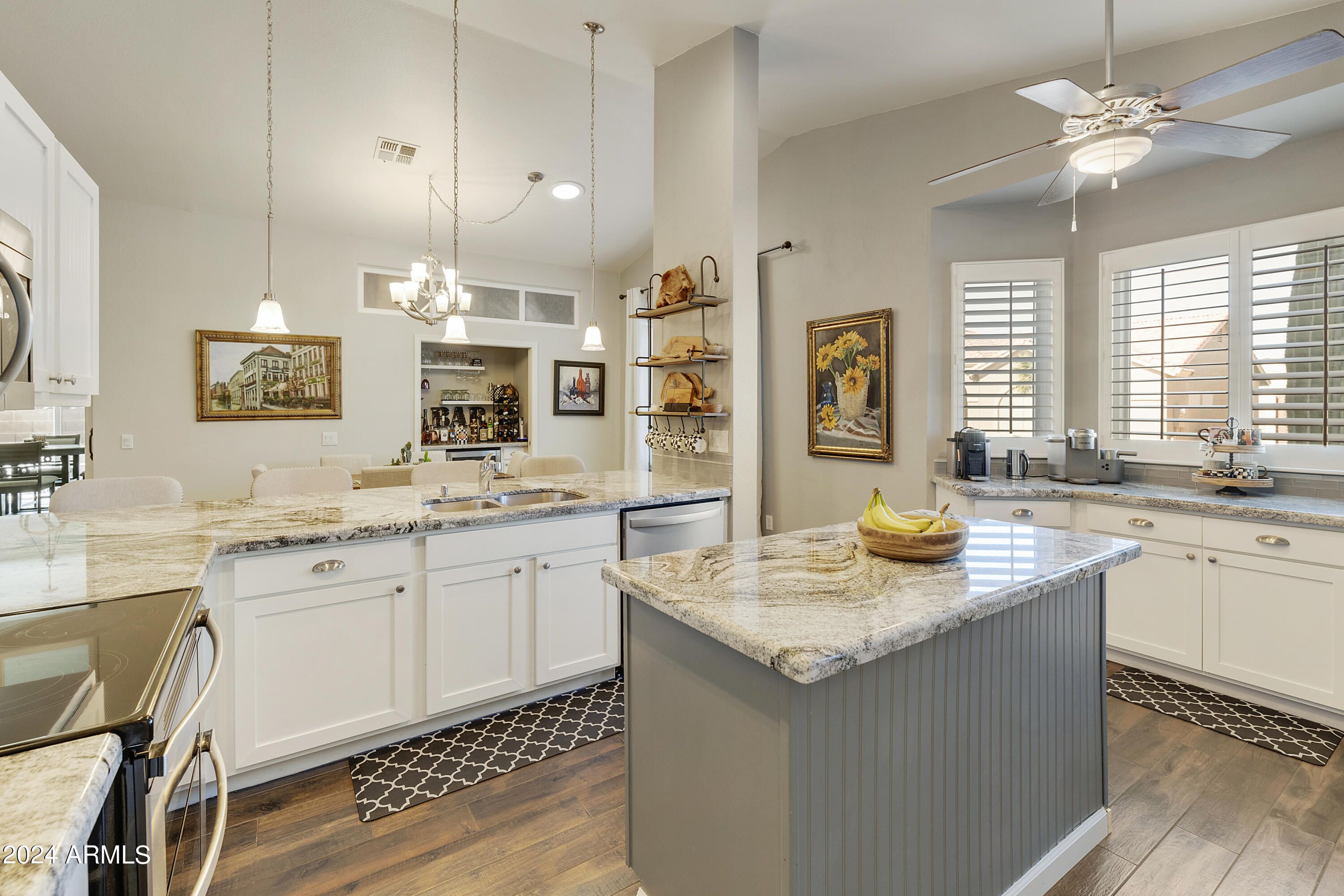 Welcome home to this gorgeously redone 3BR 2BA home in the vibrant active adult community of Sunbird CC. A charming courtyard greets you. Enter a large living/dining area with wood look tile throughout. The stunning kitchen boasts granite counters, crisp white cupboards, bar and newer SS appliances. Large family room with access to the relaxing patio and backyard. Bonus art studio den just off the family room. Enjoy the active adult resort lifestyle with golf, pool, tennis and pickleball. Plus, restaurant, bar and loads of entertainment!