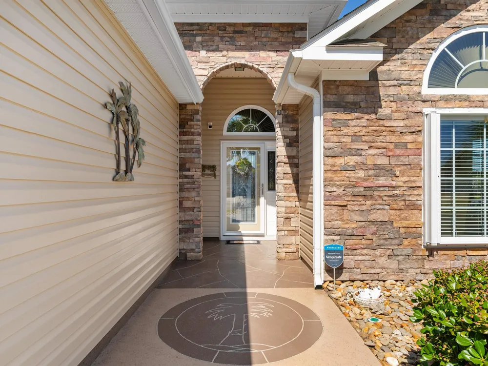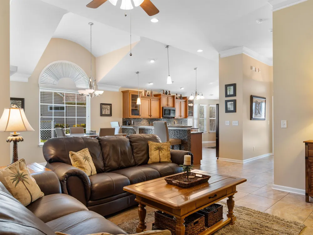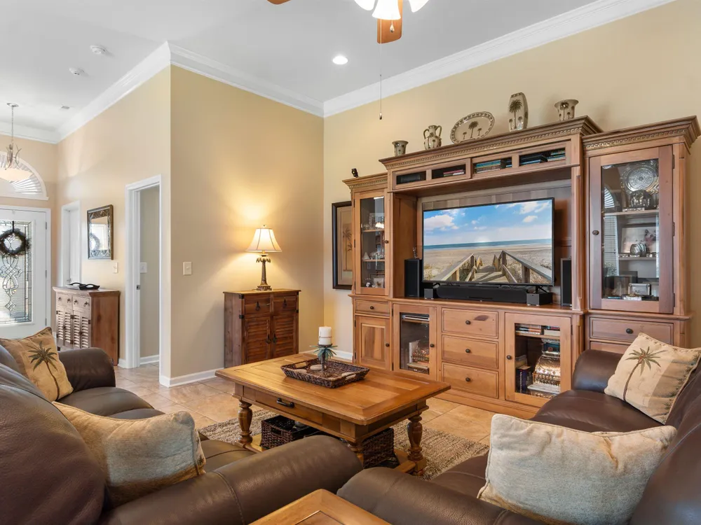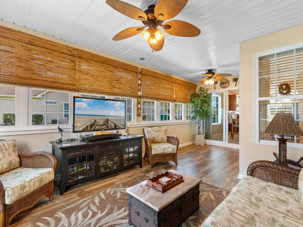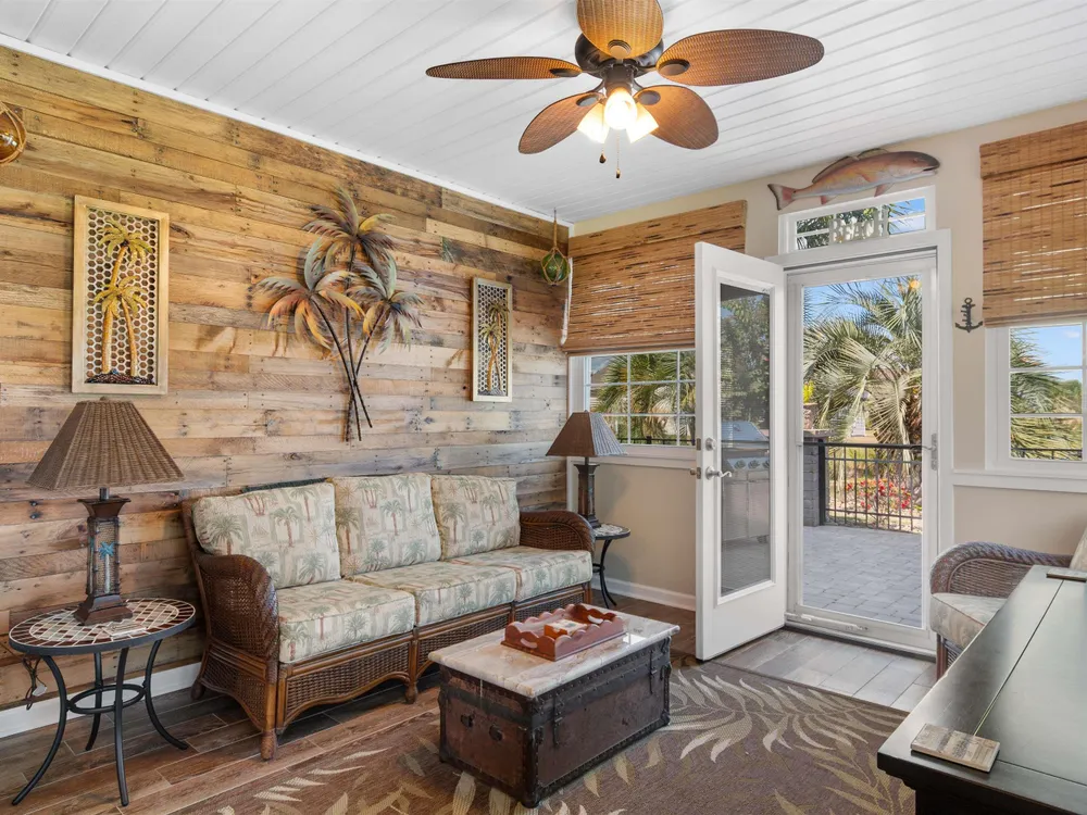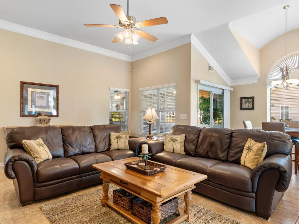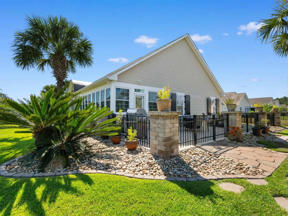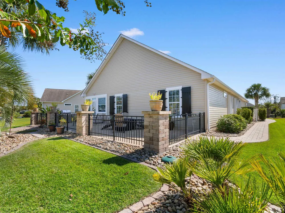 Spectacular coastal living at its finest! This meticulously maintained 3-bedroom, 2-bath home offers comfort, style, and convenience in a desirable gated community, Surfside Beach Club. The open layout is complemented by a bonus Carolina room overlooking a tranquil pond, perfect for relaxing with a view. Step outside to enjoy a beautifully landscaped yard featuring paver patio & walkway, river rock accents, lush green grass, palm trees, and a fenced backyard on a private cul-de-sac. Pride of ownership shines throughout this one-owner home, with upgrades including a new roof (2021), hurricane shutters, home generator, epoxy-coated garage floor, and copper roof accents over the front entry. Architectural touches like barrel ceilings, crown molding, and custom accent wall in the Carolina room add a touch of elegance. Enjoy resort-style amenities with access to the community pool, clubhouse, and fitness center. Enjoy a golf cart ride to the amentities or to the beach. This property blends everyday convenience with coastal charm—ready for its next owner to enjoy!