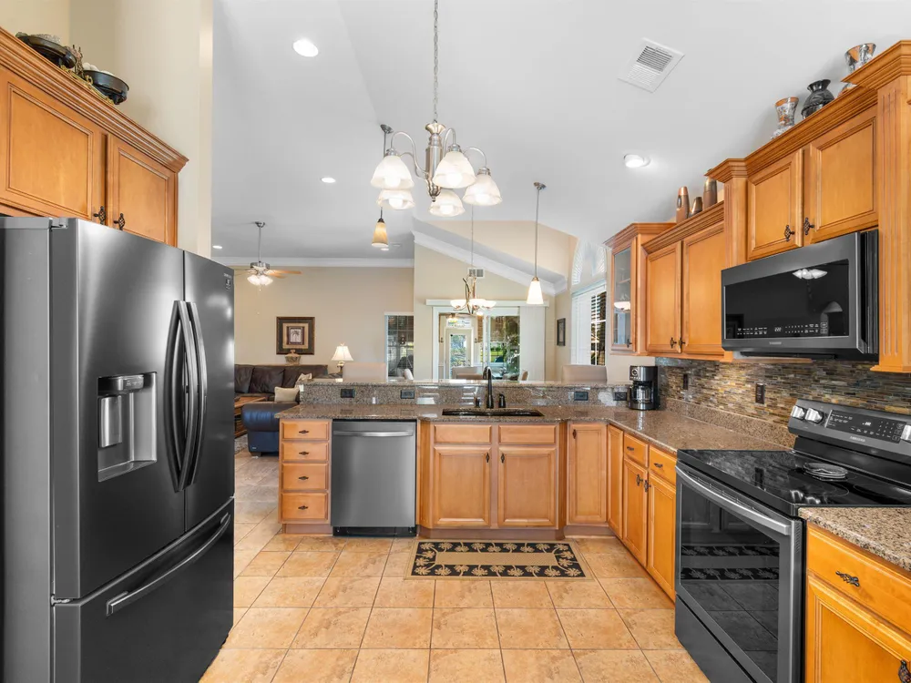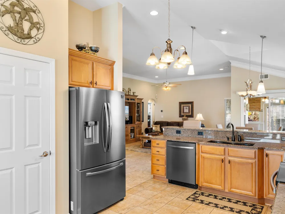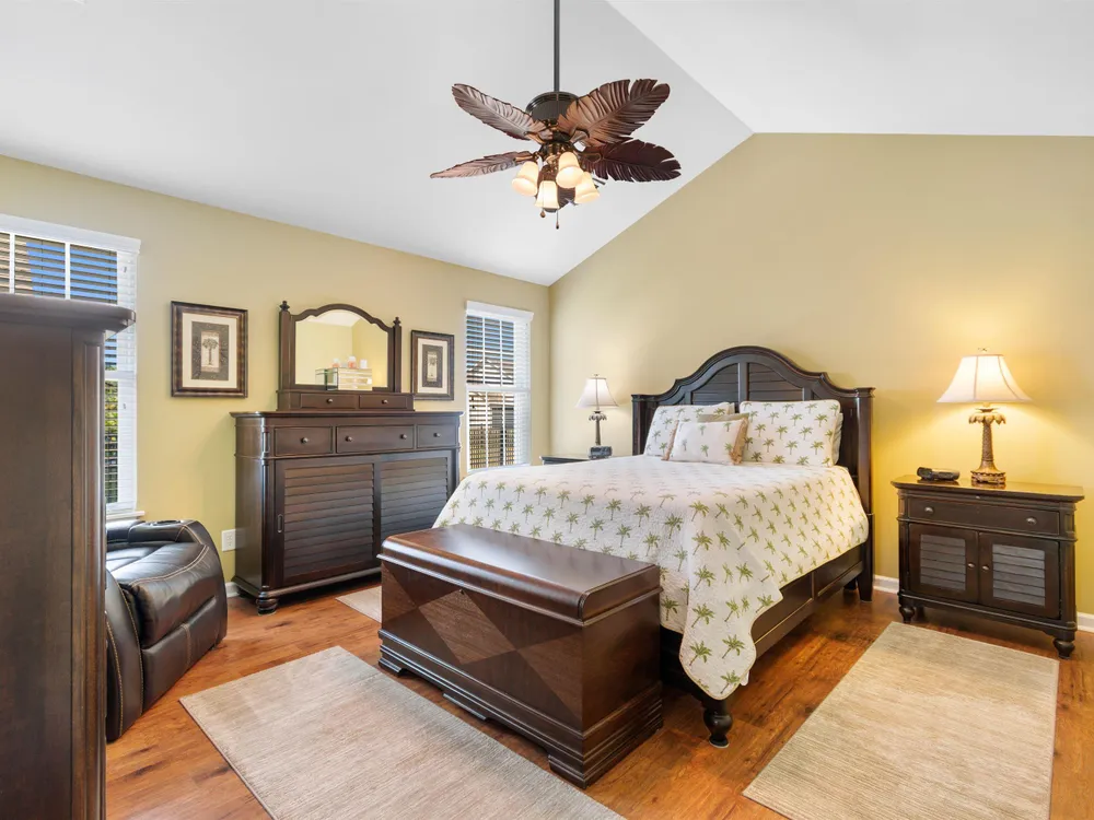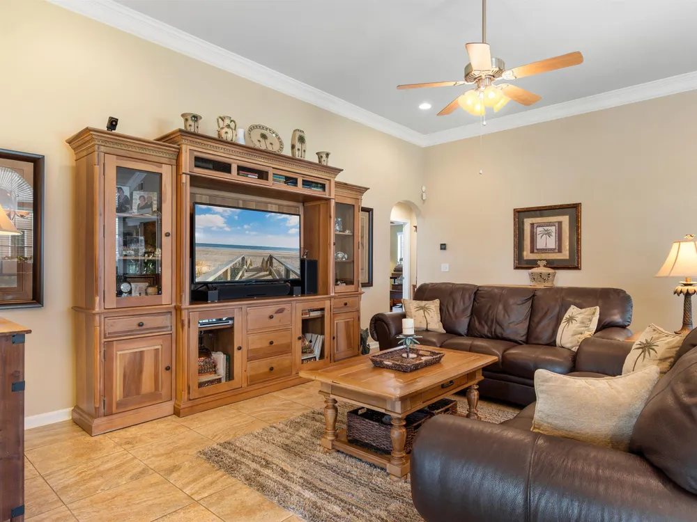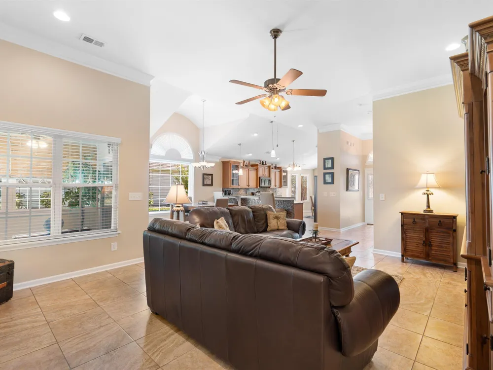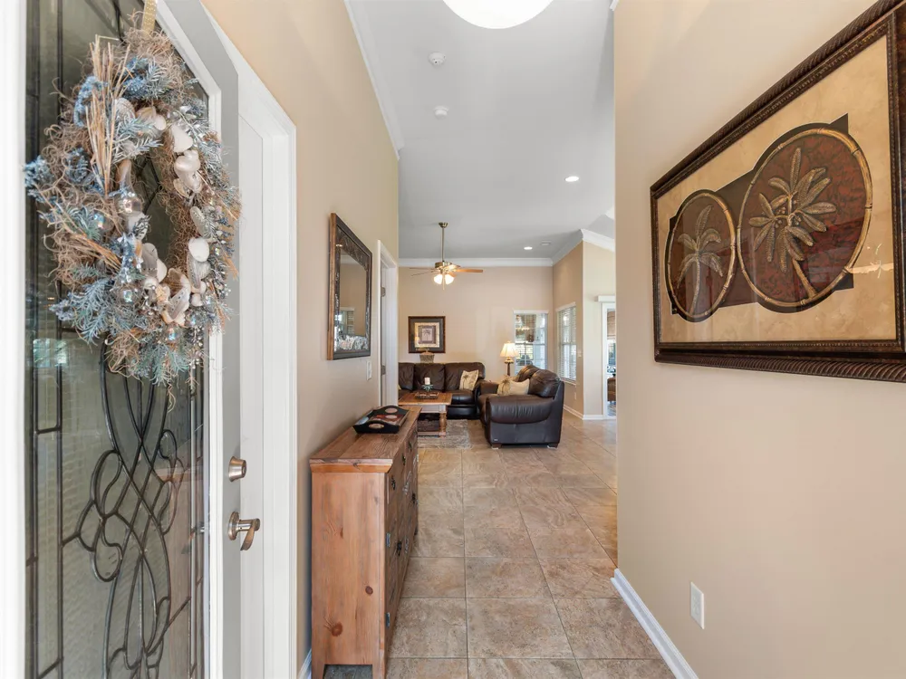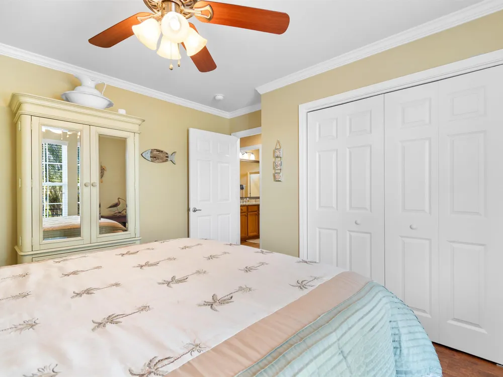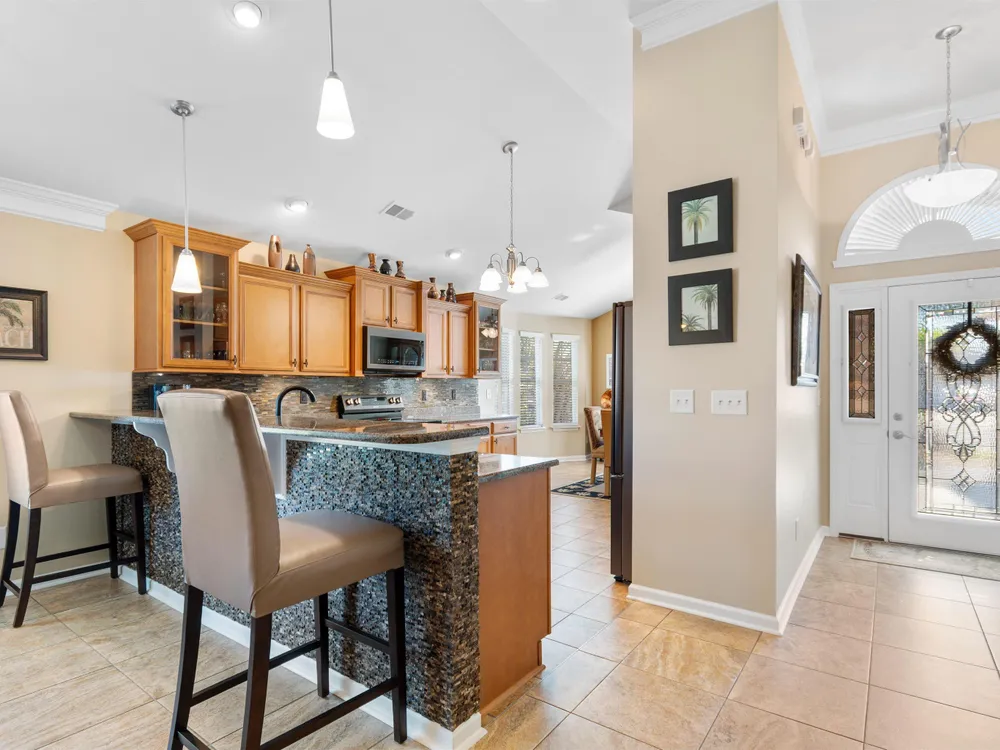Spectacular coastal living at its finest! This meticulously maintained 3-bedroom, 2-bath home offers comfort, style, and convenience in a desirable gated community, Surfside Beach Club. The open layout is complemented by a bonus Carolina room overlooking a tranquil pond, perfect for relaxing with a view. Step outside to enjoy a beautifully landscaped yard featuring paver patio & walkway, river rock accents, lush green grass, palm trees, and a fenced backyard on a private cul-de-sac. Pride of ownership shines throughout this one-owner home, with upgrades including a new roof (2021), hurricane shutters, home generator, epoxy-coated garage floor, and copper roof accents over the front entry. Architectural touches like barrel ceilings, crown molding, and custom accent wall in the Carolina room add a touch of elegance. Enjoy resort-style amenities with access to the community pool, clubhouse, and fitness center. Enjoy a golf cart ride to the amentities or to the beach. This property blends everyday convenience with coastal charm—ready for its next owner to enjoy!