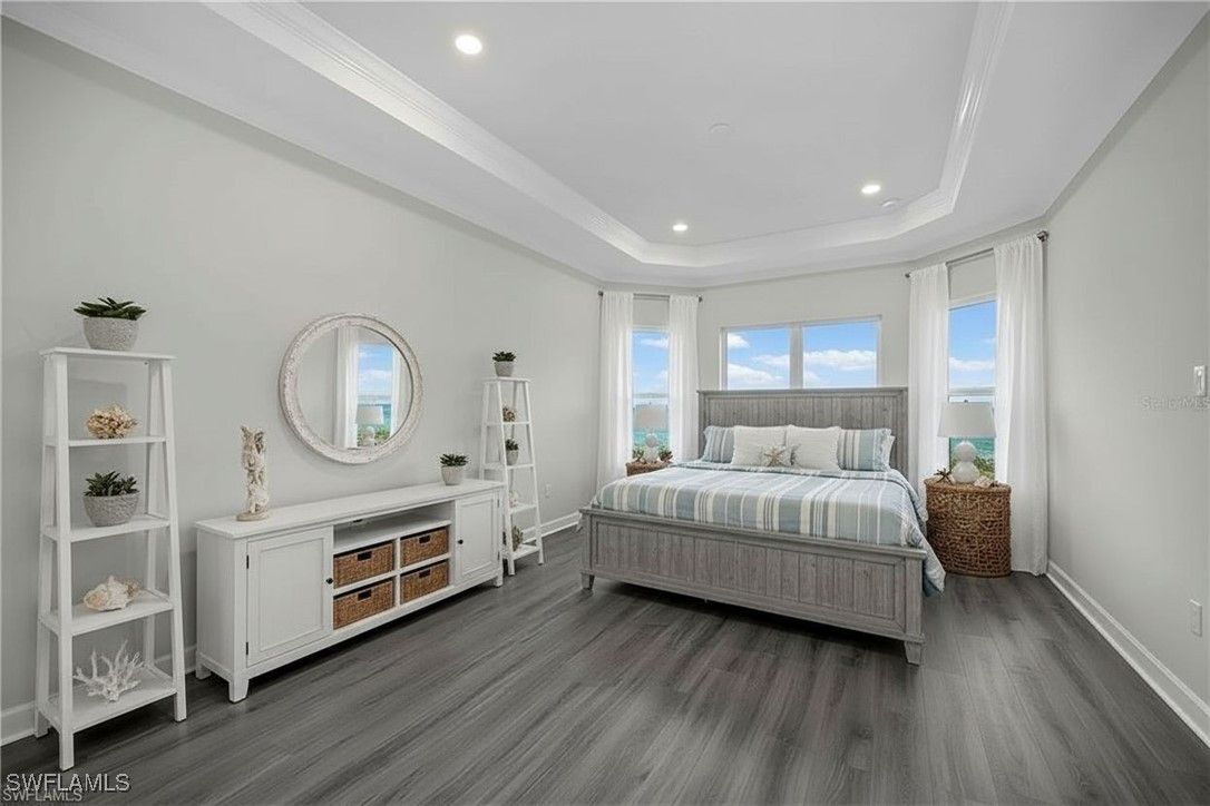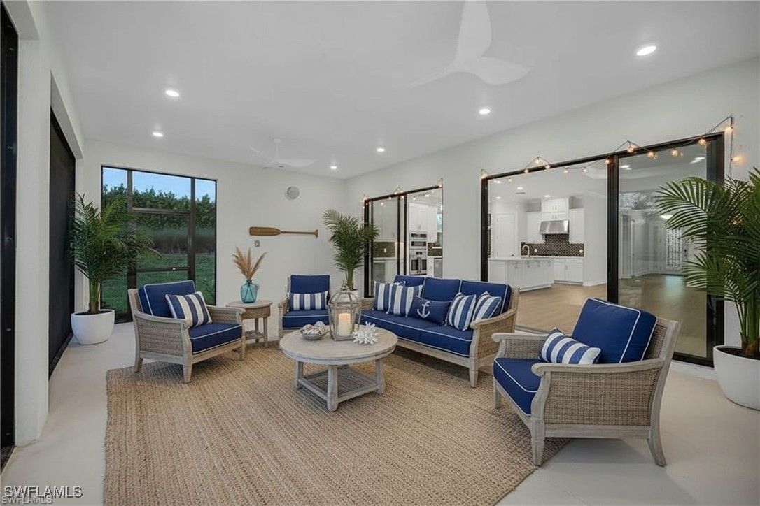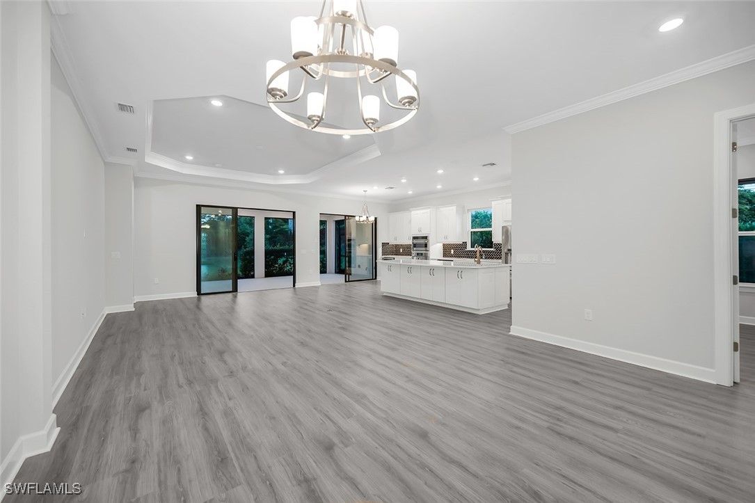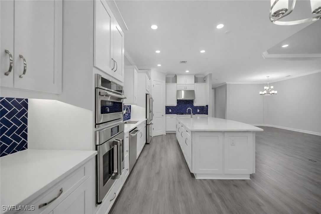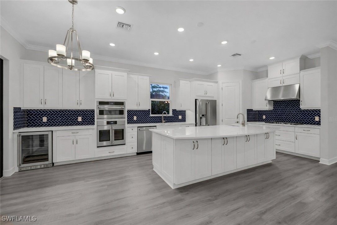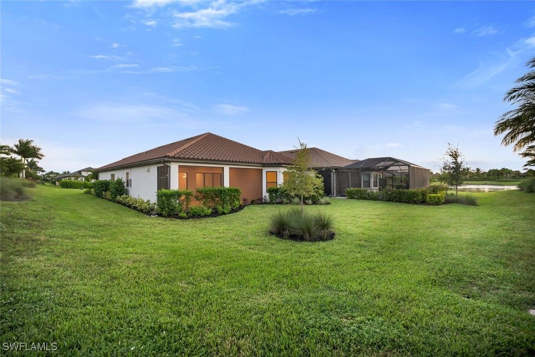 Covered screened lanai, upgraded gourmet kitchen, very large homesite, Open floor plan, Privacy wall, Spectacular sunset views, No Flood Insurance required, Pool ready with pre-plumbing for outdoor kitchen and pool. This Brand-New Lazio Home is an Open Floor Plan with High 10 Ft Ceilings, 8 Ft Doors, 3 Bedroom 3 baths, Den/Study. Situated perfectly on a Very Large Homesite at the end of Cul-de-sac lot featuring an extra-long driveway and the highly sought-after Lazio floor plan. The upgraded gourmet kitchen impresses with an oversized eat-in island with knee-wall cabinetry for added storage, a veggie prep sink, French door oven, natural gas cooking, and a breakfast nook extension. The open-concept great room showcases stacked sliders that seamlessly connect to the outdoor living area, complete with a screened covered lanai, privacy wall, and a summer kitchen ready for a custom outdoor bar. The primary suite includes a cozy sitting area and luxurious finishes, while engineered wood floors throughout, add warmth to the primary and guest bedrooms. Additional highlights include a sleek snakeskin-fleck epoxy garage floor. Enjoy spectacular sunset views and world-class amenities at Esplanade by the Islands, including a resort-style lap pool, Bahama Bar, tennis, pickleball, state-of-the-art fitness center, full-service spa, and salon. Ideally located between Marco Island and downtown Naples, this home offers the best of both worlds, just 20 minutes to the pristine beaches of Marco and the dining and shopping of 5th Avenue. This home has been virtually staged.