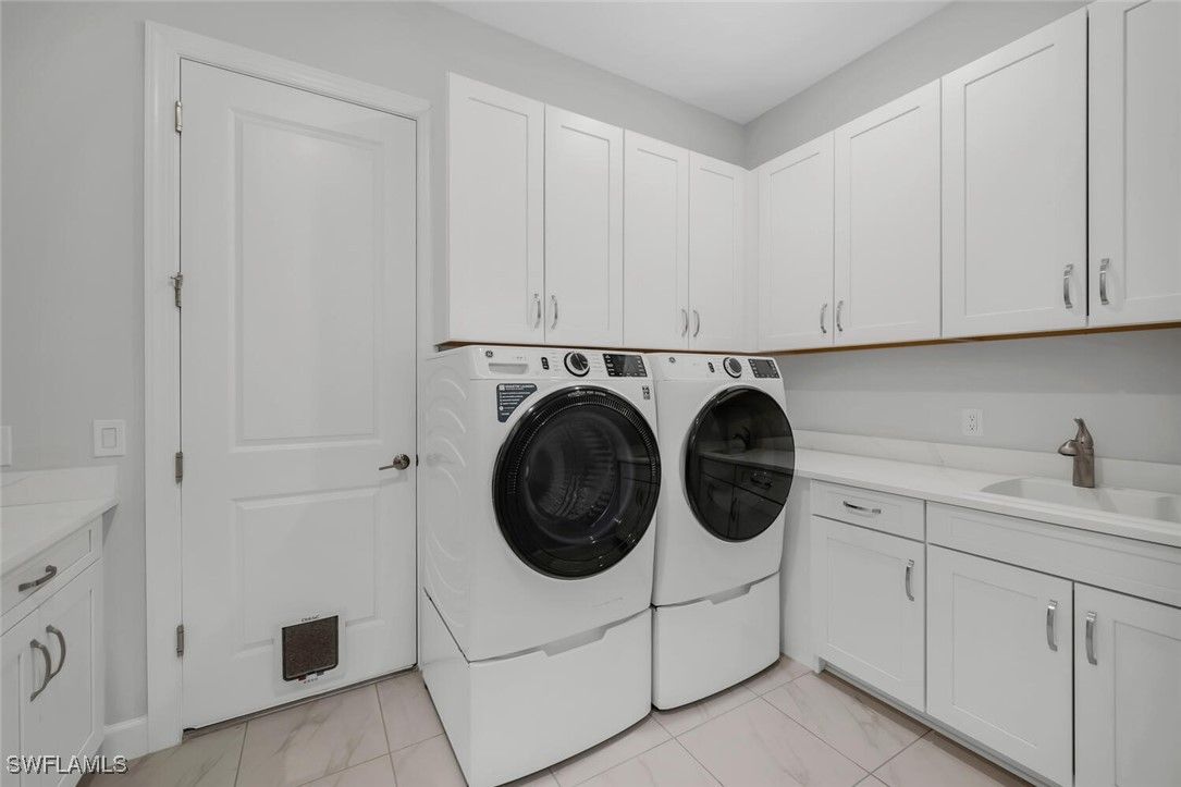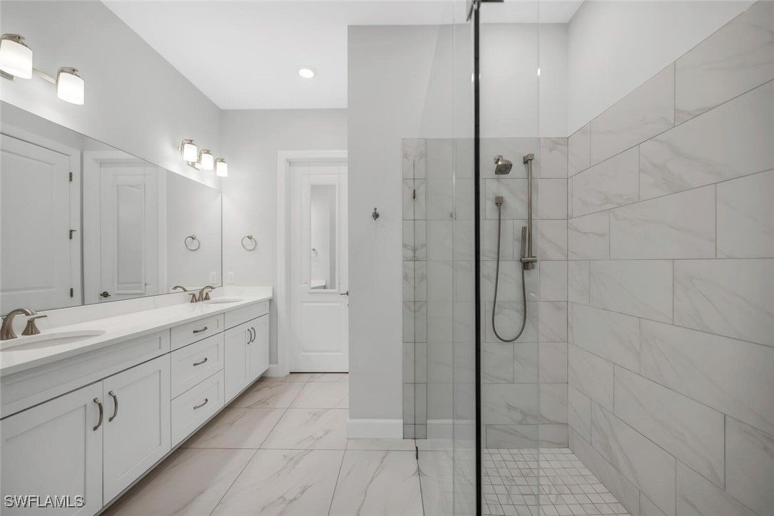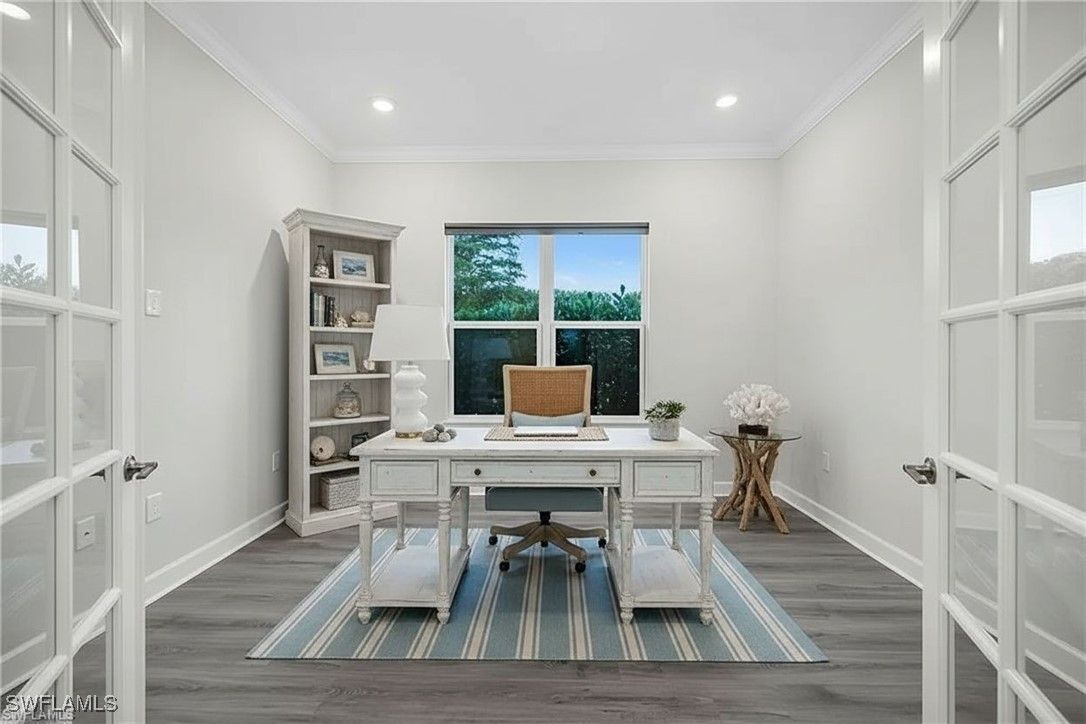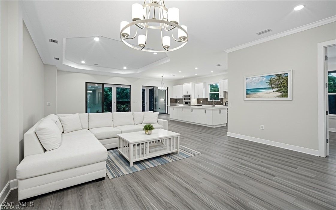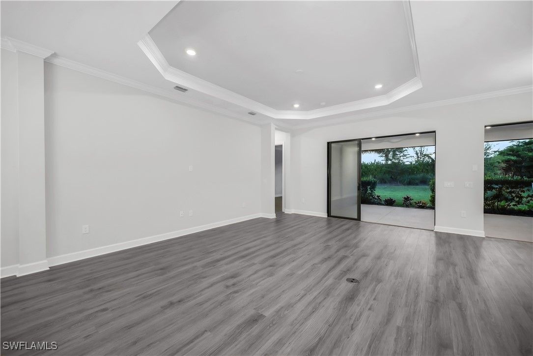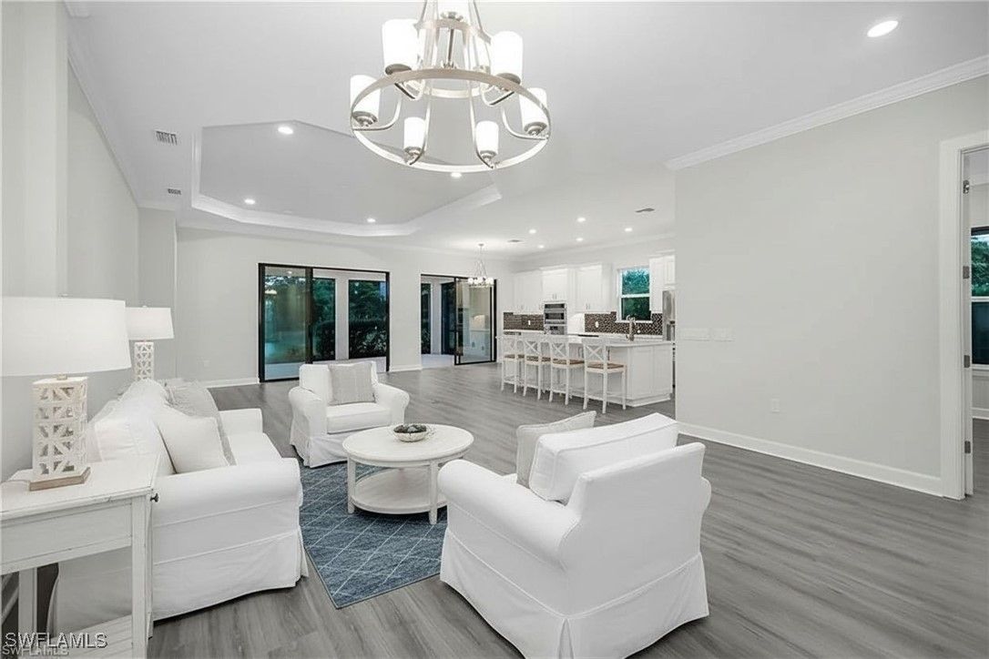 Covered screened lanai, upgraded gourmet kitchen, very large homesite, Open floor plan, Privacy wall, Spectacular sunset views, No Flood Insurance required, Pool ready with pre-plumbing for outdoor kitchen and pool. This Brand-New Lazio Home is an Open Floor Plan with High 10 Ft Ceilings, 8 Ft Doors, 3 Bedroom 3 baths, Den/Study. Situated perfectly on a Very Large Homesite at the end of Cul-de-sac lot featuring an extra-long driveway and the highly sought-after Lazio floor plan. The upgraded gourmet kitchen impresses with an oversized eat-in island with knee-wall cabinetry for added storage, a veggie prep sink, French door oven, natural gas cooking, and a breakfast nook extension. The open-concept great room showcases stacked sliders that seamlessly connect to the outdoor living area, complete with a screened covered lanai, privacy wall, and a summer kitchen ready for a custom outdoor bar. The primary suite includes a cozy sitting area and luxurious finishes, while engineered wood floors throughout, add warmth to the primary and guest bedrooms. Additional highlights include a sleek snakeskin-fleck epoxy garage floor. Enjoy spectacular sunset views and world-class amenities at Esplanade by the Islands, including a resort-style lap pool, Bahama Bar, tennis, pickleball, state-of-the-art fitness center, full-service spa, and salon. Ideally located between Marco Island and downtown Naples, this home offers the best of both worlds, just 20 minutes to the pristine beaches of Marco and the dining and shopping of 5th Avenue. This home has been virtually staged.