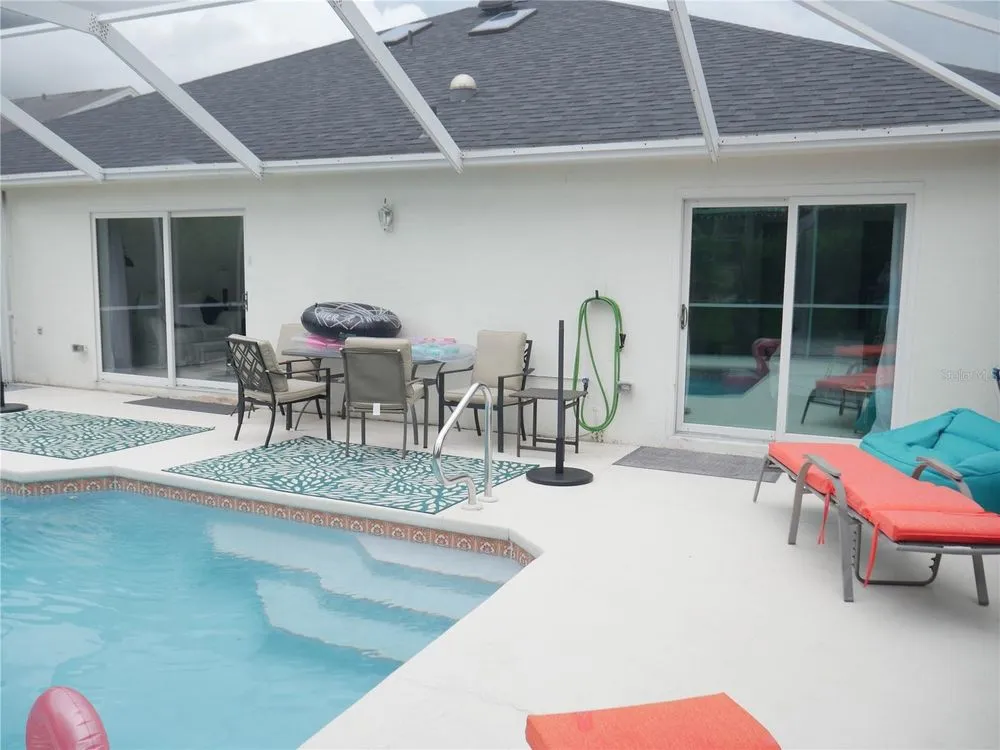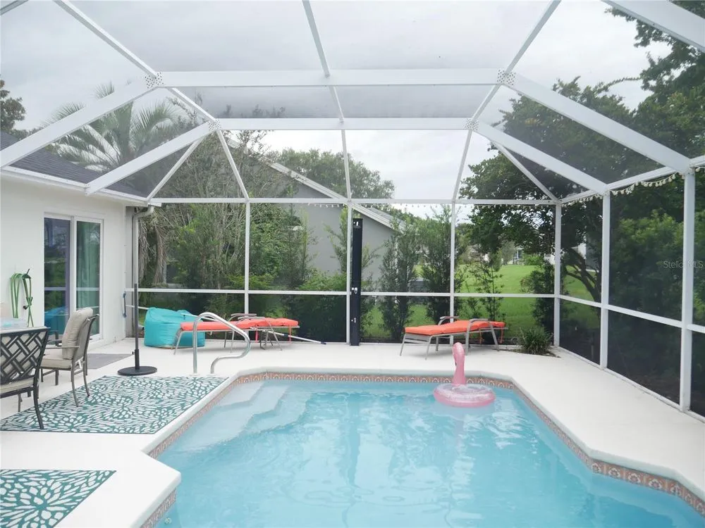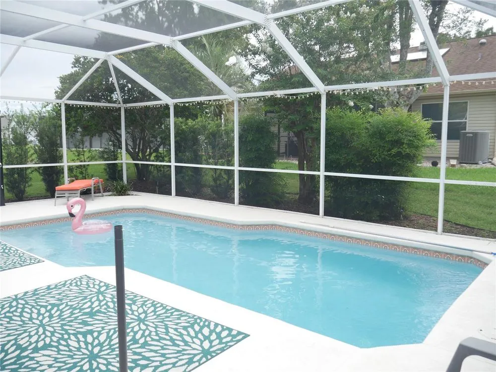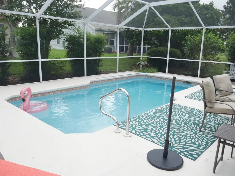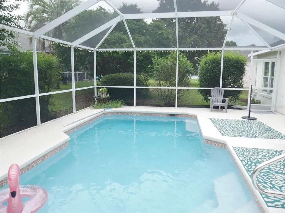 Bond Paid - Turn Key with Golf Cart Immaculate 3 Bedroom/2 Bath Block/Stucco Designer Home with Beautifully Updated Interior Located in the Village of HACIENDA SOUTH. Many Updated Features Including New Roof (2025), Private/Screened Saltwater Pool (marcite resurfaced in 2025) plus Newer Filter/Heater,skylights(2025), HVAC (2 years), Water Heater (3 years) Irrigation solonoid (2025) Upgraded Cabinetry/Quartz Counters Kitchen and Baths, Ceramic Wood Plank Tile throughout, Washer/Dryer(3 years), Storms Door 2024, Pool Bird Cage Screens (2023). Newer Light fixtures Kitchen,Dining, Hall plus many others inside/outside,Other Features Include Solar Shower (Pool), Nest Thermostat, Newer Triple Pane Hurricane Windows, and Many More Upgraded Deluxe Features. This Homes Shows Very Well. Property is Located only a few minutes from the Spanish Springs and Lake Sumter Landing Town Centers, Dining ,Stores,Grocery Stores, Banking, Medical/Hospital, Golf, and. Recreation Centers