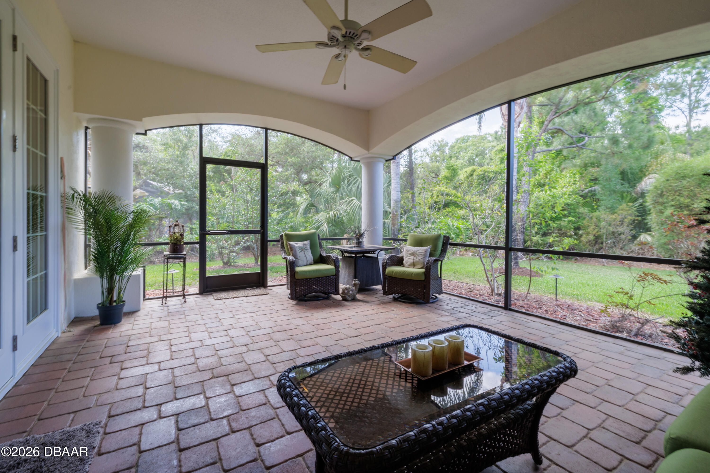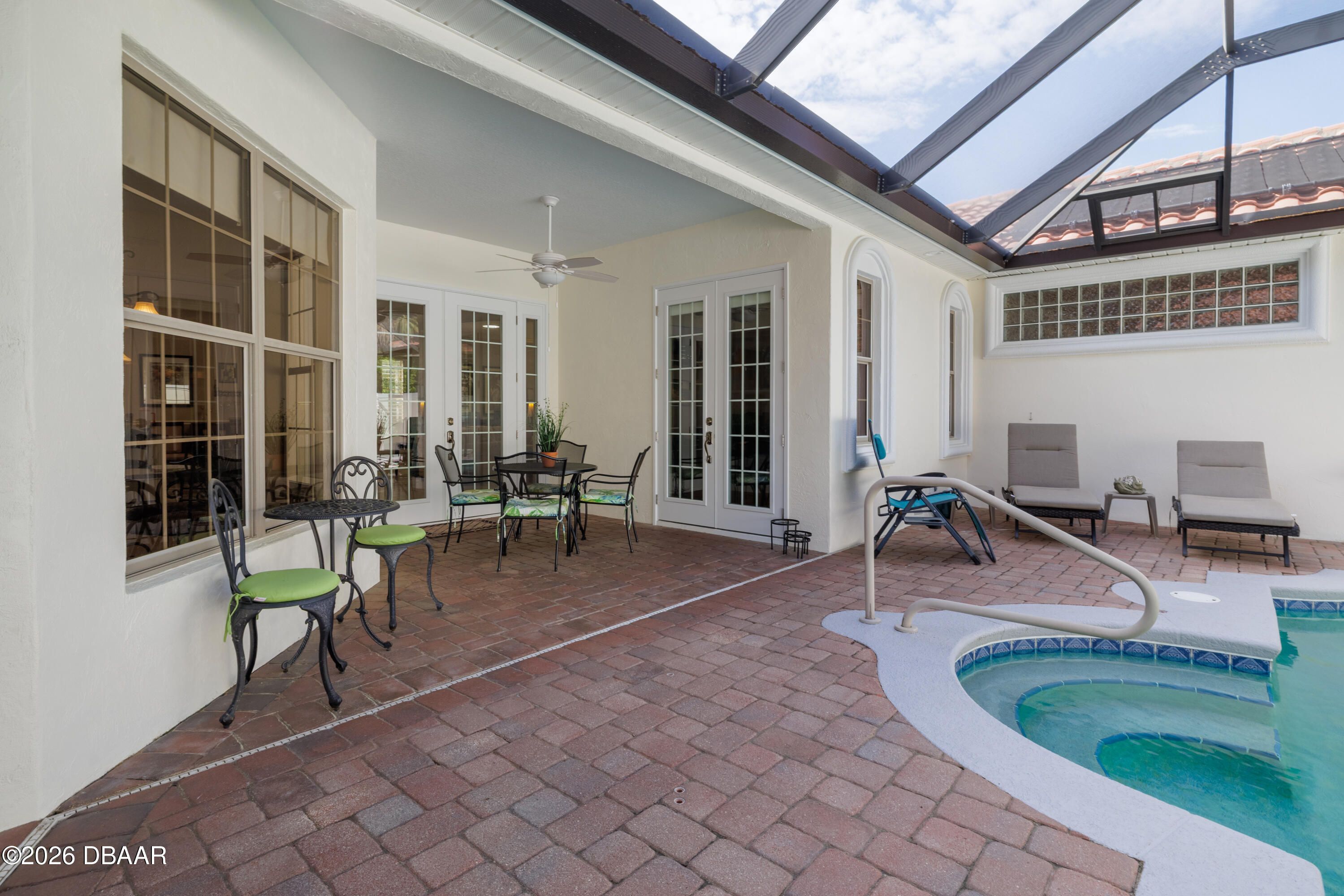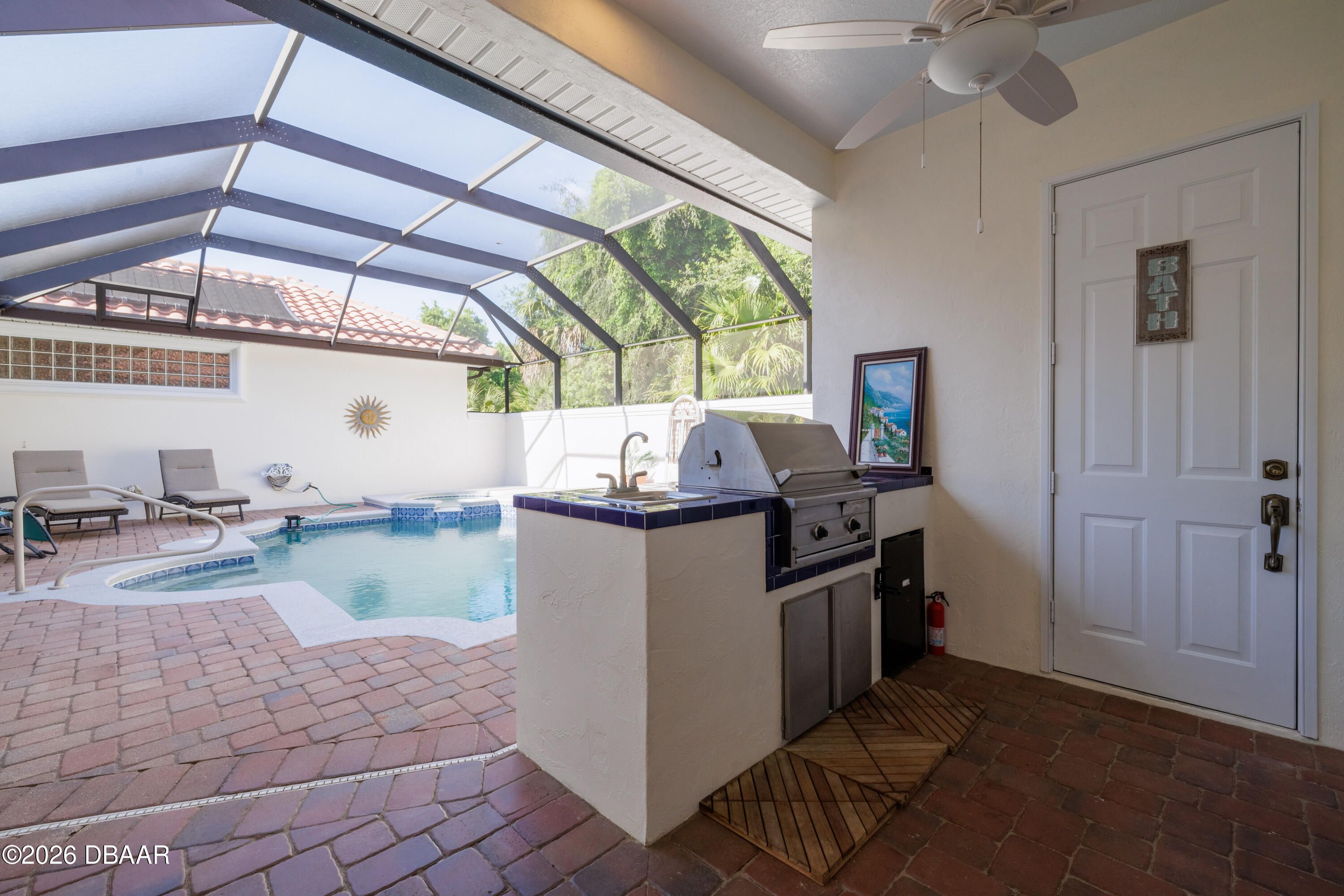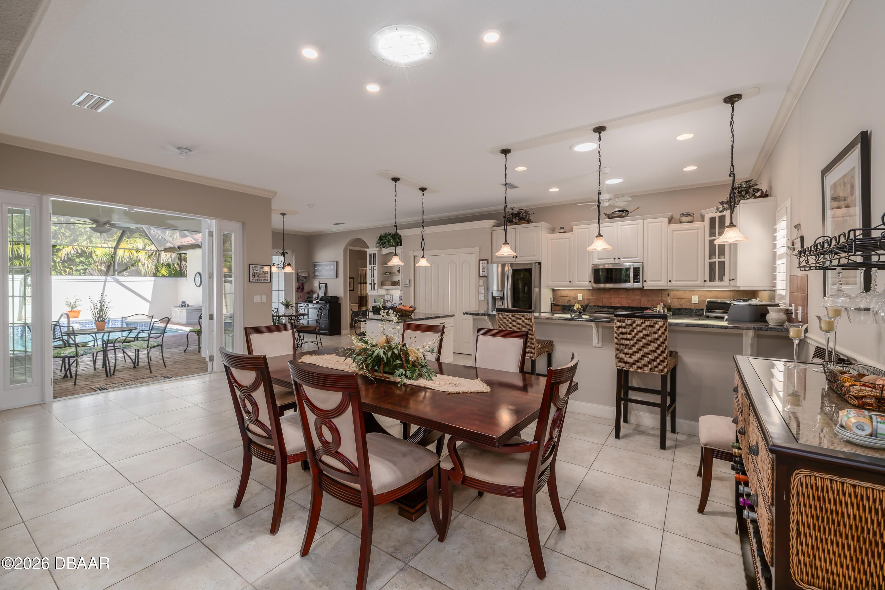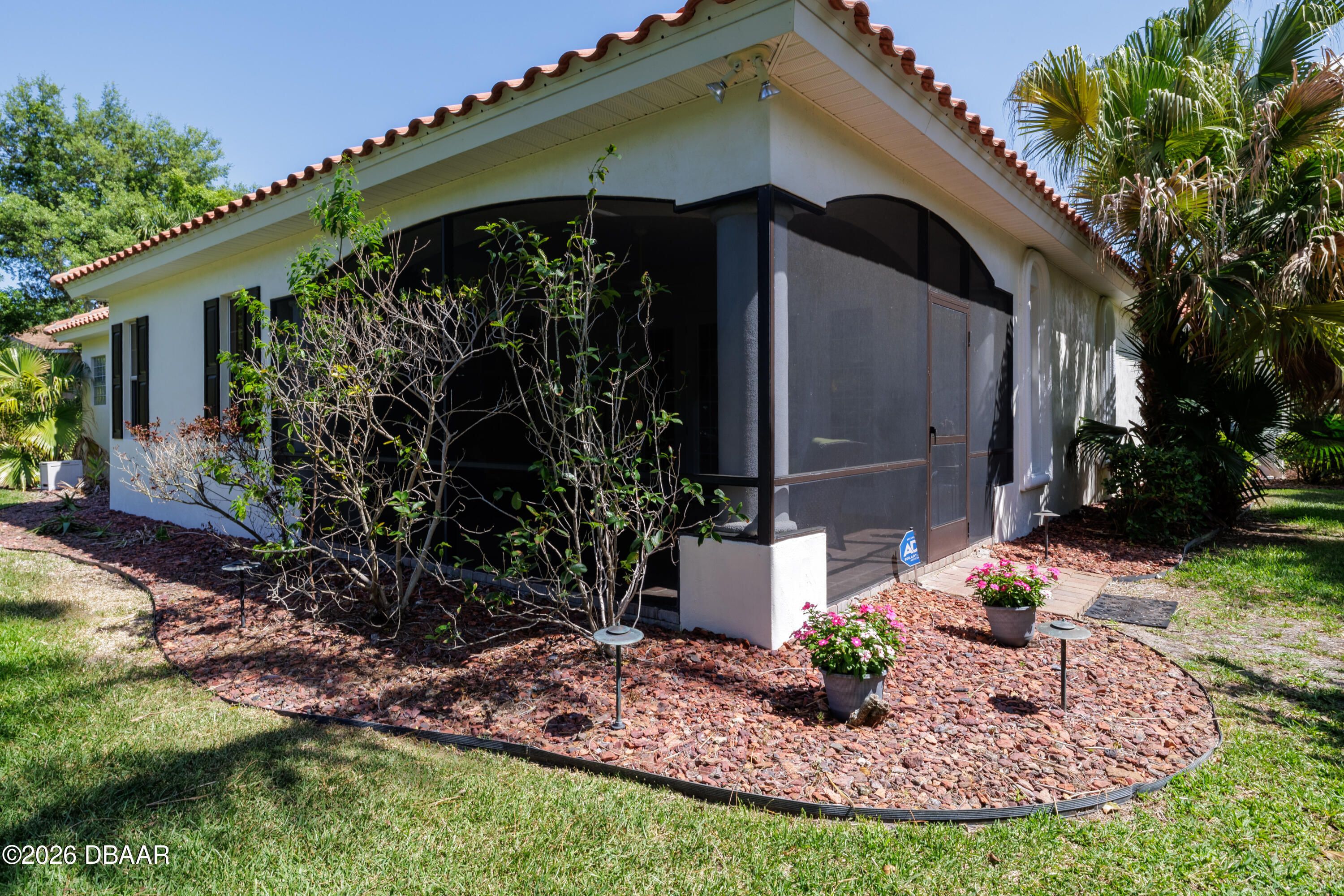 HALIFAX PLANTATION-COURTYARD POOL! Welcome home! From the moment you arrive, you'll be captivated by the mature landscaping and charming wrought-iron arched gate, guiding you through a double-door entry into your own private courtyard retreat. This inviting outdoor oasis showcases a solar-heated pool and spa, creating the perfect setting for relaxation and entertaining. This 3BR, 3BA home seamlessly connects to the courtyard through new hurricane-impact, UV-protected glass french doors, blending indoor and outdoor living effortlessly. Step inside to a bright, open-concept floor plan where the kitchen, dining, and living areas all overlook the pool. High ceilings, crown molding, and 20x20 tile flooring flow seamlessly throughout the home, creating a stylish, cohesive, and low-maintenance living space. Plantation shutters add both charm and functionality. Just off the main living area, additional French doors lead to a separate screened enclosed lanai with peaceful views of the backyard. At the heart of the home is a chef's dream kitchen, featuring 36 and 42-inch cabinetry with pull-outs, under-cabinet lighting, crown molding, and a striking tile backsplash. Enjoy newer LG stainless steel appliances, including a convection oven with air-fry capability, an oversized breakfast bar, and a spacious island accented with elegant glass pendant lighting. A charming breakfast nook offers built-in bookcases and a desk area--perfect for work or organization. The primary suite is a private retreat designed for comfort and tranquility, ideal after a day at the beach or exploring nearby parks and trails. The ensuite bathroom features a walk-in shower, double vanity, soaking tub, and private water closet. An additional flex room off the primary suite is perfect for a nursery, home office, or hobby room. This home also offers peace of mind and efficiency with double-pane windows, sun tunnels, and a durable tile roof. A standout feature is the detached pool house casita, serving as a third bedroom with its own living area, plantation shutters, and en-suite bathroom--ideal for guests, a private office, or a mother-in-law suite. Designed for entertaining, the home includes a summer kitchen and expansive outdoor living spaces. Additional highlights include exterior paint (2025), recently cleaned tile roof, pest tubes, a retractable front door screen, generator plug, security system, and paved driveway, courtyard, lanai, and walkways. Halifax Plantation is minutes from the ocean and home to 18 holes of golf, clubhouse with restaurant, sports pub and pro shop. Amenities include tennis, fitness center and swimming pool with different membership options. Enjoy early morning walks or bike rides along the canopy tree-lined streets. It's the perfect place to call home. All information recorded in the MLS is intended to be accurate but cannot be guaranteed. Square footage is taken from property appraisers office.
