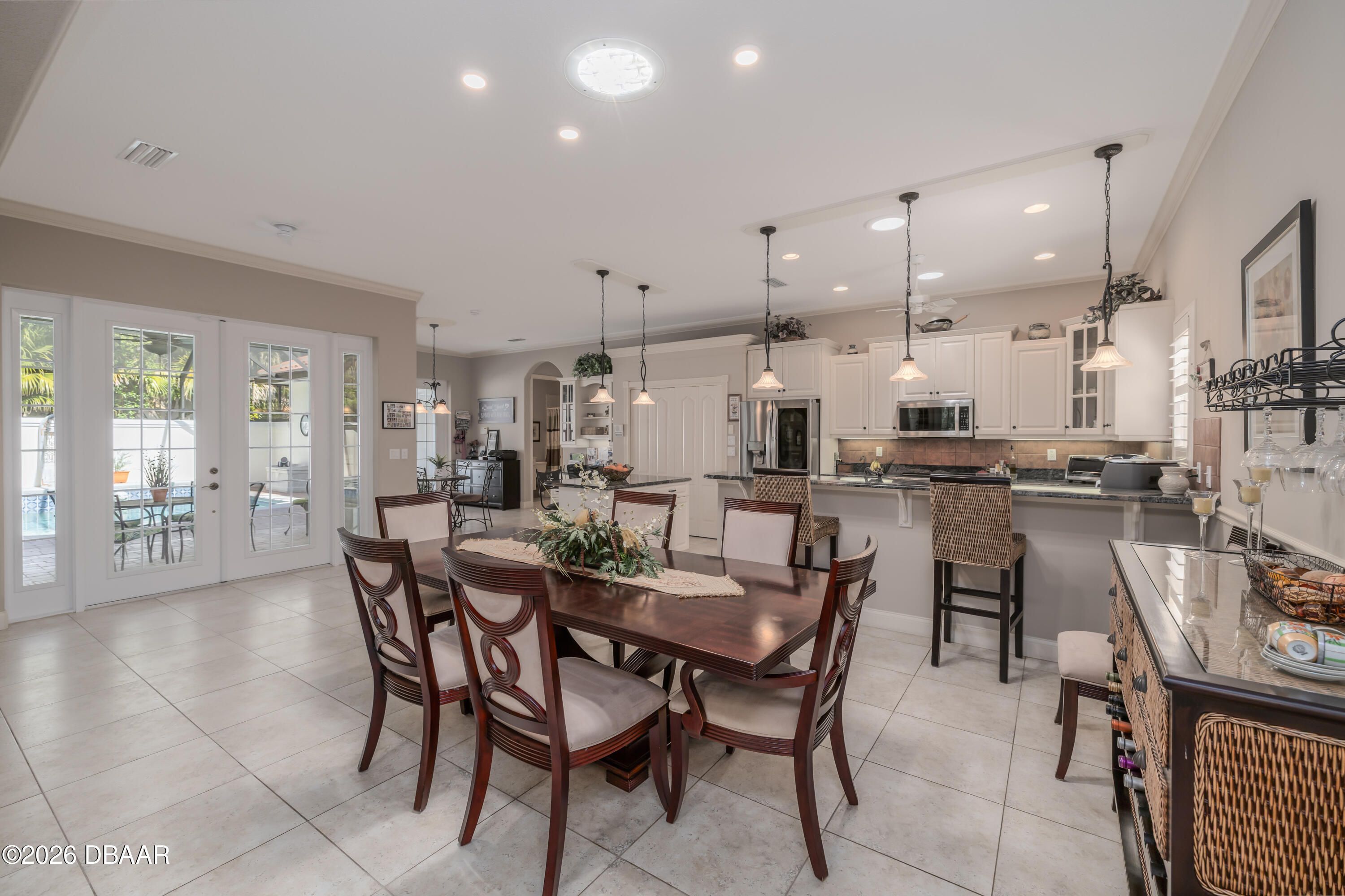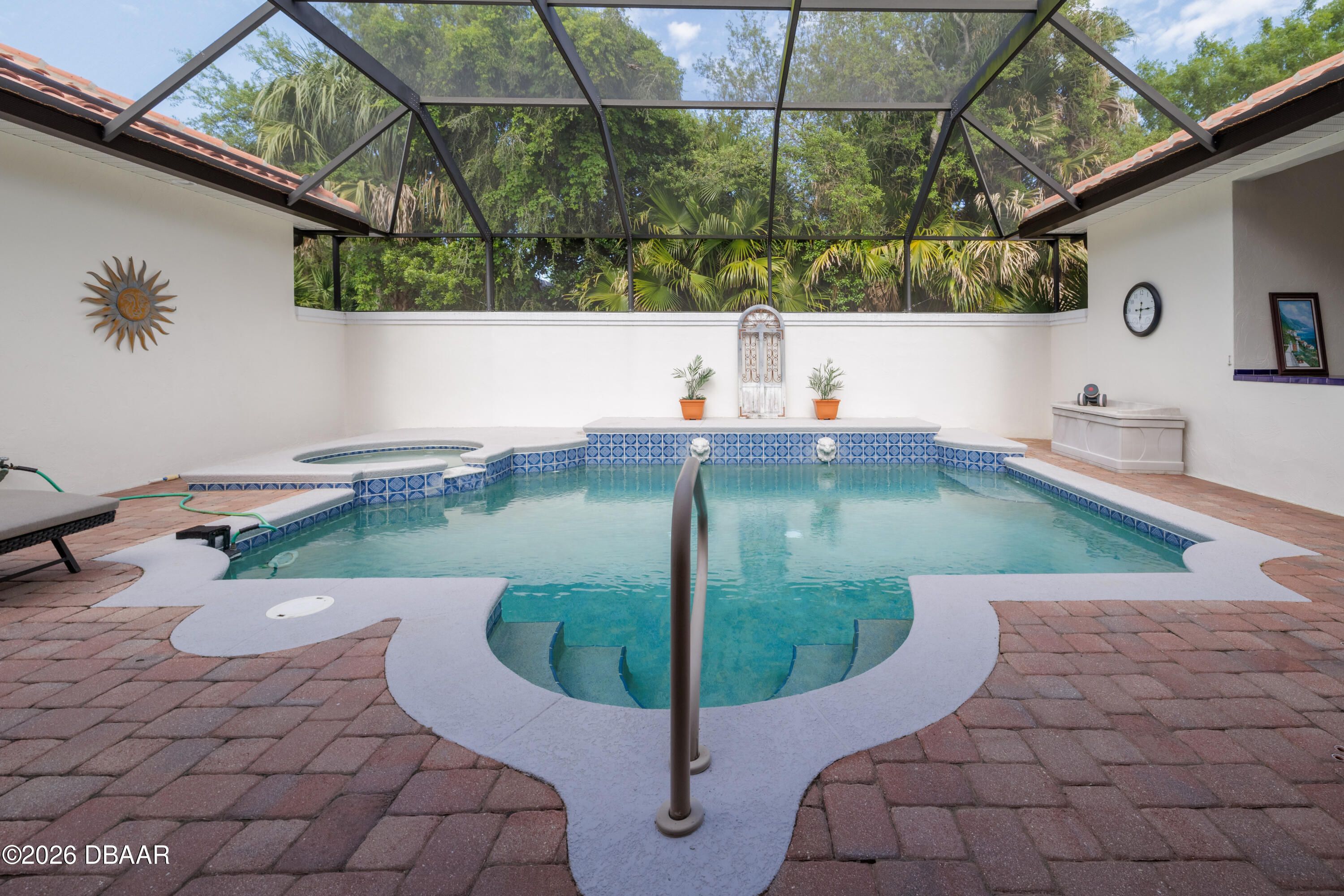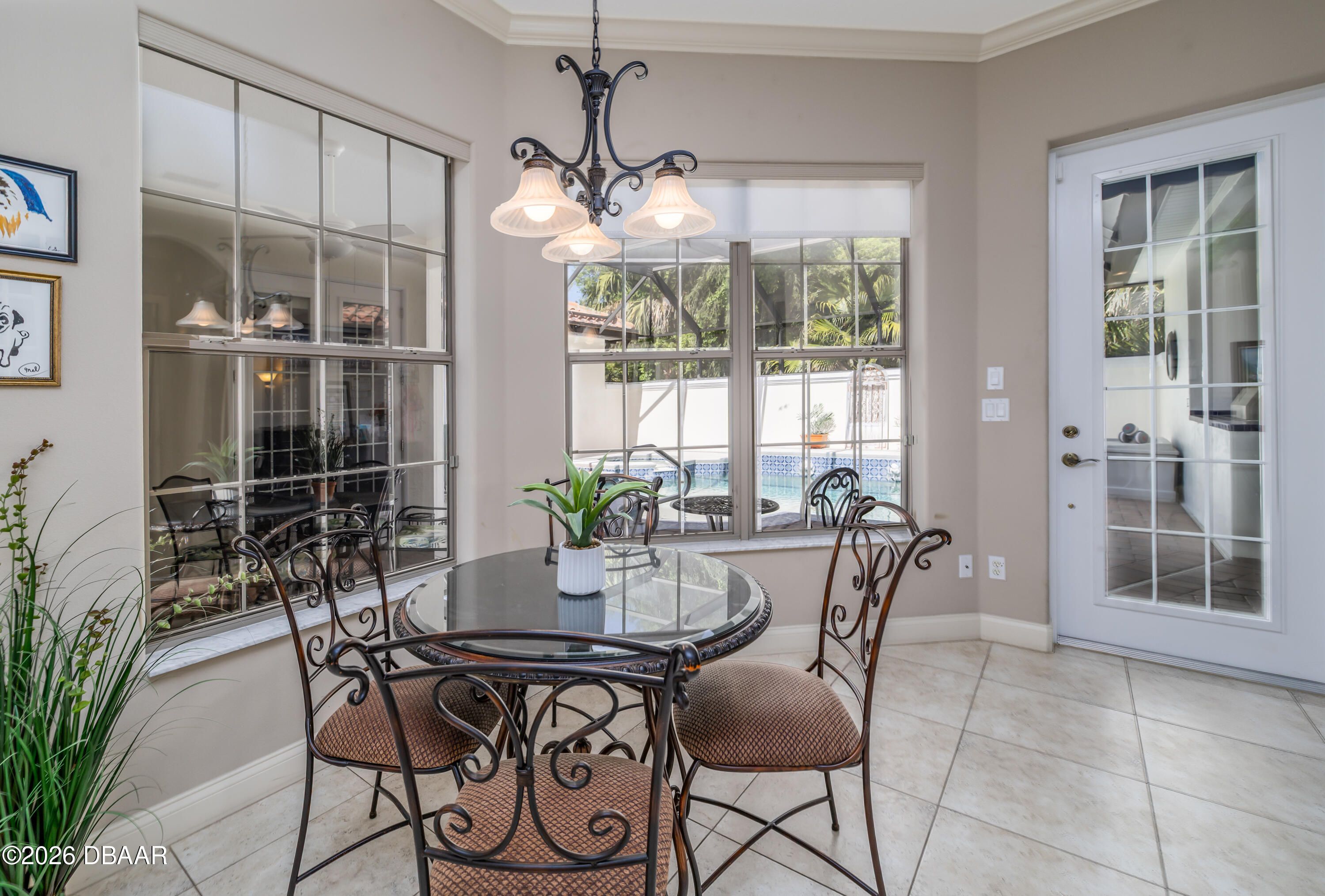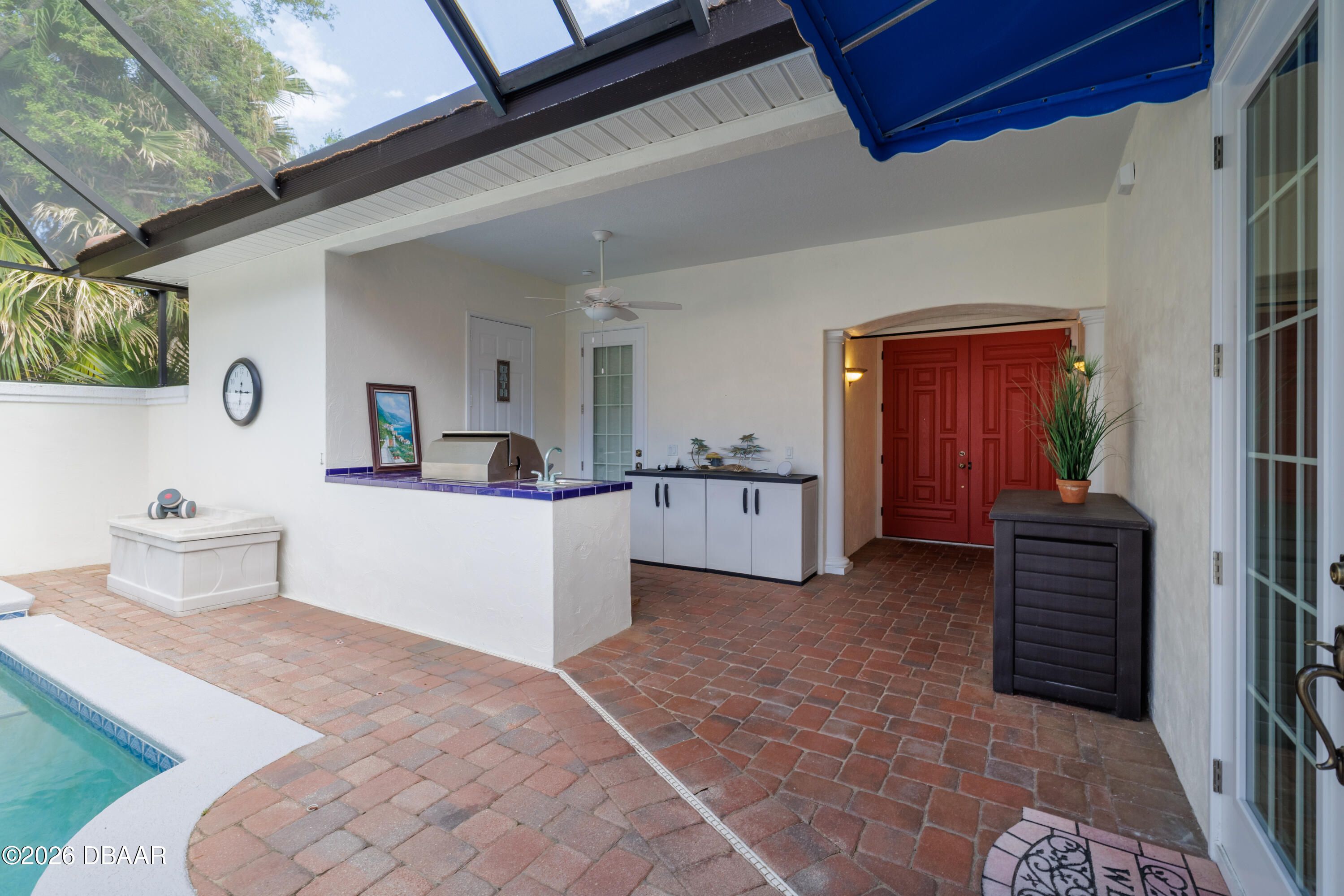HALIFAX PLANTATION-COURTYARD POOL! Welcome home! From the moment you arrive, you'll be captivated by the mature landscaping and charming wrought-iron arched gate, guiding you through a double-door entry into your own private courtyard retreat. This inviting outdoor oasis showcases a solar-heated pool and spa, creating the perfect setting for relaxation and entertaining. This 3BR, 3BA home seamlessly connects to the courtyard through new hurricane-impact, UV-protected glass french doors, blending indoor and outdoor living effortlessly. Step inside to a bright, open-concept floor plan where the kitchen, dining, and living areas all overlook the pool. High ceilings, crown molding, and 20x20 tile flooring flow seamlessly throughout the home, creating a stylish, cohesive, and low-maintenance living space. Plantation shutters add both charm and functionality. Just off the main living area, additional French doors lead to a separate screened enclosed lanai with peaceful views of the backyard. At the heart of the home is a chef's dream kitchen, featuring 36 and 42-inch cabinetry with pull-outs, under-cabinet lighting, crown molding, and a striking tile backsplash. Enjoy newer LG stainless steel appliances, including a convection oven with air-fry capability, an oversized breakfast bar, and a spacious island accented with elegant glass pendant lighting. A charming breakfast nook offers built-in bookcases and a desk area--perfect for work or organization. The primary suite is a private retreat designed for comfort and tranquility, ideal after a day at the beach or exploring nearby parks and trails. The ensuite bathroom features a walk-in shower, double vanity, soaking tub, and private water closet. An additional flex room off the primary suite is perfect for a nursery, home office, or hobby room. This home also offers peace of mind and efficiency with double-pane windows, sun tunnels, and a durable tile roof. A standout feature is the detached pool house casita, serving as a third bedroom with its own living area, plantation shutters, and en-suite bathroom--ideal for guests, a private office, or a mother-in-law suite. Designed for entertaining, the home includes a summer kitchen and expansive outdoor living spaces. Additional highlights include exterior paint (2025), recently cleaned tile roof, pest tubes, a retractable front door screen, generator plug, security system, and paved driveway, courtyard, lanai, and walkways. Halifax Plantation is minutes from the ocean and home to 18 holes of golf, clubhouse with restaurant, sports pub and pro shop. Amenities include tennis, fitness center and swimming pool with different membership options. Enjoy early morning walks or bike rides along the canopy tree-lined streets. It's the perfect place to call home. All information recorded in the MLS is intended to be accurate but cannot be guaranteed. Square footage is taken from property appraisers office.