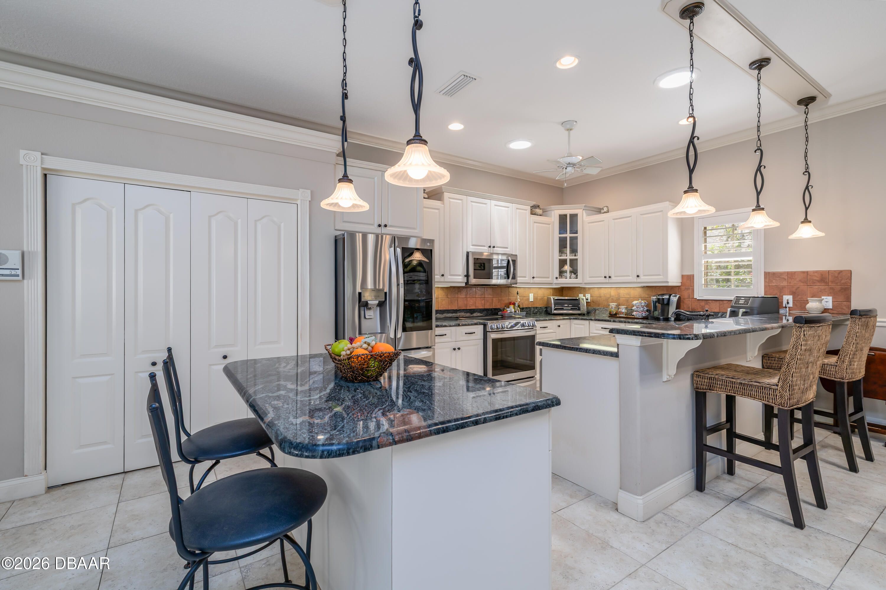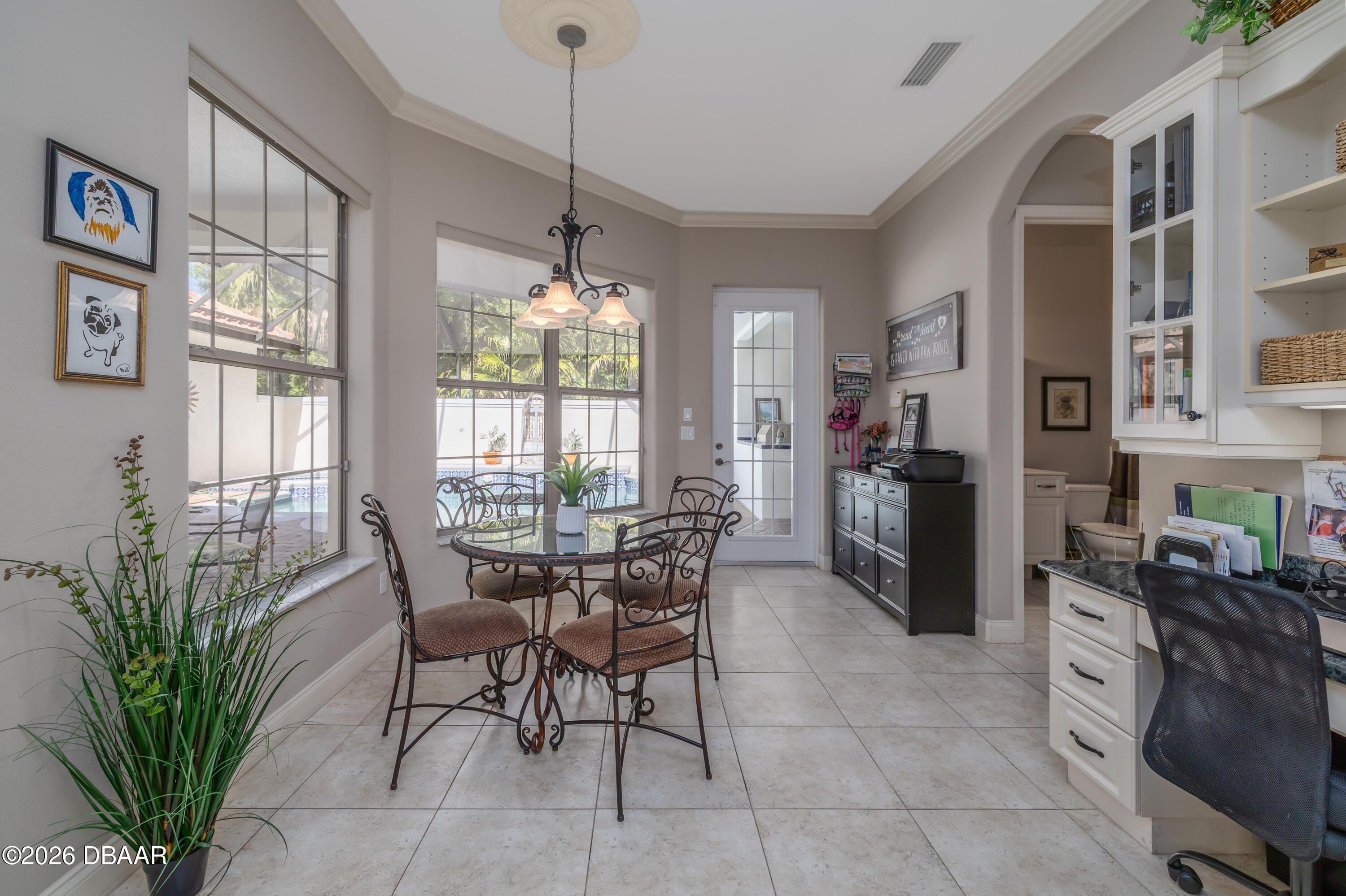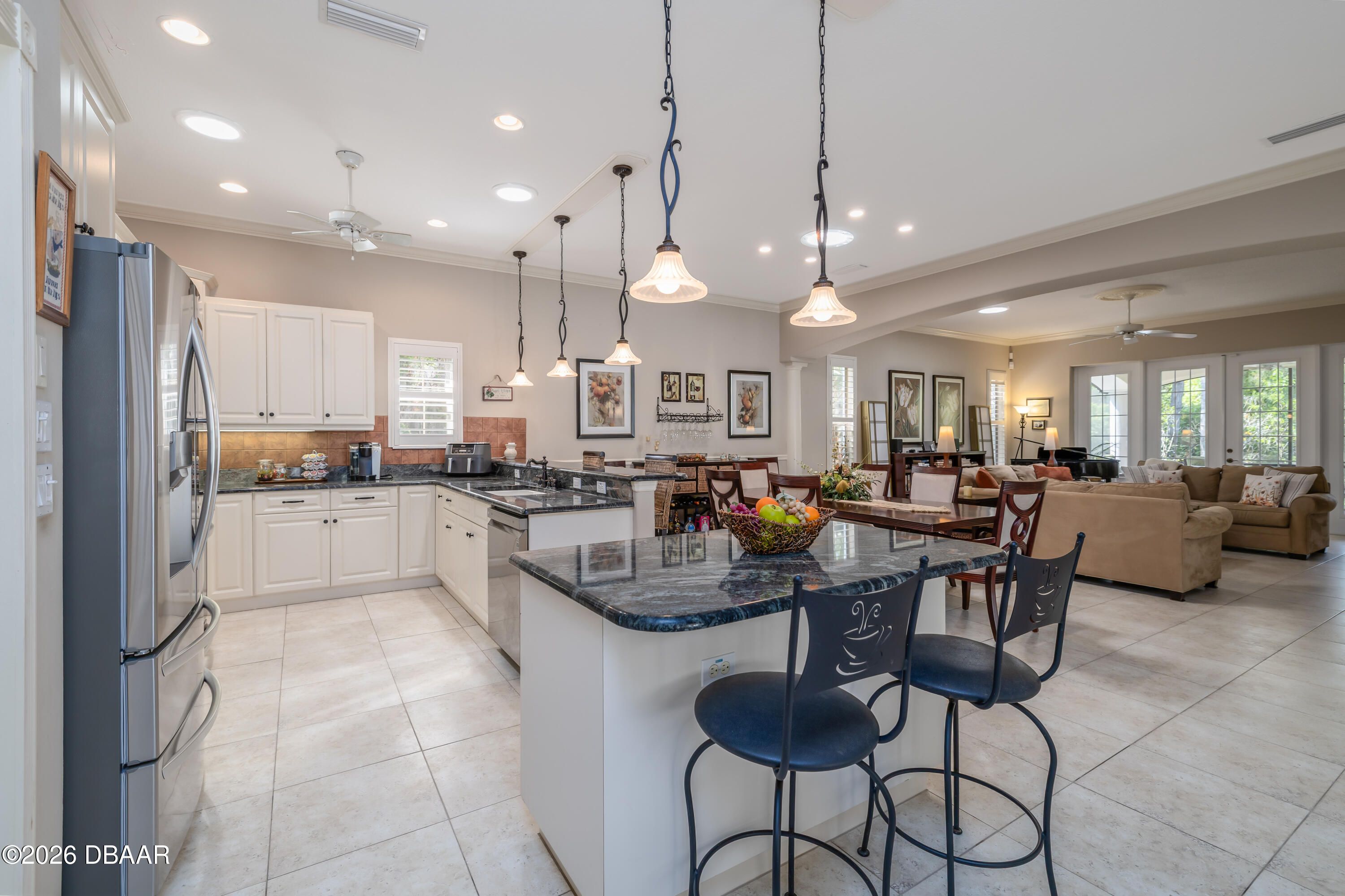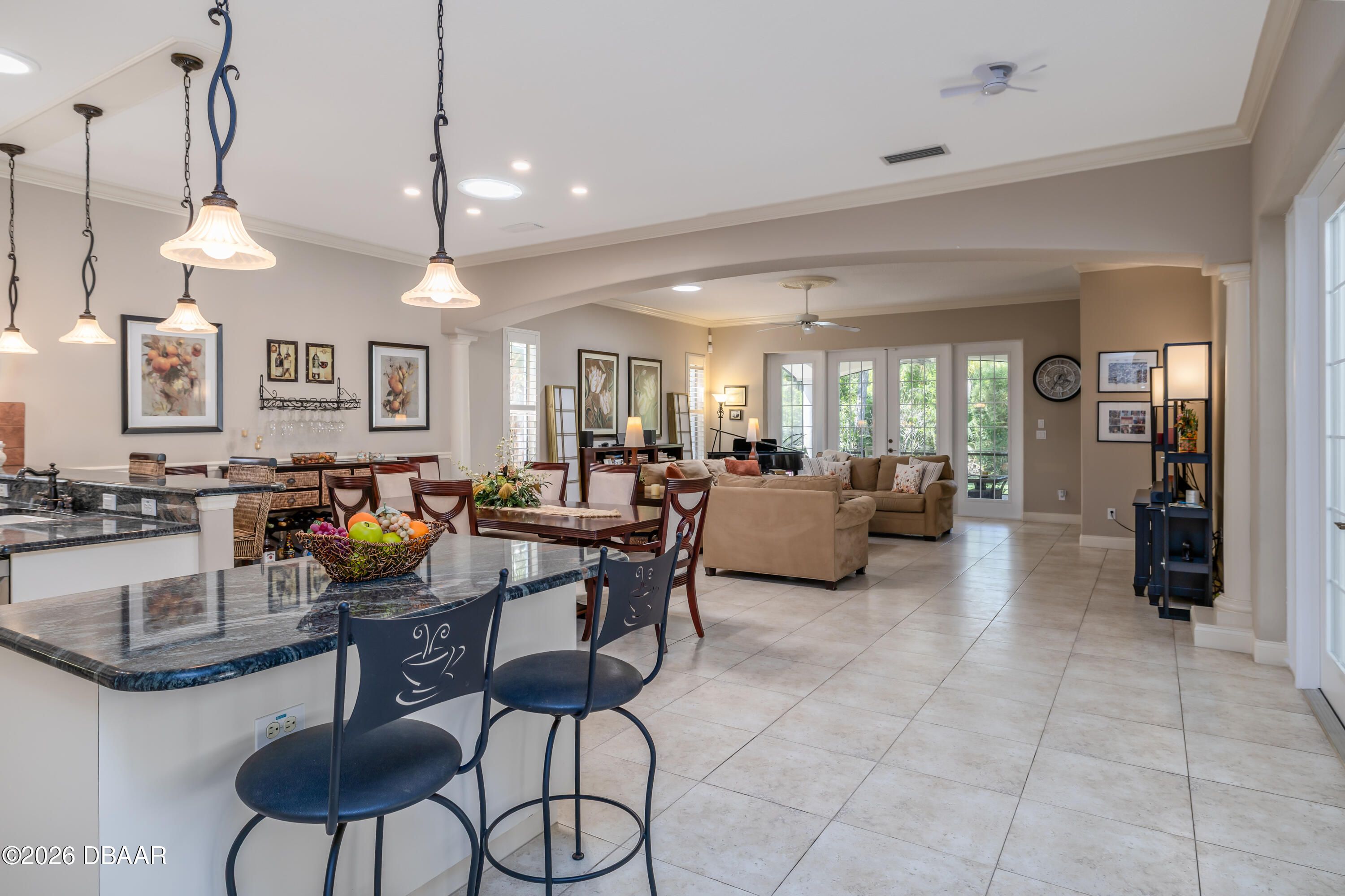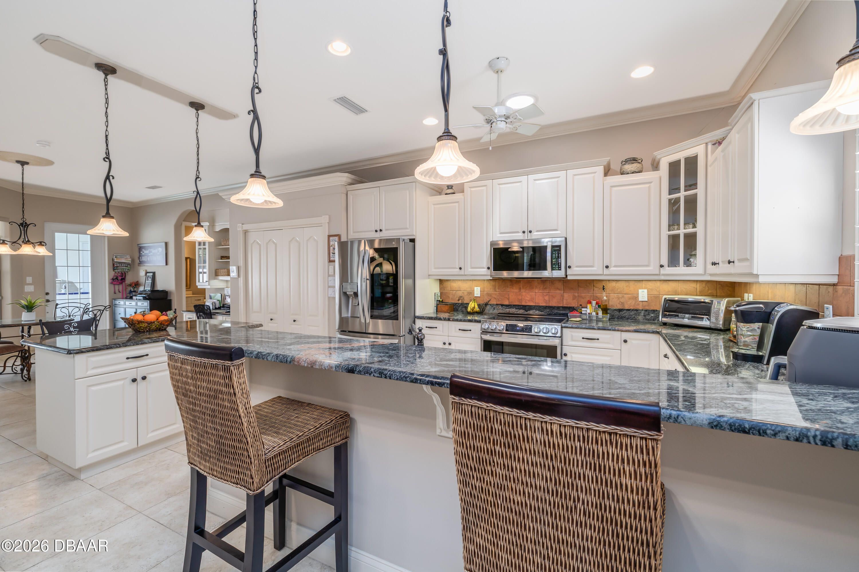 HALIFAX PLANTATION-COURTYARD POOL! Welcome home! From the moment you arrive, you'll be captivated by the mature landscaping and charming wrought-iron arched gate, guiding you through a double-door entry into your own private courtyard retreat. This inviting outdoor oasis showcases a solar-heated pool and spa, creating the perfect setting for relaxation and entertaining. This 3BR, 3BA home seamlessly connects to the courtyard through new hurricane-impact, UV-protected glass french doors, blending indoor and outdoor living effortlessly. Step inside to a bright, open-concept floor plan where the kitchen, dining, and living areas all overlook the pool. High ceilings, crown molding, and 20x20 tile flooring flow seamlessly throughout the home, creating a stylish, cohesive, and low-maintenance living space. Plantation shutters add both charm and functionality. Just off the main living area, additional French doors lead to a separate screened enclosed lanai with peaceful views of the backyard. At the heart of the home is a chef's dream kitchen, featuring 36 and 42-inch cabinetry with pull-outs, under-cabinet lighting, crown molding, and a striking tile backsplash. Enjoy newer LG stainless steel appliances, including a convection oven with air-fry capability, an oversized breakfast bar, and a spacious island accented with elegant glass pendant lighting. A charming breakfast nook offers built-in bookcases and a desk area--perfect for work or organization. The primary suite is a private retreat designed for comfort and tranquility, ideal after a day at the beach or exploring nearby parks and trails. The ensuite bathroom features a walk-in shower, double vanity, soaking tub, and private water closet. An additional flex room off the primary suite is perfect for a nursery, home office, or hobby room. This home also offers peace of mind and efficiency with double-pane windows, sun tunnels, and a durable tile roof. A standout feature is the detached pool house casita, serving as a third bedroom with its own living area, plantation shutters, and en-suite bathroom--ideal for guests, a private office, or a mother-in-law suite. Designed for entertaining, the home includes a summer kitchen and expansive outdoor living spaces. Additional highlights include exterior paint (2025), recently cleaned tile roof, pest tubes, a retractable front door screen, generator plug, security system, and paved driveway, courtyard, lanai, and walkways. Halifax Plantation is minutes from the ocean and home to 18 holes of golf, clubhouse with restaurant, sports pub and pro shop. Amenities include tennis, fitness center and swimming pool with different membership options. Enjoy early morning walks or bike rides along the canopy tree-lined streets. It's the perfect place to call home. All information recorded in the MLS is intended to be accurate but cannot be guaranteed. Square footage is taken from property appraisers office.