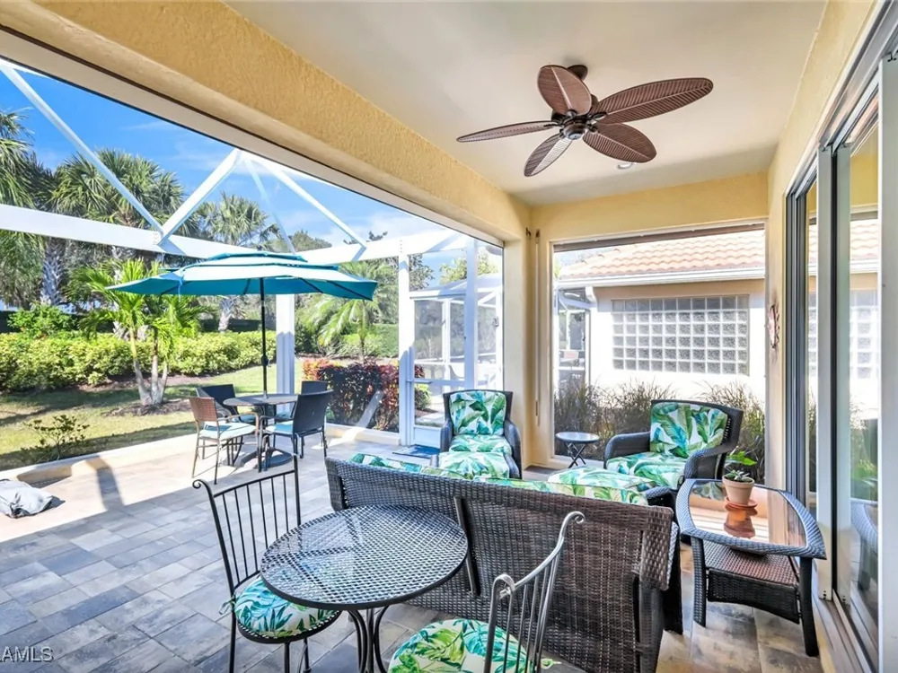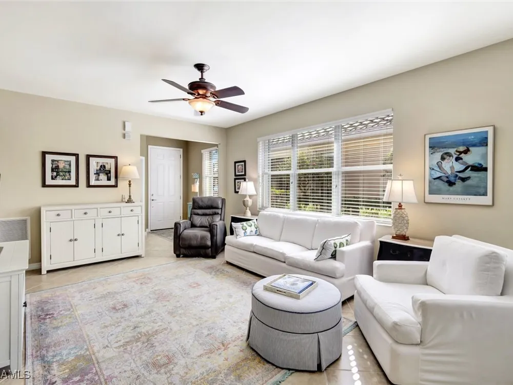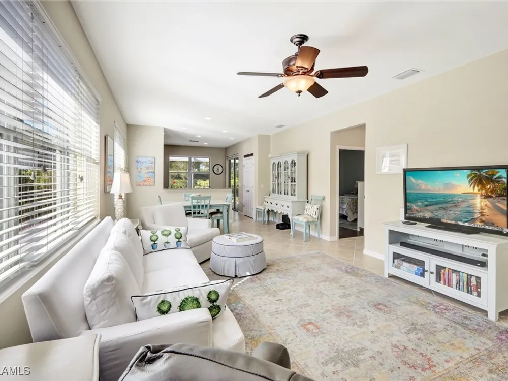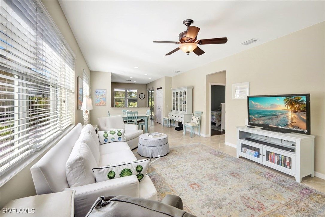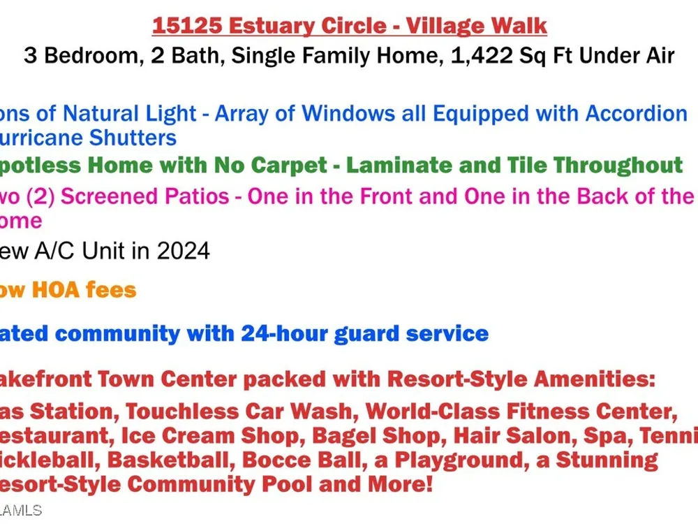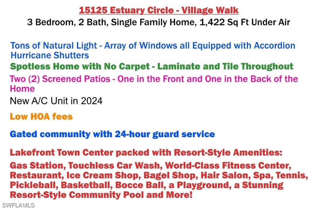 One of the most affordable single-family homes in the highly desirable Village Walk of Bonita Springs, this turnkey-furnished beauty is ready to welcome you home. Bright, airy, and impeccably maintained, the Pine Spring floor plan is filled with natural light from plenty of windows—all equipped with accordion shutters for easy storm protection. With 3 bedrooms, 2 baths, tile and laminate flooring throughout, and a brand-new A/C (April 2024), this home is move-in ready and thoughtfully designed for comfort. Enjoy peaceful mornings on the screened front patio and unwind each evening on the spacious back lanai, complete with hurricane blinds and panoramic western sunset views. Whether relaxing or entertaining, these outdoor spaces offer a perfect escape to soak in the calm surroundings. Village Walk is a secure gated community with 24-hour guard service and low HOA fees. Live a vibrant lifestyle with access to resort-style amenities including a lakefront Town Center with a fitness center, restaurant, spa, ice cream shop, and more. Stay active with tennis, pickleball, basketball, bocce ball, playgrounds, and a stunning community pool. Priced to sell fast, this bright and charming home offers the perfect blend of style, comfort, and convenience. Don’t wait—schedule your private showing today and make Village Walk your new home where every day feels like a vacation!