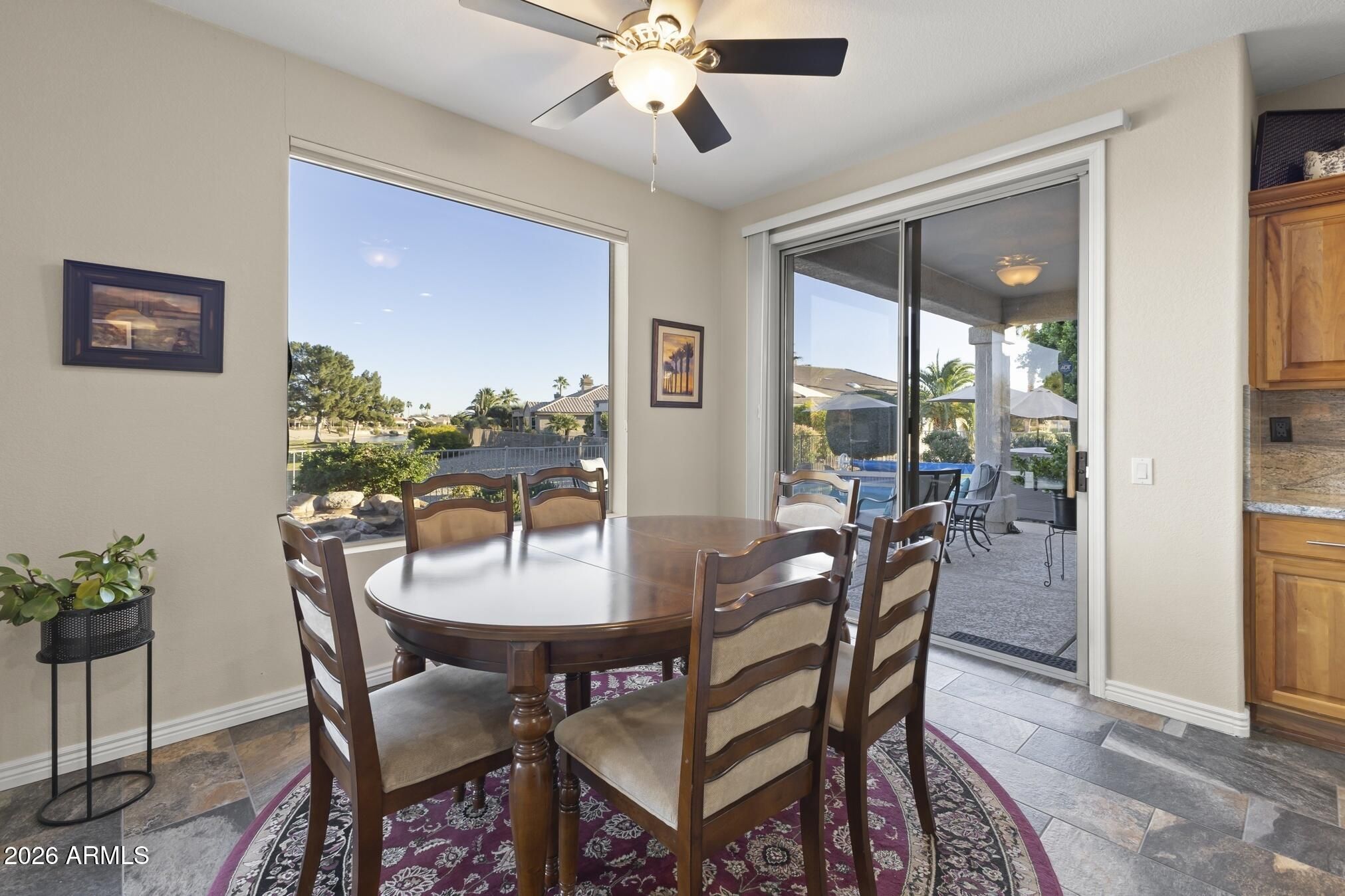 Beautiful Jasmine model on a premium golf course lot with sparkling pool, above-ground spa, and sweeping golf and lake views. Step inside to tile flooring through the entry, hallways, kitchen and baths with slate-style finish, and wood-look tile in the living, dining, and bedrooms for a warm, cohesive feel. The upgraded kitchen features granite countertops, medium-tone wood cabinetry, gas cooktop, stainless KitchenAid appliances, and plenty of storage. A versatile den with French glass doors includes built-in cabinetry and wine rack — perfect for an office, relaxing den or hobby room. The remodeled powder room offers a tiled shower and high vanity with quartz top. Additional interior upgrades include upgraded baseboards, plantation shutters, and ceiling fans throughout. The spacious owner's suite includes a charming bay window, updated shower, granite vanity with undermount sinks, and generous closet space. Car lovers and hobbyists will love the 3-car garage plus workshop area, with insulated doors, new opener on the large bay, coated floor, and stainless Kenmore refrigerator. Newer HVAC, hot water heater, and recirculating pump add peace of mind. Enjoy endless outdoor living with an extended covered patio, cool deck coated, built-in gas BBQ with refrigerator, relaxing water feature, in addition to your pool and spa, and those incredible golf course and lake views. This one truly has it all, comfort, upgrades, and a perfect setting. Furniture available outside for $10k, includes rugs and lamps. EXCEPTIONS: Bed and 2 nightstands in guest bedroom and some accessories.