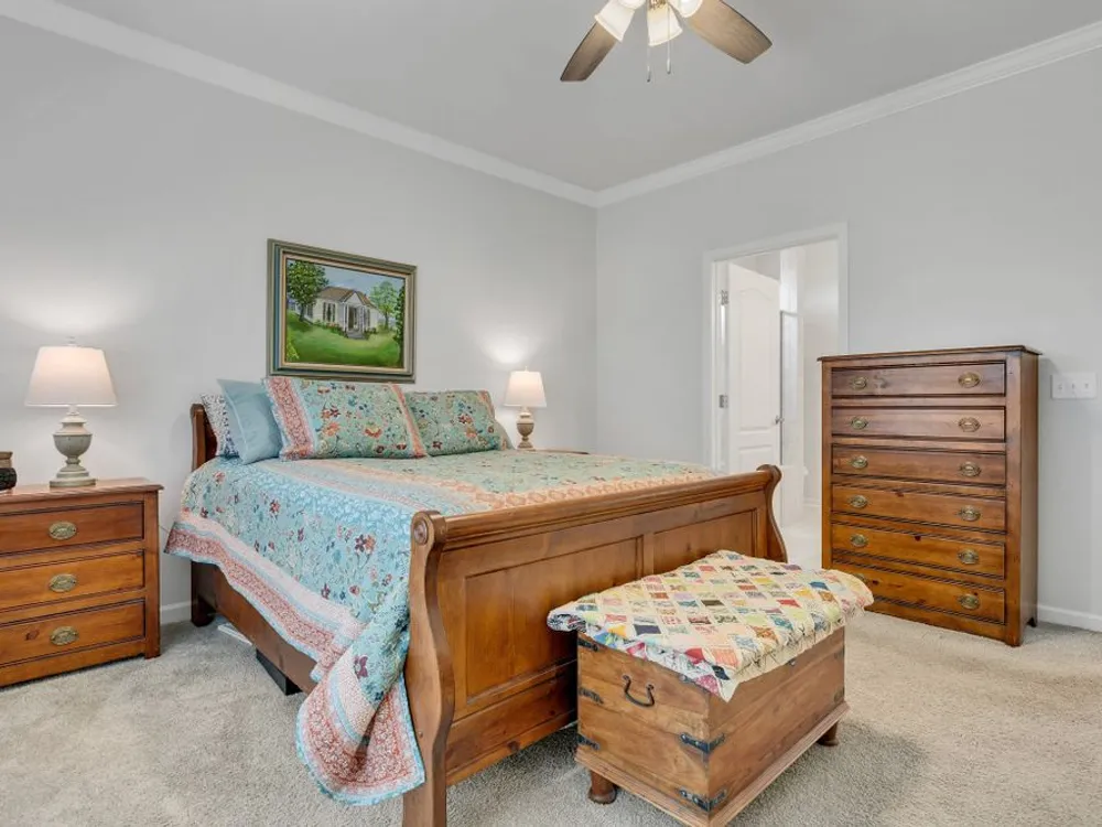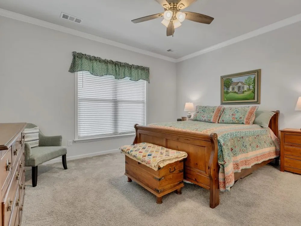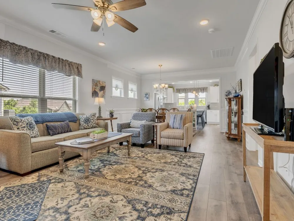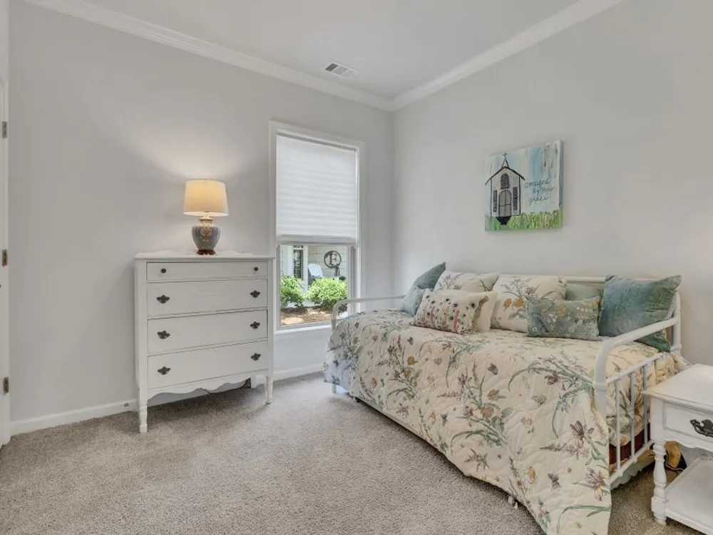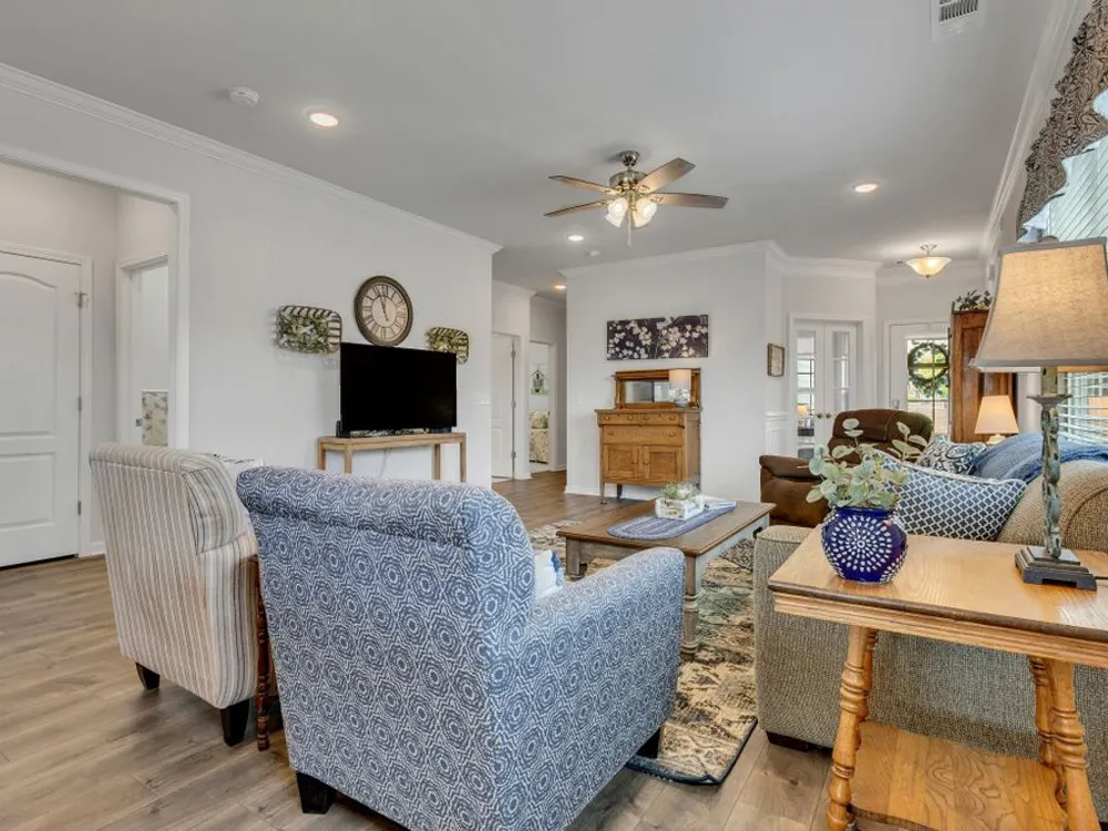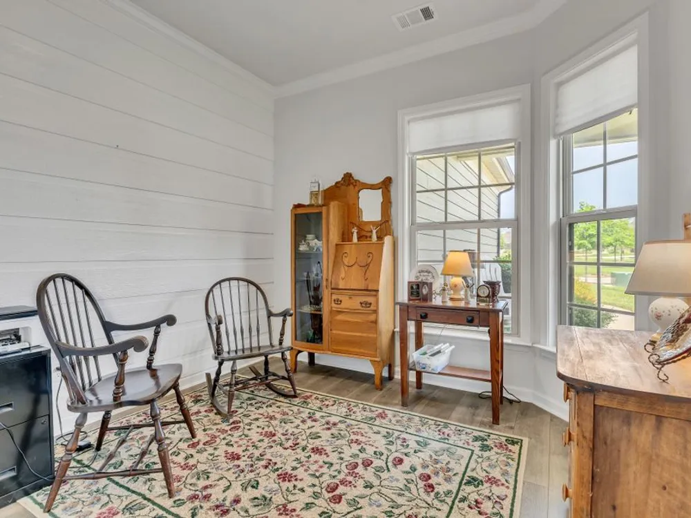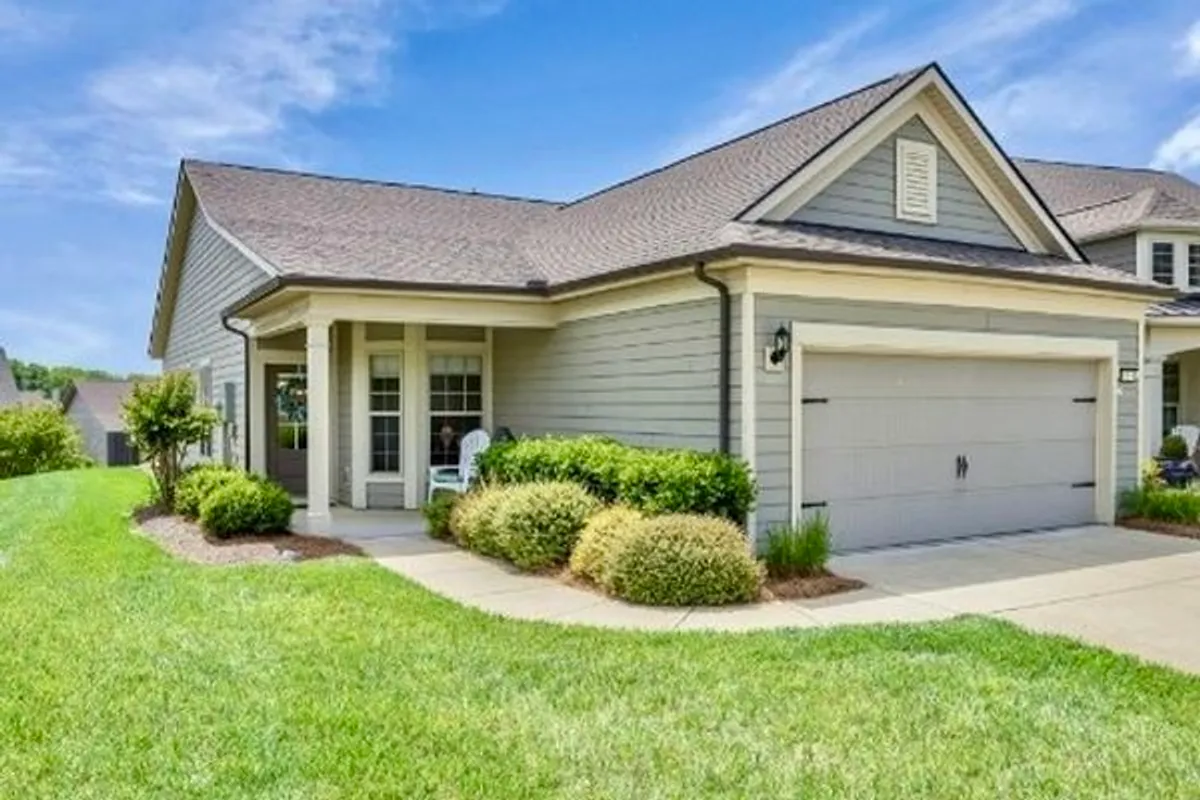 Former model home with tons of upgrades, move in ready, one owner, 3 bedroom 2 bath open concept, one level Taft model located across the street from one of the nicest pocket parks in Southern Springs by Del Webb 55+ active adult community. Inviting great room with crown moulding, wainscoting, ceiling fan, and a neutral color palette. Dining area can accomodate a large table. Kitchen with white cabinets, granite countertops, roll out shelving, large island for entertaining, slide in gas range, stainless steel sink, double door pantry, and tile backsplash. All appliances convey including washer and dryer. Primary bedroom with lots of natural light overlooking the lush backyard space, ceiling fan, ensuite primary bath with double sink vanities, granite countertops, walk-in tile shower with glass doors, and a huge primary closet. Laminate hardwood floors in main living areas, tile in bathrooms, carpet in 2 bedrooms. The front bedroom/office/flex space has shiplap wall, crown moulding, laminate hardwood floor, lots of natural light and a double door closet. Enjoy watching the birds from your private covered lanai. Sit on your front porch and catch up with friends and neighbors. Community has both indoor and outdoor pools, pickleball and tennis courts, gas firepit, pavilion with gas grills and patio tables, clubhouse with fitness center and fitness classes, ball rooms, kitchen, conference room, card/game room, massage room, men's and women's locker rooms, a lending library, and a dog park. Over 70 clubs and special interest groups, special programs, presentations, concerts, Southern Springs choir and band, as well as photography, painting, quilting, solo clubs, coffee club, Veteran's club, Bible study, and so much more. Living in Southern Springs is like vacationing at a very active resort. Thirty-five minutes from BNA. Come out and tour this beautiful home today.