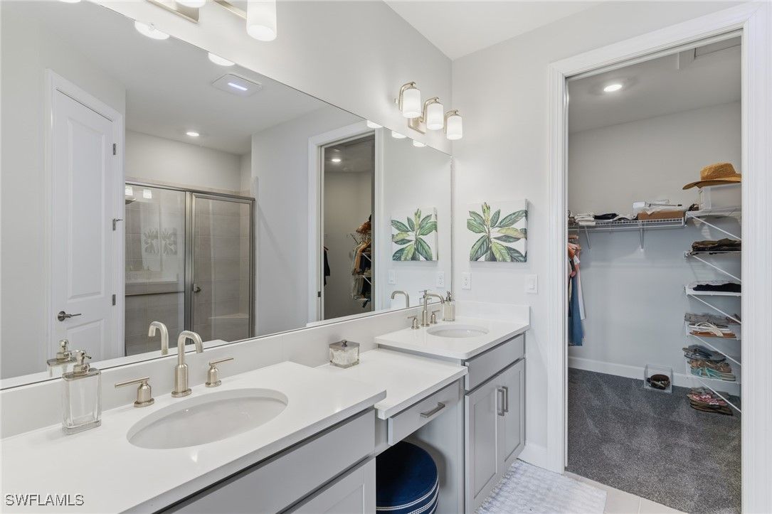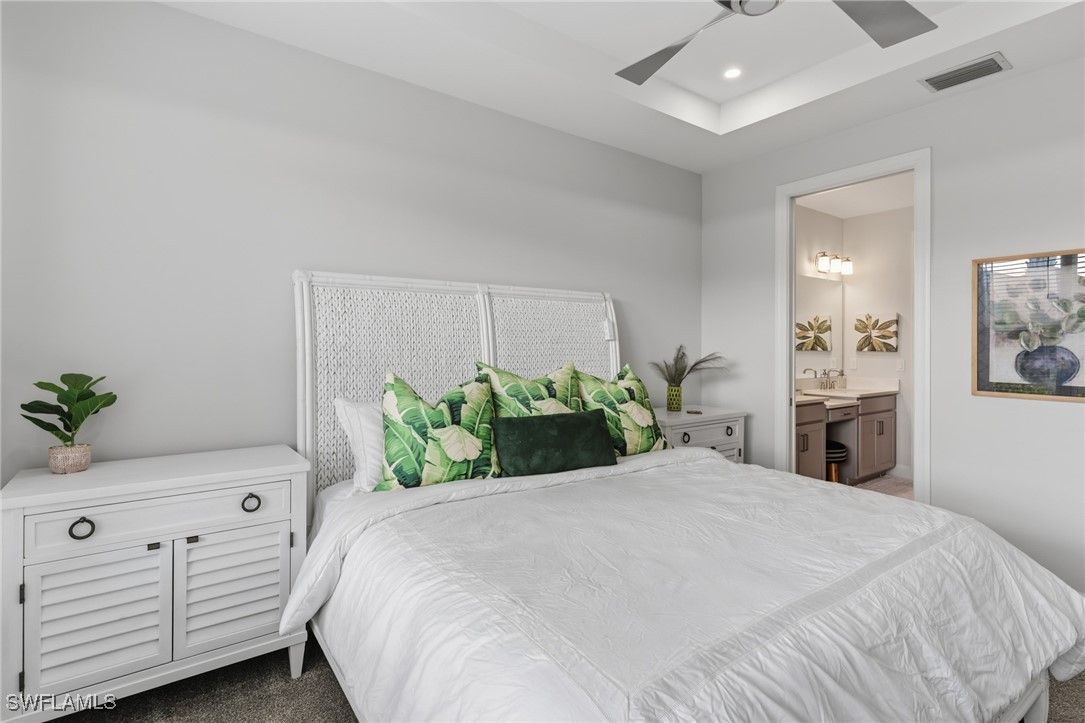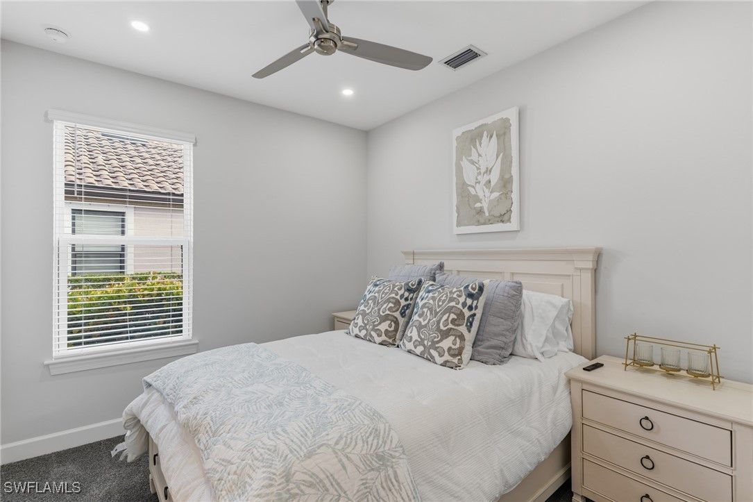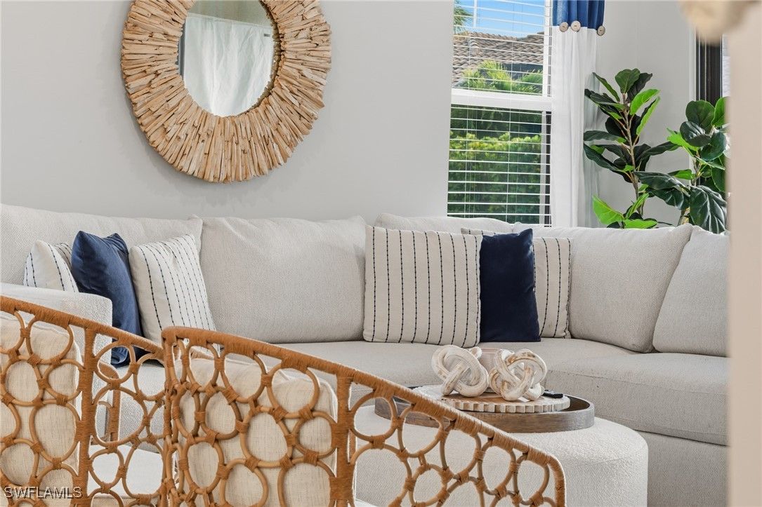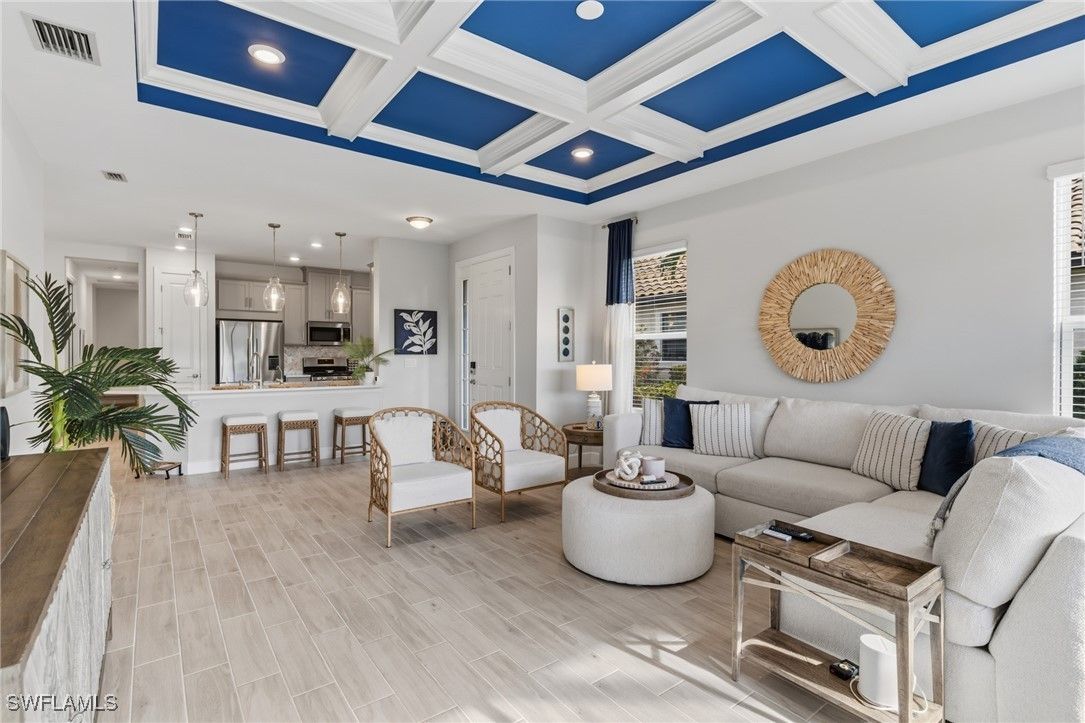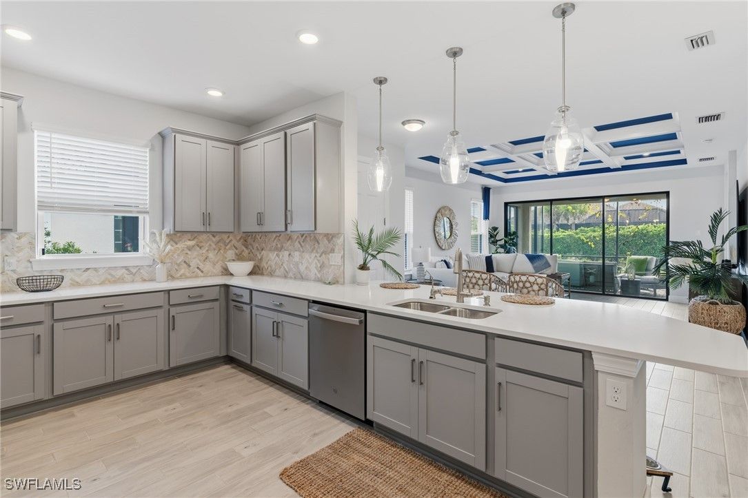 Nearly new and built in 2023, this beautifully designed 3-bedroom + den, 2-bath villa offers 1,950 square feet of stylish, low-maintenance living with a 2-car garage with EV hook up in the highly sought-after Esplanade by the Islands. The home features a gorgeously appointed interior with custom woodwork and plank tile flooring throughout the main living areas. The bright, open kitchen showcases a peninsula layout, quartz countertops, gray shaker cabinetry, tile backsplash, and stainless steel appliances, seamlessly connecting to the dining and living spaces—perfect for everyday living and entertaining. Additionally the community is all natural gas and fit with a WHOLE HOME GENERATOR! The living room is highlighted by an elegant coffered ceiling, adding architectural interest and sophistication. The primary suite is a private retreat featuring a tray ceiling, walk-in closet, and an ensuite bath with dual vanities and a glass-enclosed shower. Additional conveniences include a laundry room with laundry tub and a versatile den ideal for a home office or guest space. Enjoy Florida living outdoors on the screened lanai with privacy wall, complete with an outdoor kitchen and southwest rear exposure, ideal for afternoon sun and evening relaxation. Residents of Esplanade by the Islands enjoy world-class, resort-style amenities, including a grand clubhouse, resort pool and lap pool, full-service spa, fitness center with classes, tennis, pickleball, bocce, dog park, on-site restaurant, and scenic walking and biking paths—all within a gated community ideally located near downtown Naples, Marco Island, shopping, dining, and beaches.