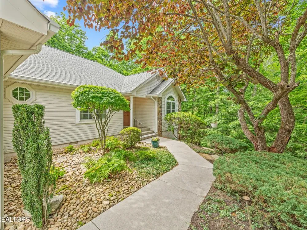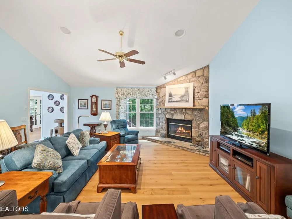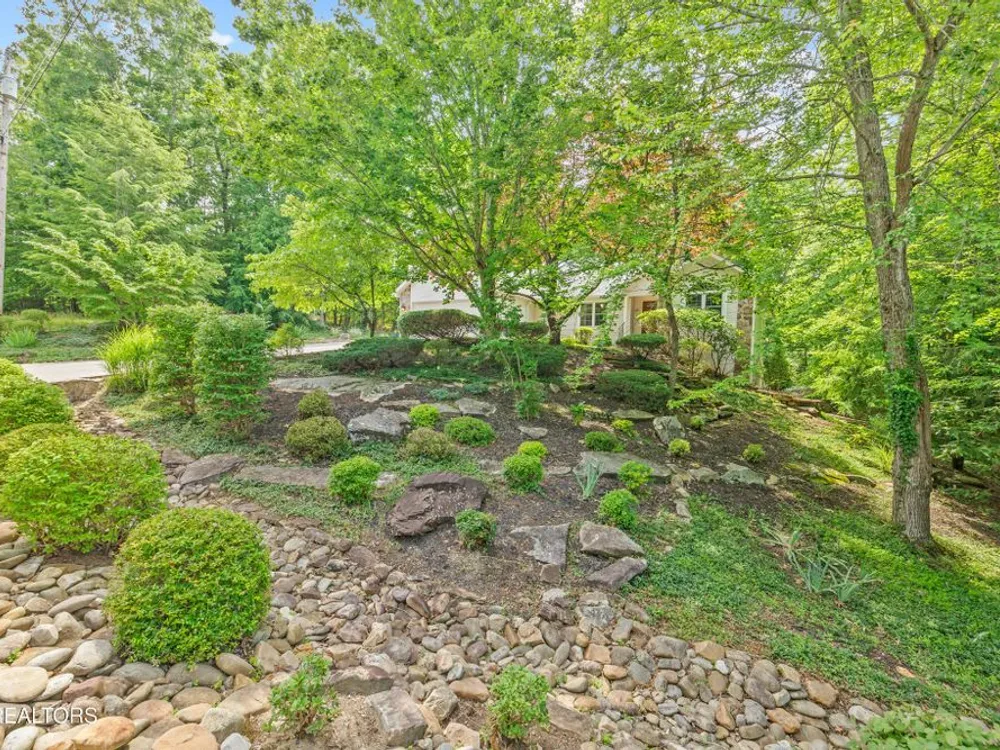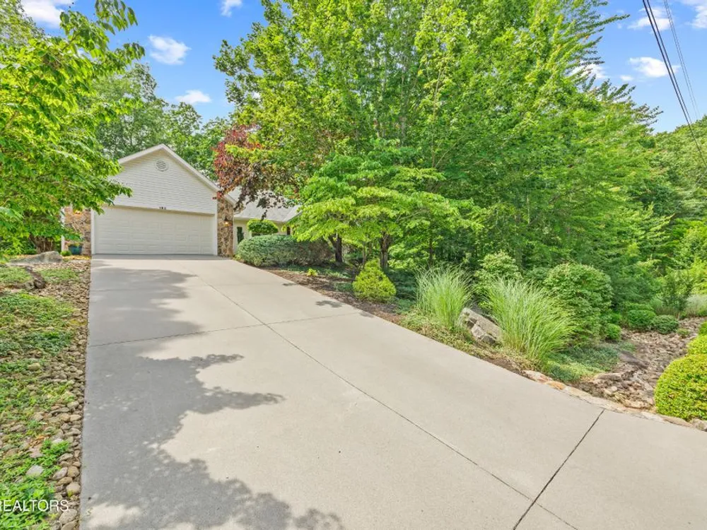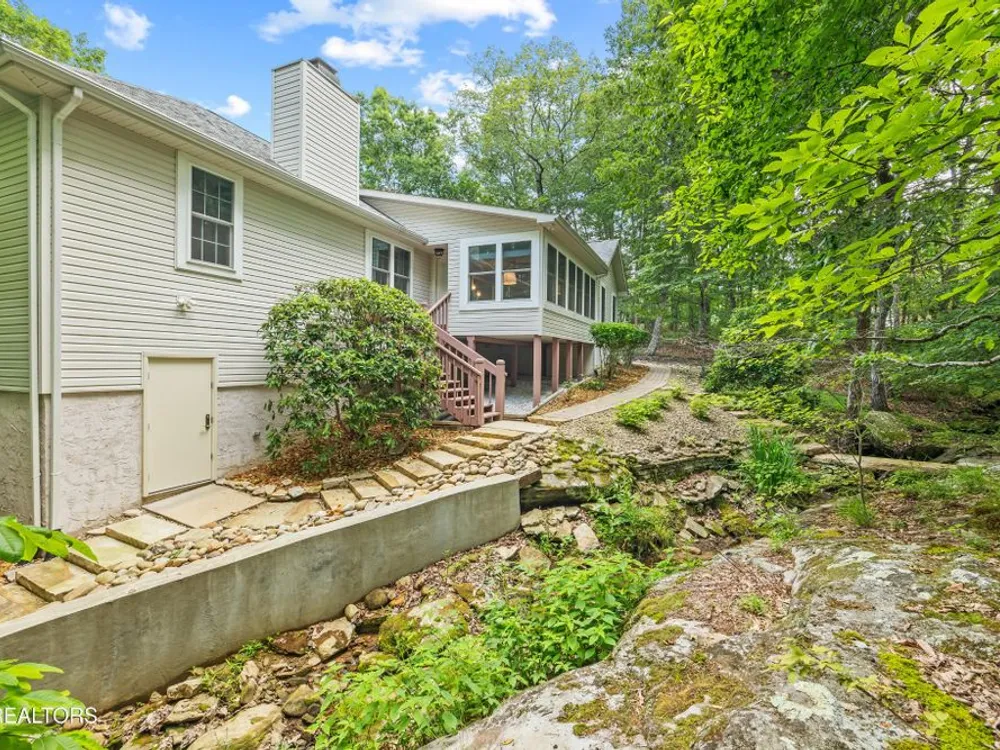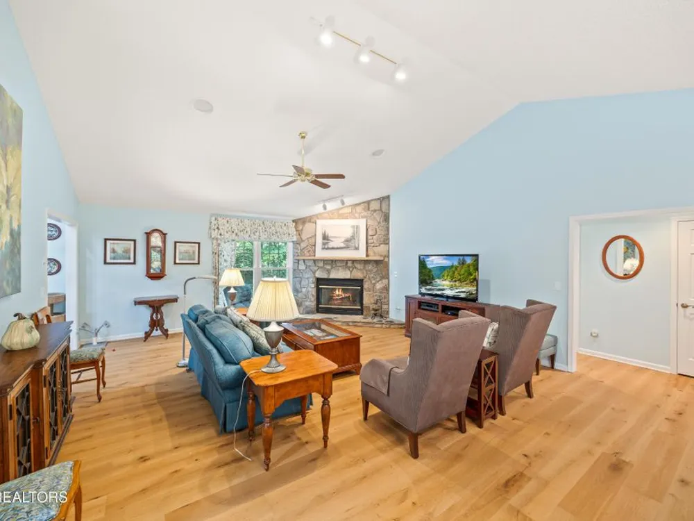 If you like more green space combined with a neighborhood and all the amenities that come with living in a resort community, you'll want to view this home! Tucked among the trees on almost an acre lot along the 8th hole of Stonehenge Golf Course, this home could be your next address. The lot features stone walkways, retaining walls, a creek with stone bridge and rock outcroppings - get a 'peaceful easy feeling' here! Step into the entry to a spacious living/dining room combination with with soaring cathedral ceiling, stone, natural gas fireplace and newer engineered hardwood English White Oak flooring. The home features split bedrooms, spacious sunroom, kitchen with custom cabinets, quartz countertops and tile backsplash. The master suite features trey ceiling, two master closet with organizers and pocket doors, master bath has two vanities, a large, tiled, step-in shower and linen closet. The stand-up crawl space is encapsulated and includes the storage shelves. The spacious, 2-car garage has a closet, cabinets, utility sink and attic access. Windows and doors were replaced with Pella brand. Furnace was replaced in 2025, roof is newer. Other features include a tankless water heater and window blinds with top-down, bottom-up feature. The lot to the left of the home as you face it from the street was combined. Build your mancave or garden shed on it with ACC approval.