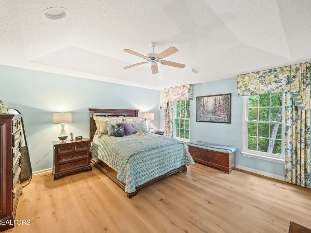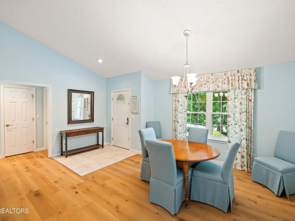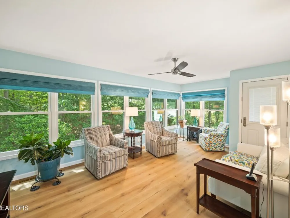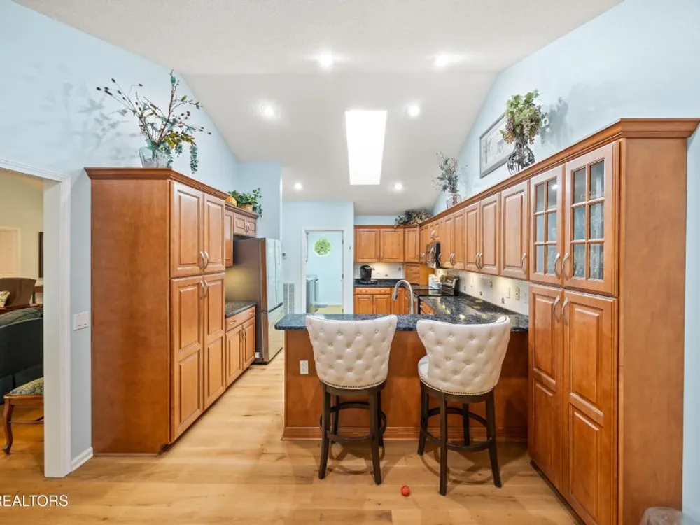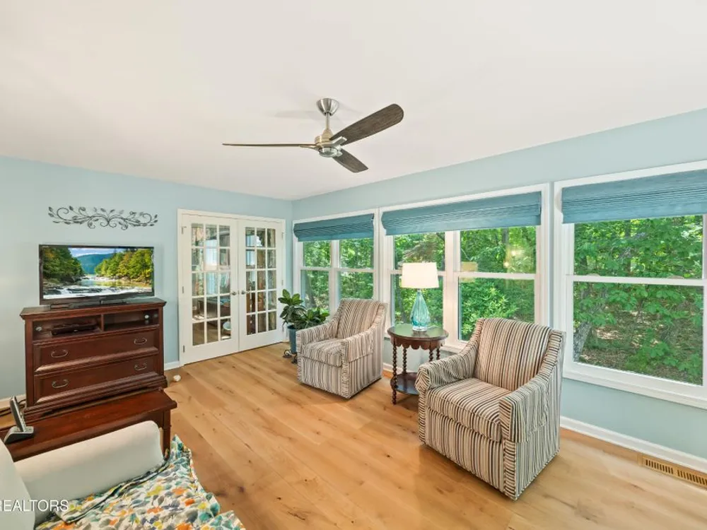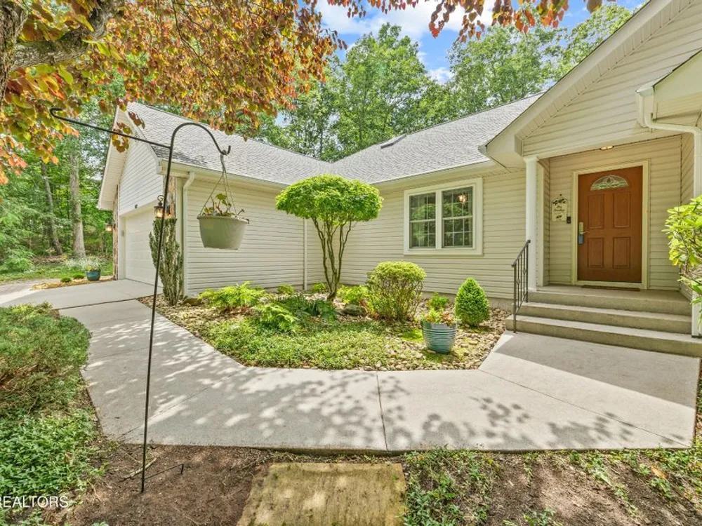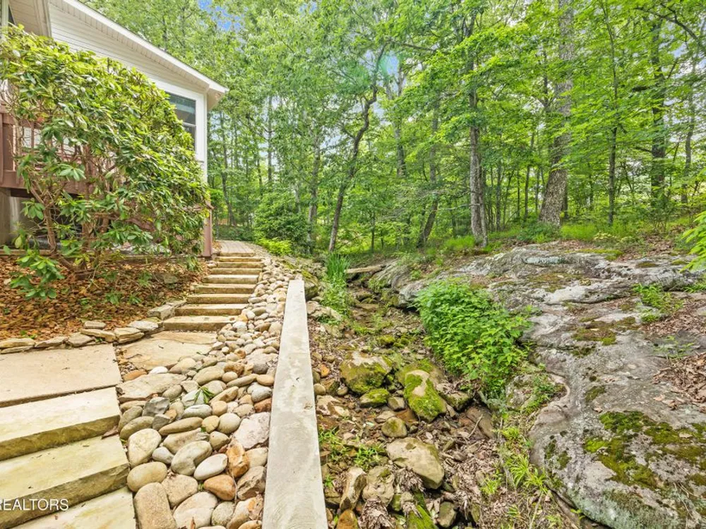 If you like more green space combined with a neighborhood and all the amenities that come with living in a resort community, you'll want to view this home! Tucked among the trees on almost an acre lot along the 8th hole of Stonehenge Golf Course, this home could be your next address. The lot features stone walkways, retaining walls, a creek with stone bridge and rock outcroppings - get a 'peaceful easy feeling' here! Step into the entry to a spacious living/dining room combination with with soaring cathedral ceiling, stone, natural gas fireplace and newer engineered hardwood English White Oak flooring. The home features split bedrooms, spacious sunroom, kitchen with custom cabinets, quartz countertops and tile backsplash. The master suite features trey ceiling, two master closet with organizers and pocket doors, master bath has two vanities, a large, tiled, step-in shower and linen closet. The stand-up crawl space is encapsulated and includes the storage shelves. The spacious, 2-car garage has a closet, cabinets, utility sink and attic access. Windows and doors were replaced with Pella brand. Furnace was replaced in 2025, roof is newer. Other features include a tankless water heater and window blinds with top-down, bottom-up feature. The lot to the left of the home as you face it from the street was combined. Build your mancave or garden shed on it with ACC approval.