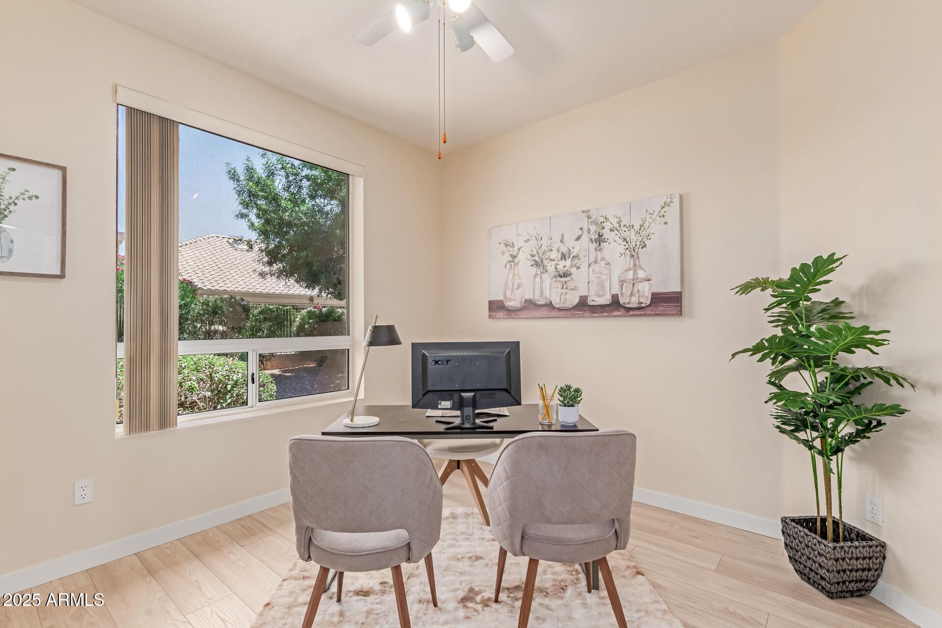 The very best in Retirement Living is what defines Sun City West! A vibrant community featuring 7 golf courses, 4 Recreation Centers, pickleball, bocce ball, swimming, tennis, a performance theatre +90 Clubs, means you will never be at a lost for something to do! This freshly painted, IMMACULATE home has it all with NO HOA, 2 bedrooms + a den, a coveted North/South orientation, a spacious eat-in kitchen with breakfast bar showcases granite countertops, a stylish tile backsplash, center island, newly upgraded SS appliances including a gas stove and lots of cabinetry with pull-out shelving. The open-concept living and dining area flows perfectly for everyday living or entertaining. and includes a newer 4 ton A/C (2024), new engineered wood flooring throughout, plus new carpet in both bedrooms. The versatile den/office could serve as a 3rd bedroom, a home gym, a craft room or perhaps a Grandkids' play area. The spacious primary suite includes a huge walk-in closet, an ensuite bath with a shower and natural lighting, plus a large window overlooking the backyard with low maintenance landscaping. Located only minutes to the Desert Trails golf course, and the Palm Ridge Recreation Center - this home and community are what desert retirement living are all about!