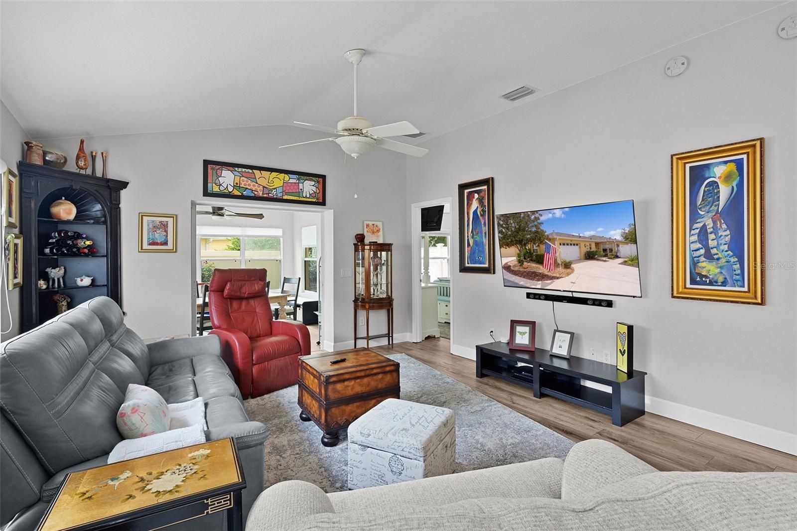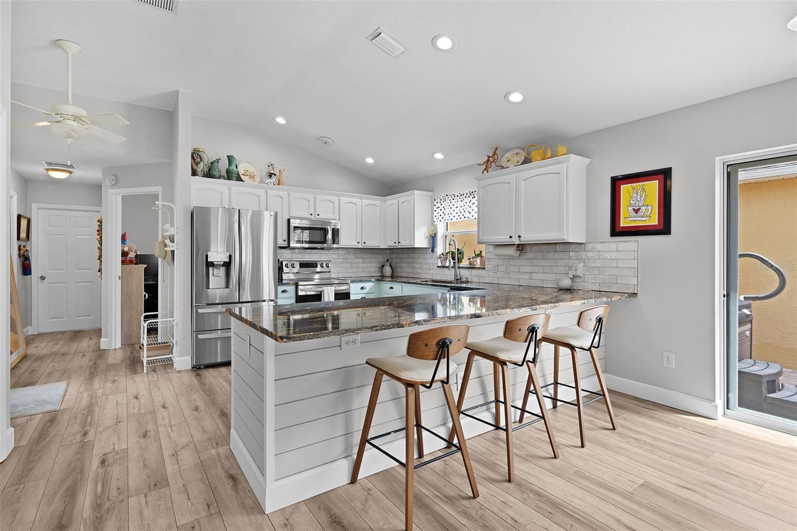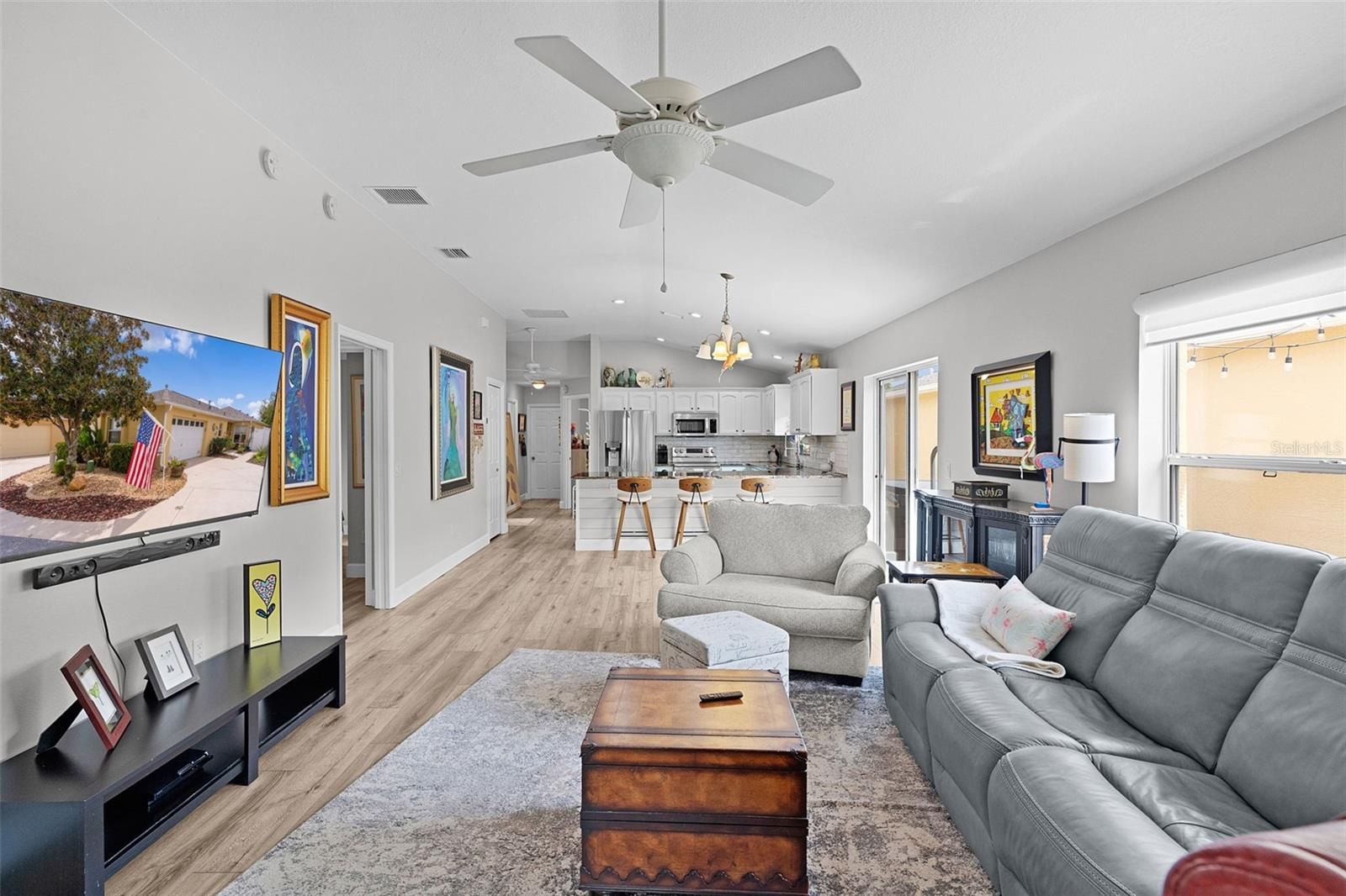 PRIME LOCATION, VALUE & NO BOND! Nestled in the vibrant VILLAGE OF POINCIANA, this stunning 3-bedroom, 2-bathroom FOXGLOVE COURTYARD VILLA is .7 miles from the popular CANE GARDEN Country Club & Championship Golf Course, placing you at the epicenter of The Villages’ unparalleled lifestyle. Enjoy a short 2.5 mile golf cart ride to LAKE SUMTER LANDING MARKET SQUARE for nightly live entertainment, boutique shopping, and diverse dining. Surrounded by world-class amenities, you’re walking distance to the community pool, postal station, pickleball and tennis courts, and multiple executive and championship golf courses, with recreation centers nearby for endless activities. This 2021-REMODELED VILLA exudes a chic, eclectic coastal vibe with MODERN UPGRADES throughout. The EXPANDED OPEN FLOOR PLAN features a bright, airy ambiance with VOLUME KNOCKDOWN CEILINGS, solar tubes, and Luxury Vinyl Plank (LVP) and tile flooring (NO CARPET!). The gourmet kitchen is an entertainer’s dream, boasting LG STAINLESS STEEL APPLIANCES, painted cabinetry with new hardware, GRANITE countertops, a SUBWAY TILE backsplash, a farm-style GRANITE COMPOSITE SINK with gooseneck faucet, and a SHIPLAP-wrapped counter-height breakfast bar. The REMODELED LANAI, updated in 2012, seamlessly extends the air-conditioned living space, perfect for year-round enjoyment. The primary suite offers a spa-like retreat with a FULLY REMODELED BATHROOM, featuring a glass-enclosed shower with WATERFALL TILE, RAIN SHOWERHEAD, sea-glass river rock flooring, modern single vanity, updated toilet, and stylish fixtures. The GUEST SUITE, with a PRIVATE POCKET DOOR, includes a REMODELED BATHROOM with a tub/shower combo, solid-surface vanity, new faucet, and a spacious bedroom with built-in closet. The versatile third bedroom, complete with a large built-in closet, is ideal as an office, art studio, music room, or den. Additional highlights include LED recessed lighting, FRESH INTERIOR AND EXTERIOR PAINT, a 2024 ROOF, NATURAL GAS, an INDOOR LAUNDRY ROOM with utility sink, and a 1.5-car garage with space for a vehicle and golf cart. The LOW-MAINTENANCE, fenced, PRIVATE COURTYARD, adorned with interlocking pavers and artificial grass, is perfect for pets, entertaining, or a hot tub oasis. Live where convenience meets luxury in The Villages’ active lifestyle community! Schedule your private or virtual tour today!