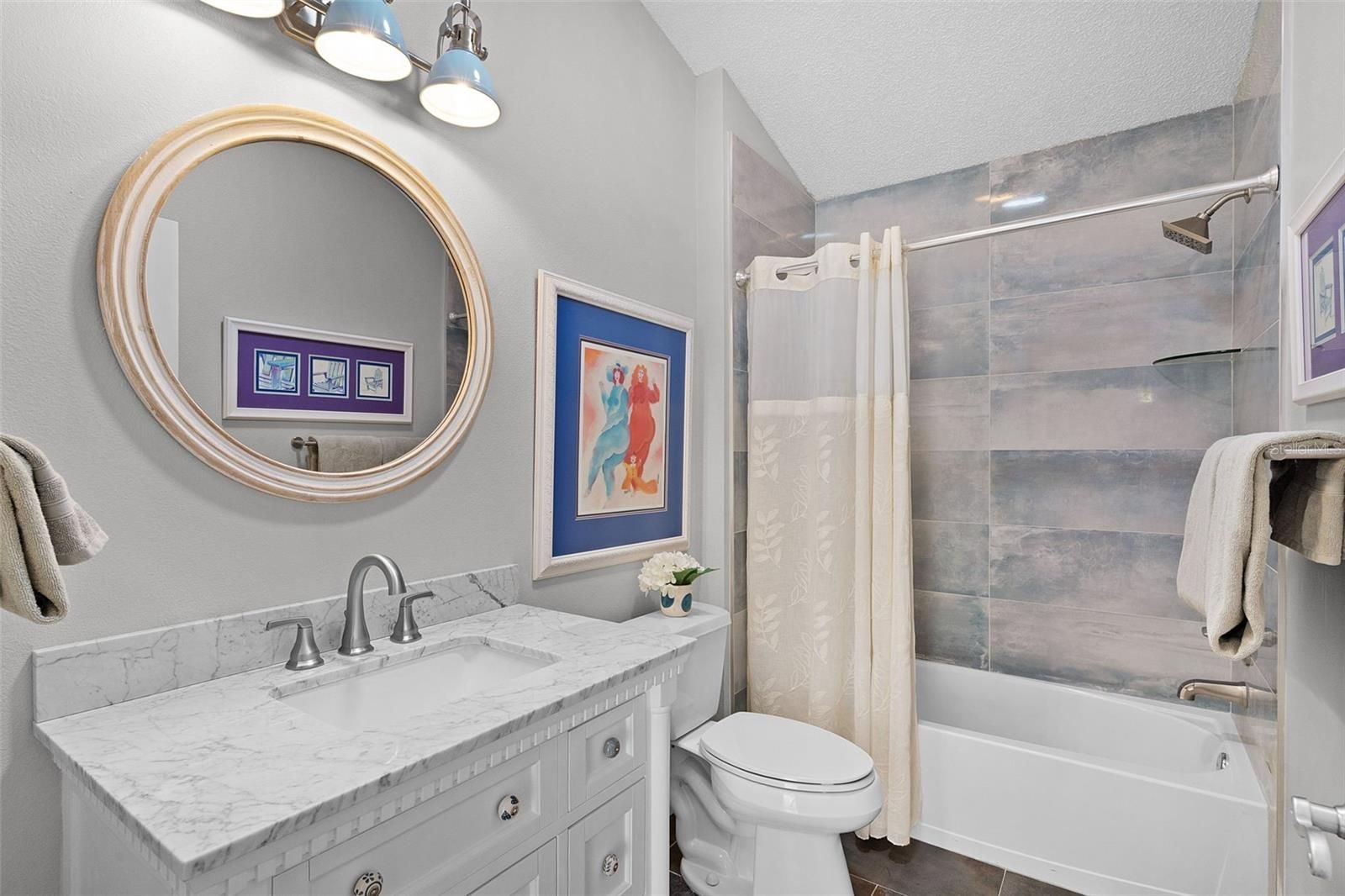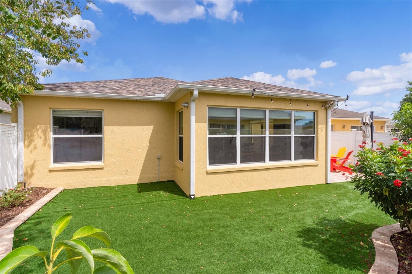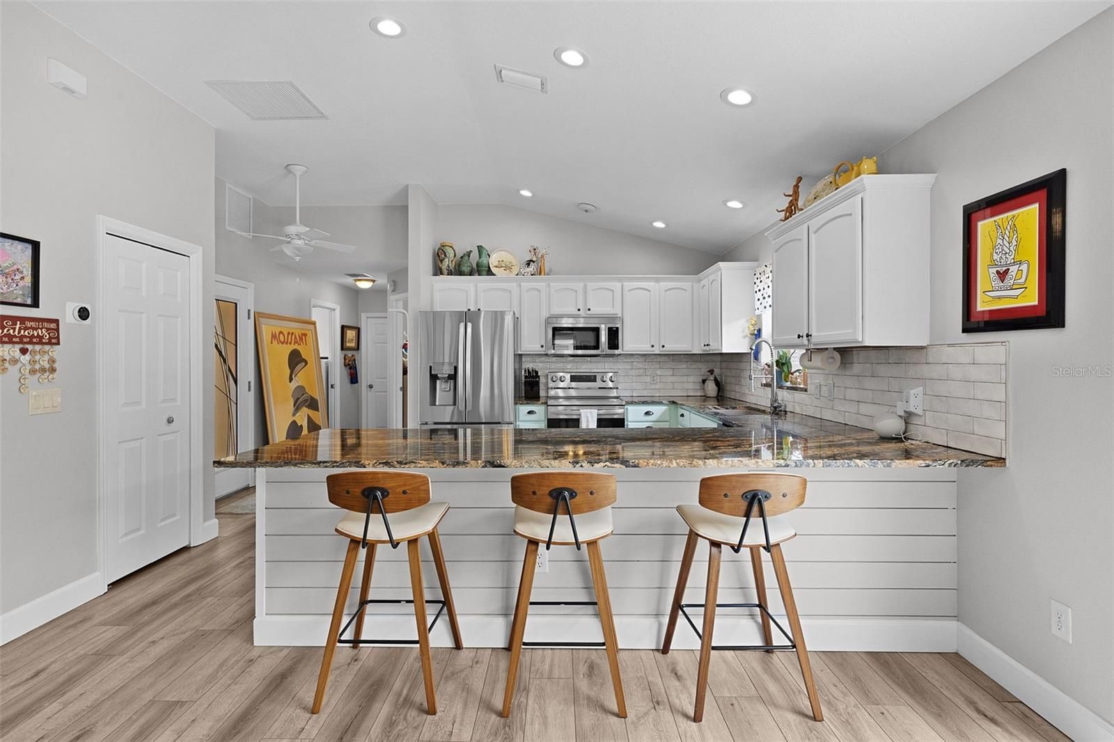 PRIME LOCATION, VALUE & NO BOND! Nestled in the vibrant VILLAGE OF POINCIANA, this stunning 3-bedroom, 2-bathroom FOXGLOVE COURTYARD VILLA is .7 miles from the popular CANE GARDEN Country Club & Championship Golf Course, placing you at the epicenter of The Villages’ unparalleled lifestyle. Enjoy a short 2.5 mile golf cart ride to LAKE SUMTER LANDING MARKET SQUARE for nightly live entertainment, boutique shopping, and diverse dining. Surrounded by world-class amenities, you’re walking distance to the community pool, postal station, pickleball and tennis courts, and multiple executive and championship golf courses, with recreation centers nearby for endless activities. This 2021-REMODELED VILLA exudes a chic, eclectic coastal vibe with MODERN UPGRADES throughout. The EXPANDED OPEN FLOOR PLAN features a bright, airy ambiance with VOLUME KNOCKDOWN CEILINGS, solar tubes, and Luxury Vinyl Plank (LVP) and tile flooring (NO CARPET!). The gourmet kitchen is an entertainer’s dream, boasting LG STAINLESS STEEL APPLIANCES, painted cabinetry with new hardware, GRANITE countertops, a SUBWAY TILE backsplash, a farm-style GRANITE COMPOSITE SINK with gooseneck faucet, and a SHIPLAP-wrapped counter-height breakfast bar. The REMODELED LANAI, updated in 2012, seamlessly extends the air-conditioned living space, perfect for year-round enjoyment. The primary suite offers a spa-like retreat with a FULLY REMODELED BATHROOM, featuring a glass-enclosed shower with WATERFALL TILE, RAIN SHOWERHEAD, sea-glass river rock flooring, modern single vanity, updated toilet, and stylish fixtures. The GUEST SUITE, with a PRIVATE POCKET DOOR, includes a REMODELED BATHROOM with a tub/shower combo, solid-surface vanity, new faucet, and a spacious bedroom with built-in closet. The versatile third bedroom, complete with a large built-in closet, is ideal as an office, art studio, music room, or den. Additional highlights include LED recessed lighting, FRESH INTERIOR AND EXTERIOR PAINT, a 2024 ROOF, NATURAL GAS, an INDOOR LAUNDRY ROOM with utility sink, and a 1.5-car garage with space for a vehicle and golf cart. The LOW-MAINTENANCE, fenced, PRIVATE COURTYARD, adorned with interlocking pavers and artificial grass, is perfect for pets, entertaining, or a hot tub oasis. Live where convenience meets luxury in The Villages’ active lifestyle community! Schedule your private or virtual tour today!
