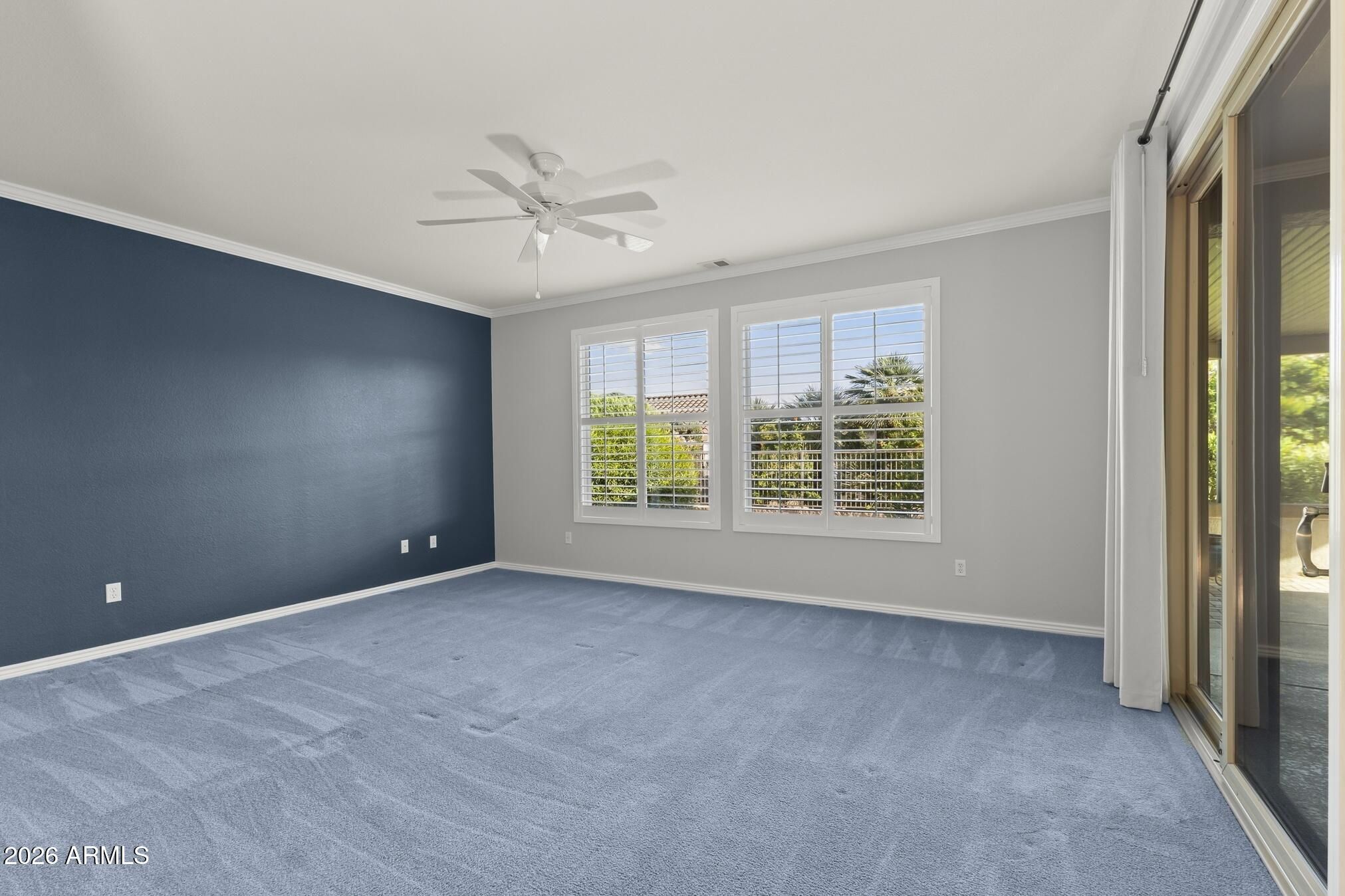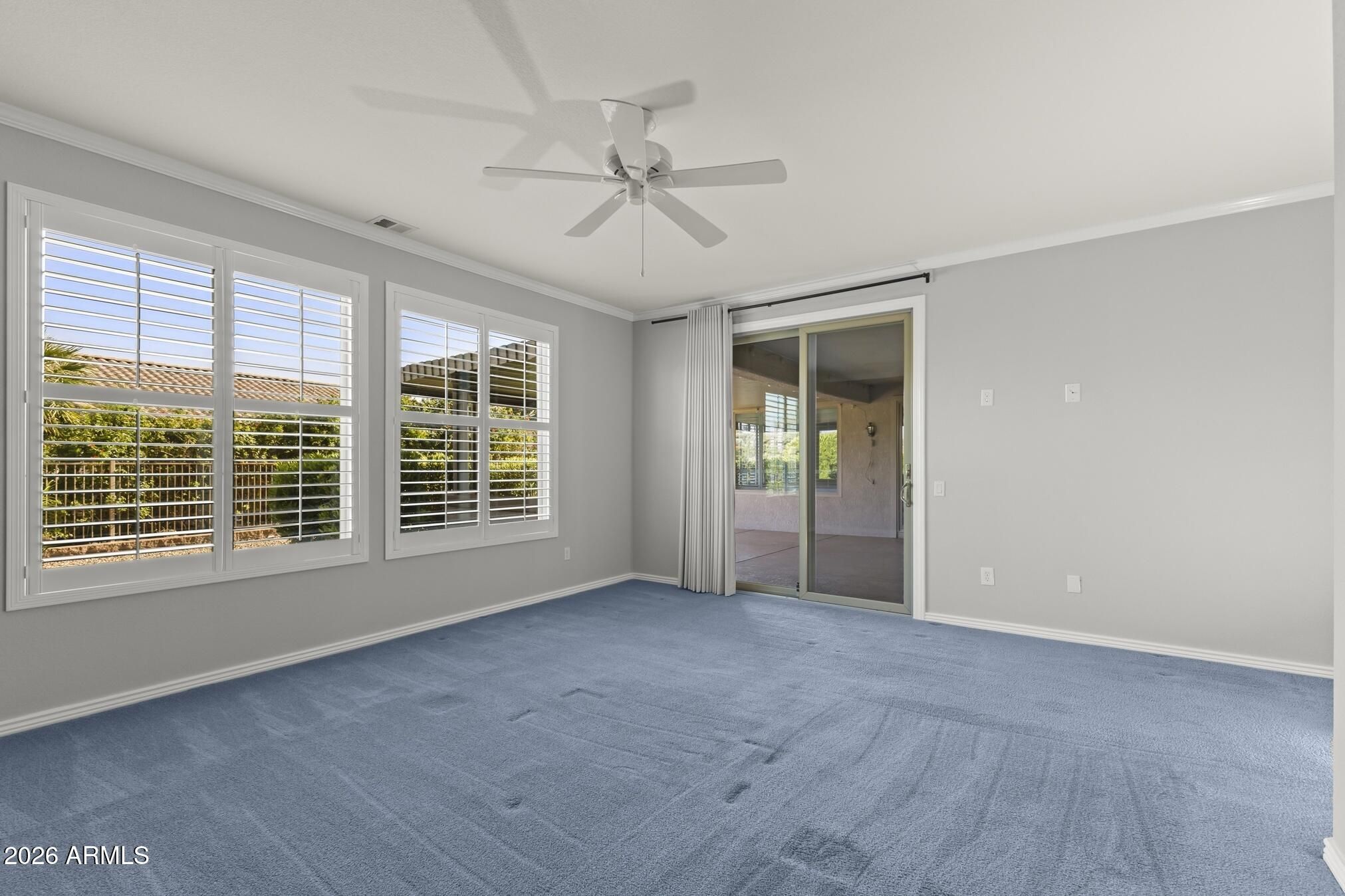 Welcome to The Grand! A private north/south-facing cul-de-sac lot, this Windrose II floorplan features significant system and interior upgrades. Improvements include a new roof, Renewal by Andersen windows, a Tesla solar system, an upgraded HVAC system, and a new water heater. The home offers tile flooring, updated carpeting, crown molding, upgraded baseboards, plantation shutters, and custom window treatments. The kitchen features granite countertops and upgraded appliances, while the primary bath includes a curb-less walk-in shower. Additional improvements include an upgraded primary closet system, exterior paint, a new washer and dryer, security cameras with Ring doorbell, plus a covered patio, refreshed landscaping, fencing, and an upgraded sprinkler system. A private north/south-facing cul-de-sac lot, this thoughtfully updated Windrose II floorplan offers a comfortable layout, along with important system improvements and quality interior upgrades. Significant recent improvements include a new roof, Renewal by Andersen replacement windows, a Tesla solar system owned by the seller, an upgraded HVAC system, and a new water heater, providing meaningful updates that support energy efficiency and long-term reliability. Inside, the home features porcelain tile flooring, updated carpeting, elaborate crown molding, and upgraded baseboards, creating a clean and well-finished interior. Plantation shutters and custom window treatments are installed throughout, and the primary closet has been upgraded with an organized closet system for improved storage. The kitchen has been enhanced with granite countertops and upgraded appliances, creating a functional space that flows seamlessly into the main living areas. The primary bathroom has been remodeled with a curbless walk-in shower, providing both modern design and ease of use. Additional improvements include a new washer and dryer, exterior paint, and a security system with cameras and a Ring doorbell. The home is also under termite containment service. Outdoor living features a covered rear patio, refreshed landscaping, backyard fencing, and an upgraded sprinkler system, creating a private setting to enjoy Arizona's climate. This Windrose II combines a desirable cul-de-sac location with substantial system upgrades and practical interior improvements, reflecting careful ownership and consistent maintenance.