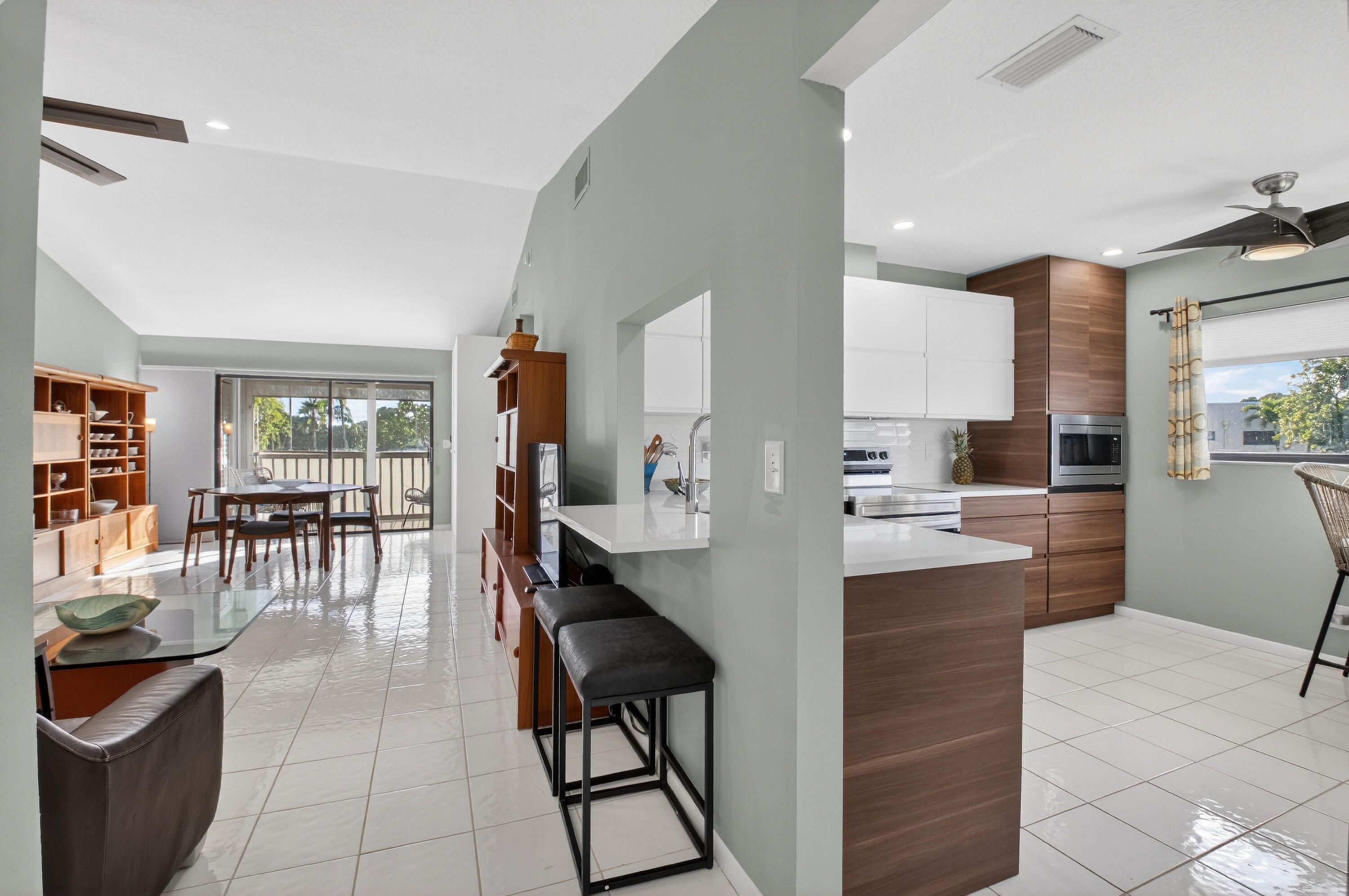 STUNNING TOTAL RENOVATION! THIS BEAUTIFUL CORNER 2 BEDROOM, 2 BATH IS SURROUNDED BY EXPANSIVE LAKE VIEWS. This LIGHT AND BRIGHT 2nd floor condo with VAULTED CEILINGS is located at the very end of this ELEVATOR BUILDING with views of light bouncing off the lake. This home showcases a gorgeous, fully renovated kitchen and beautiful bathrooms. Sliding glass doors open to a relaxing screened patio. There is a BONUS COMBINATION OFFICE / LAUNDRY ROOM. This home is offered furnished / turnkey. Pembridge H has a worry-free new roof. Lakes of Delray is an Active Lifestyle 55+ Gated Community with 24 Hour Security. Enjoy resort-style living with weekly activities of many clubs, fitness center, tennis, pickleball, billiard room, swimming pools, scenic walking paths and much more.