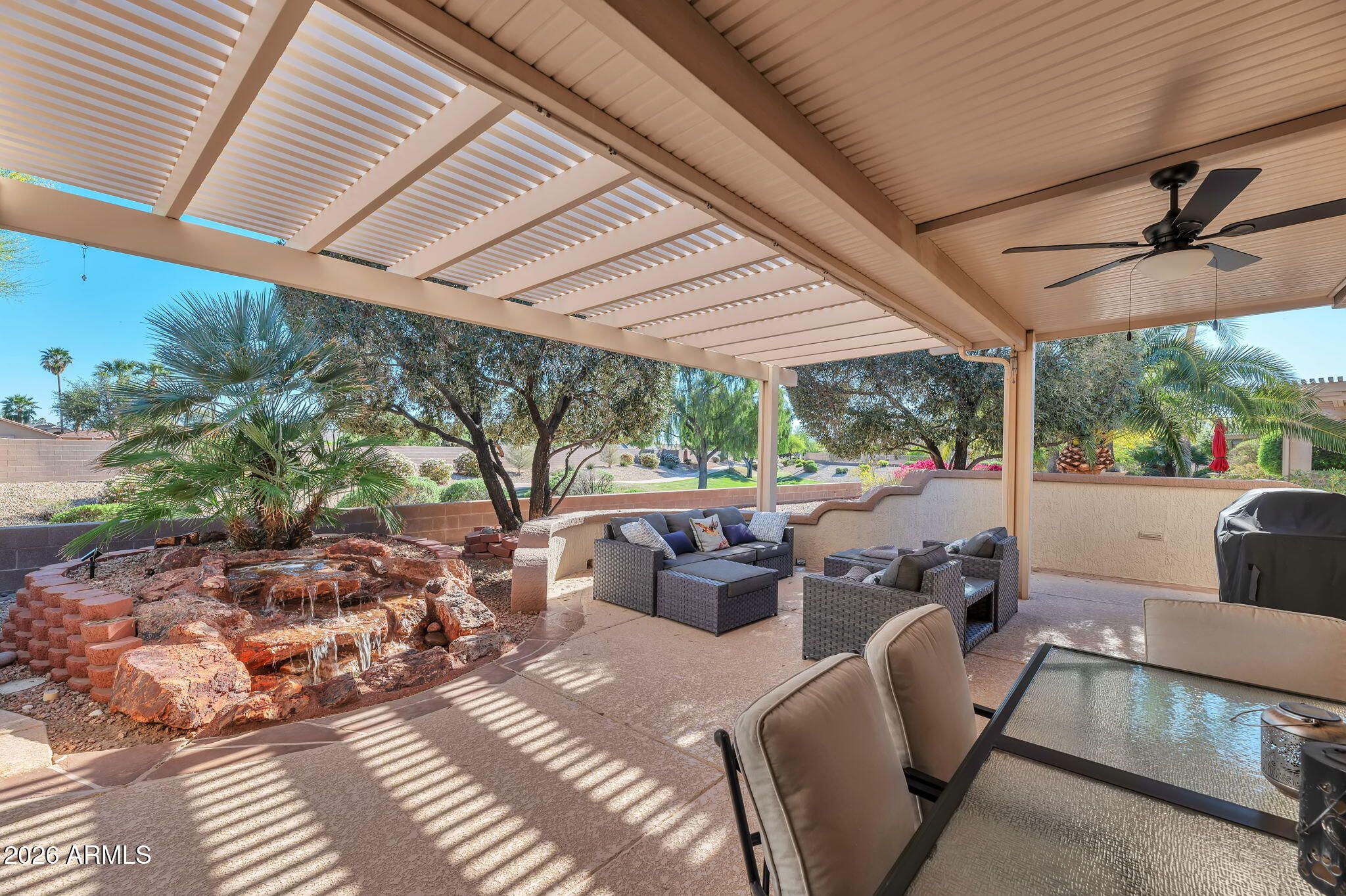 This unique Verde model is situated in the desirable Sun City Grand community. Explore the amenities or retreat to this inviting home featuring a spacious great room layout, 2 bedrooms, 2 baths with separate den/office. The light-filled kitchen and adjoining breakfast nook offer an island & abundant cabinetry. The primary suite showcases bay windows for natural light and a generously sized walk-in closet. The en-suite bathroom is equipped with a dual-sink vanity and walk-in shower. The secondary bedroom has been modified to create a private retreat. Enjoy outdoor living on the patio relaxing in the hot tub, entertaining guests or just enjoying the peaceful, private waterfall. An extended garage, central vacuum & water softening systems and owned Solar are a few more benefits of this ho