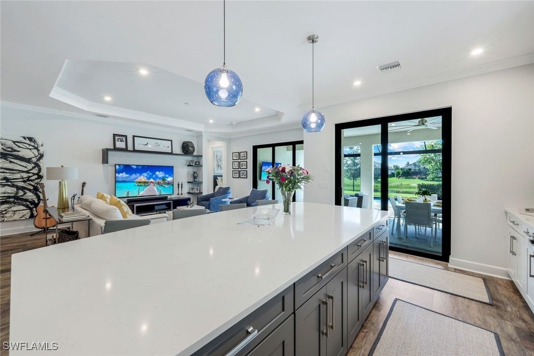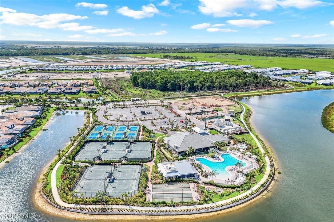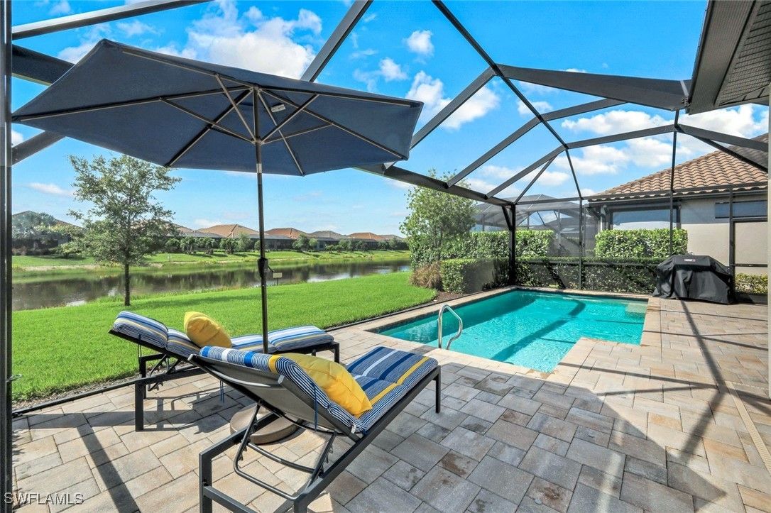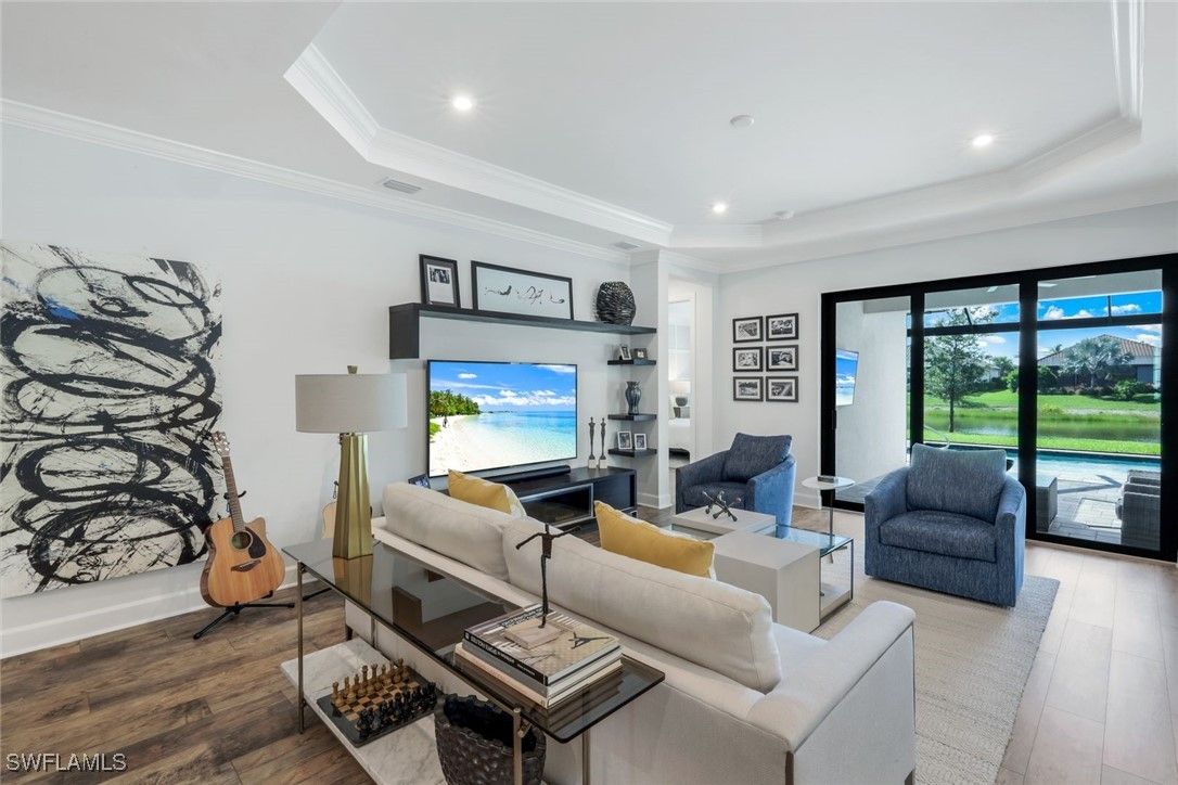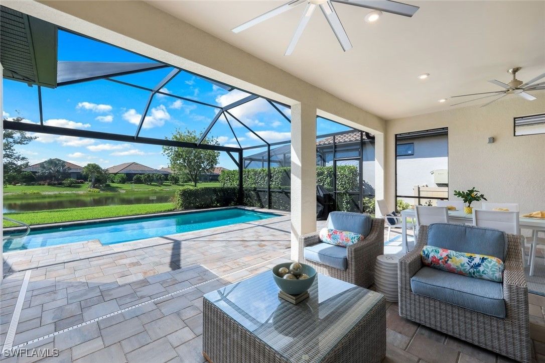MOVE-IN READY! LIGHTLY LIVED IN - LIKE NEW HOME WITH NO PUNCH LIST! Welcome to the modern Lazio model home, a masterfully designed three-bedroom, plus den, three-bath, pool home, set within the lifestyle-rich community of the Esplanade by the Islands. This elegant residence is move-in ready which includes the furniture, offers volume ceilings, clean lines and contemporary-upgraded finishes. Enhanced details include: laminate wood-look flooring (NO CARPET), upgraded cabinetry, quartz countertops, high-impact windows and more. Character-rich custom elements in the home include the raised-panel wood accent slat-wall in the dining area, designer light fixtures, tailor-made den bookcase, custom trim and crown molding... all which blend and balance warmth with modern, throughout the home. The gourmet kitchen is a cook's dream showcasing quartz countertops, expansive island for both prep and gathering, GE appliances and a natural gas cookstove. Additional highlights include a double-car garage, a spacious den/office, an open-concept layout that invites natural light and effortless flow of the home. The spacious outdoor living space can be tranquil and relaxing with a book by the pool and gleam of the lake or it can be fun and entertaining with friends and family. The Esplanade by the Islands amenities include tennis and pickleball, full fitness center, eight miles of walking trails, dining and pool & spa and more. The community was inspired by its sister property, Esplanade Golf an Immokalee Road and aspires to create a luxurious lifestyle. This home is located close to downtown Old Naples and Marco Island.