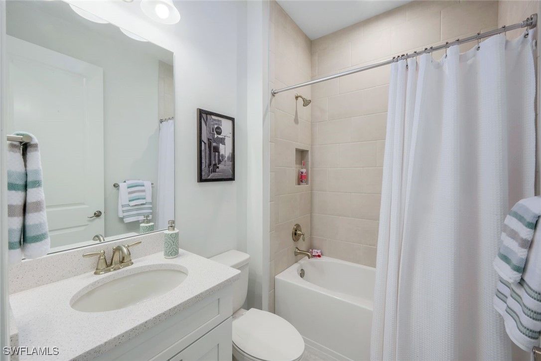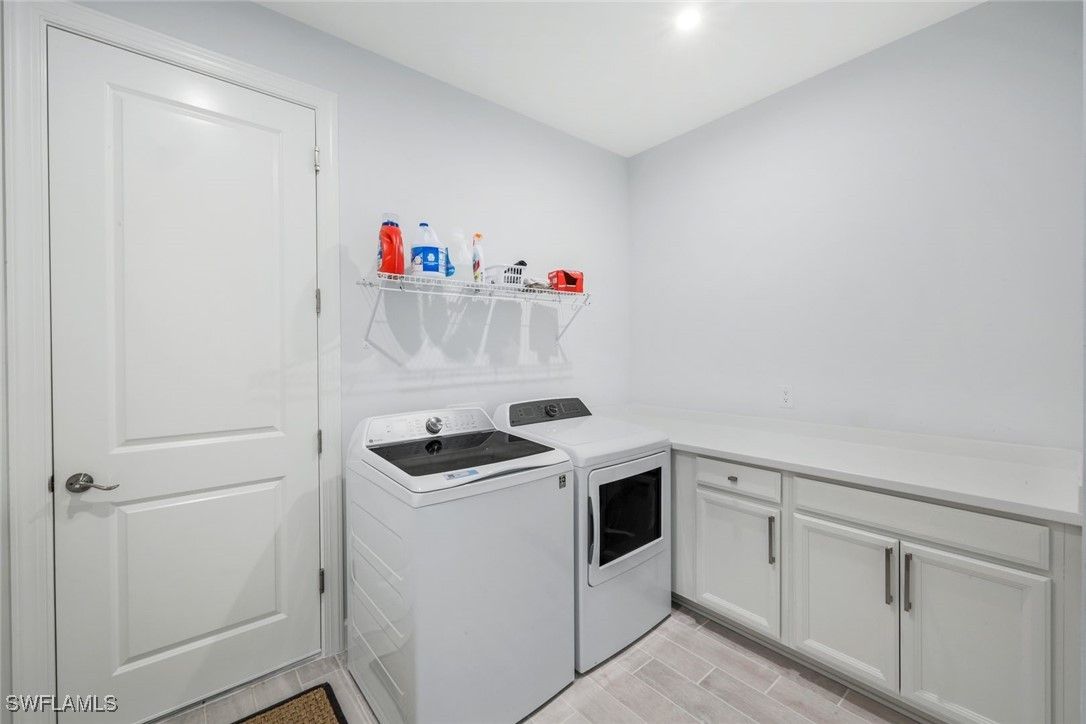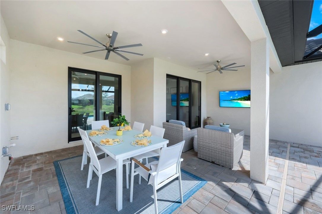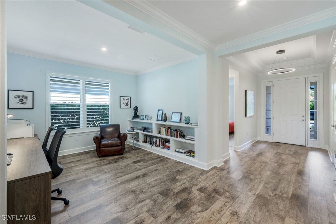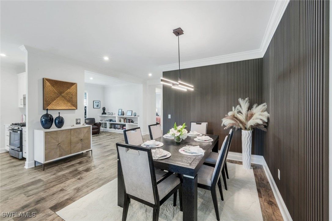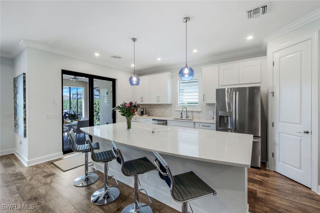 MOVE-IN READY! LIGHTLY LIVED IN - LIKE NEW HOME WITH NO PUNCH LIST! Welcome to the modern Lazio model home, a masterfully designed three-bedroom, plus den, three-bath, pool home, set within the lifestyle-rich community of the Esplanade by the Islands. This elegant residence is move-in ready which includes the furniture, offers volume ceilings, clean lines and contemporary-upgraded finishes. Enhanced details include: laminate wood-look flooring (NO CARPET), upgraded cabinetry, quartz countertops, high-impact windows and more. Character-rich custom elements in the home include the raised-panel wood accent slat-wall in the dining area, designer light fixtures, tailor-made den bookcase, custom trim and crown molding... all which blend and balance warmth with modern, throughout the home. The gourmet kitchen is a cook's dream showcasing quartz countertops, expansive island for both prep and gathering, GE appliances and a natural gas cookstove. Additional highlights include a double-car garage, a spacious den/office, an open-concept layout that invites natural light and effortless flow of the home. The spacious outdoor living space can be tranquil and relaxing with a book by the pool and gleam of the lake or it can be fun and entertaining with friends and family. The Esplanade by the Islands amenities include tennis and pickleball, full fitness center, eight miles of walking trails, dining and pool & spa and more. The community was inspired by its sister property, Esplanade Golf an Immokalee Road and aspires to create a luxurious lifestyle. This home is located close to downtown Old Naples and Marco Island.