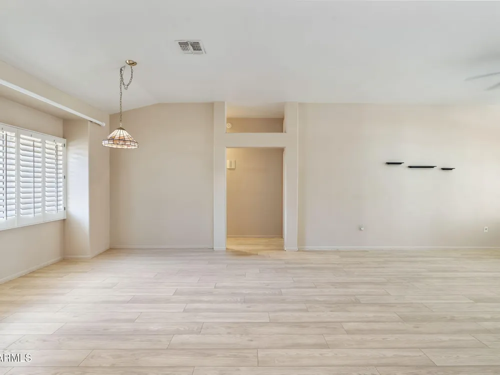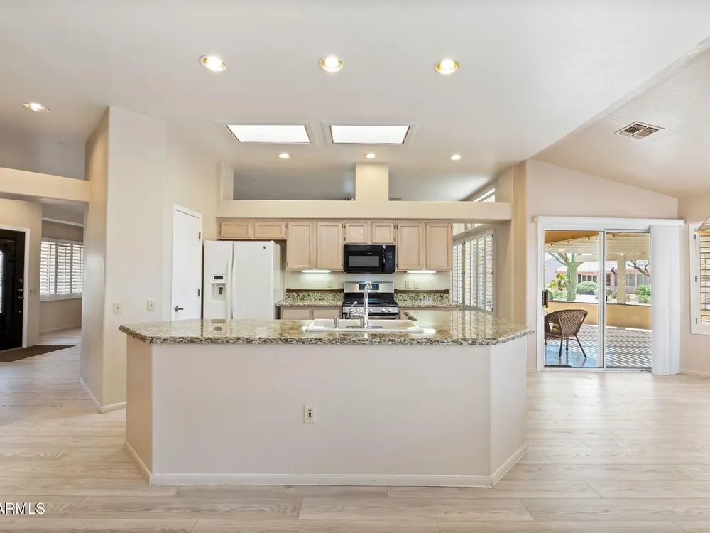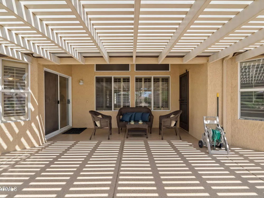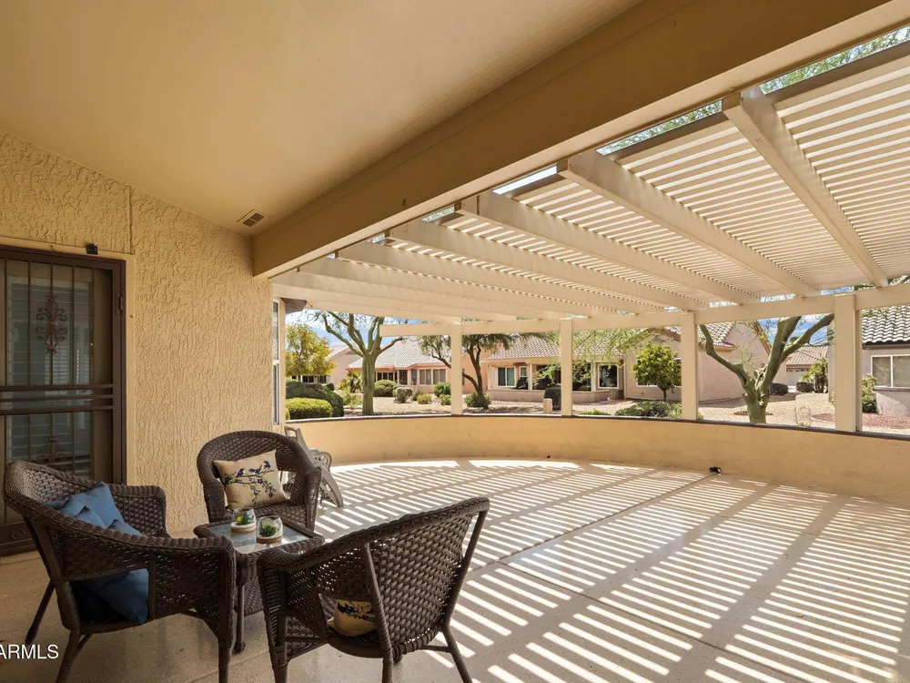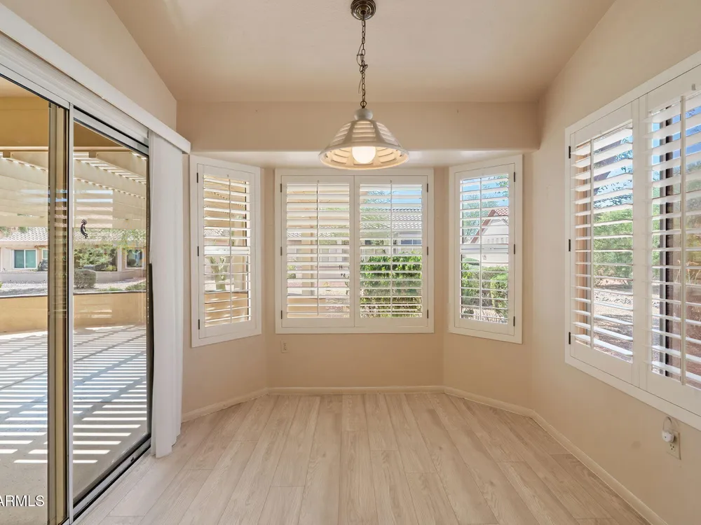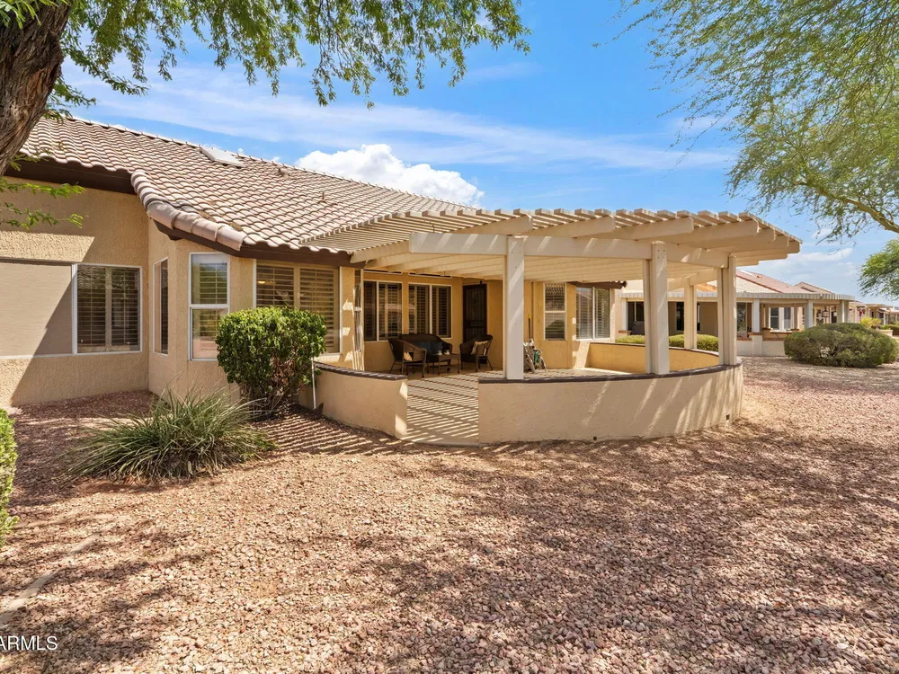 Enjoy resort-style living in this bright 2BR/2BA Sun City West home! Welcoming front patio ideal for relaxing and enjoying the Arizona sunsets. The open floor plan features vaulted ceilings, updated flooring, and neutral colors throughout. The eat-in kitchen offers a spacious center island, sunny breakfast nook, pantry, and plenty of cabinet space. The primary suite includes dual sinks, a walk-in closet, and backyard access. A small office area is perfect for work or hobbies. Relax out back under the covered patio surrounded by low-maintenance desert landscaping with room to entertain. This home also has wood shutters, dual pane windows, gutters and garage storage. Located in a sought-after 55+ community offering a pool, spa, pickleball, golf, workout facilities, and more!