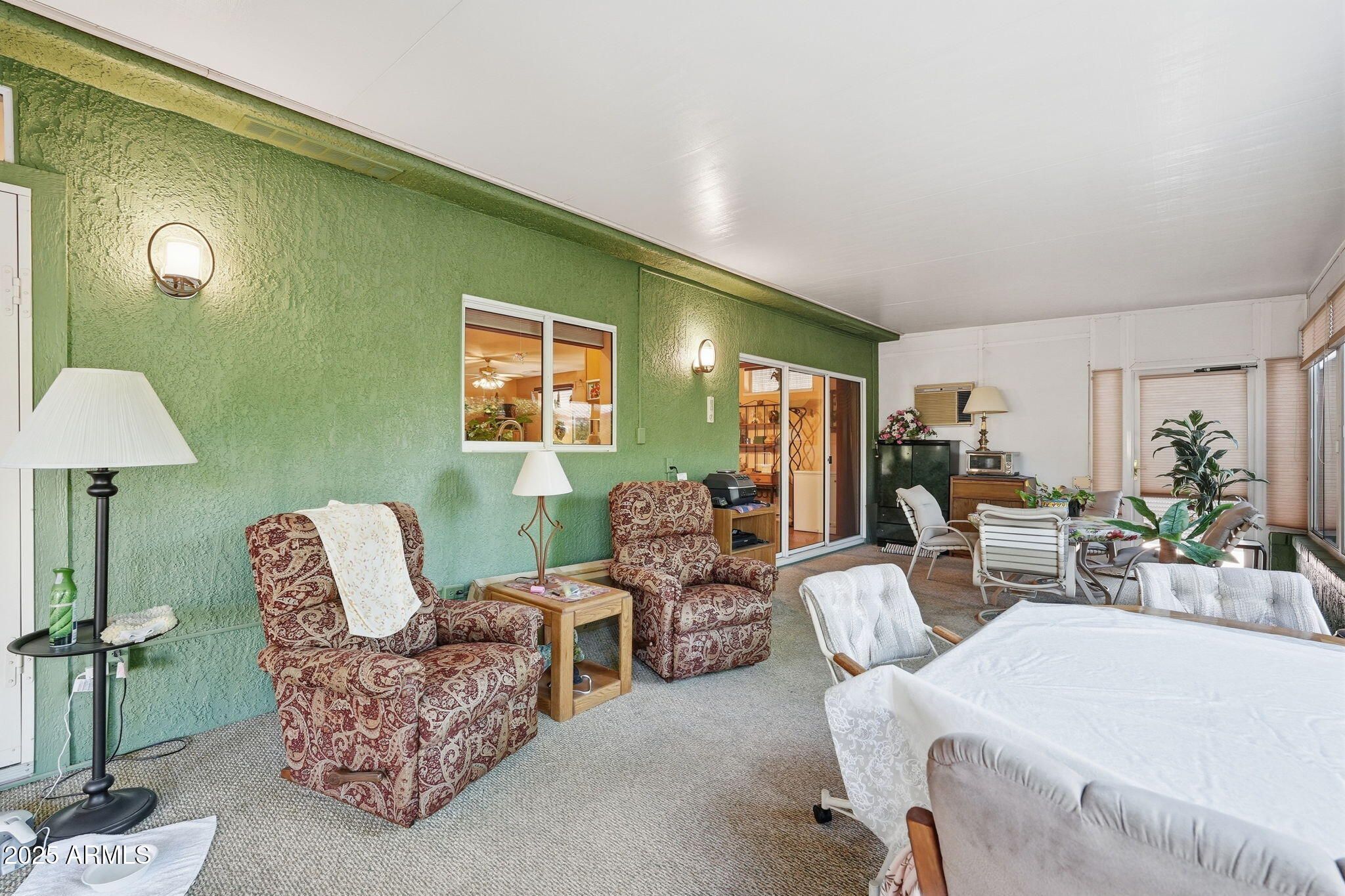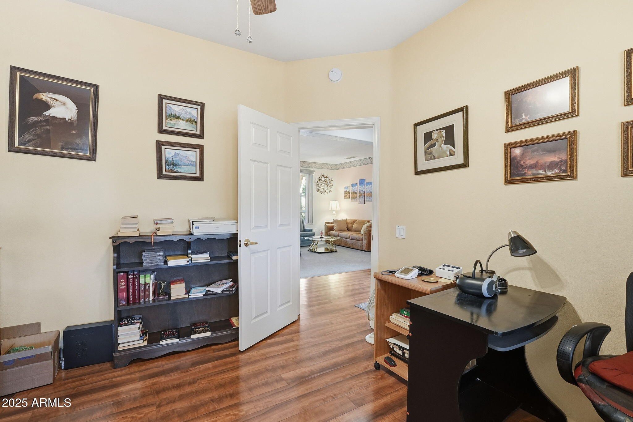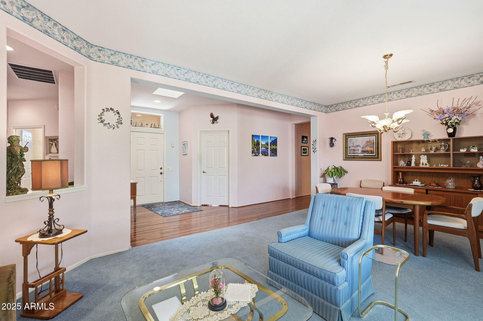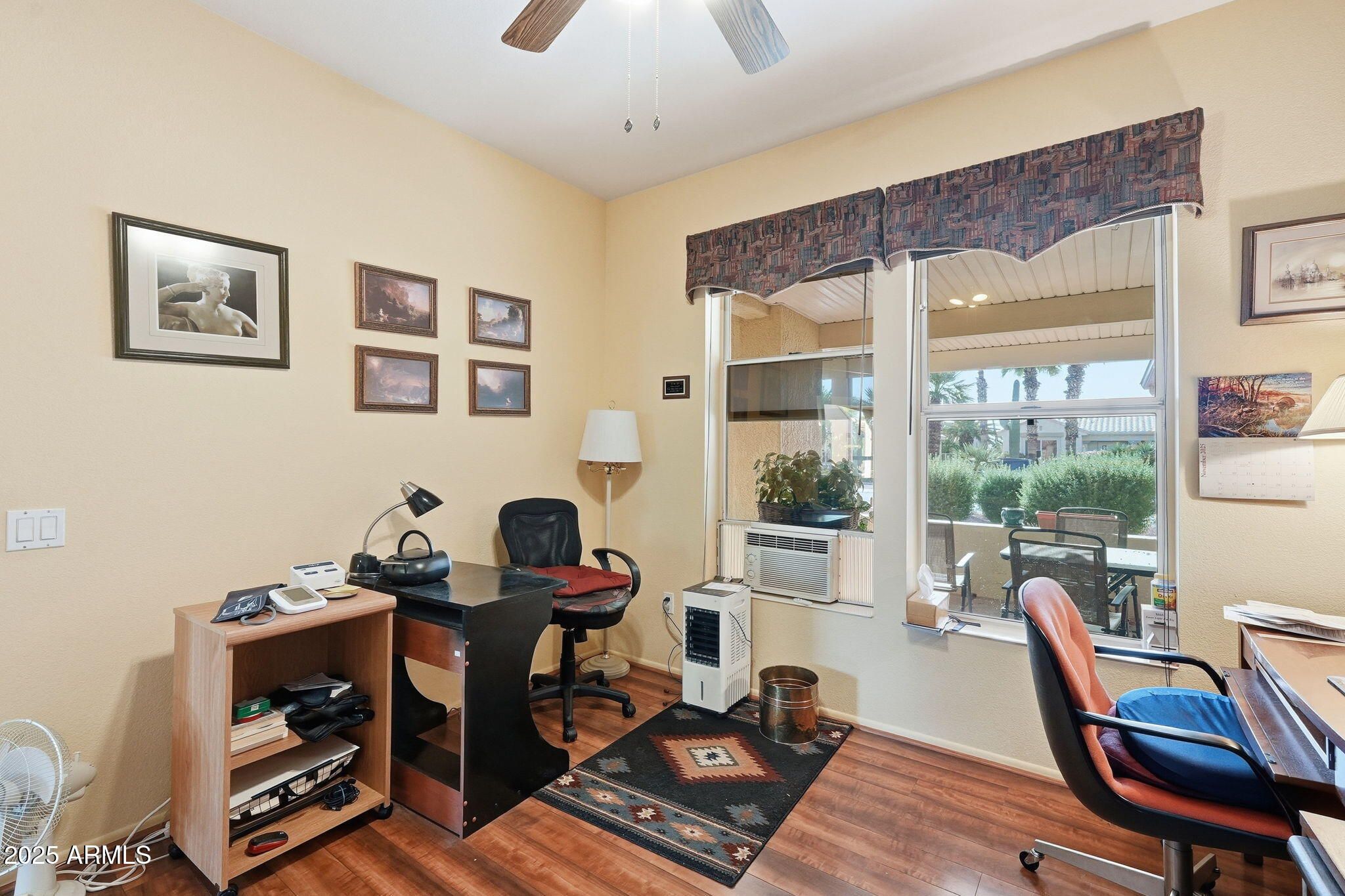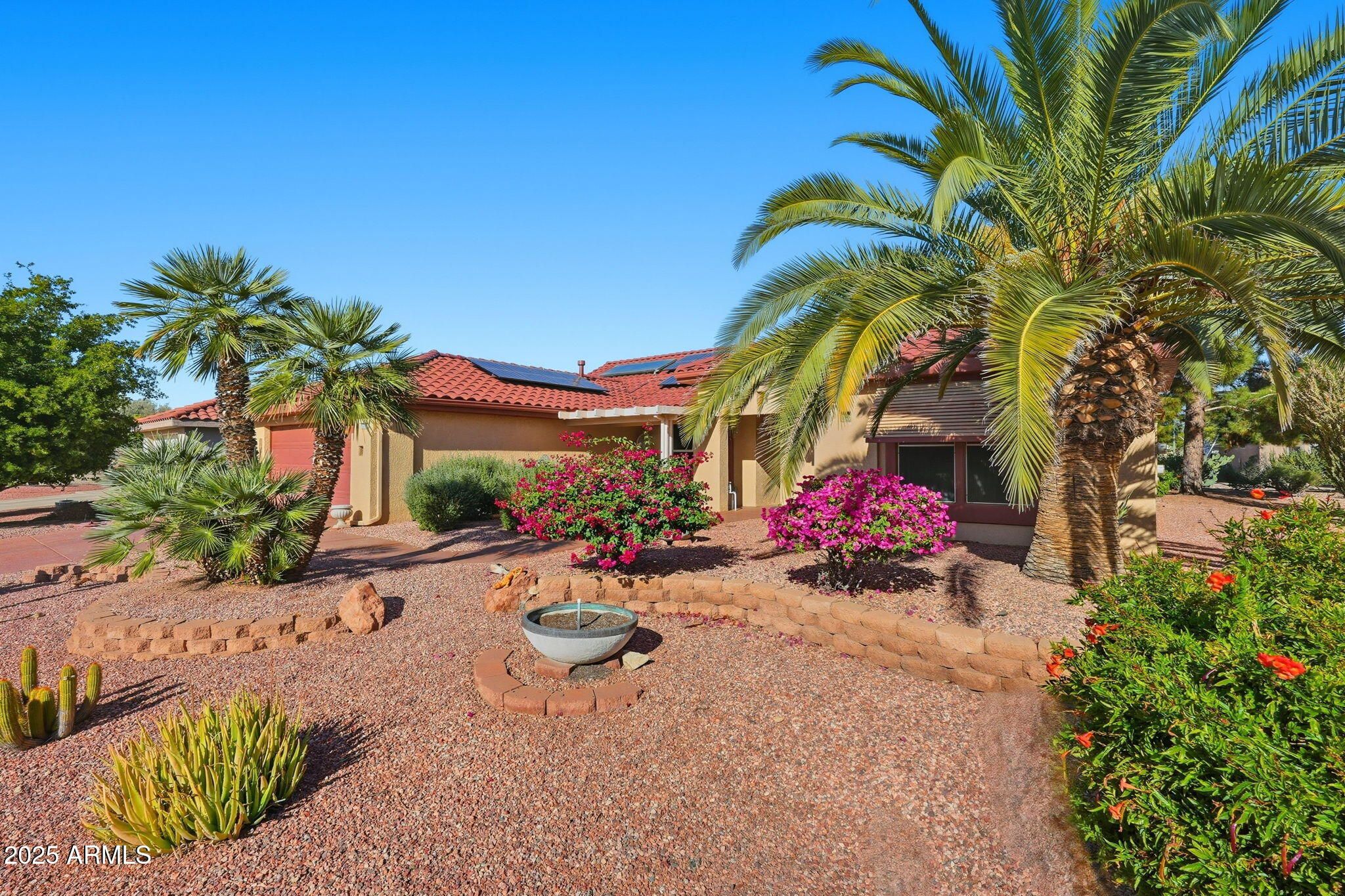 OWNED SOLAR - Welcome home to this beautiful Southwest-style Catalina model, 2 bedrooms, plus den. The home features a Formal Living Room along with an EXPANDED Family Room creating flexible spaces to relax and entertain. The kitchen offers oak cabinetry, two pantries, and a cozy breakfast area. The den overlooks the front patio and could easily serve as a third bedroom, exercise room, or craft space. Original owner has maintained this home. Large AZ room, plus covered rear patio. Desirable upgrades such as a newer tiled shower in the hallway bathroom, recessed lighting, spacious closets, ceiling fans, security doors, and more.. 2-inch blinds, and a gas stove. The primary bedroom is generously sized and features a bayed window area creating a peaceful and comfortable retreat. Enjoy Arizona's indoor-outdoor lifestyle in the extended rear Arizona room and covered patio with Kool Decking, with French doors from the living room perfect for relaxing, entertaining, or enjoying the sunshine year-round. Additional highlights include clerestory windows in the family room with blinds and sunscreens, allowing for natural light while maintaining comfort, plus an additional storage area was added. Located in a vibrant 55+ community known for its amenities, golf, recreation centers, clubs, and activities, this move-in ready home may be sold almost completely furnished, making it easy to settle in and start enjoying the lifestyle right away. The garage has lots of storage cabinets and overhead racks. Garage A/C does not work will not be repaired. Mature orange and grapefruit trees.