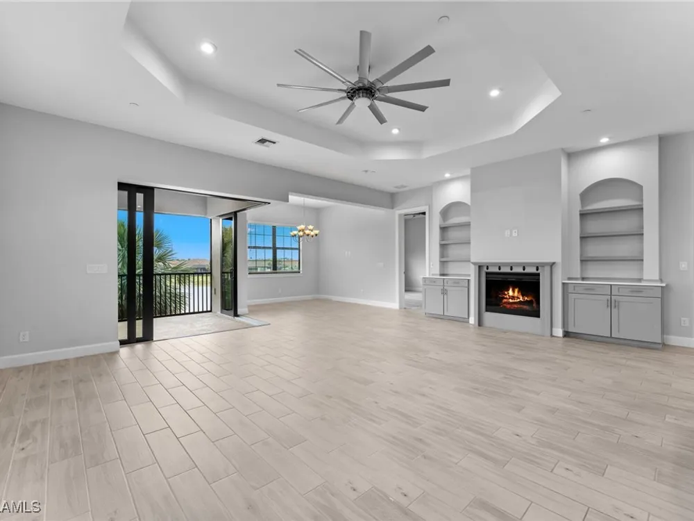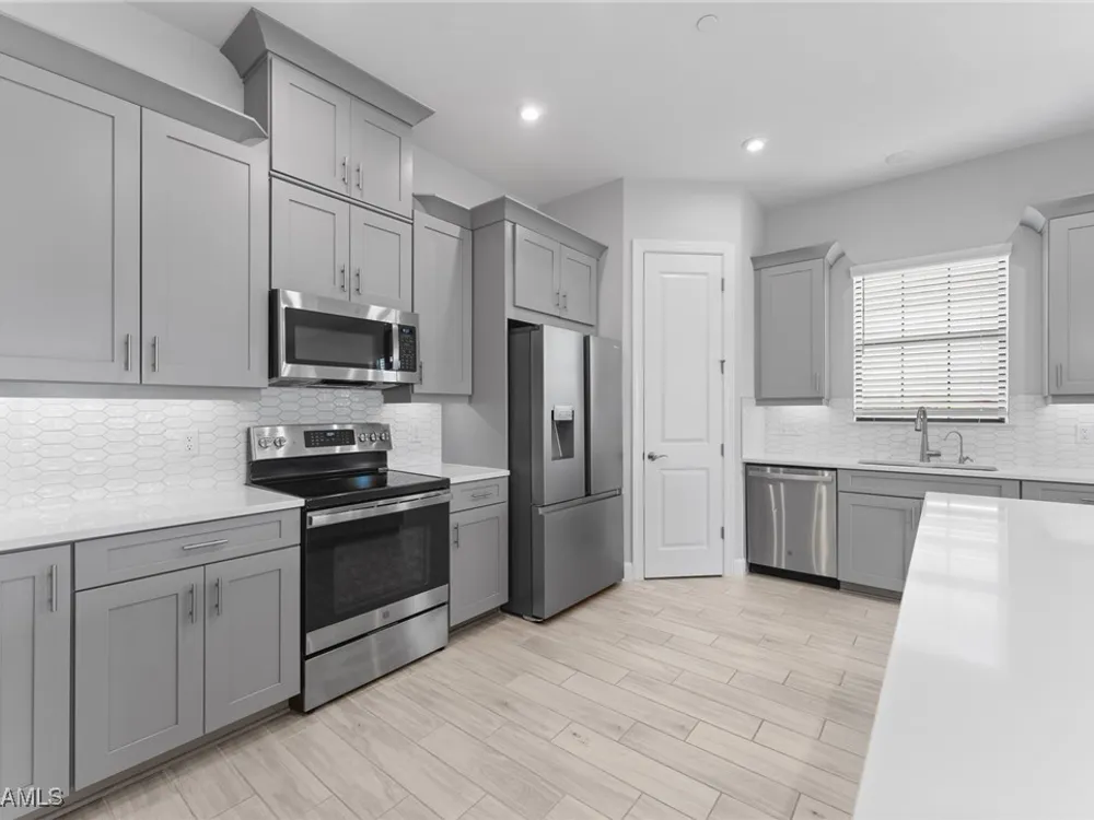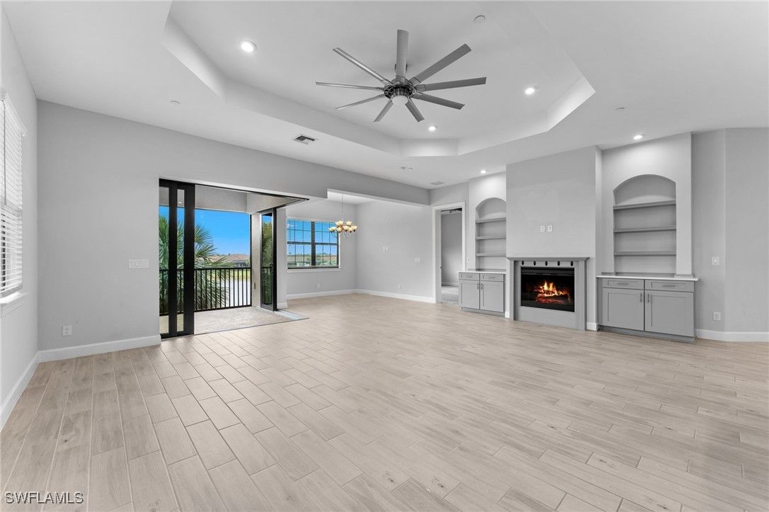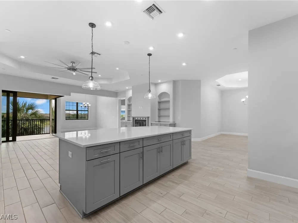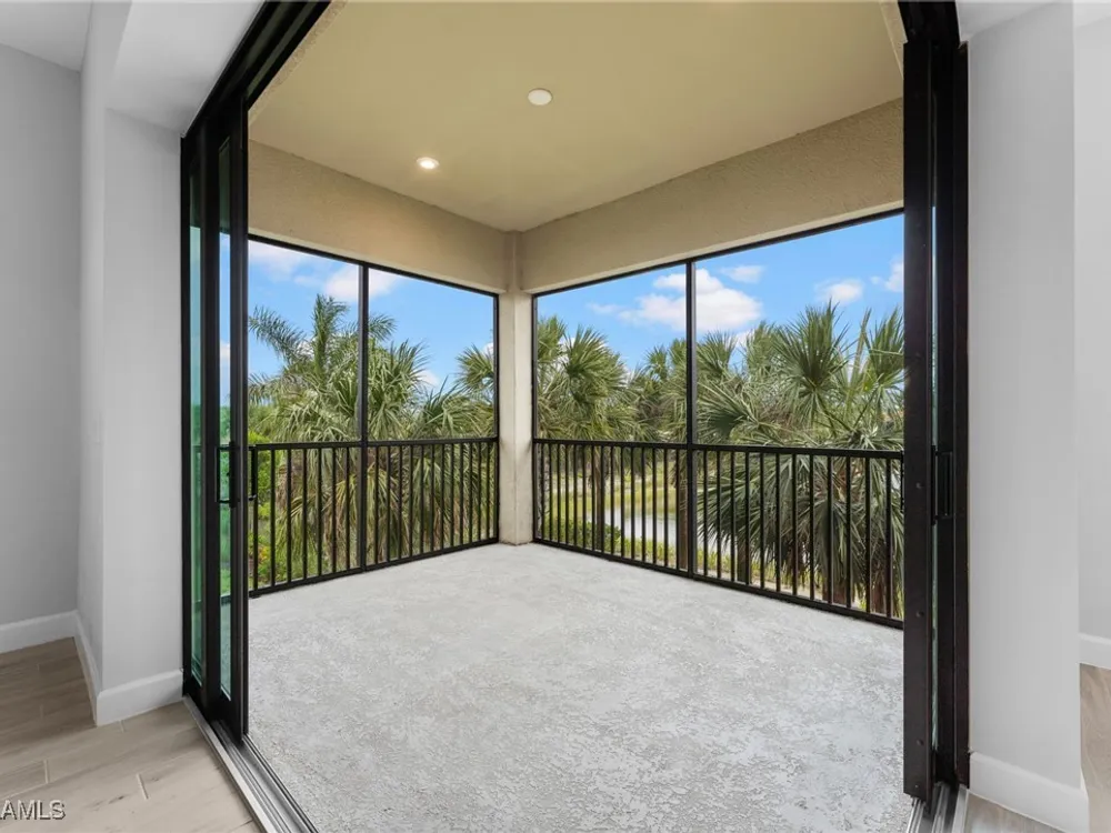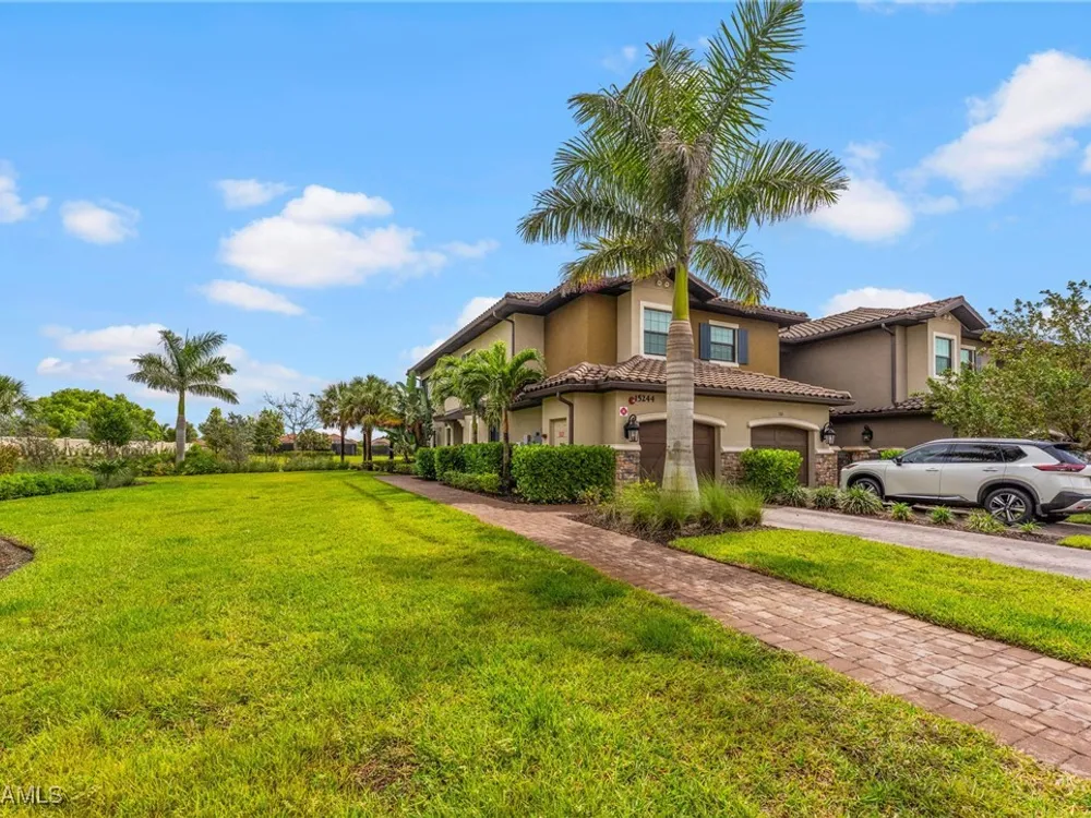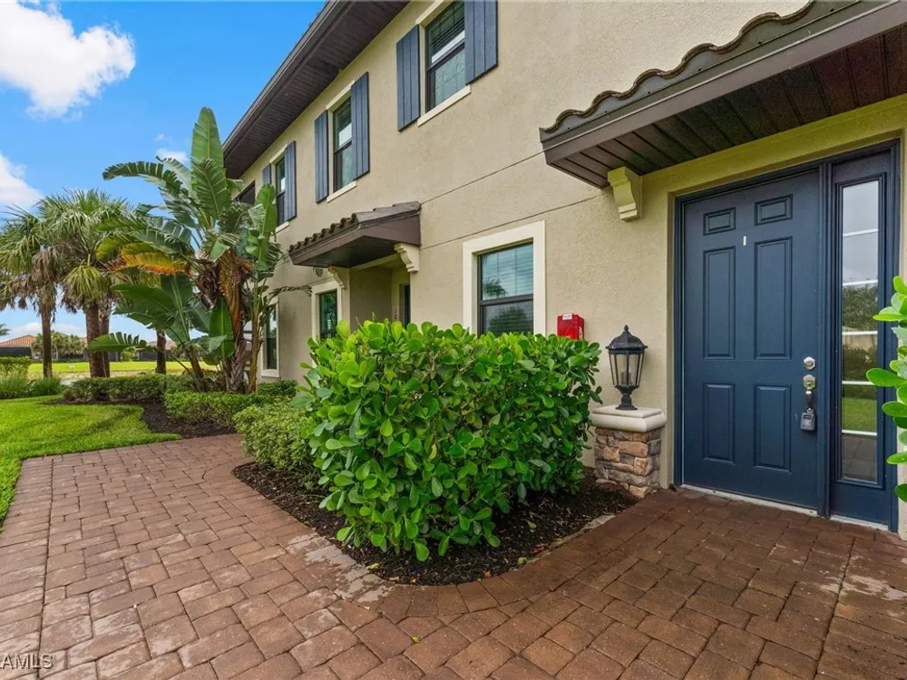 Bright and open end unit! Welcome to this newer construction Romano model by Taylor Morrison in Esplanade by the Islands. Spacious 2nd floor living with a large kitchen island overlooking the living room, featuring a gas fireplace, wood plank tile flooring and screened in private patio with water views. Three bedrooms plus a study and three full bathrooms give this coach home a large feel with over 2300 square feet. Outside enjoy your private driveway and 1 car attached garage. Esplanade by the Islands is a gated, amenity rich community offering a resort style pool, poolside bar/restaurant, an active tennis and pickle ball scene with multiple courts, spa/wellness center and a large fitness center. All within reach of Naples beautiful beaches, shopping and dining!