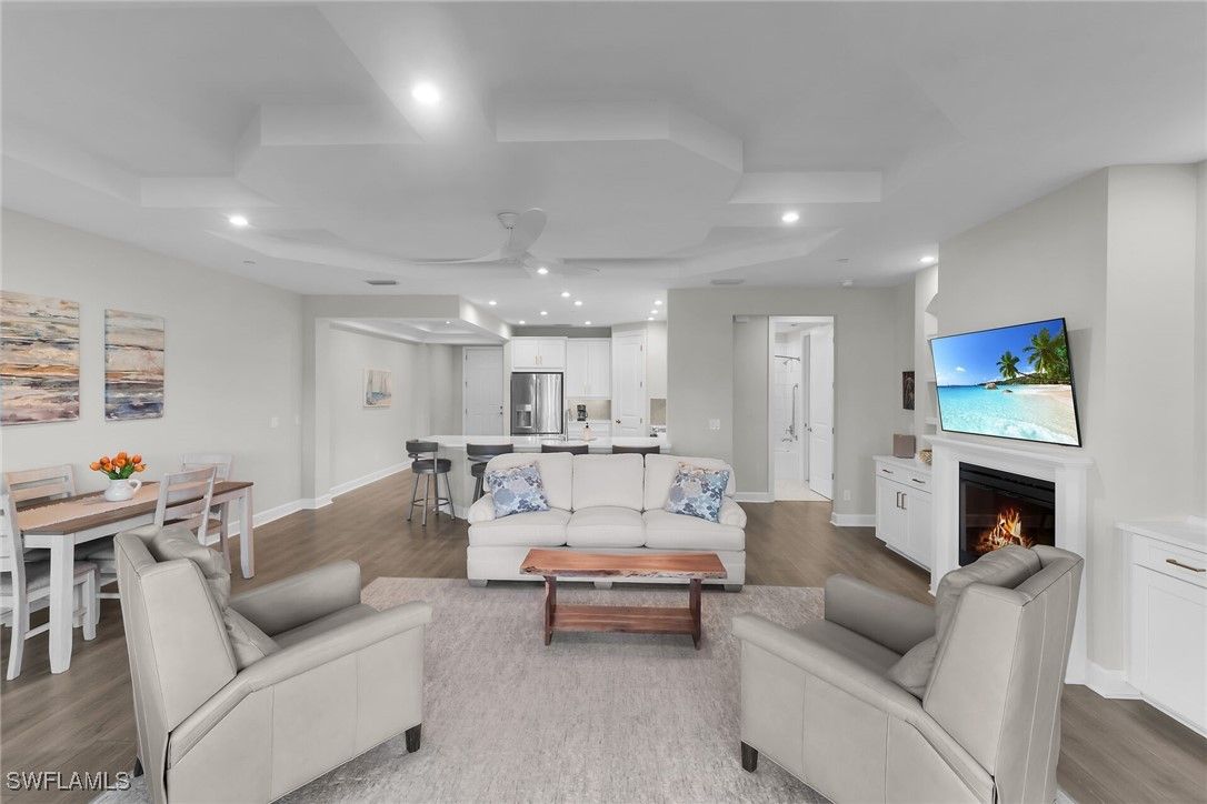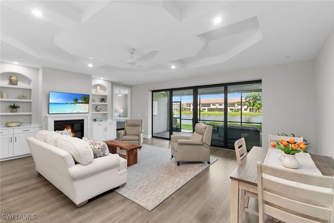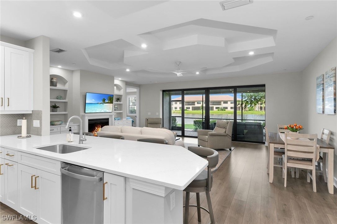 Welcome to this elegant 2-bedroom 2-bathroom, 1 car garage first floor coach home. Built in 2022 and located in the desired gated community of Esplanade By The Islands. Walk in to this big open floor plan with beautiful custom tray ceilings and custom fans. A designer kitchen with ss appliances, quartz countertops, upgraded lighting, soft close drawers and more. Hurricane impact windows and doors throughout for maximum protection along with custom electric hurricane screen. In unit electric fire place for nice ambiance with specialty built in niches. Spacious master bathroom with expansive shower, dual vanities and oversized walk in master closet. Expansive lanai overlooking the tropical wildlife and serene lake with a SW exposure to get plenty of sun and watch sunsets as well as no road noise on this quiet side of the street and close proximity to the pool. Esplanade By The Islands is known for its superb amenities, catered to a luxurious and active lifestyle. This guard gated community offers a state-of-the-art fitness center, with cardio, strength training machines, free weight area, movement studio, and locker rooms. A full-service Spa at Esplanade with massage and body treatments, and a resort-style pool with towel service, and a Bahama Bar & Grill. Residents can also enjoy various sporting activities like tennis, pickleball, and bocce ball courts, a dedicated dog park, and a lifestyle manager to assist with community life and organize events.