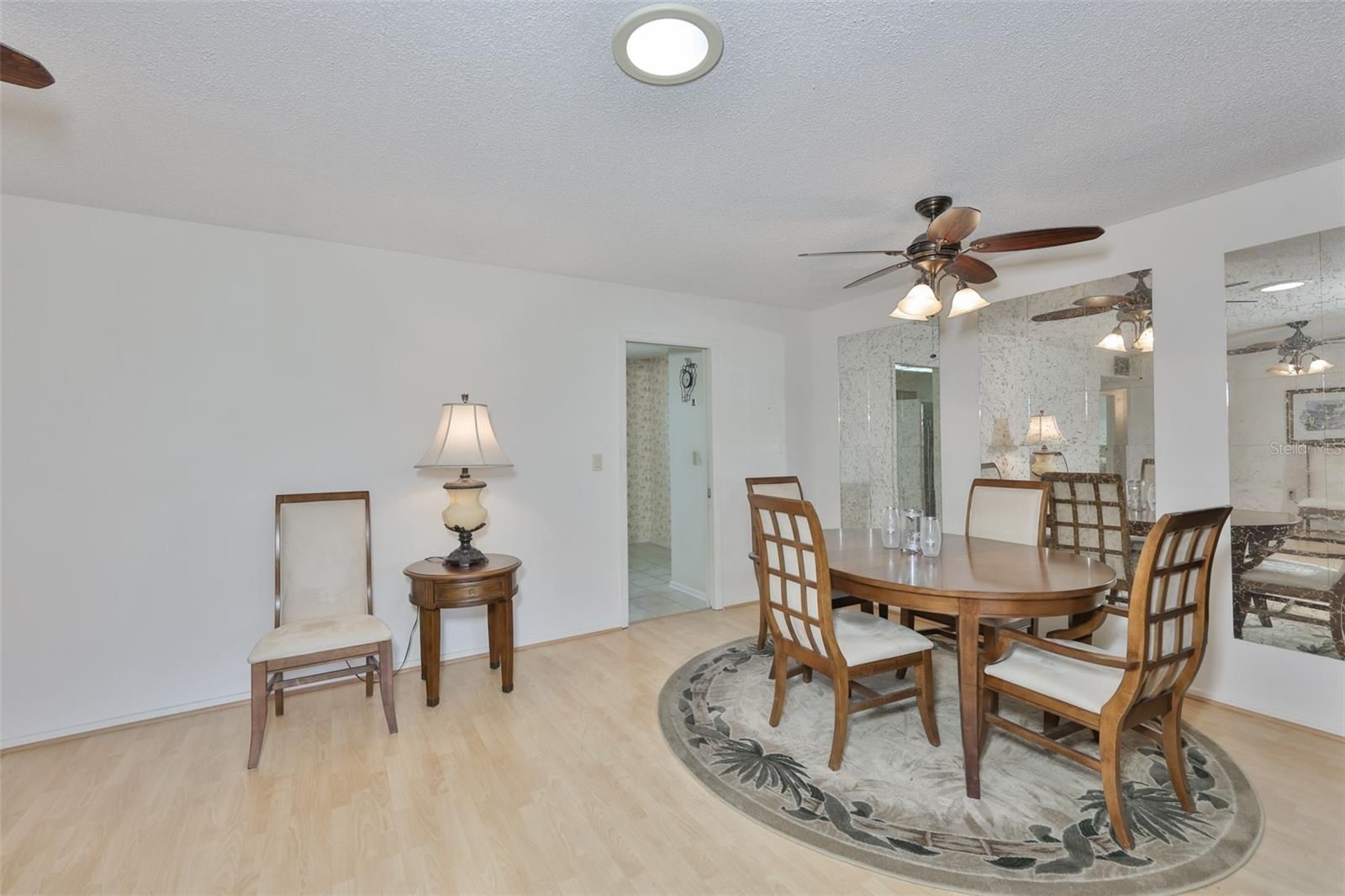 - Ceiling Fan(s), Eat-in Kitchen, Living/Dining Room, Main Level Primary, Solid Surface Counters, Split Bedrooms, Thermostat, Walk-In Closet(s)