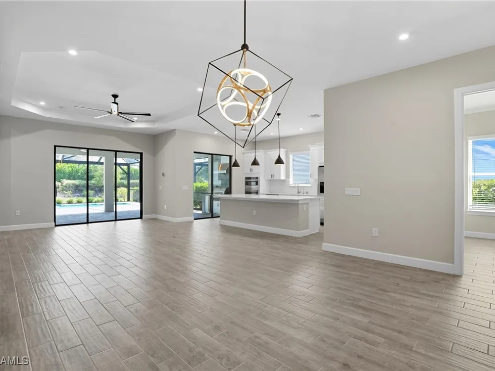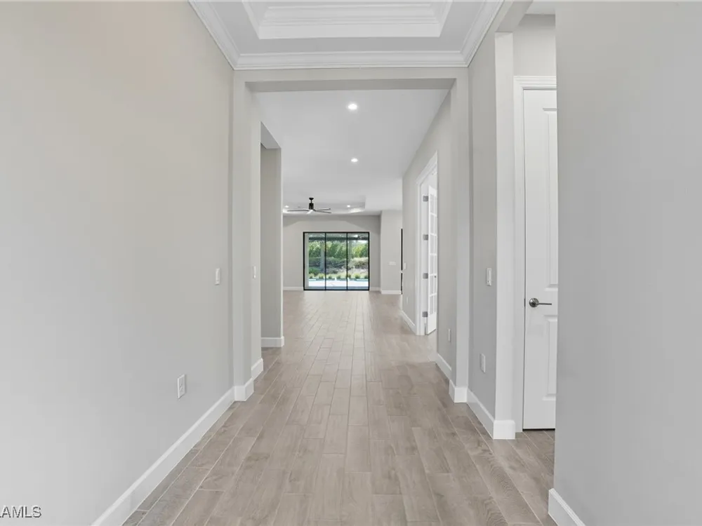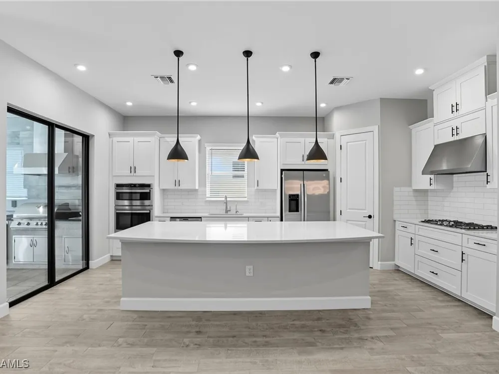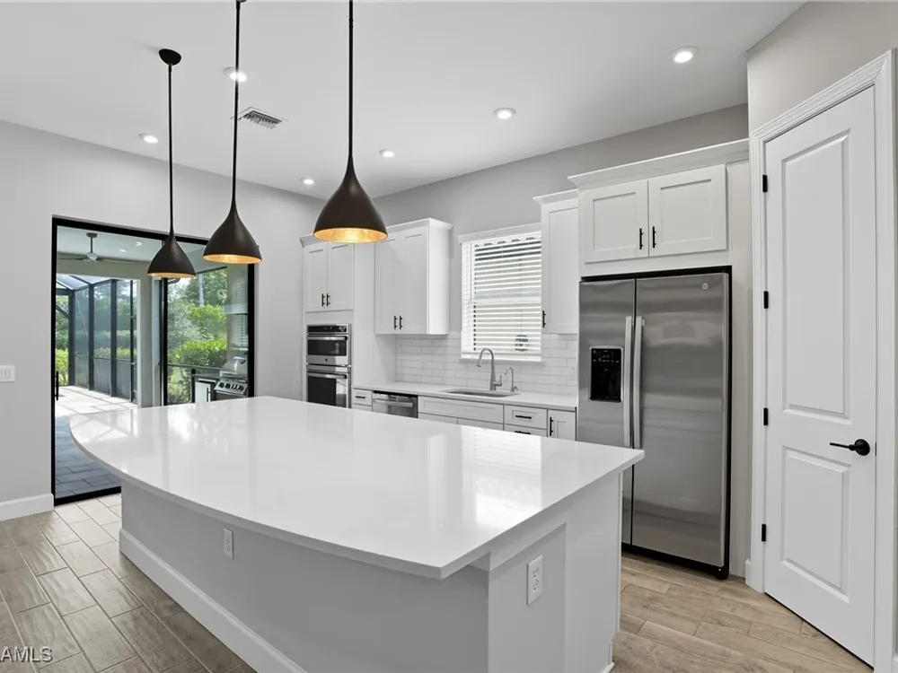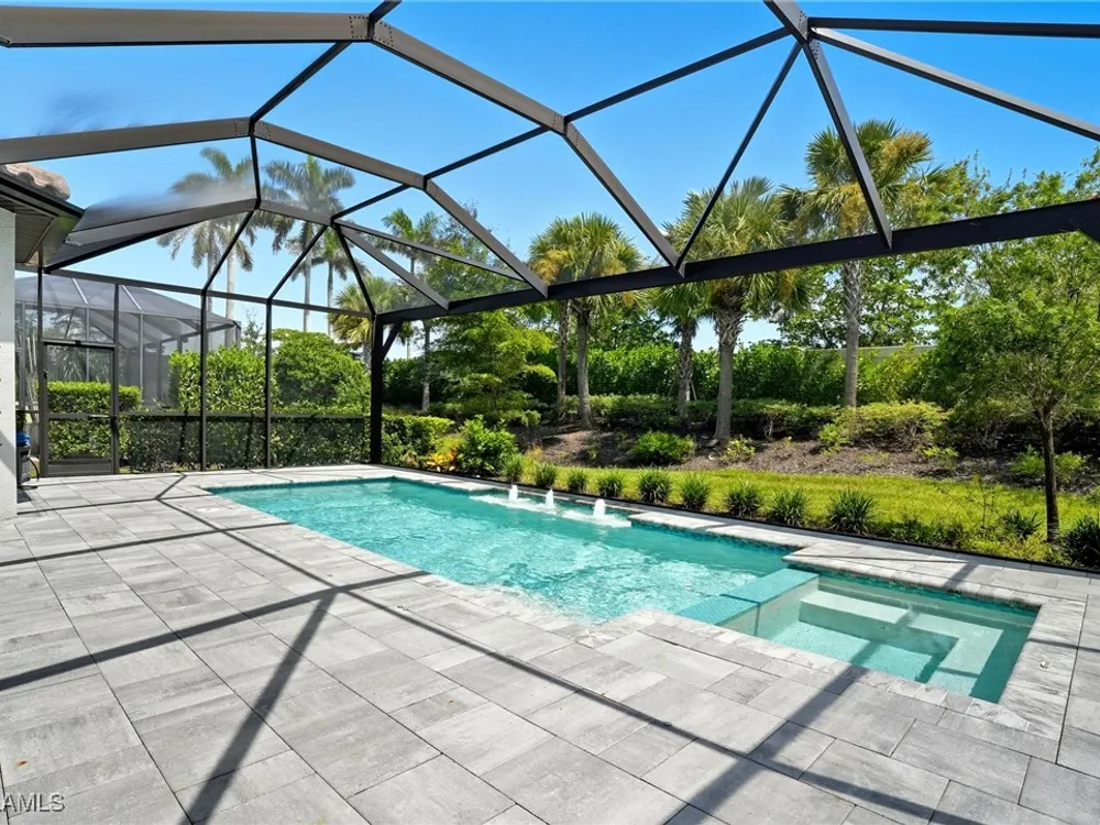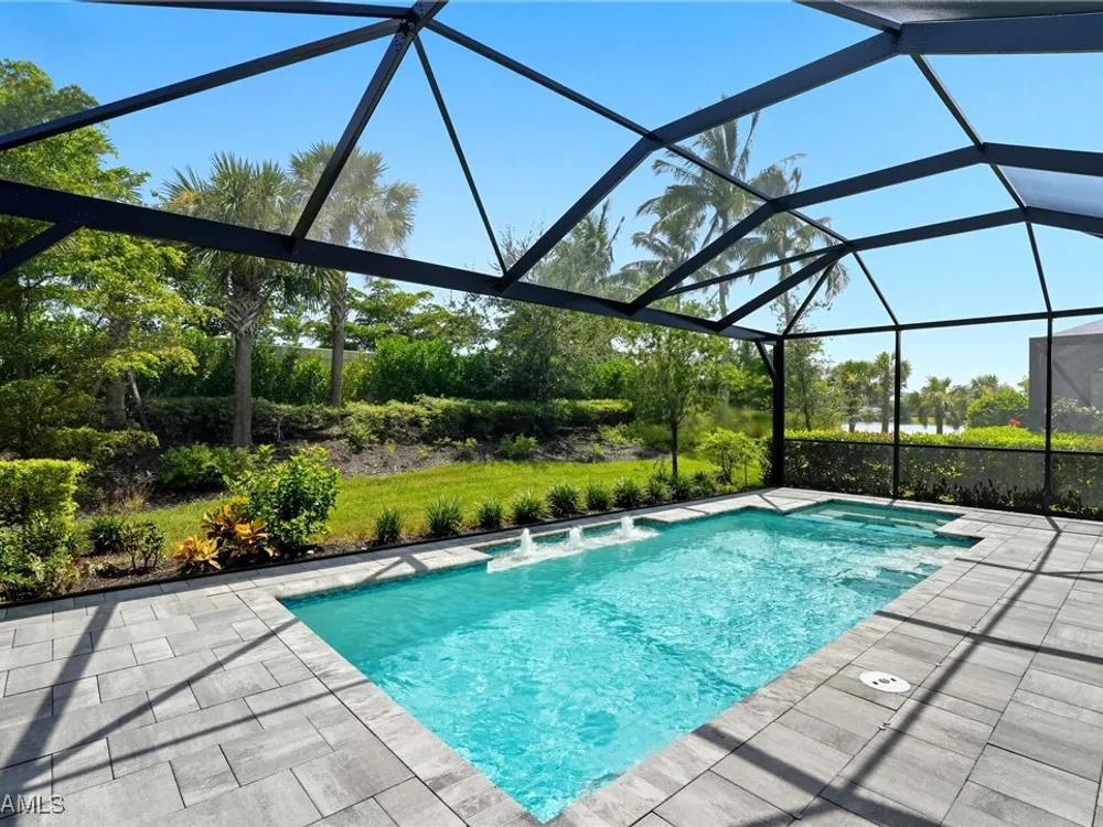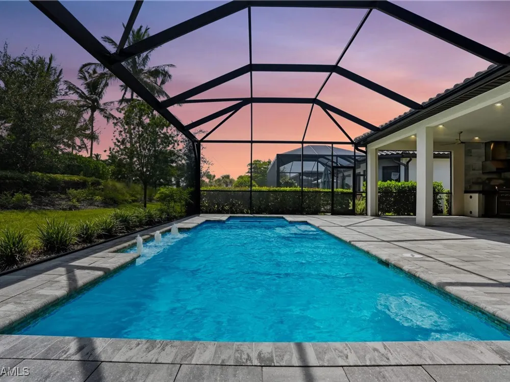 Built in 2022, this barely lived-in, 3+den/3 bath Lazio floorplan home blends thoughtful upgrades with timeless style. Nestled on a private cul-de-sac with sought-after southeastern exposure, the property is designed for both relaxed living and elegant entertaining. Inside you’ll find custom light fixtures and fans throughout, beautiful porcelain tile in the main areas, complemented by custom millwork in every room of the house including crown molding, custom shelving and closet systems in all bedrooms, custom built-ins in the den & family room, tray ceilings and 8ft interior doors throughout the home. The chef’s kitchen is as functional as it is beautiful, featuring quartz countertops, custom plumbing fixtures, upgraded GE appliances with gas cooktop, 42” upper cabinets, reverse osmosis system and a walk-in pantry with custom shelving. The primary suite is designed for relaxation with large custom closets, dual vanities, and a spa-inspired bath boasting dual shower heads and a frameless glass shower. Even the expansive laundry room is elevated with custom cabinetry, a sink and tiled walls, while the extended lanai offers a retreat of its own with a picture-framed screen, pool & spa with upgraded tile, lights and bubblers and a full outdoor kitchen—complete with sink, beverage cooler, integrated built-in grill with hooded vent, and granite countertops. Additional features include upgraded 10 ft. ceilings, generator hook-up, bay windows in guest and primary suites, a tankless water heater, a two and a half car garage (room for the golf cart!) with epoxy floors, and new landscaping on a 150 foot deep lot —— deeper than the new construction offerings in the community. Every detail of this home was carefully chosen to enhance style, comfort, and convenience. Esplanade by the Islands is fast becoming the pinnacle of resort-style living in Naples, with its full amenity campus including resort pool, full service spa, fitness center, Toasted Cafe & Bahama Bar, Pickleball, Tennis & Bocce courts, Nature Trails and so much more. Conveniently located near downtown Naples and Marco Island, don’t miss your chance to make this home as well as this lifestyle yours!