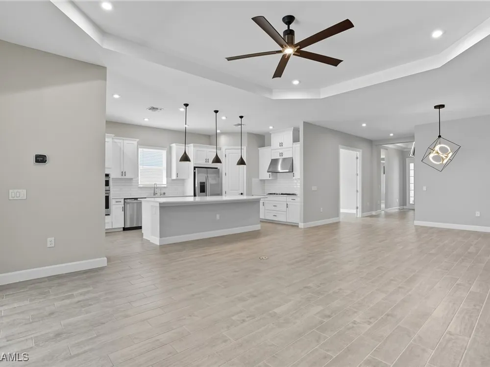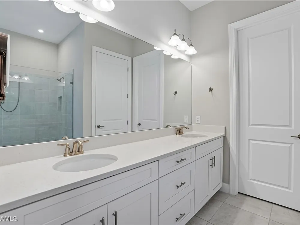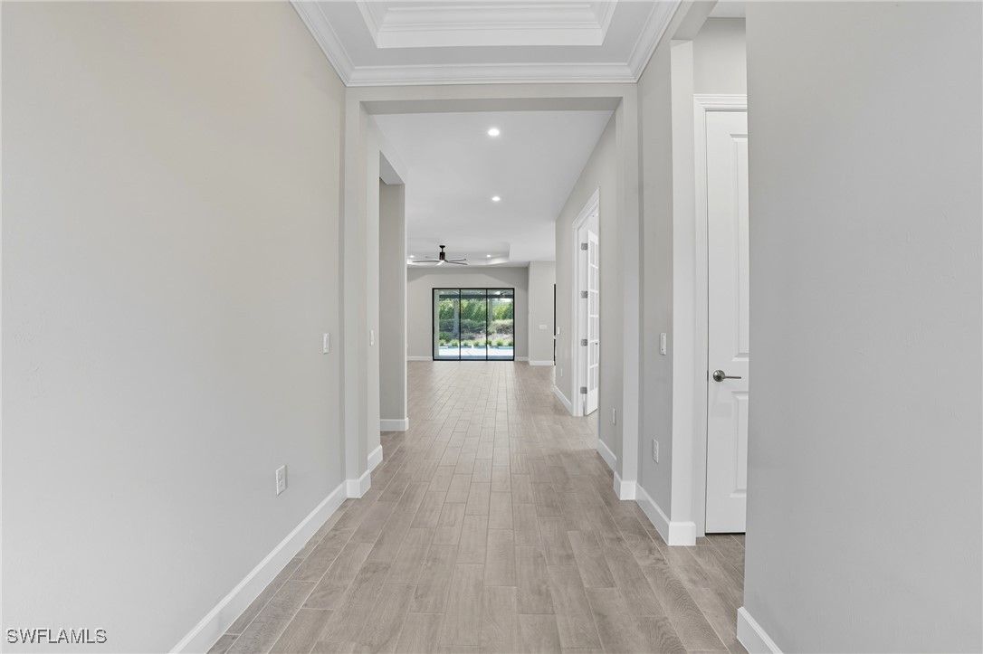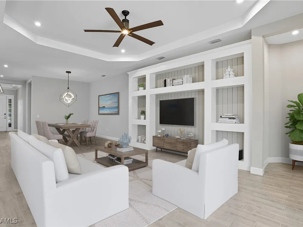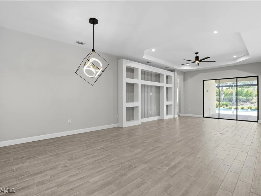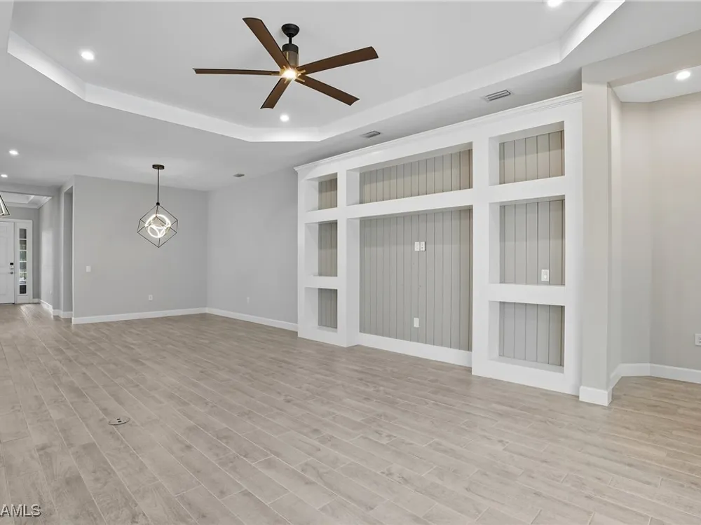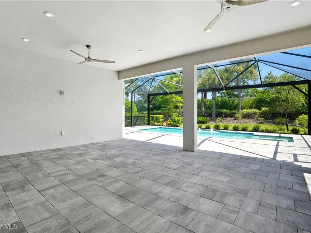 Built in 2022, this barely lived-in, 3+den/3 bath Lazio floorplan home blends thoughtful upgrades with timeless style. Nestled on a private cul-de-sac with sought-after southeastern exposure, the property is designed for both relaxed living and elegant entertaining. Inside you’ll find custom light fixtures and fans throughout, beautiful porcelain tile in the main areas, complemented by custom millwork in every room of the house including crown molding, custom shelving and closet systems in all bedrooms, custom built-ins in the den & family room, tray ceilings and 8ft interior doors throughout the home. The chef’s kitchen is as functional as it is beautiful, featuring quartz countertops, custom plumbing fixtures, upgraded GE appliances with gas cooktop, 42” upper cabinets, reverse osmosis system and a walk-in pantry with custom shelving. The primary suite is designed for relaxation with large custom closets, dual vanities, and a spa-inspired bath boasting dual shower heads and a frameless glass shower. Even the expansive laundry room is elevated with custom cabinetry, a sink and tiled walls, while the extended lanai offers a retreat of its own with a picture-framed screen, pool & spa with upgraded tile, lights and bubblers and a full outdoor kitchen—complete with sink, beverage cooler, integrated built-in grill with hooded vent, and granite countertops. Additional features include upgraded 10 ft. ceilings, generator hook-up, bay windows in guest and primary suites, a tankless water heater, a two and a half car garage (room for the golf cart!) with epoxy floors, and new landscaping on a 150 foot deep lot —— deeper than the new construction offerings in the community. Every detail of this home was carefully chosen to enhance style, comfort, and convenience. Esplanade by the Islands is fast becoming the pinnacle of resort-style living in Naples, with its full amenity campus including resort pool, full service spa, fitness center, Toasted Cafe & Bahama Bar, Pickleball, Tennis & Bocce courts, Nature Trails and so much more. Conveniently located near downtown Naples and Marco Island, don’t miss your chance to make this home as well as this lifestyle yours!