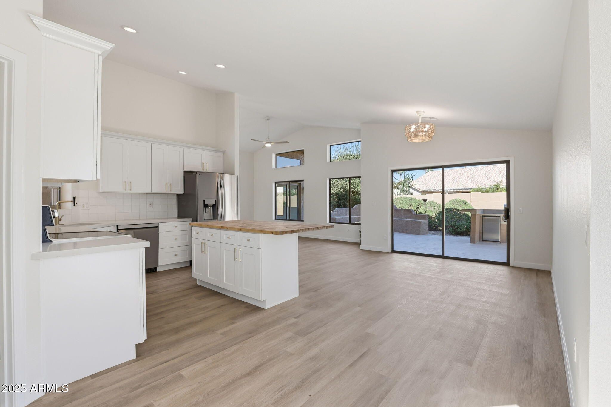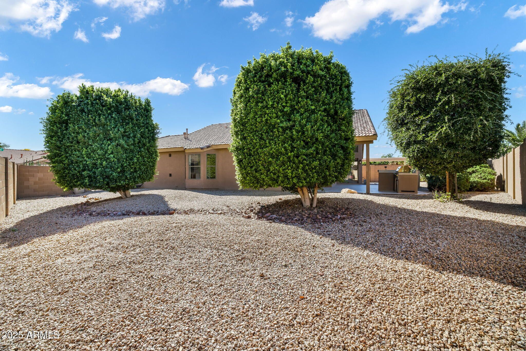 Modern, sleek, and completely reimagined home. The transformation is stunning! This home is nestled on a desirable corner lot with a side yard large enough for a casita or a golf cart garage located in the award winning Pebblecreek active adult community! This designer-renovated gem offers elegance, functionality, and resort-style living all in one beautifully crafted package. From the moment you step inside, you're greeted by a sophisticated open-concept floor plan, ideal for entertaining and everyday luxury. The heart of the home is a gourmet chef's kitchen---thoughtfully redesigned with brand new stainless steel LG appliances, custom cabinetry, gleaming quartz countertops, ceramic tile backsplash, and a spacious wooden butcher block center island that doubles as a gathering space. floor plan, ideal for entertaining and everyday luxury. The heart of the home is a gourmet chef's kitchen---thoughtfully redesigned with brand new stainless steel LG appliances, custom cabinetry, gleaming quartz countertops, ceramic tile backsplash, and a spacious wooden butcher block center island that doubles as a gathering space. A built-in wine bar with a wine fridge and complimentary colored ceramic tile backsplash and stylish shelving adds a chic touch, perfect for hosting! Choose from three distinct dining options: a formal dining room for special occasions, a cozy breakfast nook for morning coffee, and island seating for casual conversations or entertaining guests. This home is made for making memories! The main living area boasts an open, airy layout that seamlessly connects to the kitchen and dining room, creating a bright and spacious atmosphere. Soaring ceilings and abundant windows flood the space with natural light. Just off the living area, a versatile open room offers the perfect setting for a cozy den, home office, or creative studio. Luxury plank flooring flows seamlessly throughout the home, complemented by a freshly painted designer-neutral palette throughout, new crown molding and custom baseboards---offering warmth and cohesion at every turn. The primary suite is a serene retreat featuring large windows and a private exit to the lush backyard. The spa-inspired ensuite bathroom is a true showstopper, boasting a generous walk-in shower with natural ceramic tiles and stone accents, dual sink quartz vanity, and a walk-in closet. The guest bedroom features a charming half-circle window with views of the manicured front yard and an ample sized closet. The adjacent guest bathroom is equally stylish, with new cabinetry, quartz countertop and a timeless white tiled tub/shower combination ---effortlessly elegant. Outside, the backyard is a private oasis with endless possibilities. The expansive side yard is ideal for a casita, golf cart garage, or another outdoor living space under the shade of mature trees! The yard also features an extended paver patio, a built-in barbeque with a refrigerator, a custom built-in bench seating, a pad and hookups ready for a hot tub or spa, and plenty of room for a fireplace and a firepit. This backyard is ready and waiting to host gatherings with your new neighbors! Every detail has been considered, including all new interior doors, modern hardware and updated lighting. The laundry room adds convenience with upper cabinetry, a quartz top cabinet for keys and more storage, and a sunlit window to keep things bright and cheerful. The home is ideally situated within walking distance from the clubhouse and its amenities. Indulge in PebbleCreek's world-class amenities: championship golf, tennis, pickleball, softball, bocce ball, pools, state-of-the-art fitness center, art studios, restaurants, and entertainment. This move-in-ready gem blends luxury, comfort, and style in one unforgettable home. Don't miss your chance to live the resort lifestyle you've been dreaming of!