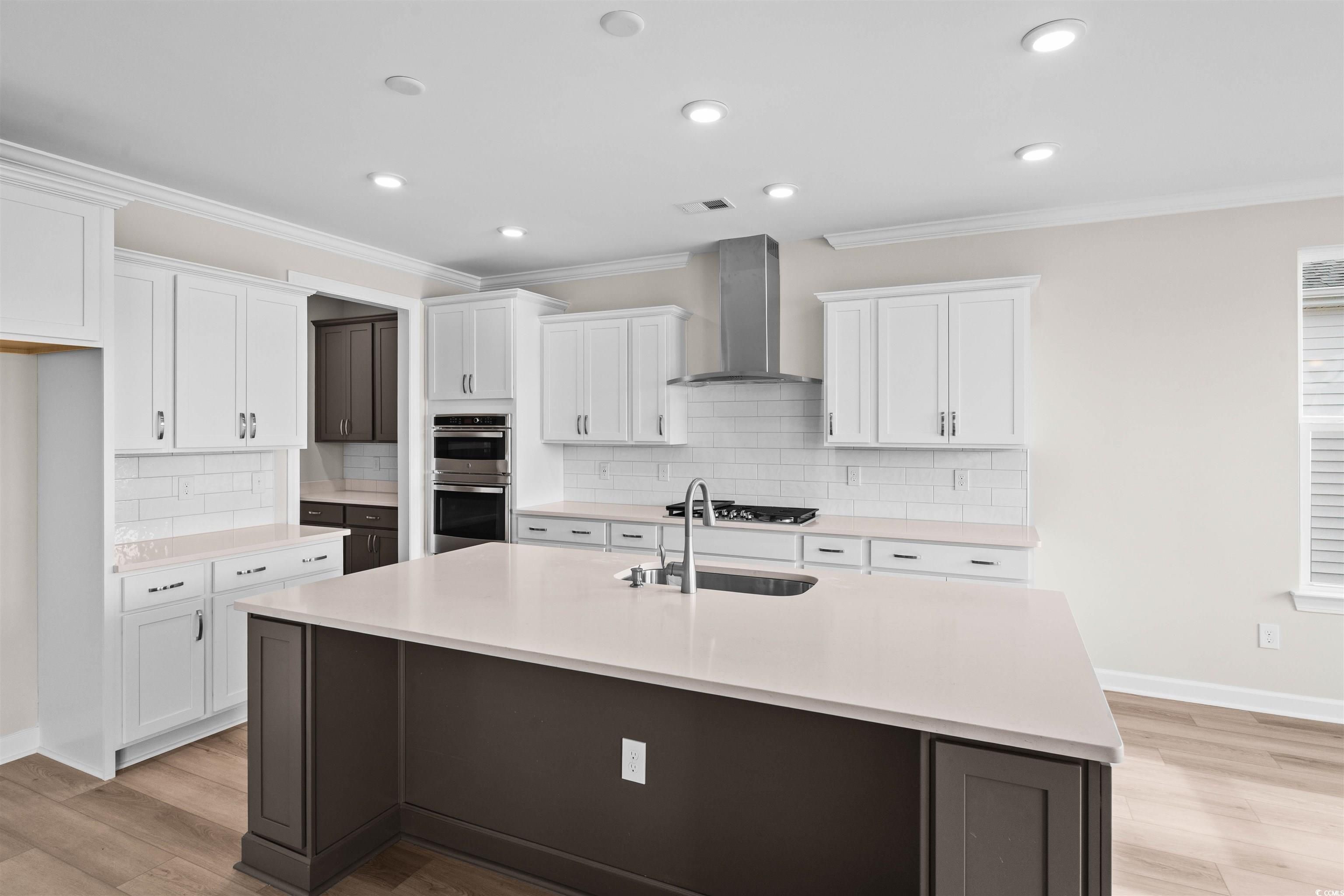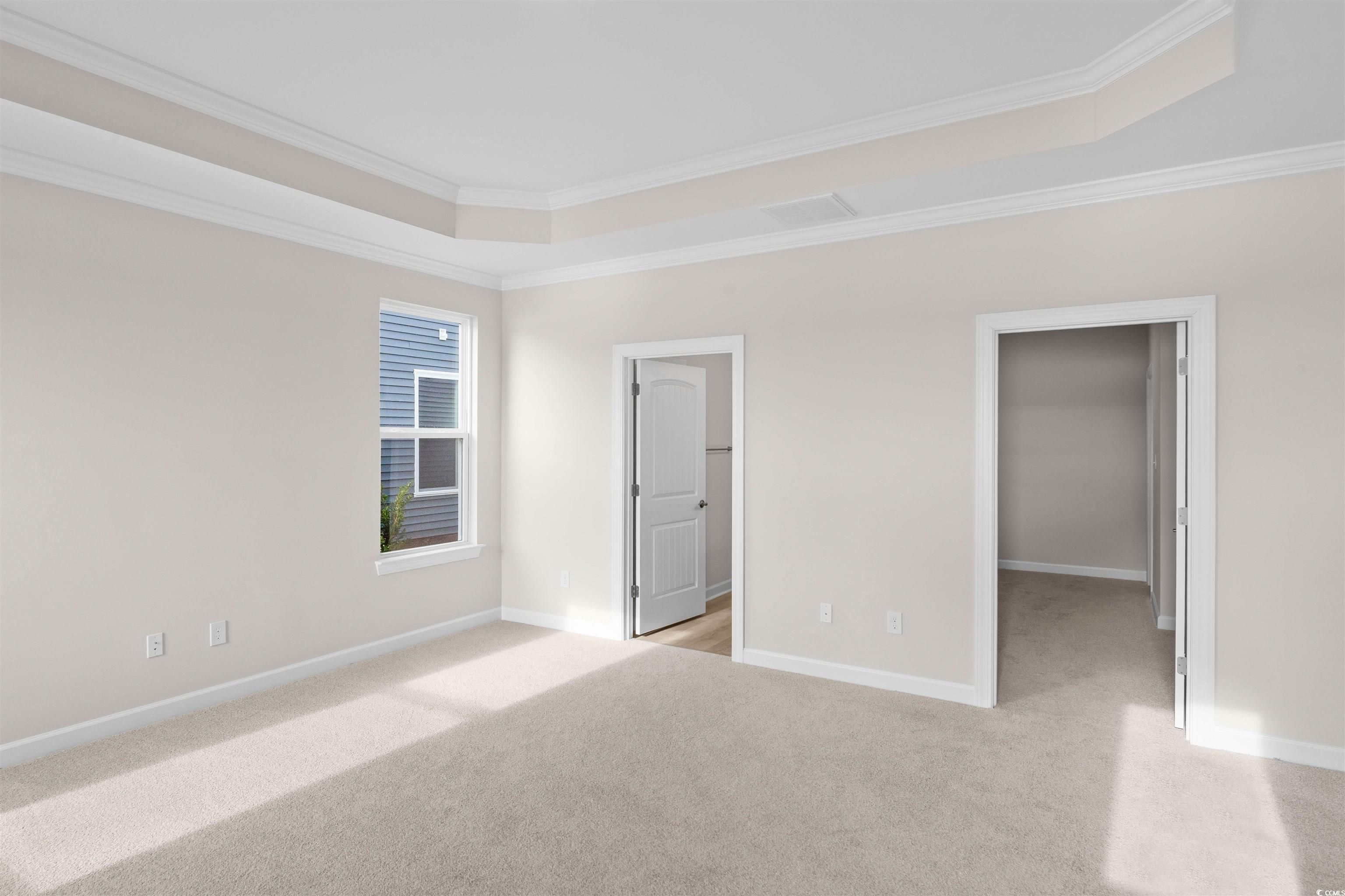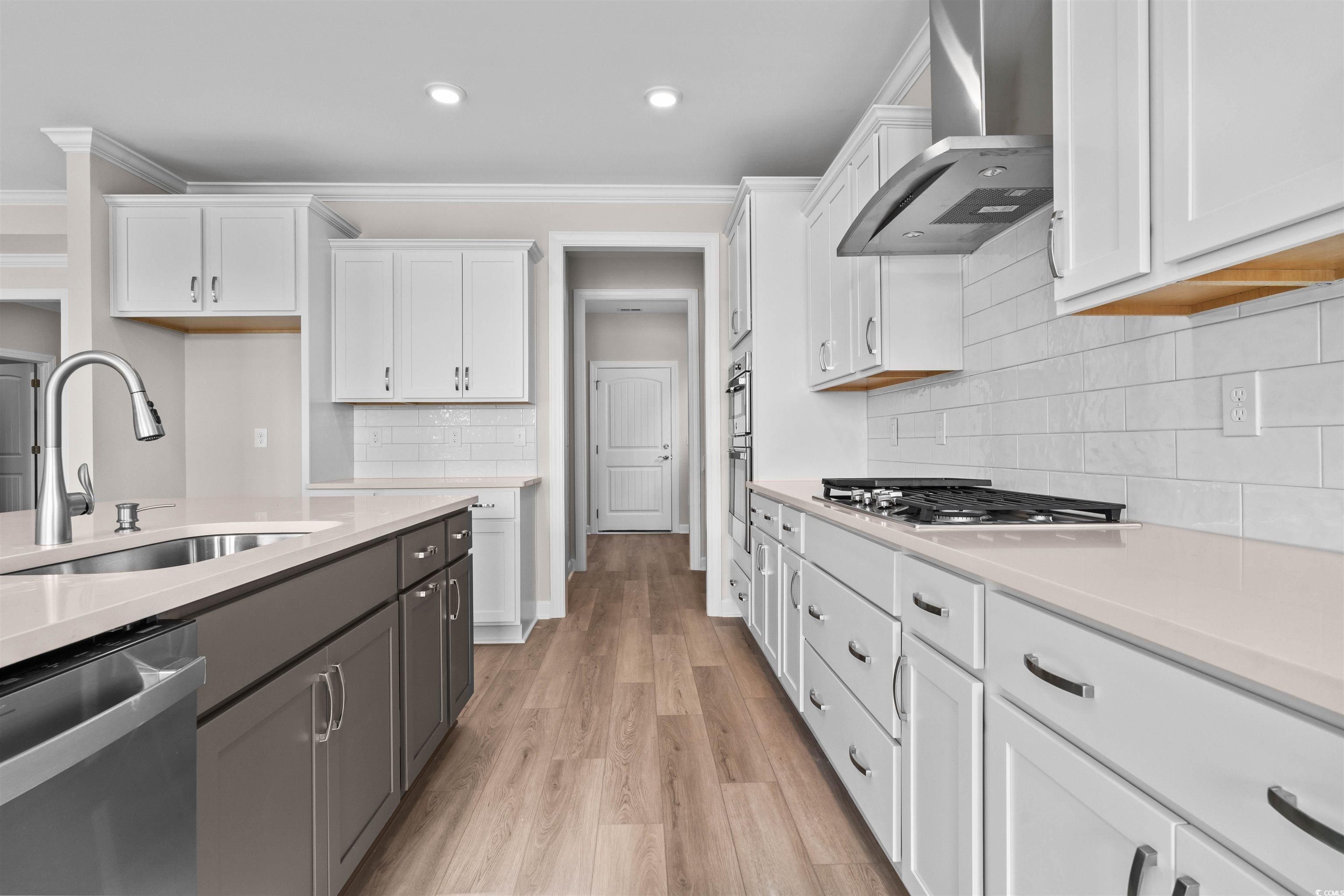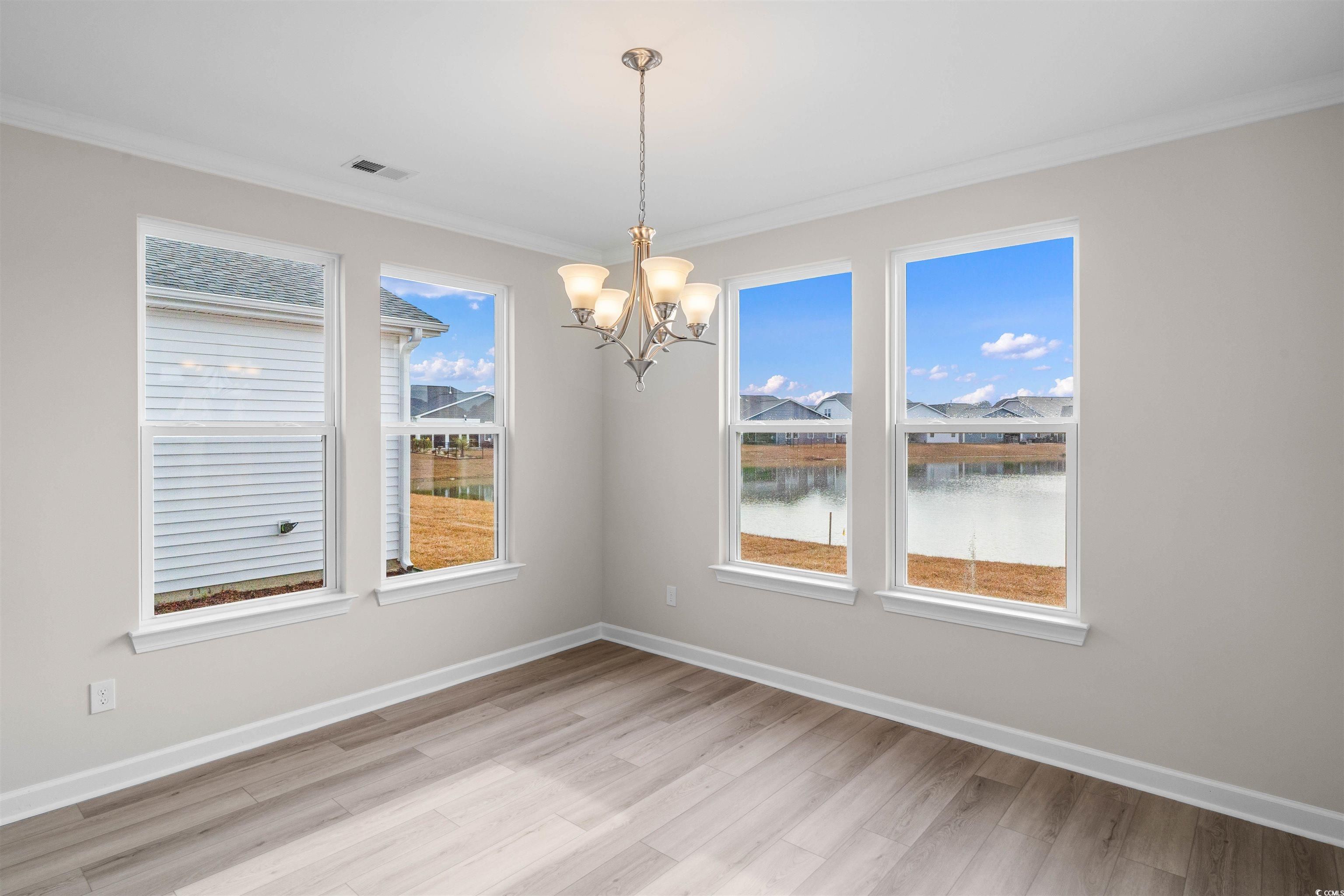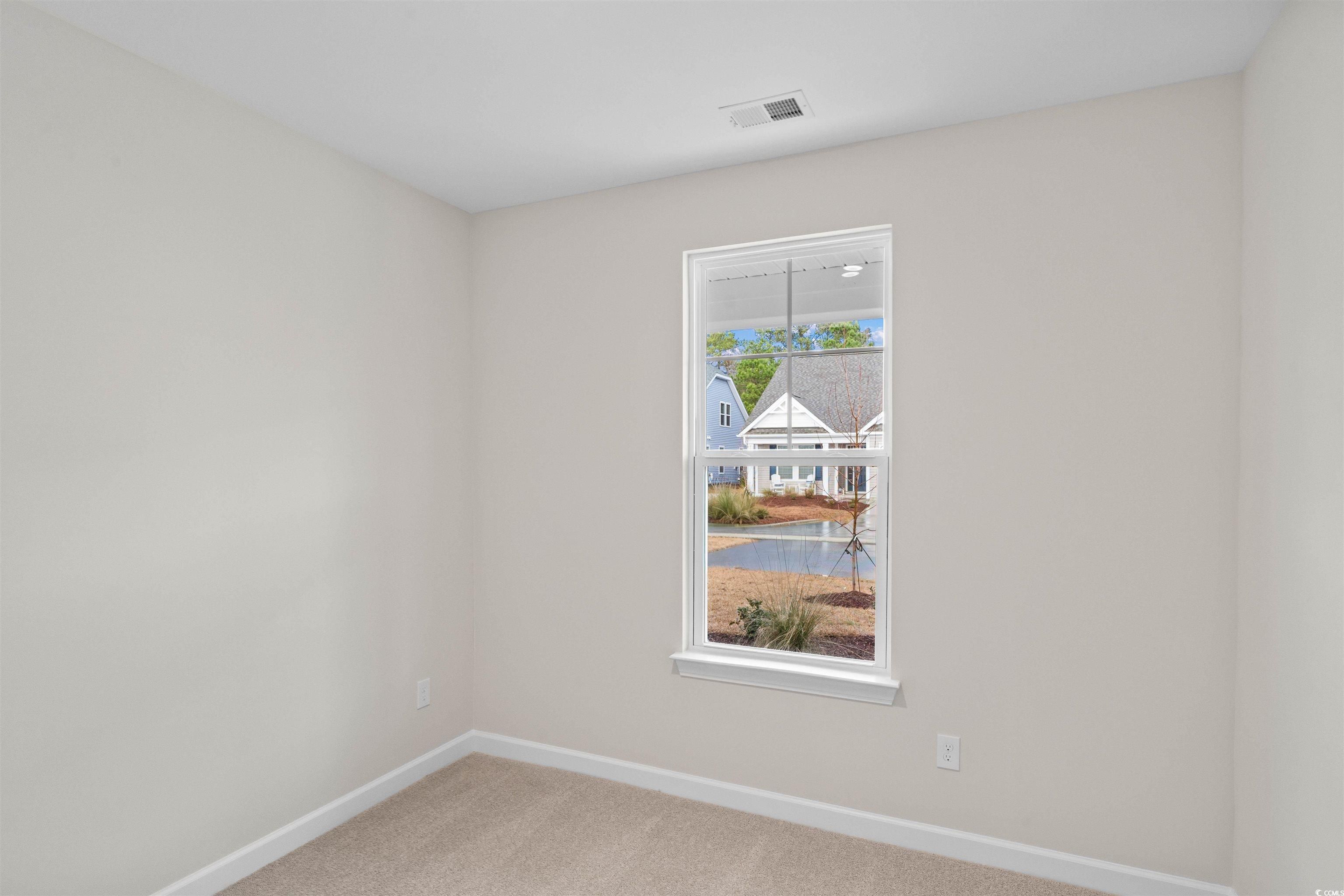 The Oceanside Floor Plan is located in Shorehaven Village on a large lake with beautiful fountain view. This spacious, 4 BR/2.5 bath ranch style home with full features coastal inspired architectural accents, outdoor living area and an extended garage. A covered front porch welcomes you home to a large, inviting foyer. The Kitchen is open and has shaker style cabinets, large center island with sink & GE stainless appliance package. Bridgewater is a natural gas community! The Master Bedroom has a trey ceiling with crown molding and large walk in closet, fully tiled shower, dual vanity, water closet with comfort height commode and large linen closet for storage. Enjoy the Carolina Sea Breeze out on the covered rear porch. This home is a must see on an oversized lot in Bridgewater!