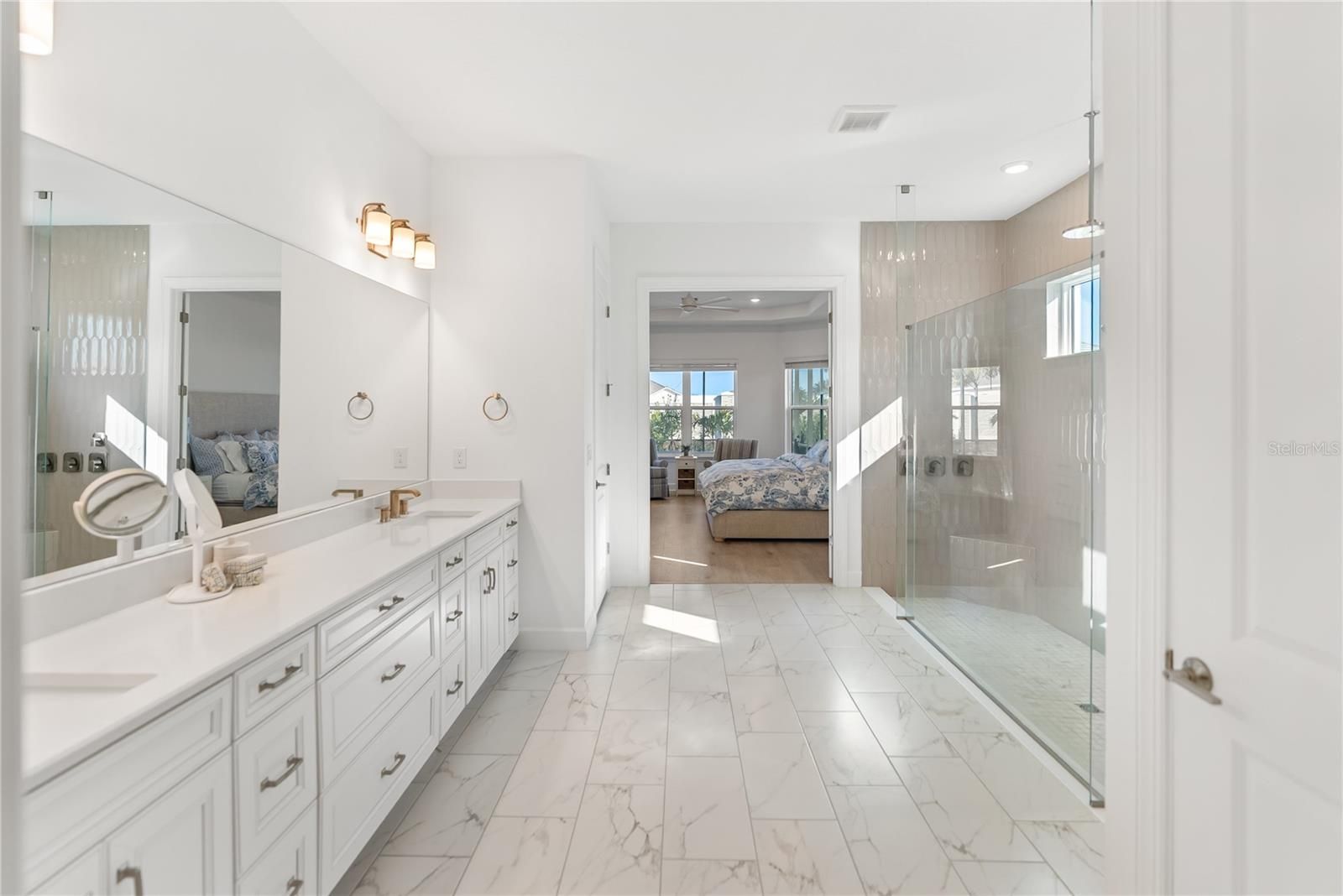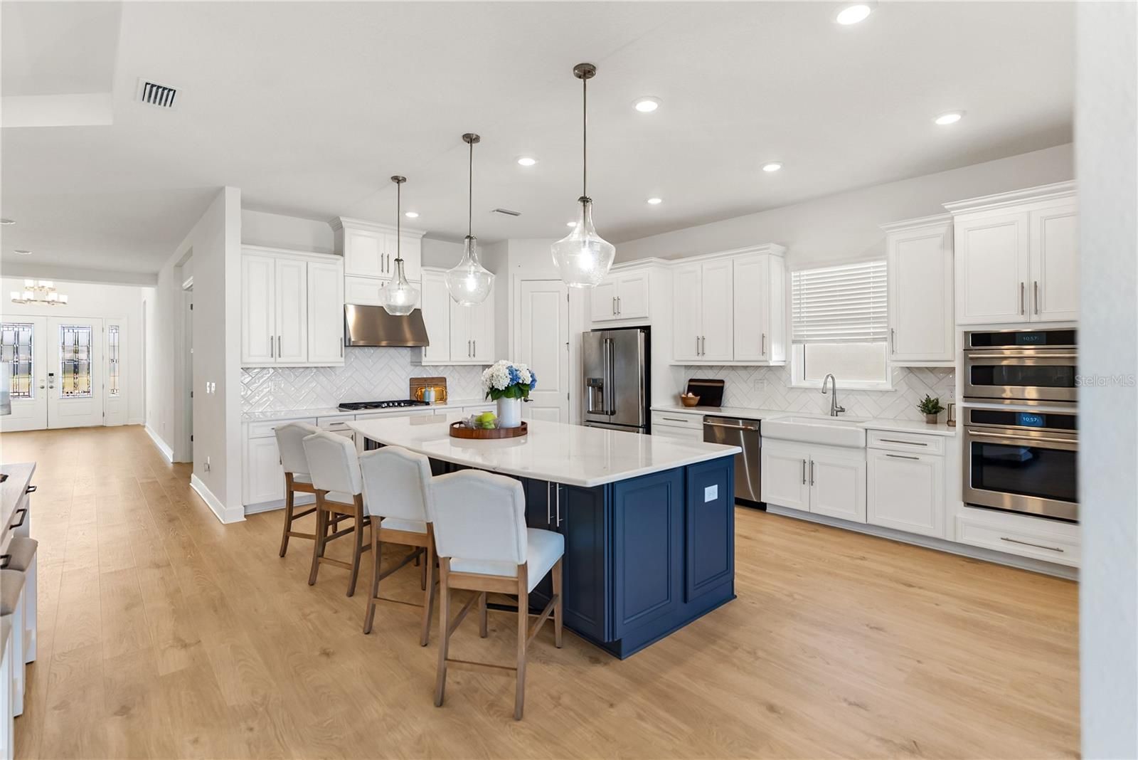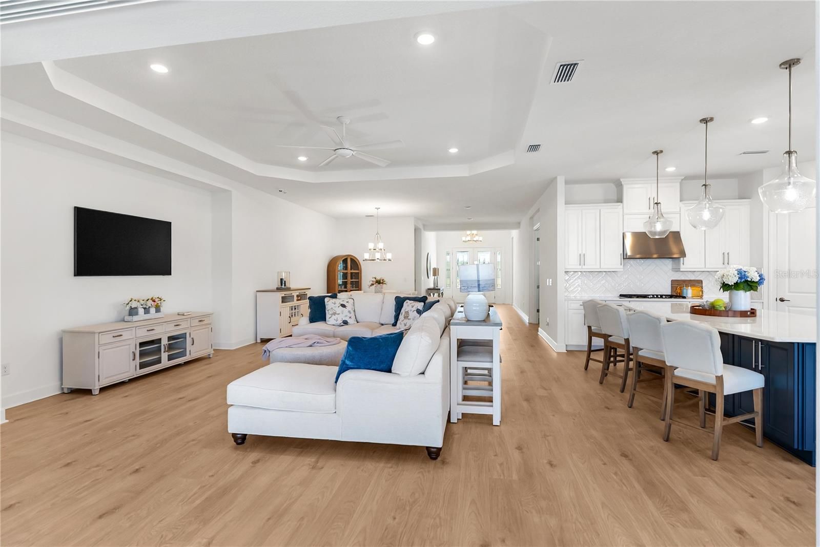 Tucked inside one of Lakewood Ranch’s most sought after resort communities, this beautifully upgraded pool home in Esplanade at Azario offers the perfect blend of luxury, comfort, and everyday convenience. Situated on an oversized lot, this beautifully upgraded four bedroom home with a private office and tandem three car garage offers a bright open layout with wide plank flooring, tray ceilings, and abundant natural light throughout. The chef’s kitchen is the heart of the home, featuring premium Café appliances, natural gas cooking, quartz countertops, custom cabinetry, and a large center island that flows seamlessly into the living and dining areas, creating the perfect space for everyday living and entertaining. Built out closets throughout the home, including a dedicated coat closet, provide exceptional storage and organization. The spacious primary suite offers a peaceful retreat with generous windows and a beautifully designed bathroom, while the additional bedrooms provide flexibility for guests or family. The outdoor living area is equally impressive with a covered lanai, outdoor kitchen, and a saltwater pool with a natural gas heater, all within a screened enclosure overlooking a private landscaped setting. Motorized hurricane shades allow you to enclose the lanai at the touch of a button, creating comfortable year round outdoor living. This home was built with both luxury and peace of mind in mind and includes hurricane impact windows, a Generac whole house generator, tankless water heater, PureWave whole house water filtration system, and natural gas service. Gutters have also been installed along the front and side of the home for added functionality. The home is being offered fully furnished, creating a true move in ready opportunity. Located in Esplanade at Azario, residents enjoy access to resort style amenities including a championship golf course, clubhouse, resort pool, fitness center, tennis and pickleball courts, and walking trails, and this home is not located within the golf cart deeded section of the community. It is also just minutes from Waterside Place, Lakewood Ranch Main Street, shopping, dining, top rated schools, and a short drive to the beaches of Anna Maria Island, Longboat Key, and Siesta Key.