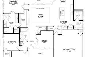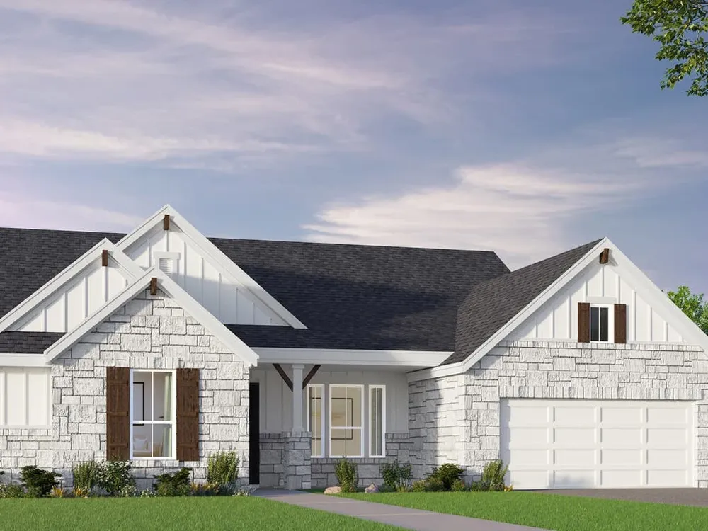 Estes plan with upgraded kitchen, quartz countertops, upgraded tile flooring, optional tray ceiling in living, optional 2 car side entry garage, Express cordless blinds