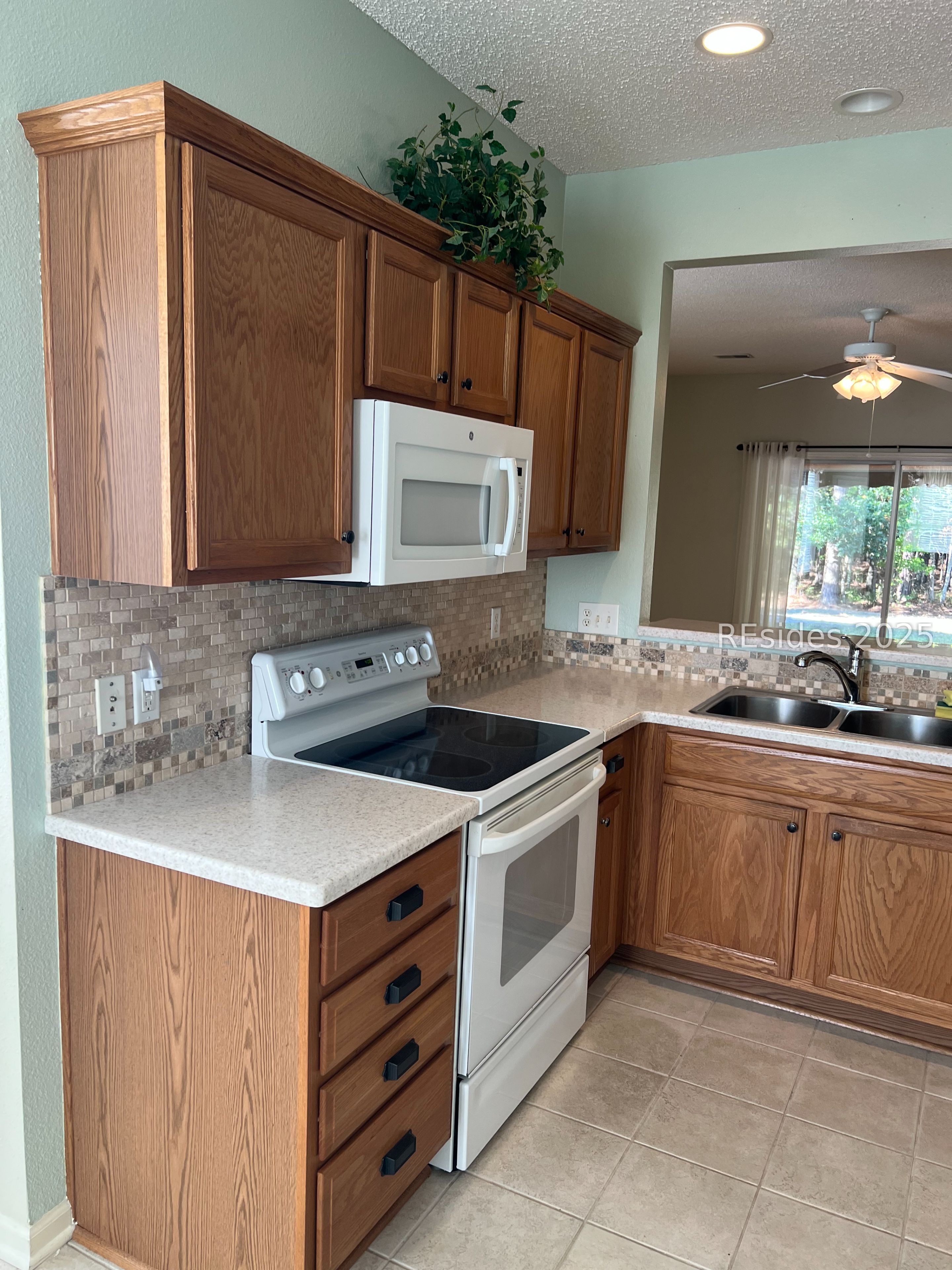 2 Bed/2Bath W/private and deep wooded view. Lots of natural light flows thru eat-in kitchen. Kitchen features solid surface counters, back splash, over-sized pantry & pass thru/breakfast bar that flows into generously sized great room. Owners suite has bay window & gorgeous view of wooded backyard, raised vanity with two sinks & walk-in-closet. Large guest room with full guest bath with upgraded vanity. 4' extended garage with utility sink in garage. Patio with Sunsetter awning is perfect to sit and relax after a busy day enjoying Sun City's amenities.