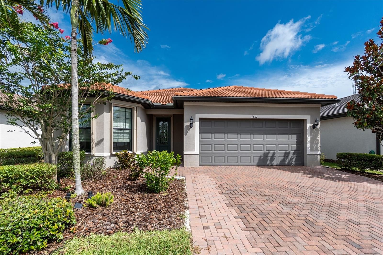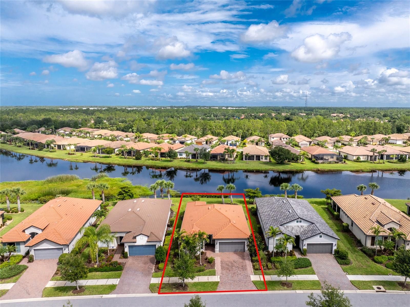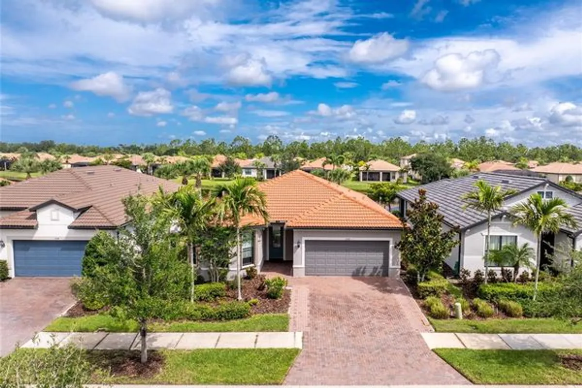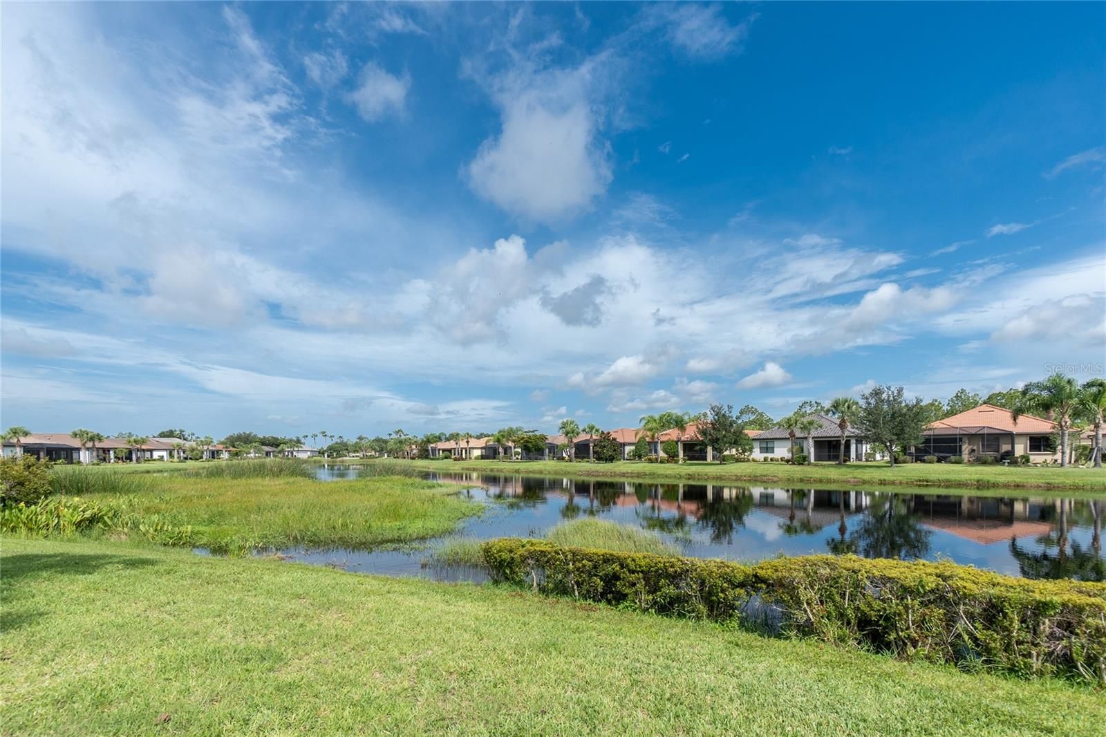 One or more photo(s) has been virtually staged. Imagine having a gorgeous sunset every night on your lanai with a private water view! This two-bedroom home with a den has a split plan perfect for guest privacy. The kitchen, which has granite countertops, a large Island with storage and room for seating, is both efficient and beautiful. The views of the lake are visible from the kitchen, eat-in dining area, living room, as well as the primary bedroom. The lanai, multiple windows and the front door have accordion hurricane shutters, and the remainder of the windows are protected by clear panels. No storm worries here, and flood insurance is NOT required. The paver driveway has been extended width-wise to comfortably accommodate multiple vehicles, and the garage door is insulated against the heat. The large inside laundry room has additional storage built in. There are tons of closets and storage. You can take your golfcart to the nearby clubhouse and amenities, which is the highlight of this beautiful, manicured community. With multiple pools, pickleball, tennis, horseshoes, bocce, cornhole, a community garden and dog park, including the social activities, you will have no need to leave home.