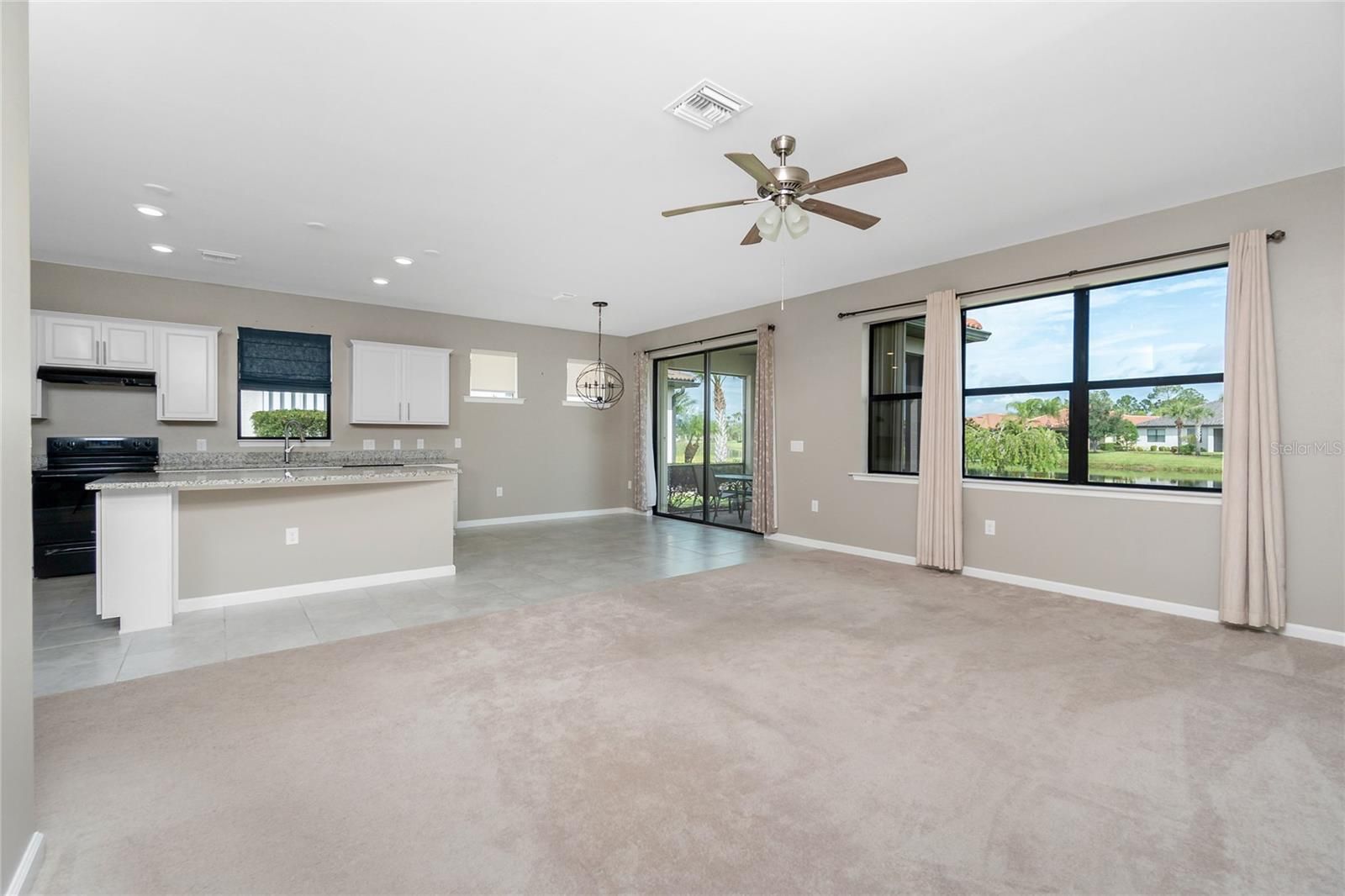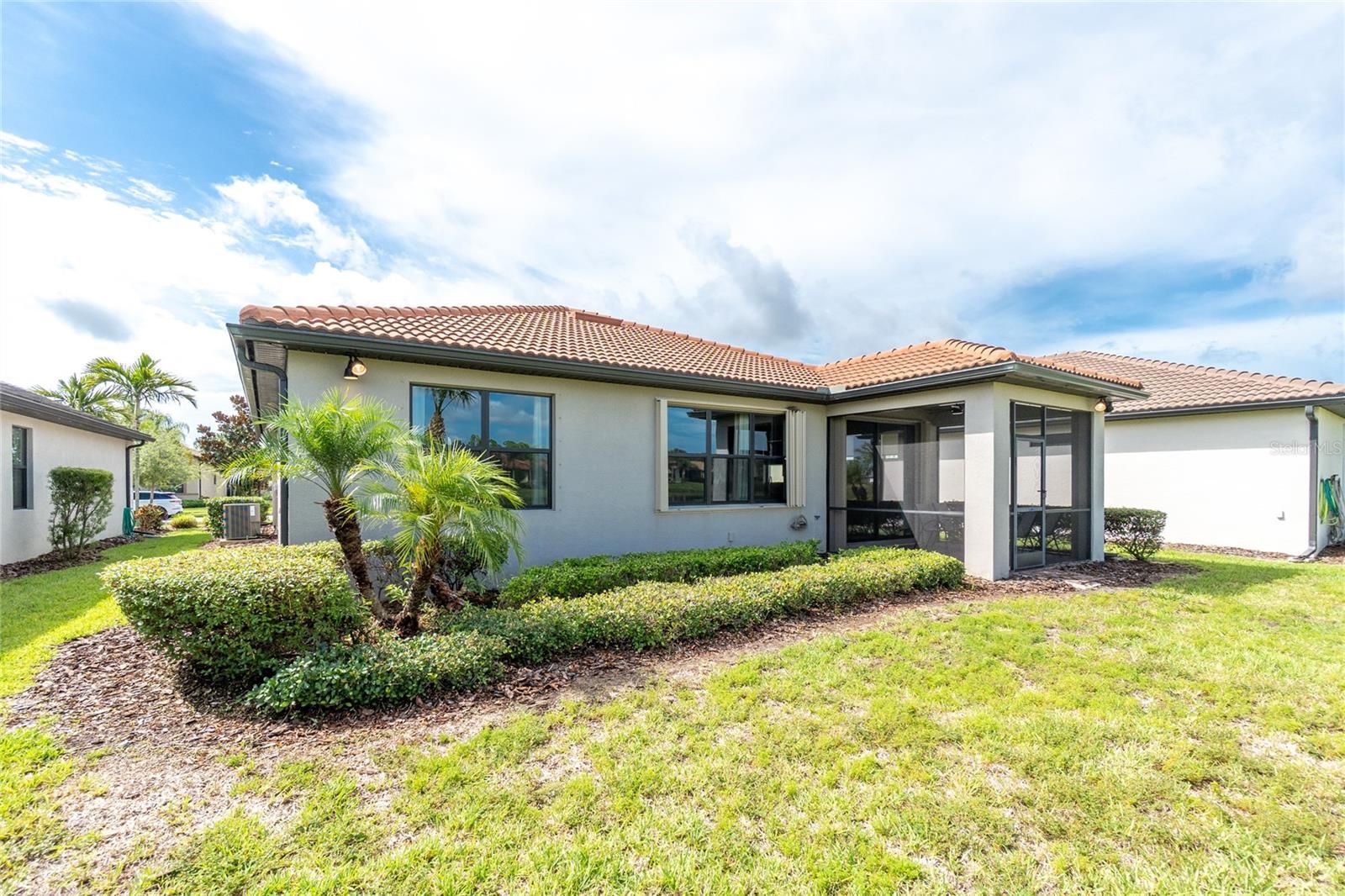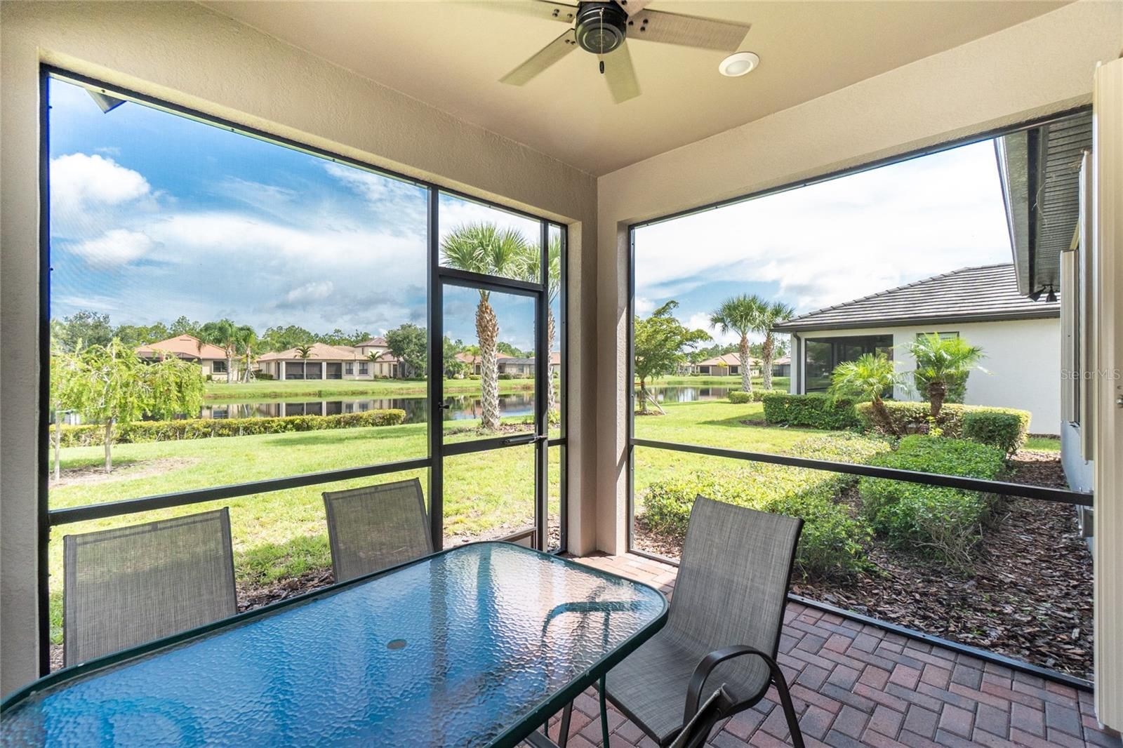 One or more photo(s) has been virtually staged. Imagine having a gorgeous sunset every night on your lanai with a private water view! This two-bedroom home with a den has a split plan perfect for guest privacy. The kitchen, which has granite countertops, a large Island with storage and room for seating, is both efficient and beautiful. The views of the lake are visible from the kitchen, eat-in dining area, living room, as well as the primary bedroom. The lanai, multiple windows and the front door have accordion hurricane shutters, and the remainder of the windows are protected by clear panels. No storm worries here, and flood insurance is NOT required. The paver driveway has been extended width-wise to comfortably accommodate multiple vehicles, and the garage door is insulated against the heat. The large inside laundry room has additional storage built in. There are tons of closets and storage. You can take your golfcart to the nearby clubhouse and amenities, which is the highlight of this beautiful, manicured community. With multiple pools, pickleball, tennis, horseshoes, bocce, cornhole, a community garden and dog park, including the social activities, you will have no need to leave home.