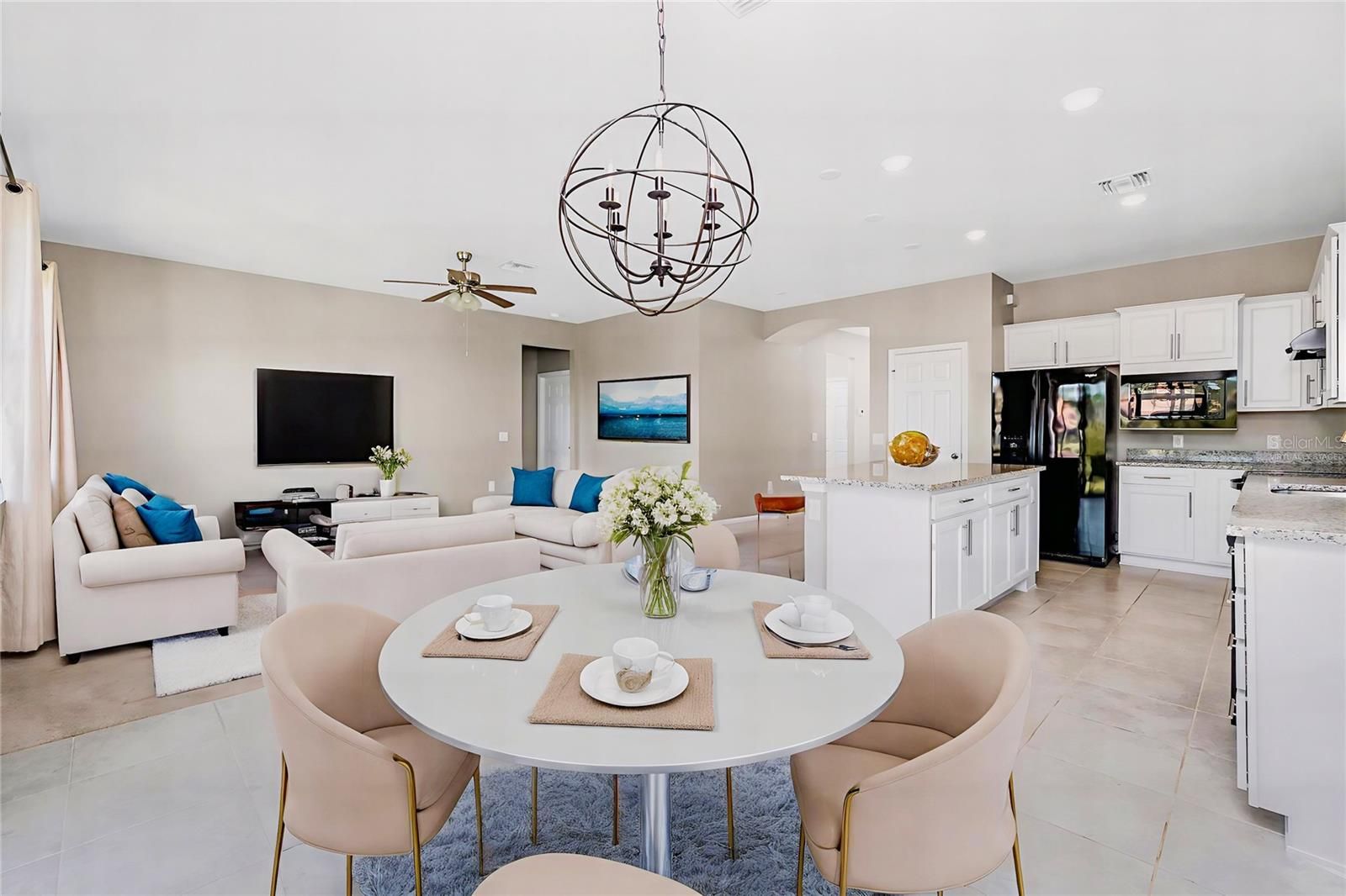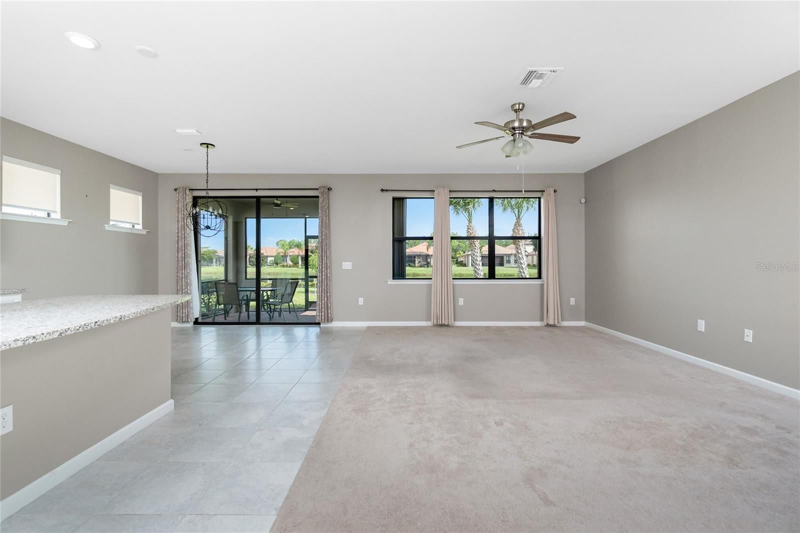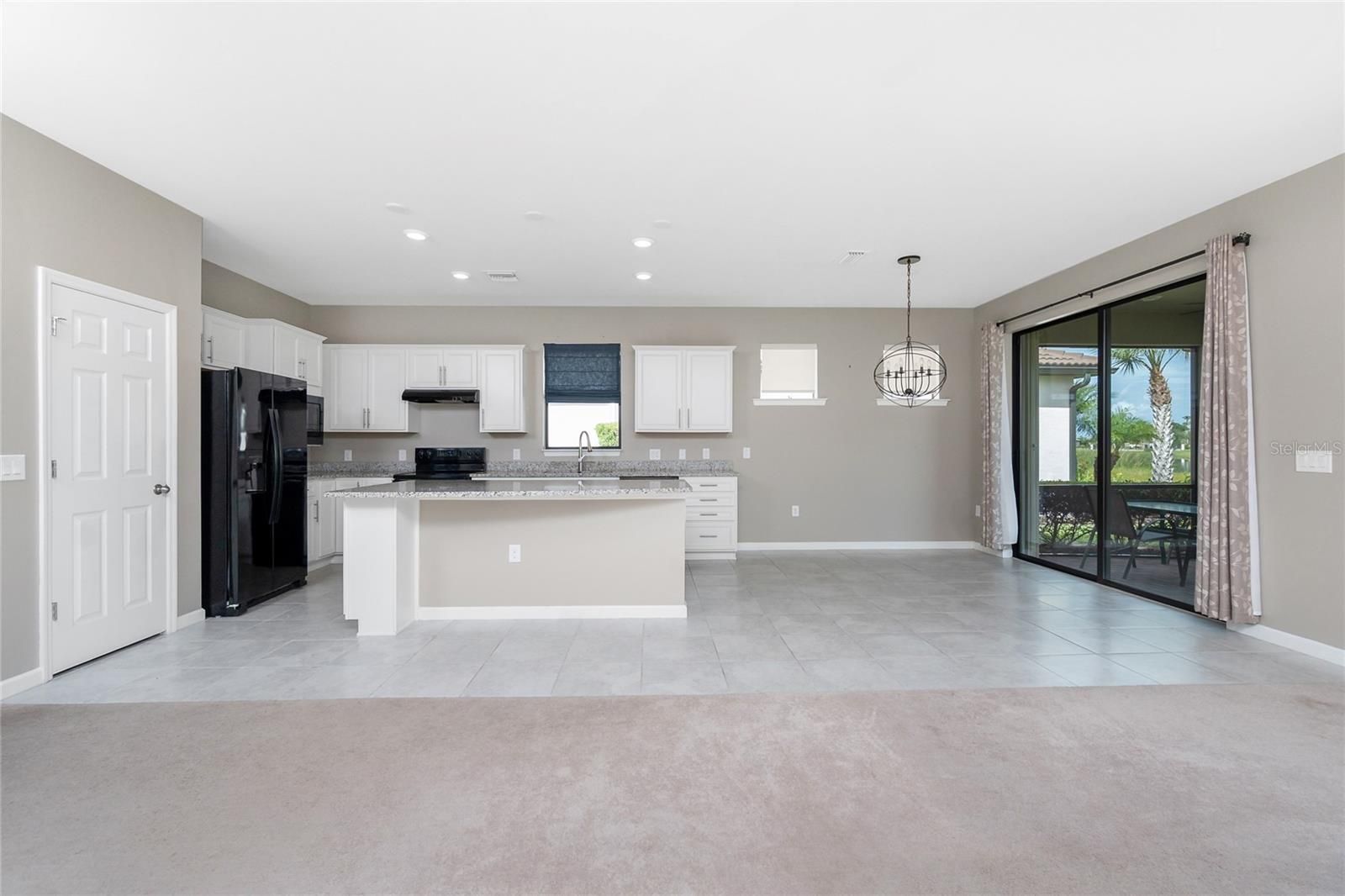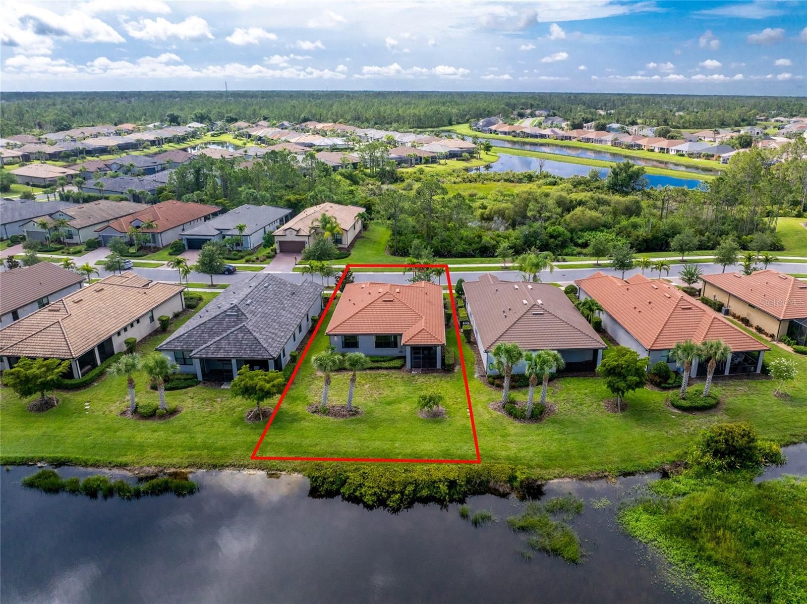 One or more photo(s) has been virtually staged. Imagine having a gorgeous sunset every night on your lanai with a private water view! This two-bedroom home with a den has a split plan perfect for guest privacy. The kitchen, which has granite countertops, a large Island with storage and room for seating, is both efficient and beautiful. The views of the lake are visible from the kitchen, eat-in dining area, living room, as well as the primary bedroom. The lanai, multiple windows and the front door have accordion hurricane shutters, and the remainder of the windows are protected by clear panels. No storm worries here, and flood insurance is NOT required. The paver driveway has been extended width-wise to comfortably accommodate multiple vehicles, and the garage door is insulated against the heat. The large inside laundry room has additional storage built in. There are tons of closets and storage. You can take your golfcart to the nearby clubhouse and amenities, which is the highlight of this beautiful, manicured community. With multiple pools, pickleball, tennis, horseshoes, bocce, cornhole, a community garden and dog park, including the social activities, you will have no need to leave home.
