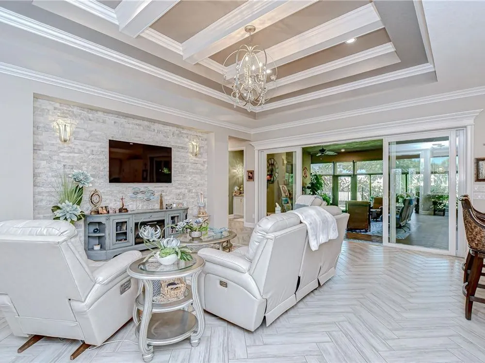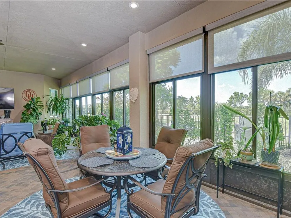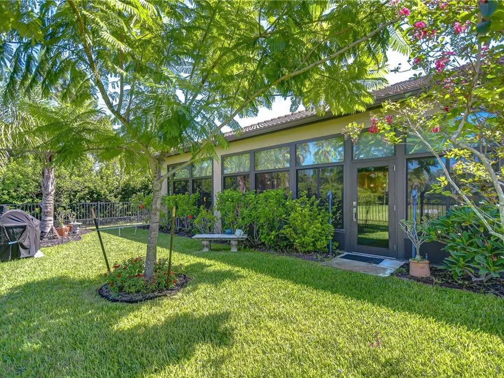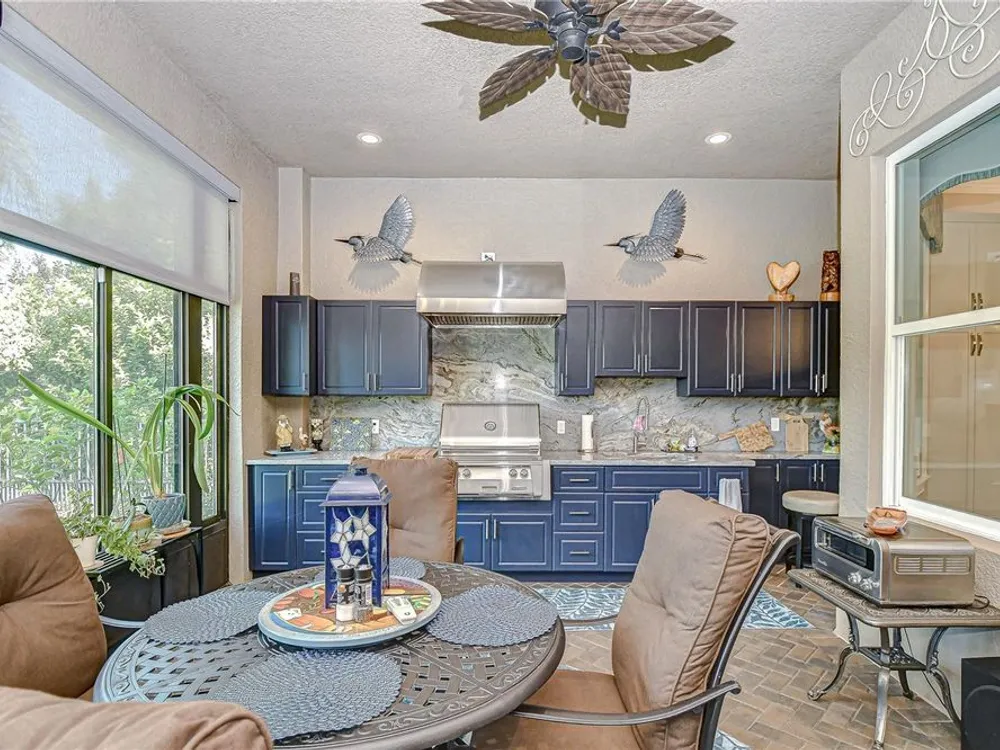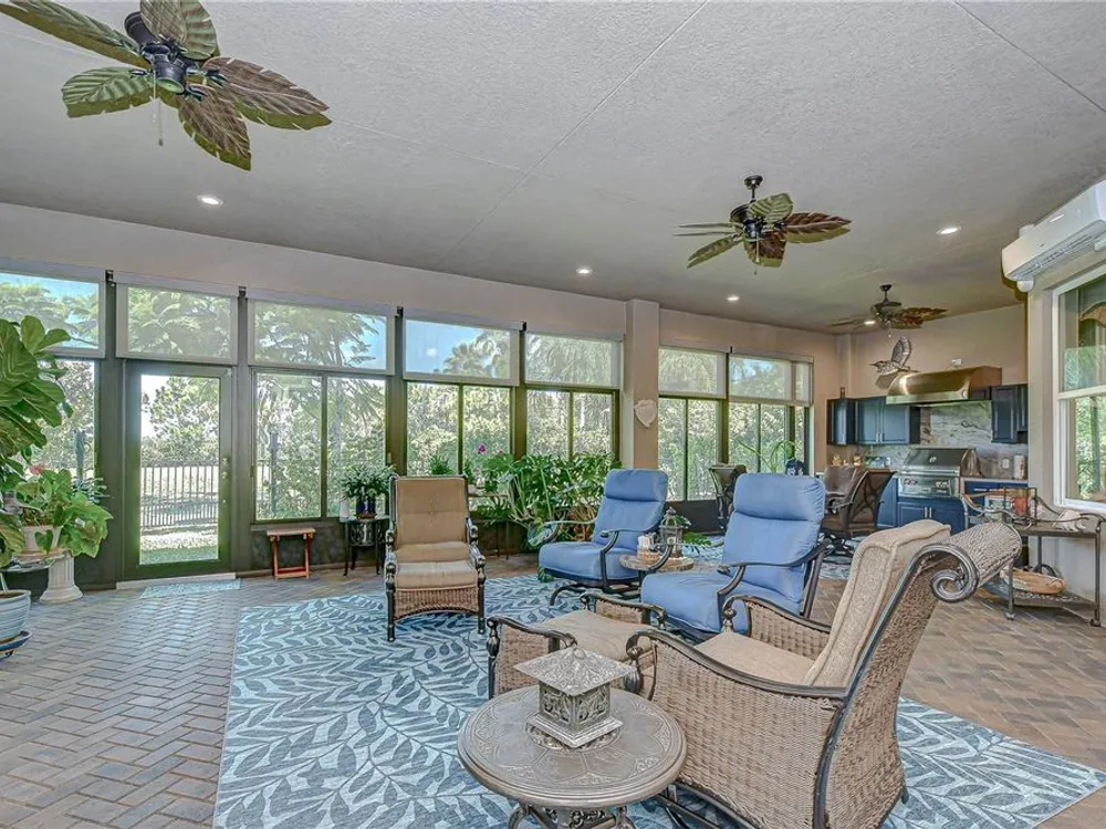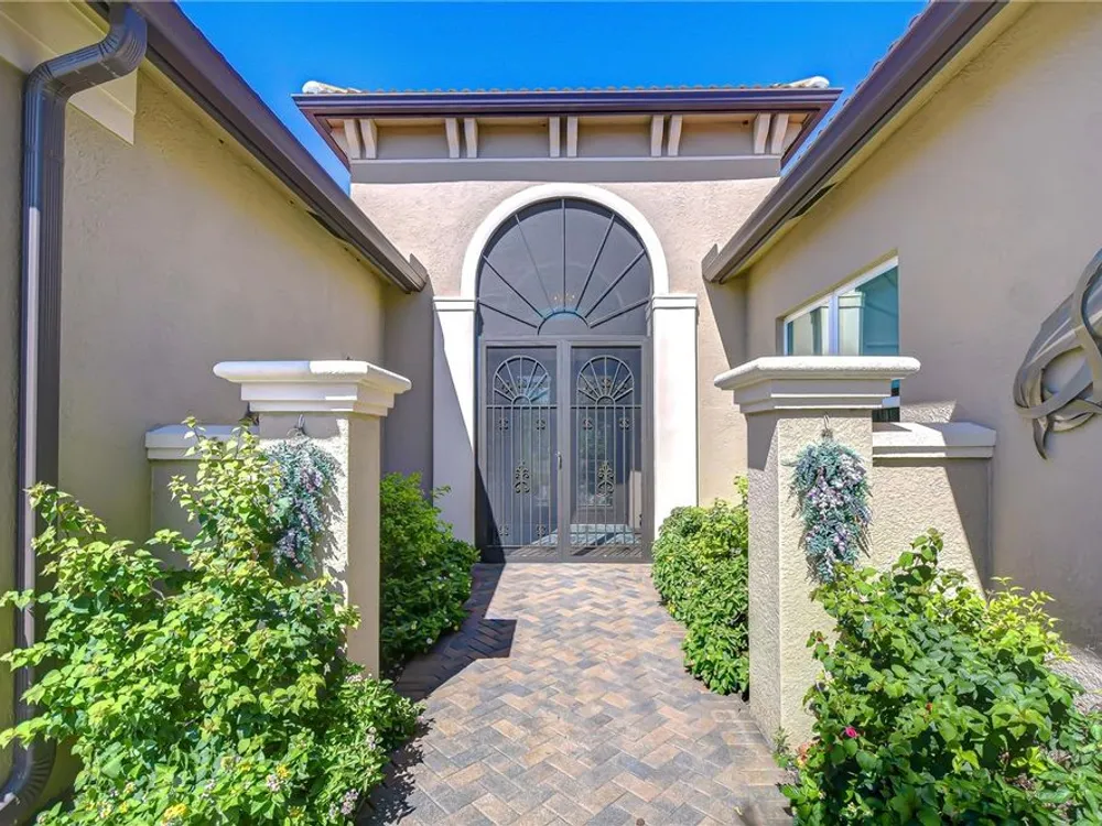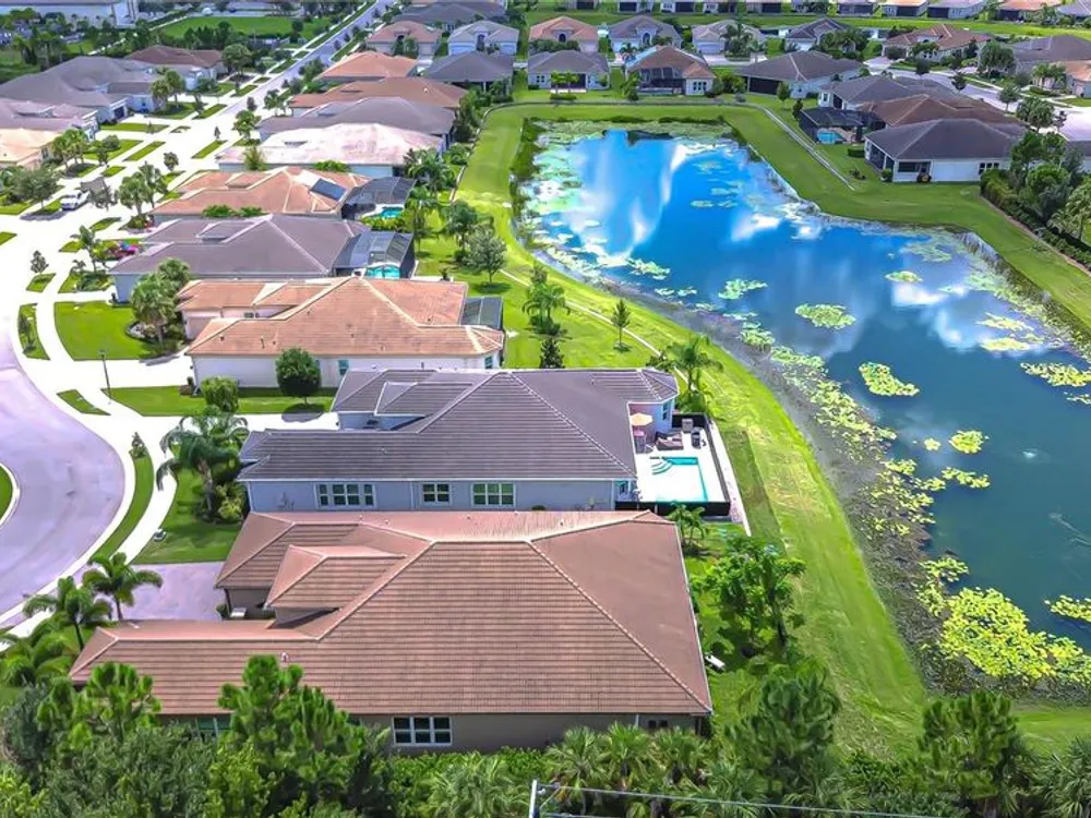 Welcome to the resort-style, 55+ gated community of Valencia Del Sol—where active, hands-free living is truly redefined! With an on-site activity director, your calendar will be filled with exciting events, and the Valencia Del Sol Club offers residents a full fitness center, meeting rooms, art and card rooms, a party room, PICKLEBALL courts, a resort-style pool, bocce ball, fire pits, and an on-site restaurant & bar. This stunning home, featuring over $200K in upgrades, offers 3 bedrooms, 3.5 baths, a bonus room, an oversized 772 SqFt Florida room, and a 3-car split garage, spanning over 3,855 sq. ft. Every detail exudes quality and elegance—from the Herringbone wood-look porcelain tile floors that flow throughout, double tray coffered ceiling and stone accent wall in the great room, crown moulding, and designer fixtures, to the custom window treatments and high-end finishes throughout. Step into the expansive, climate-controlled Florida room with automatic window shades, where peaceful water views and unforgettable Florida sunsets set the scene for seamless indoor-outdoor living. Entertain with ease in the custom-built outdoor kitchen featuring a commercial-grade extractor, and enjoy privacy in the fenced backyard surrounded by beautiful tropical landscaping. The gourmet kitchen is a chef’s dream, complete with quartz waterfall countertops, high-end cabinetry with custom pull-outs and soft-close drawers, stainless appliances, including a Cafe gas range with dual ovens, pantry pullouts, and a bright breakfast area with breakfast bar. The primary suite is truly remarkable, featuring stunning pond views, two walk-in California closets, and a private en-suite with dual vanities, a walk-in shower, and a soaking tub. One secondary bedroom offers a walk-in closet and private en-suite, while the third bedroom also features a walk-in closet with a nearby full bath highlighted by elegant fish scale tilework. Additional upgrades for peace of mind include whole-home high-impact windows and sliding glass doors, a transfer switch and portable generator setup so you’ll never be left in the dark, rain gutters, and a Culligan water softener/filter. The bonus room with built-in shelves and a desk is perfect for working from home, and the laundry room includes additional cabinetry for extra storage. Valencia Del Sol takes care of the details so you don’t have to, with community-provided pest control, lawn maintenance, mulching, and fertilizing, allowing you to focus on the lifestyle you deserve. Ideally located less than 40 minutes from both Sarasota and Tampa International Airports, this meticulously maintained and thoughtfully upgraded waterfront property combines luxurious comfort with convenience. Schedule your private tour today—you won’t be disappointed! Copy and paste this link to tour the home virtually: my.matterport.com/show/?m=ibV73eDfGmw&mls=1