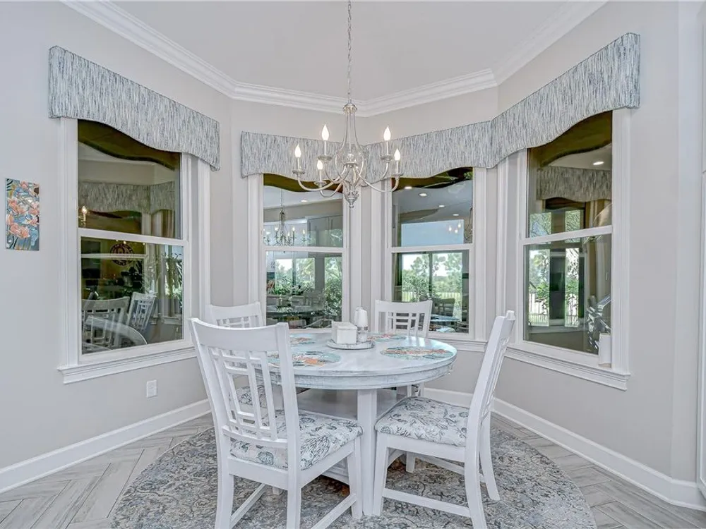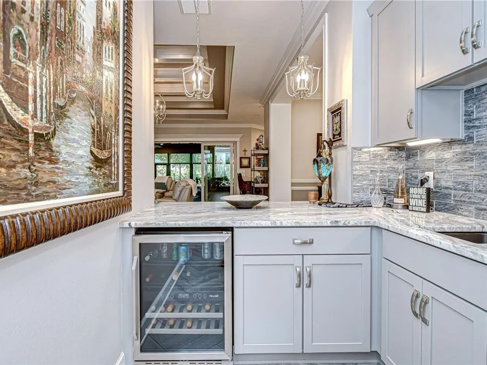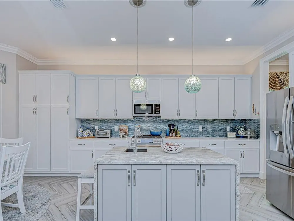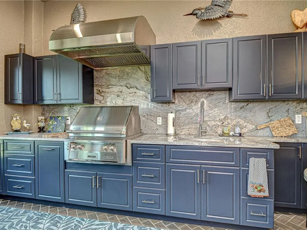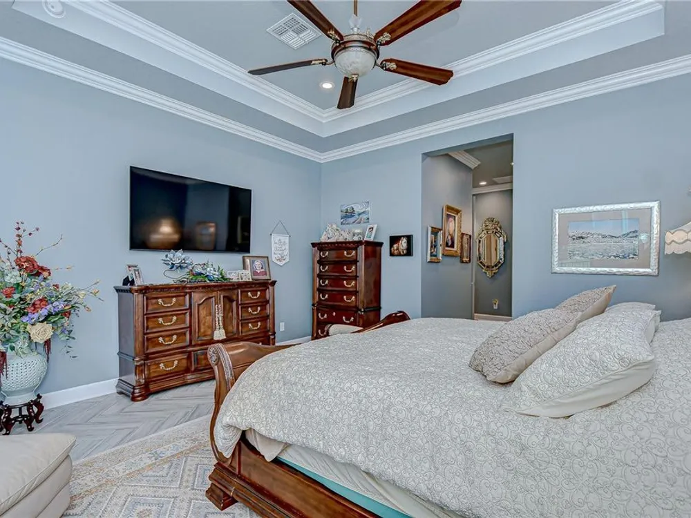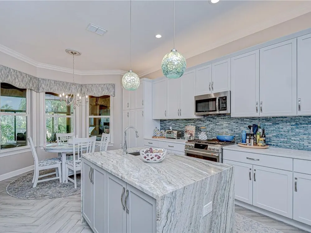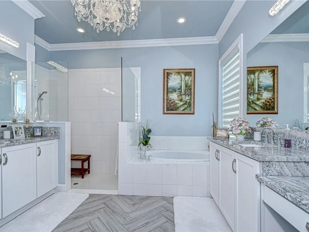 Welcome to the resort-style, 55+ gated community of Valencia Del Sol—where active, hands-free living is truly redefined! With an on-site activity director, your calendar will be filled with exciting events, and the Valencia Del Sol Club offers residents a full fitness center, meeting rooms, art and card rooms, a party room, PICKLEBALL courts, a resort-style pool, bocce ball, fire pits, and an on-site restaurant & bar. This stunning home, featuring over $200K in upgrades, offers 3 bedrooms, 3.5 baths, a bonus room, an oversized 772 SqFt Florida room, and a 3-car split garage, spanning over 3,855 sq. ft. Every detail exudes quality and elegance—from the Herringbone wood-look porcelain tile floors that flow throughout, double tray coffered ceiling and stone accent wall in the great room, crown moulding, and designer fixtures, to the custom window treatments and high-end finishes throughout. Step into the expansive, climate-controlled Florida room with automatic window shades, where peaceful water views and unforgettable Florida sunsets set the scene for seamless indoor-outdoor living. Entertain with ease in the custom-built outdoor kitchen featuring a commercial-grade extractor, and enjoy privacy in the fenced backyard surrounded by beautiful tropical landscaping. The gourmet kitchen is a chef’s dream, complete with quartz waterfall countertops, high-end cabinetry with custom pull-outs and soft-close drawers, stainless appliances, including a Cafe gas range with dual ovens, pantry pullouts, and a bright breakfast area with breakfast bar. The primary suite is truly remarkable, featuring stunning pond views, two walk-in California closets, and a private en-suite with dual vanities, a walk-in shower, and a soaking tub. One secondary bedroom offers a walk-in closet and private en-suite, while the third bedroom also features a walk-in closet with a nearby full bath highlighted by elegant fish scale tilework. Additional upgrades for peace of mind include whole-home high-impact windows and sliding glass doors, a transfer switch and portable generator setup so you’ll never be left in the dark, rain gutters, and a Culligan water softener/filter. The bonus room with built-in shelves and a desk is perfect for working from home, and the laundry room includes additional cabinetry for extra storage. Valencia Del Sol takes care of the details so you don’t have to, with community-provided pest control, lawn maintenance, mulching, and fertilizing, allowing you to focus on the lifestyle you deserve. Ideally located less than 40 minutes from both Sarasota and Tampa International Airports, this meticulously maintained and thoughtfully upgraded waterfront property combines luxurious comfort with convenience. Schedule your private tour today—you won’t be disappointed! Copy and paste this link to tour the home virtually: my.matterport.com/show/?m=ibV73eDfGmw&mls=1