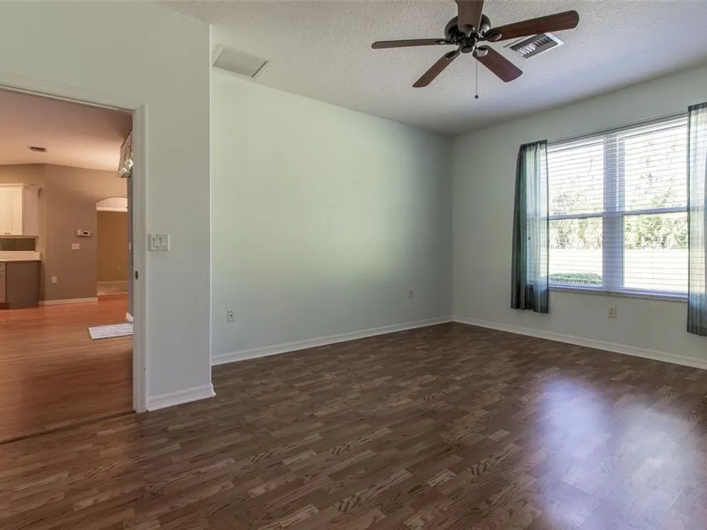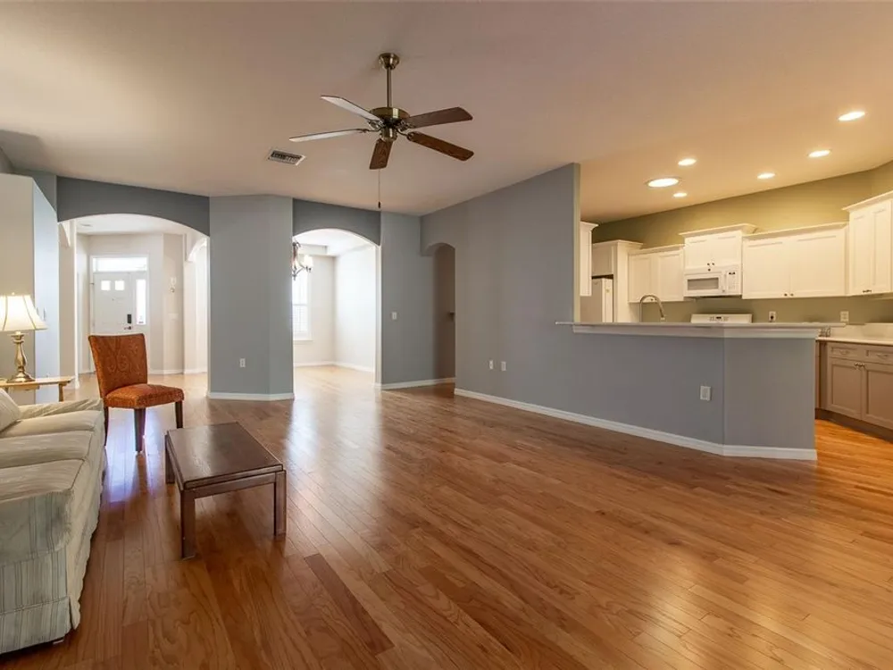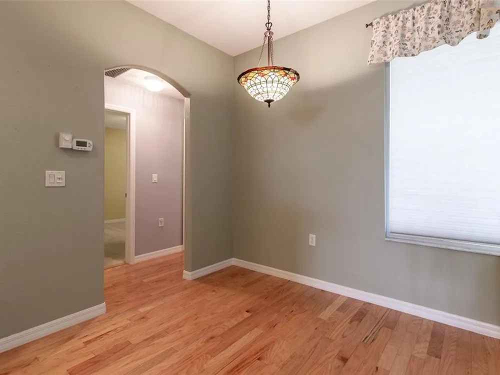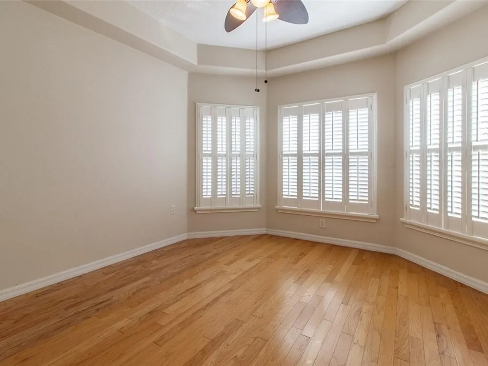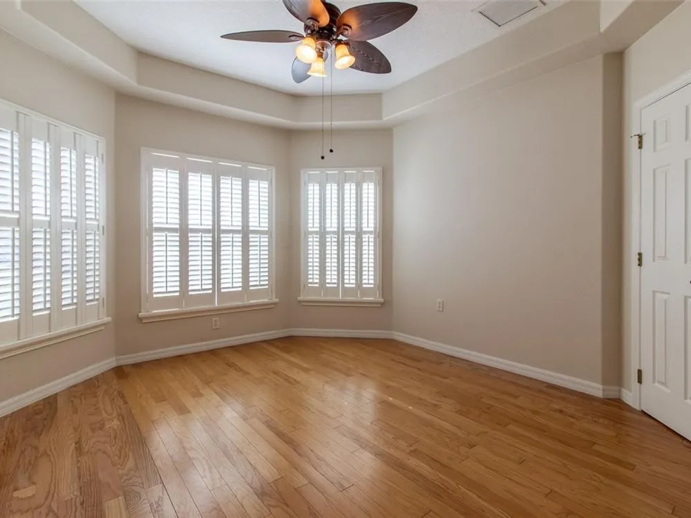 - Ceiling Fan(s), High Ceilings, L-Shaped Dining Room, Open Floorplan, Main Level Primary, Solid-Wood Cabinets, Split Bedrooms, Stone Counters, Walk-In Closet(s), Window Treatments