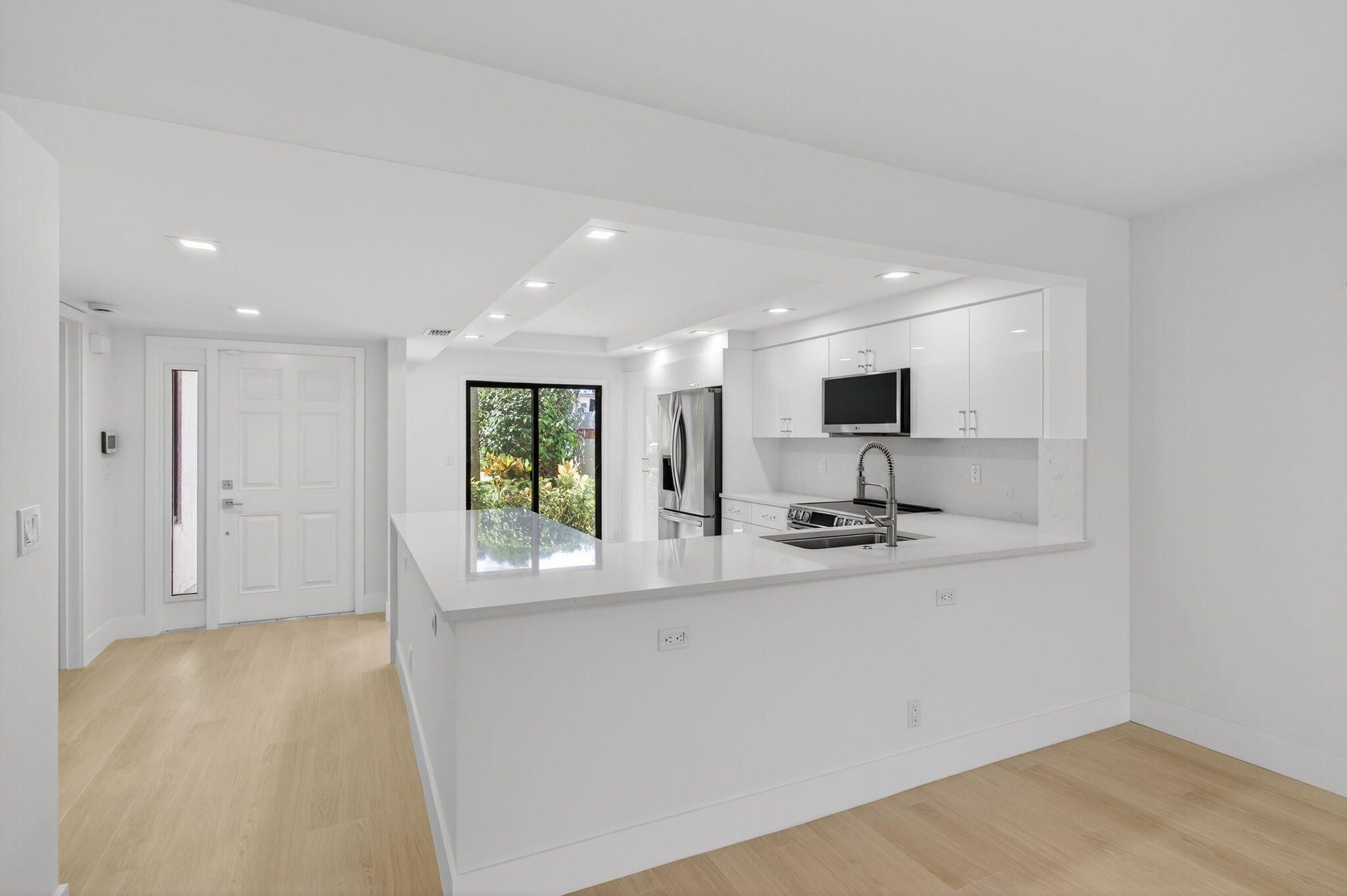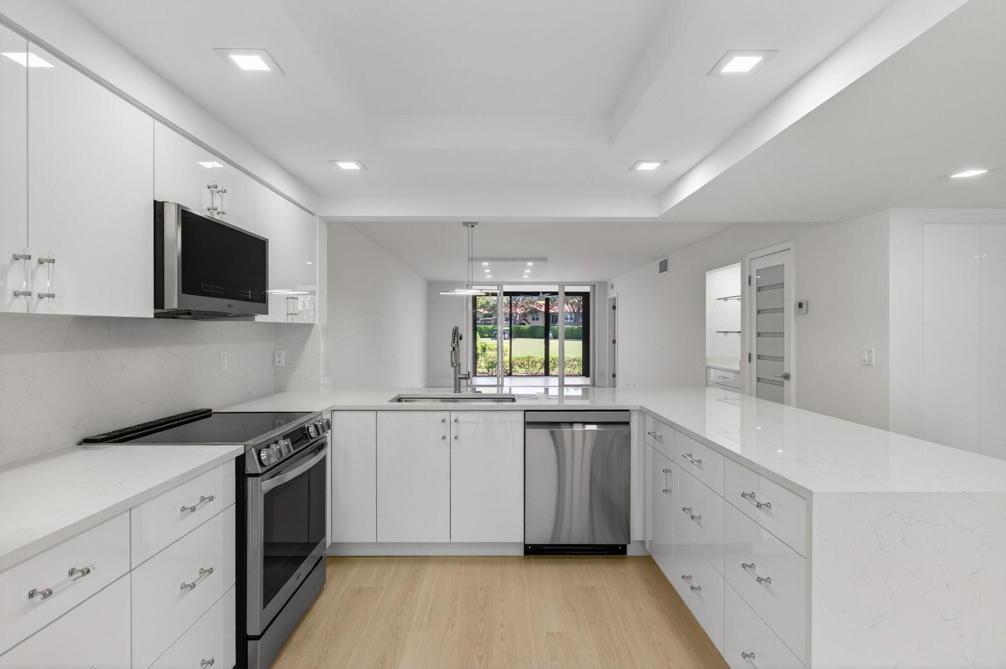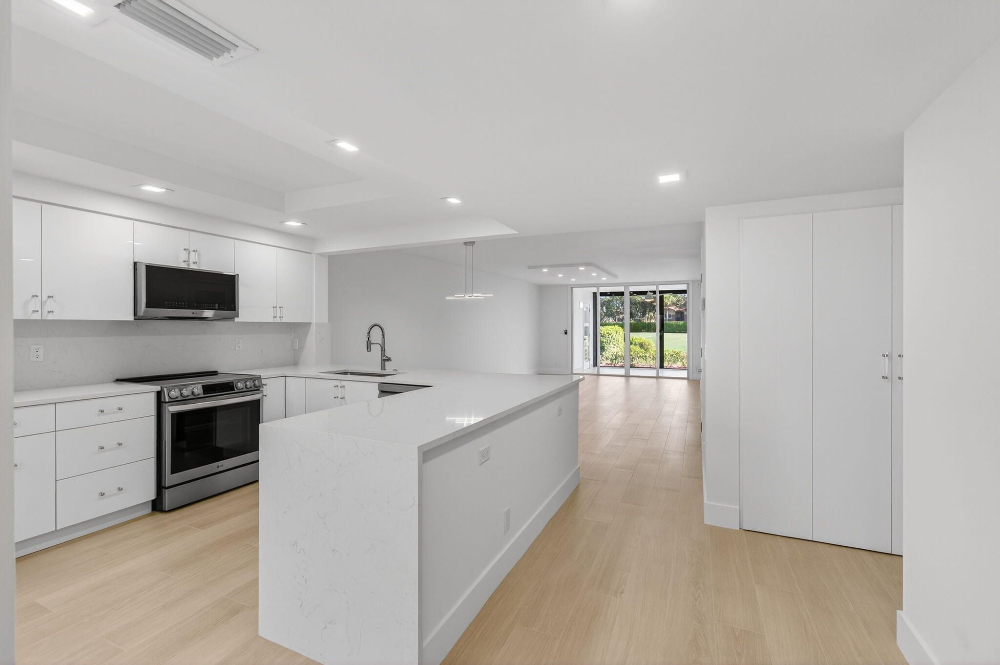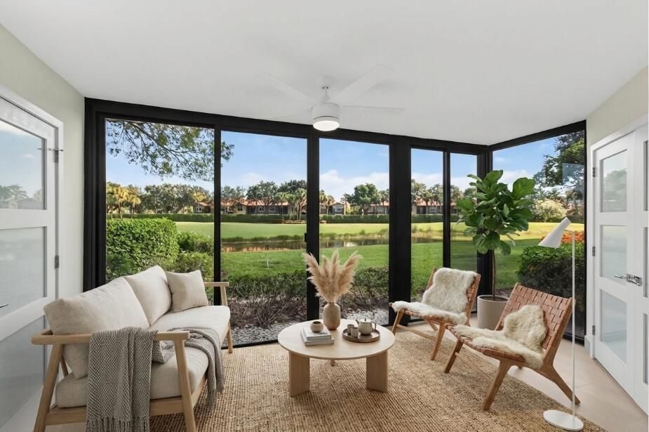 Completely renovated, move-in ready 2-bed/2-bath 1st FLOOR CONDO. No more steps. Short walk to worship, shops & your everyday needs. All interior features are BRAND NEW: kitchen, bathrooms, hurricane impact windows & doors, ceramic flooring throughout, European style cabinets, quartz countertops, upgraded appliances, A/C, water heater, plumbing, COPPER PIPES, electrical wiring including ELECTRICAL PANEL, all plumbing fixtures & lights. Elegant, open-concept space easily combines style & comfort. Attention to detail in every aspect. Private patio opens up onto a serene golf course & water view that adds peace & tranquility to the indoors. Gleneagles is an award-winning country club where you will enjoy resort-style amenities in one of the most sought after country clubs in S/E Florida.