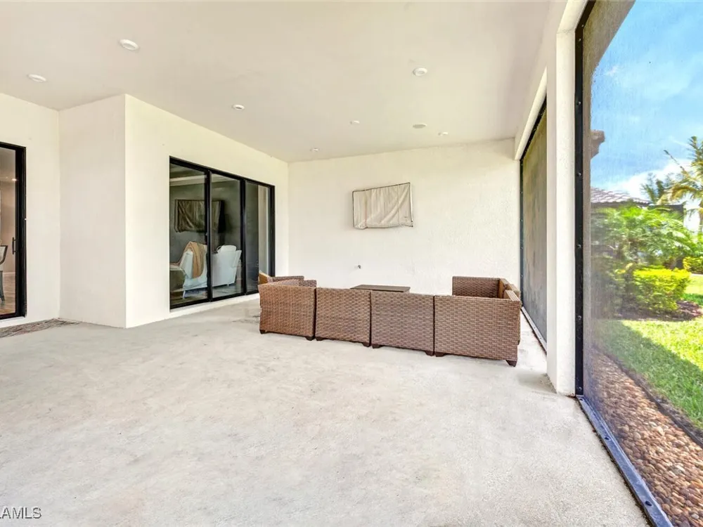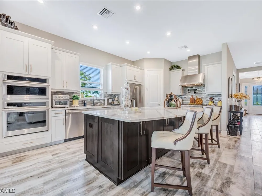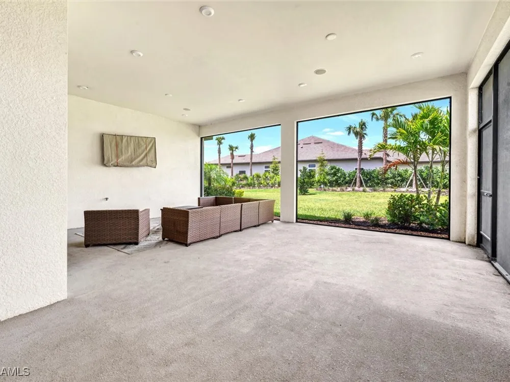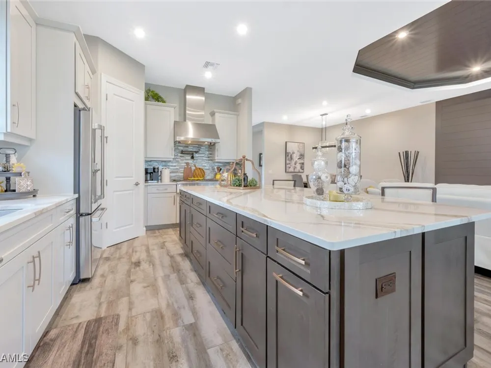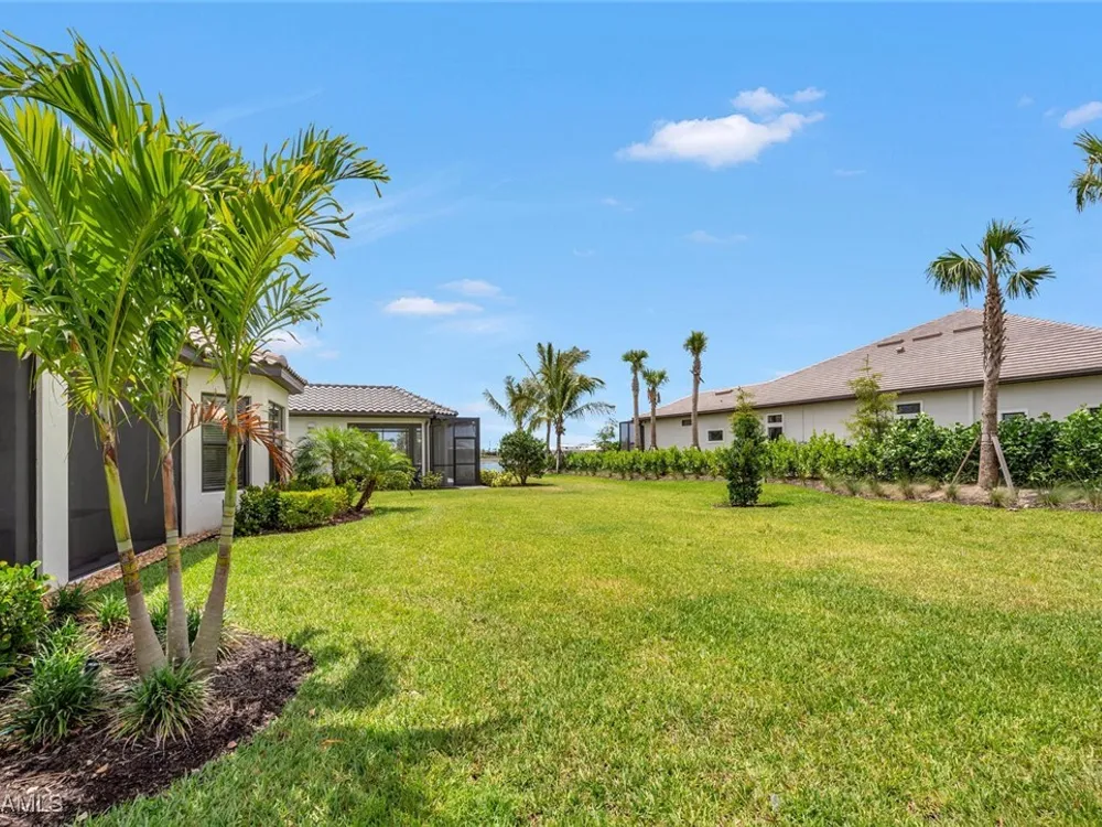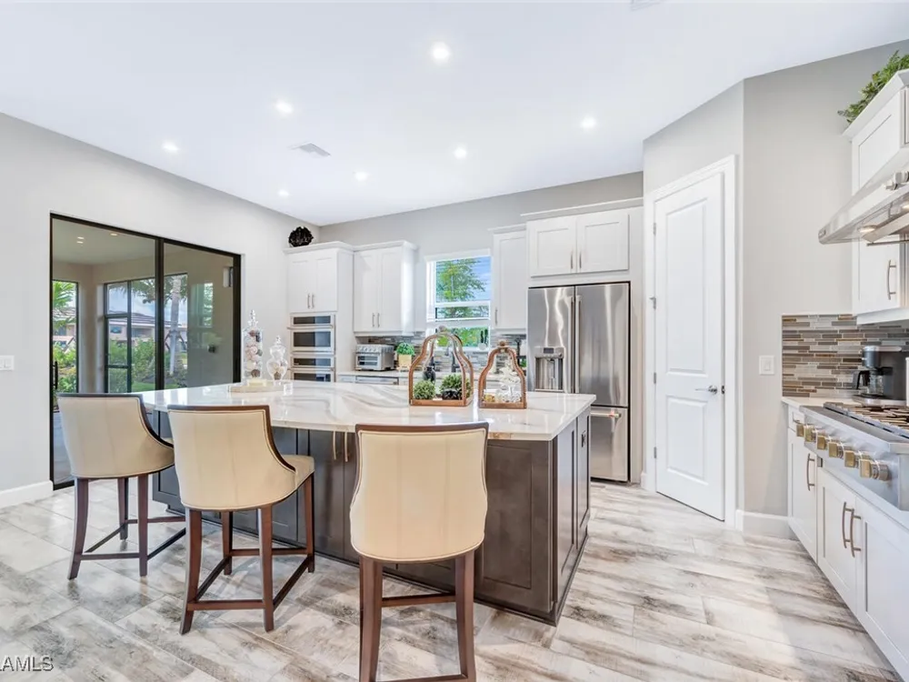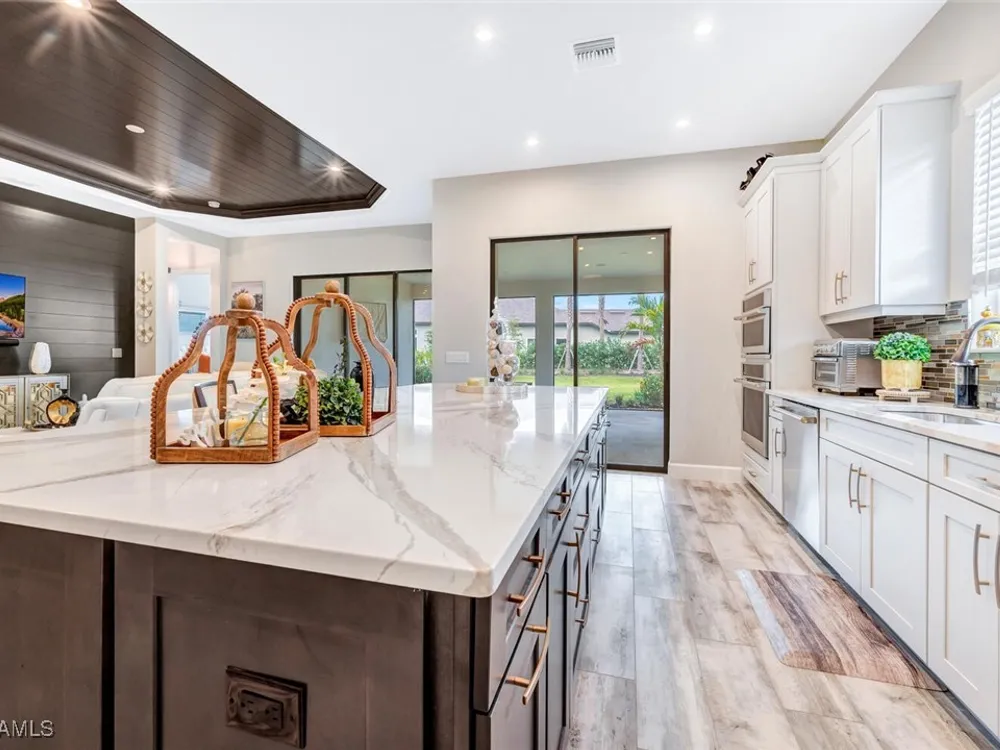 Experience unparalleled luxury in this immaculate, newly constructed residence, completed in 2022. Nestled in the prestigious Esplanade by the Islands community, this Lazio model home is replete with opulent upgrades designed to elevate your lifestyle. This exquisite property features three bedrooms, three bathrooms, and a versatile den, embodying the epitome of Florida's ultra-luxurious living. At the heart of this splendid home are a chef’s dream kitchen equipped with top-of-the-line stainless steel appliances, including a six-burner gas cooktop and a built-in oven/microwave. The kitchen is adorned with upgraded cabinetry, sleek quartz countertops, sophisticated designer lighting, and a stylish backsplash. Additional cabinetry beneath the expansive island enhances functionality and style. The thoughtful floor plan boasts wood-look tile flooring throughout and is accentuated by designer lighting fixtures. The great room, enhanced with newly installed shiplap, leads to an expansive lanai surrounded by lush landscaping, pre-wired for a future pool and outdoor kitchen—ideal for seamless indoor-outdoor living. Oversized, light-filled bedrooms offer a serene retreat for guests, complete with access to the numerous amenities that Esplanade has to offer. The bathrooms are a masterpiece of design, featuring exquisite vanities, premium quartz and granite countertops, and designer tile work. The luxurious primary suite is a sanctuary in itself, highlighted by a charming bay window and an expansive en-suite bathroom. This spa-like bath includes a vast walk-in shower, a lavish vanity with a makeup area, designer tile, and a spacious walk-in closet. A beautifully appointed and efficient laundry room with upgraded cabinetry and new appliances adds to the home’s conveniences. Residents of Esplanade by the Islands enjoy access to exceptional amenities, including tennis and pickleball courts, a comprehensive fitness center, eight miles of scenic walking trails, upscale dining options, and a magnificent pool and spa area. Drawing inspiration from its sister community, Esplanade Golf on Immokalee Road, it offers an idyllic setting close to Marco Island and Old Naples—putting the best of Southwest Florida right at your doorstep.