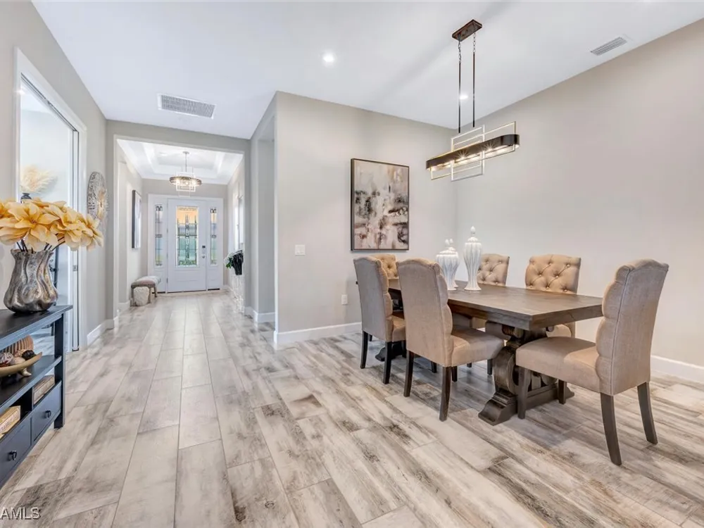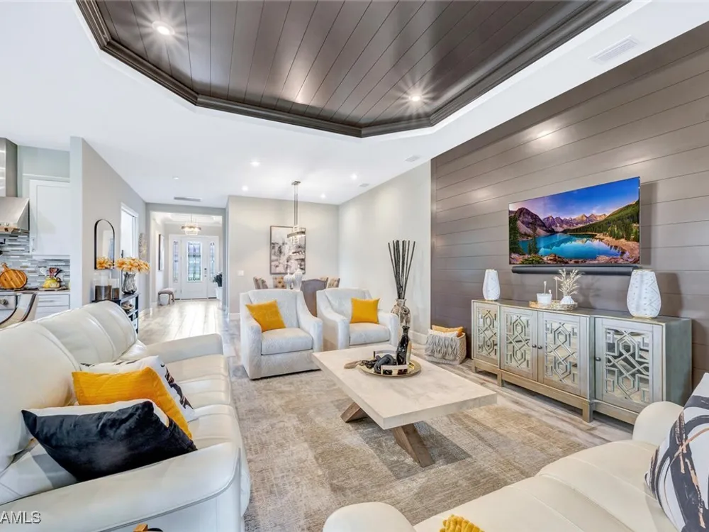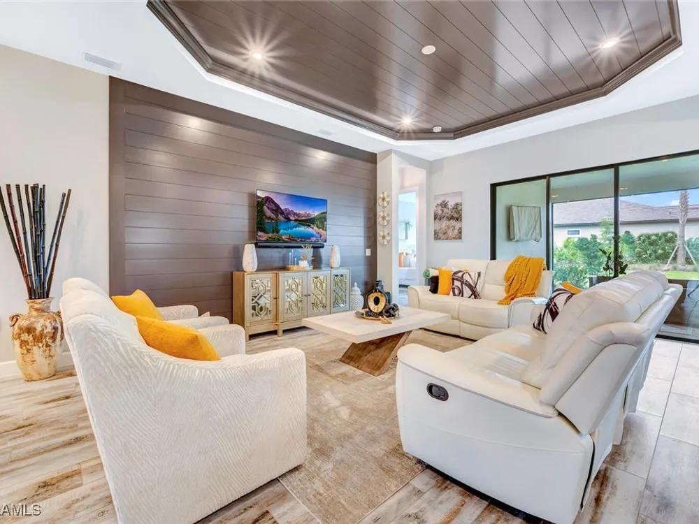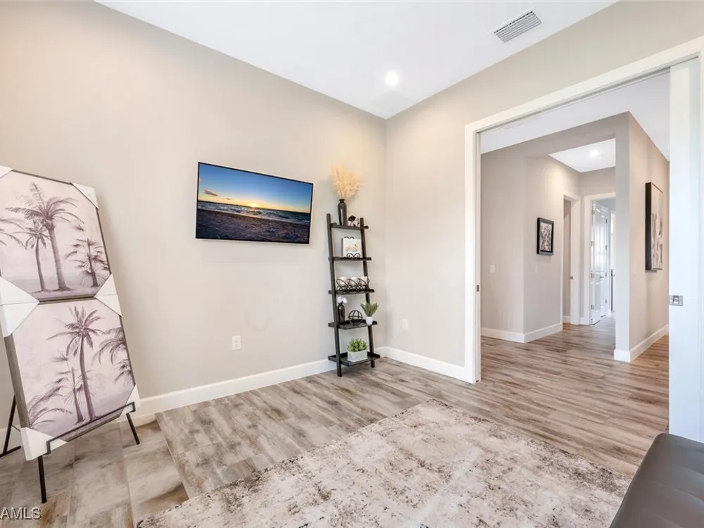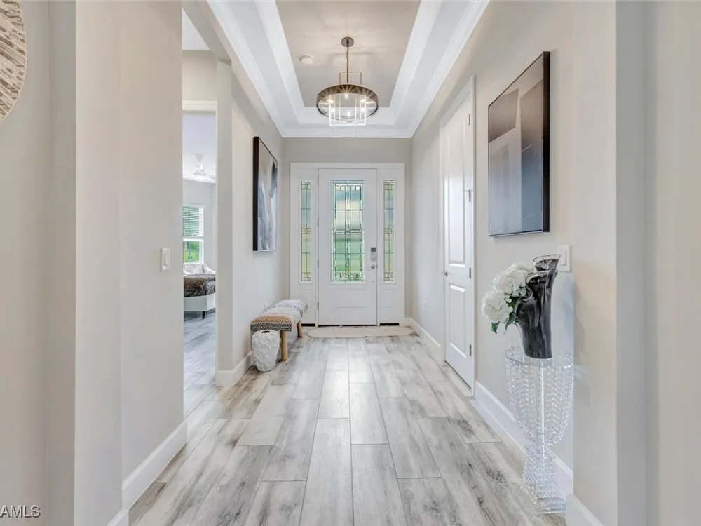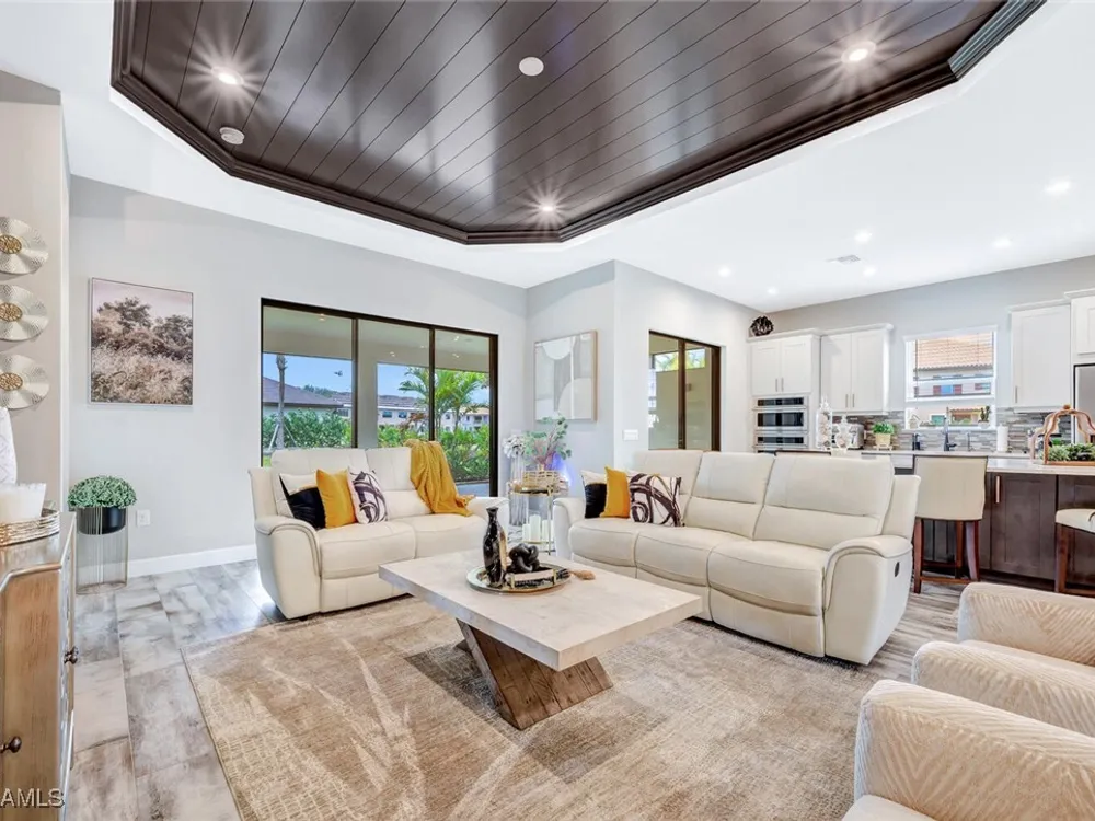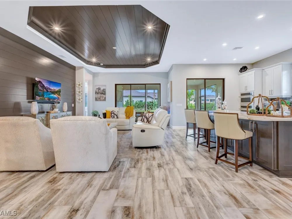 Experience unparalleled luxury in this immaculate, newly constructed residence, completed in 2022. Nestled in the prestigious Esplanade by the Islands community, this Lazio model home is replete with opulent upgrades designed to elevate your lifestyle. This exquisite property features three bedrooms, three bathrooms, and a versatile den, embodying the epitome of Florida's ultra-luxurious living. At the heart of this splendid home are a chef’s dream kitchen equipped with top-of-the-line stainless steel appliances, including a six-burner gas cooktop and a built-in oven/microwave. The kitchen is adorned with upgraded cabinetry, sleek quartz countertops, sophisticated designer lighting, and a stylish backsplash. Additional cabinetry beneath the expansive island enhances functionality and style. The thoughtful floor plan boasts wood-look tile flooring throughout and is accentuated by designer lighting fixtures. The great room, enhanced with newly installed shiplap, leads to an expansive lanai surrounded by lush landscaping, pre-wired for a future pool and outdoor kitchen—ideal for seamless indoor-outdoor living. Oversized, light-filled bedrooms offer a serene retreat for guests, complete with access to the numerous amenities that Esplanade has to offer. The bathrooms are a masterpiece of design, featuring exquisite vanities, premium quartz and granite countertops, and designer tile work. The luxurious primary suite is a sanctuary in itself, highlighted by a charming bay window and an expansive en-suite bathroom. This spa-like bath includes a vast walk-in shower, a lavish vanity with a makeup area, designer tile, and a spacious walk-in closet. A beautifully appointed and efficient laundry room with upgraded cabinetry and new appliances adds to the home’s conveniences. Residents of Esplanade by the Islands enjoy access to exceptional amenities, including tennis and pickleball courts, a comprehensive fitness center, eight miles of scenic walking trails, upscale dining options, and a magnificent pool and spa area. Drawing inspiration from its sister community, Esplanade Golf on Immokalee Road, it offers an idyllic setting close to Marco Island and Old Naples—putting the best of Southwest Florida right at your doorstep.