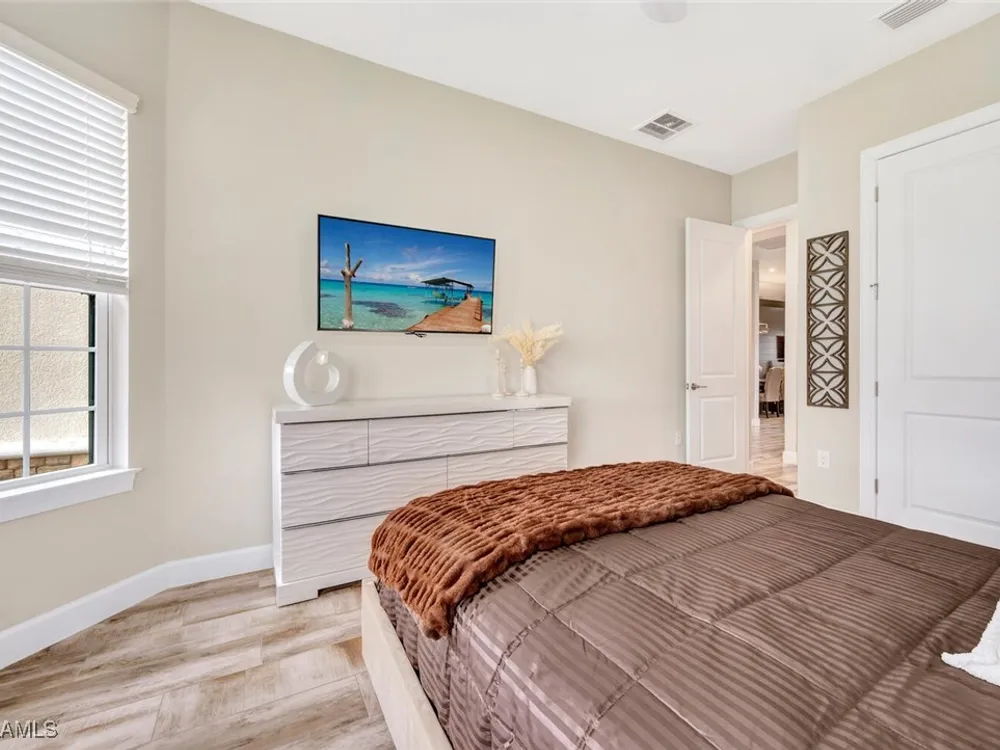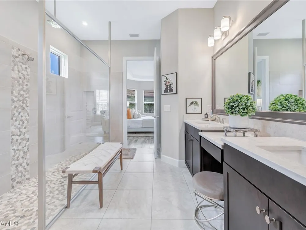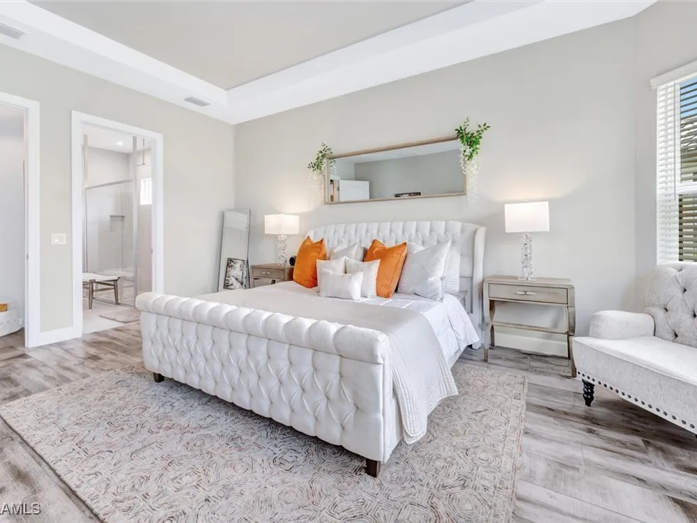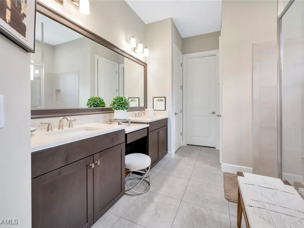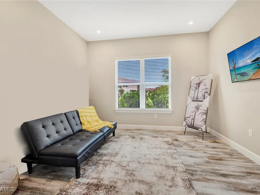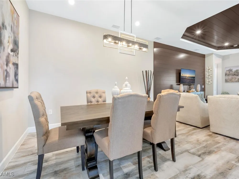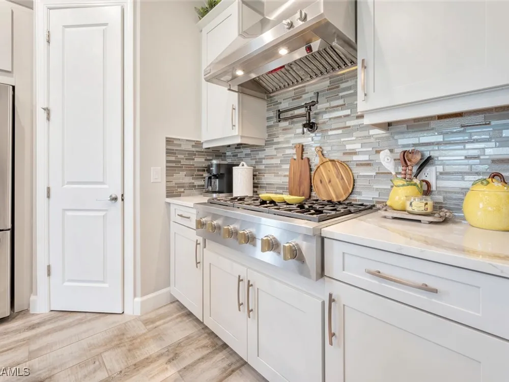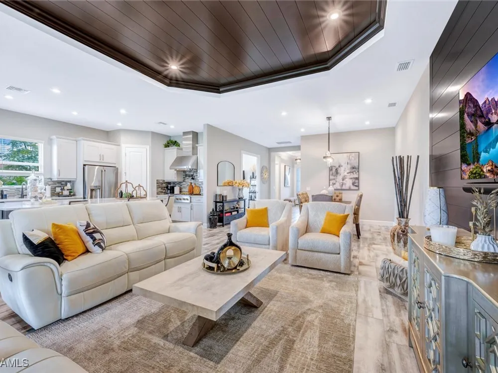 Experience unparalleled luxury in this immaculate, newly constructed residence, completed in 2022. Nestled in the prestigious Esplanade by the Islands community, this Lazio model home is replete with opulent upgrades designed to elevate your lifestyle. This exquisite property features three bedrooms, three bathrooms, and a versatile den, embodying the epitome of Florida's ultra-luxurious living. At the heart of this splendid home are a chef’s dream kitchen equipped with top-of-the-line stainless steel appliances, including a six-burner gas cooktop and a built-in oven/microwave. The kitchen is adorned with upgraded cabinetry, sleek quartz countertops, sophisticated designer lighting, and a stylish backsplash. Additional cabinetry beneath the expansive island enhances functionality and style. The thoughtful floor plan boasts wood-look tile flooring throughout and is accentuated by designer lighting fixtures. The great room, enhanced with newly installed shiplap, leads to an expansive lanai surrounded by lush landscaping, pre-wired for a future pool and outdoor kitchen—ideal for seamless indoor-outdoor living. Oversized, light-filled bedrooms offer a serene retreat for guests, complete with access to the numerous amenities that Esplanade has to offer. The bathrooms are a masterpiece of design, featuring exquisite vanities, premium quartz and granite countertops, and designer tile work. The luxurious primary suite is a sanctuary in itself, highlighted by a charming bay window and an expansive en-suite bathroom. This spa-like bath includes a vast walk-in shower, a lavish vanity with a makeup area, designer tile, and a spacious walk-in closet. A beautifully appointed and efficient laundry room with upgraded cabinetry and new appliances adds to the home’s conveniences. Residents of Esplanade by the Islands enjoy access to exceptional amenities, including tennis and pickleball courts, a comprehensive fitness center, eight miles of scenic walking trails, upscale dining options, and a magnificent pool and spa area. Drawing inspiration from its sister community, Esplanade Golf on Immokalee Road, it offers an idyllic setting close to Marco Island and Old Naples—putting the best of Southwest Florida right at your doorstep.