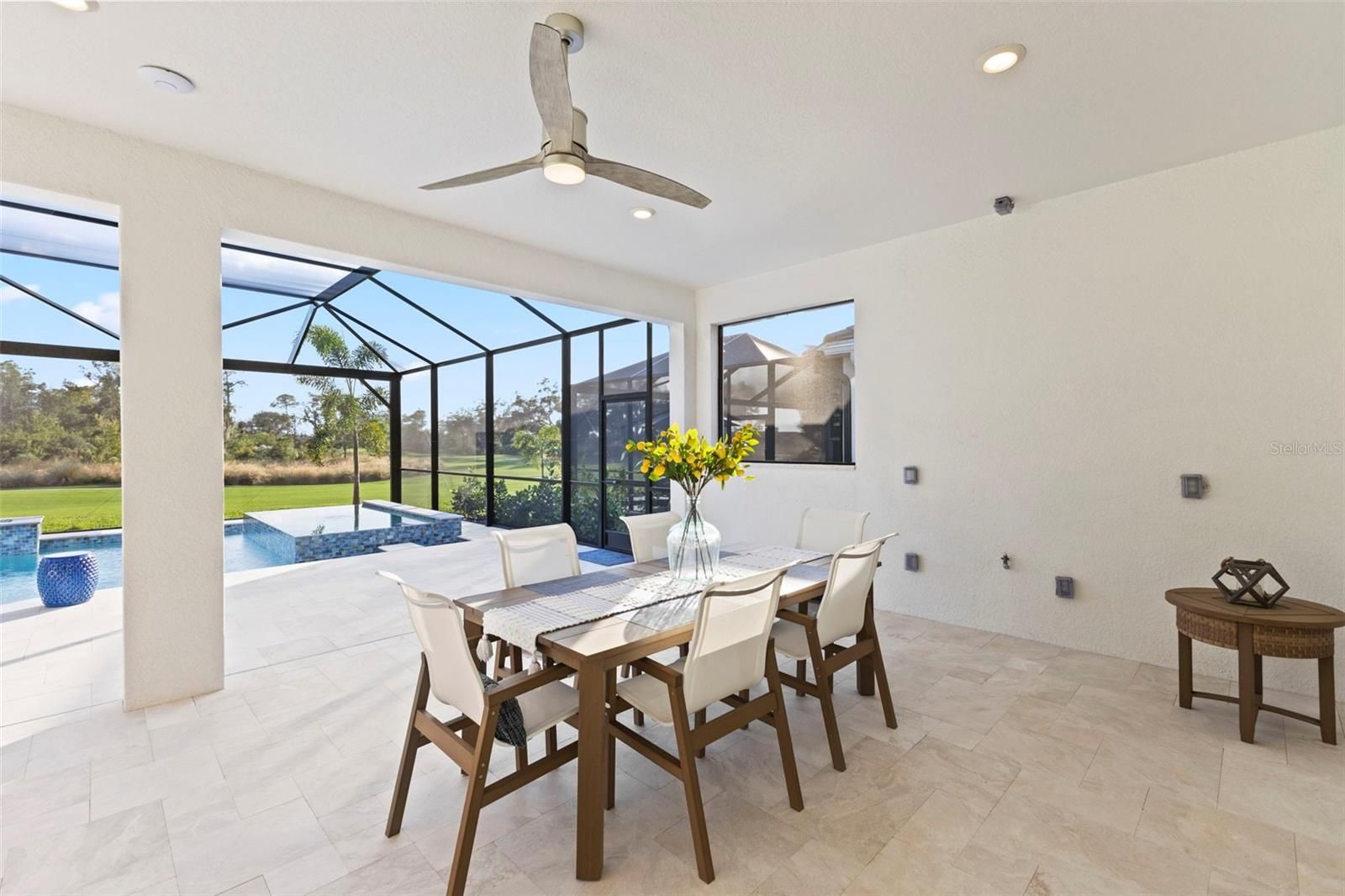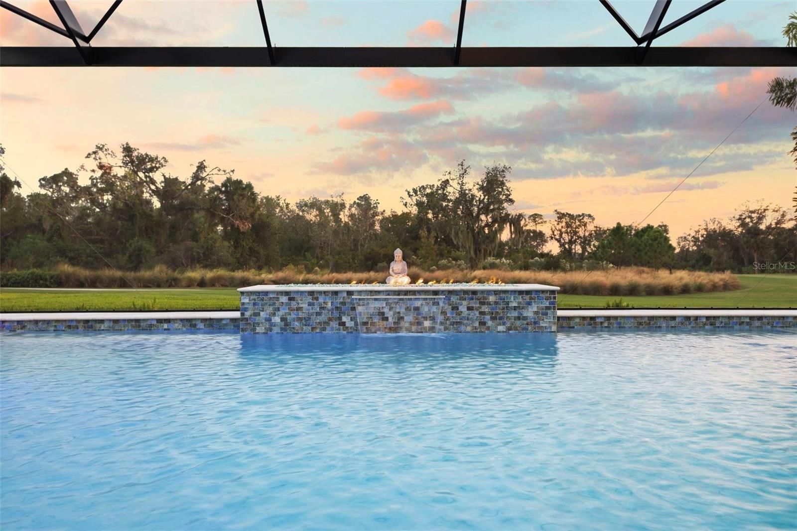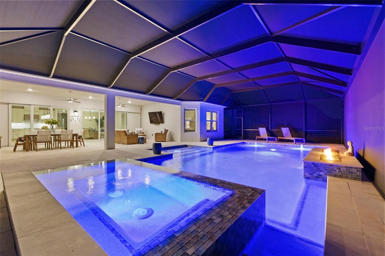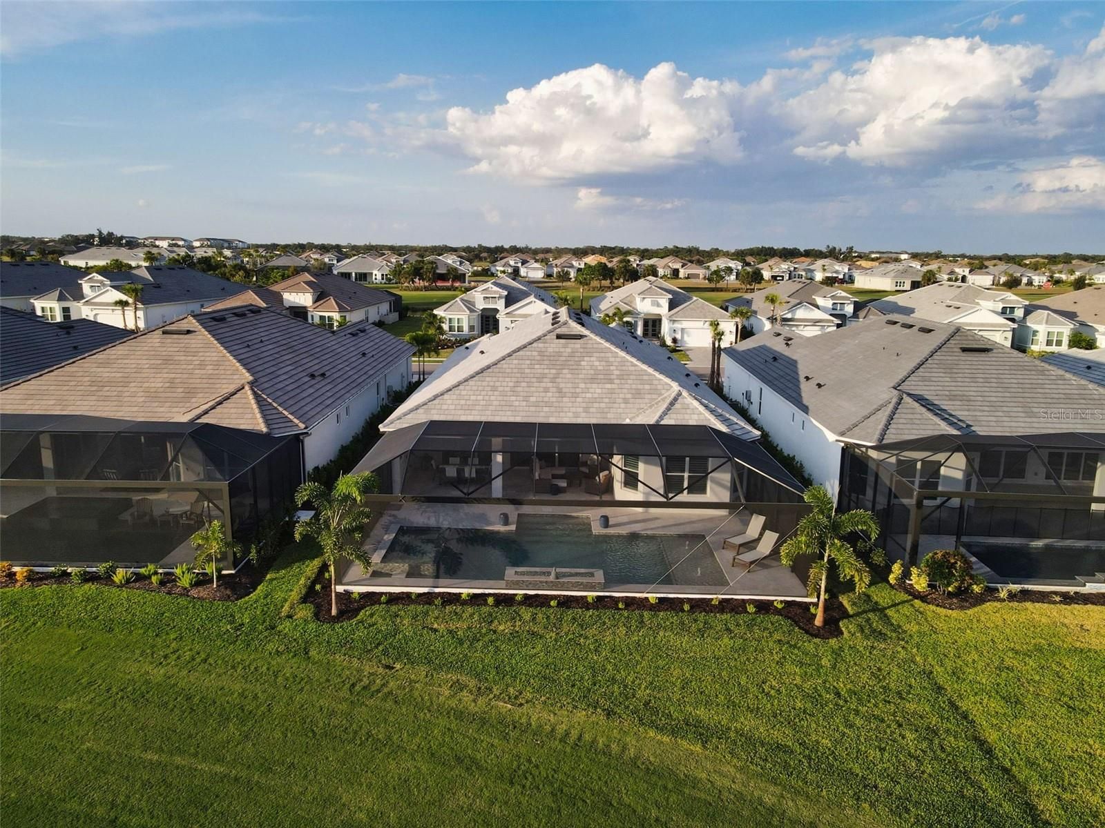 Perfectly positioned along the manicured fairways of Esplanade at Azario golf community, 15320 San Lazzaro comes completely FURNISHED. This masterfully crafted residence that embodies modern luxury and resort-style living. Spanning 3,218 square feet, this newly built 2025 home offers 4 bedrooms plus a den and 3 bathrooms. This GOLF DEEDED residence pairs hurricane-impact construction with refined design, architectural detail, and exceptional indoor-outdoor living, creating a true sanctuary in Lakewood Ranch. The garage has 3 spaces, a tandem garage with epoxy flooring. The home makes a striking first impression with its elevated presence. A wide paver driveway leads to a coastal-inspired façade accented by soft lighting and lush landscaping. Inside, a stone-tiled foyer welcomes you through glass double doors into a bright, open layout filled with natural light. Extra-wide plank flooring, crown molding, designer feature walls and ceilings, and a custom barn door add warmth and character. Every finish is thoughtfully selected, balancing timeless style with modern elegance. At the heart of the home, the gourmet kitchen is designed for both beauty and function. A massive quartz-topped island with abundant storage anchors the space, complemented by a Sub-Zero refrigerator, Wolf gas cooktop and ovens, Bosch dishwasher, slow-close cabinetry, custom marble tile backsplash, under-cabinet lighting, appliance pantry, and designer pendant lighting. The kitchen overlooks the great room and lanai, making it ideal for everyday living and entertaining. The great room features coffered tray ceilings and a custom shiplap accent wall framing the entertainment area. A full wall of glass opens to the expansive outdoor retreat, where a panoramic screen enclosure surrounds a heated saltwater pool, waterfall spa, sun shelf with bubblers, dramatic fire feature, and multiple covered lounge and dining areas. This space seamlessly blends comfort and luxury for unforgettable gatherings. The primary suite is a peaceful retreat with custom ceiling and wall details, a bay window overlooking the pool, a custom-designed walk-in closet, and a spa-inspired bathroom with seated vanity and oversized tiled shower. Three additional bedrooms and beautifully finished bathrooms provide flexible space for guests, family, hobbies, or a private office, all filled with natural light. Beyond the home, Azario delivers one of Florida’s most complete lifestyle experiences. Residents enjoy a signature restaurant with refined dining, a wellness-focused spa with serene relaxation spaces, and a resort-style complex featuring a lagoon pool, cabanas, palm-lined decks, and multiple lounging areas. As a golf-deeded home, full access to the professional-caliber championship course is included, along with scenic walking paths, pickleball, tennis, bocce ball courts, fitness centers, and vibrant social clubs. 15320 San Lazzaro is more than a home—it’s a lifestyle statement. From Wolf appliances to the fire-lit pool, every detail reflects a commitment to quality, comfort, and elevated living within one of the area’s most sought-after resort communities. Request your private tour today.
