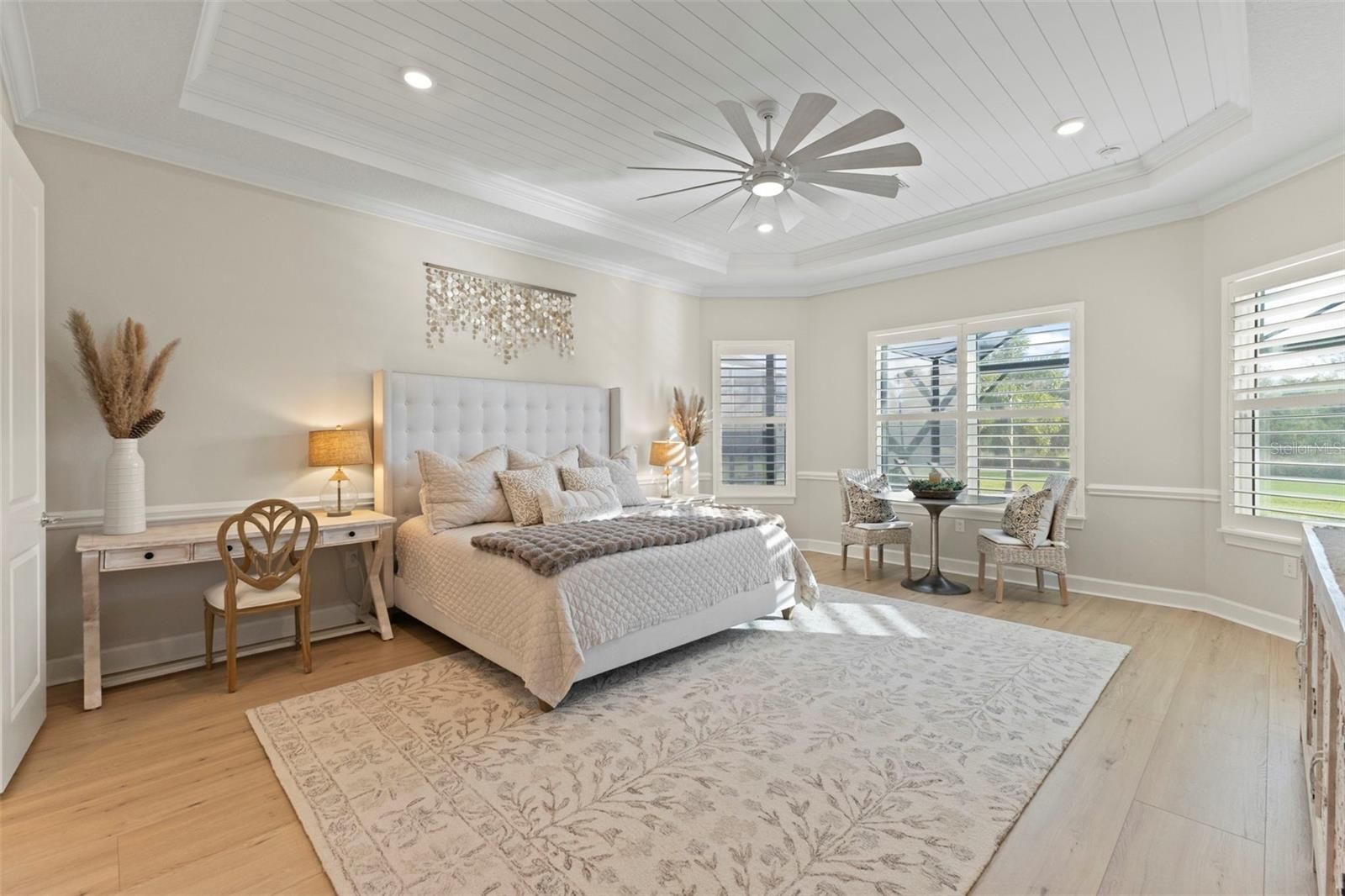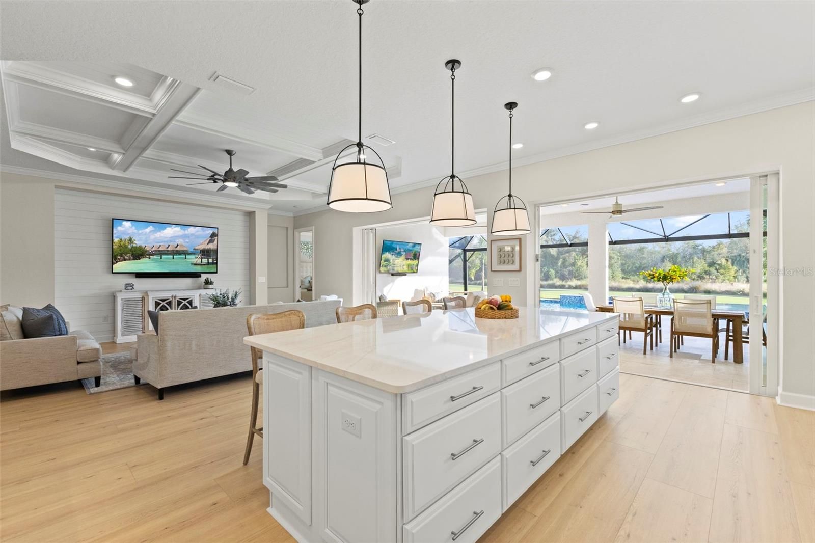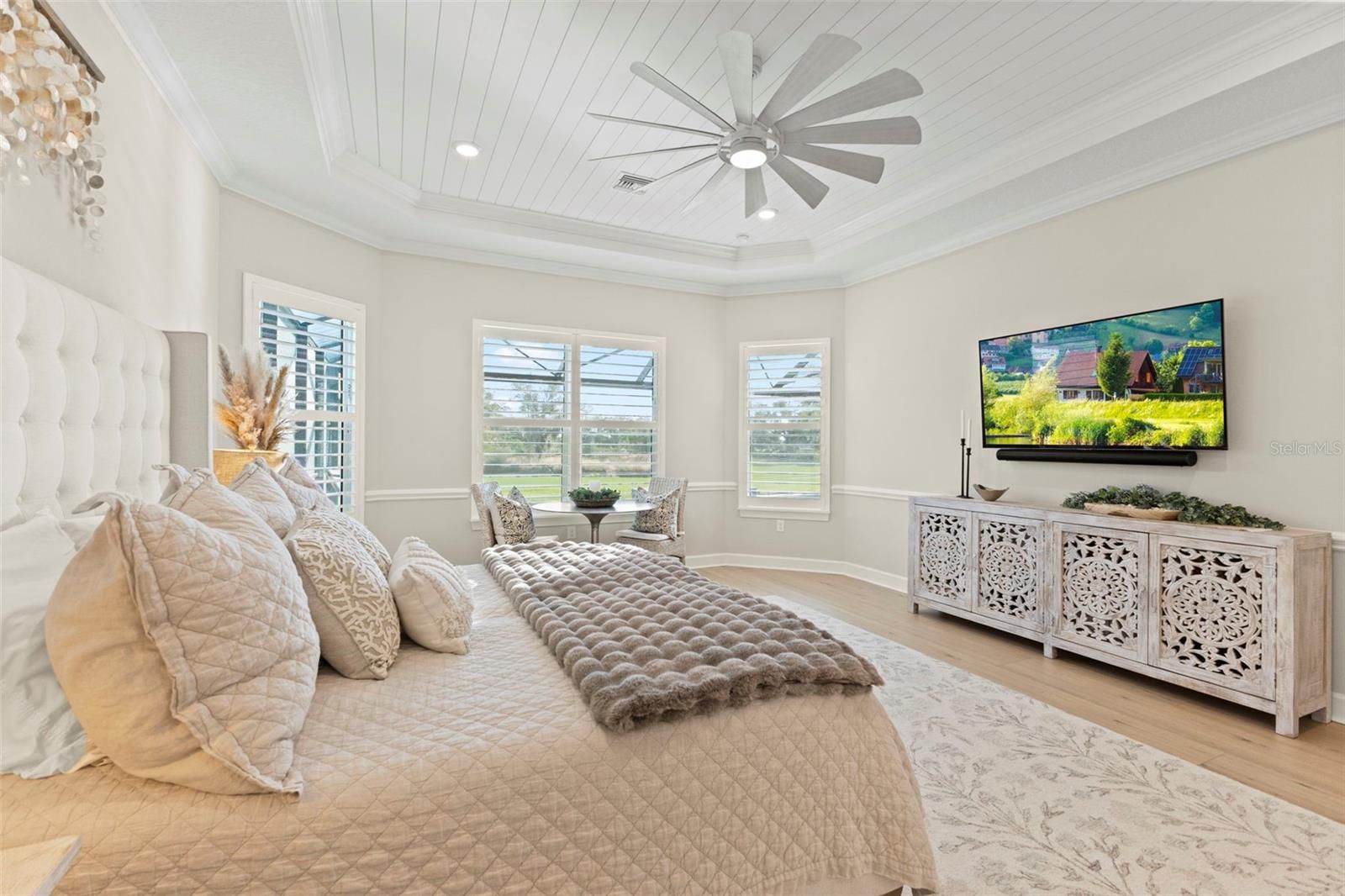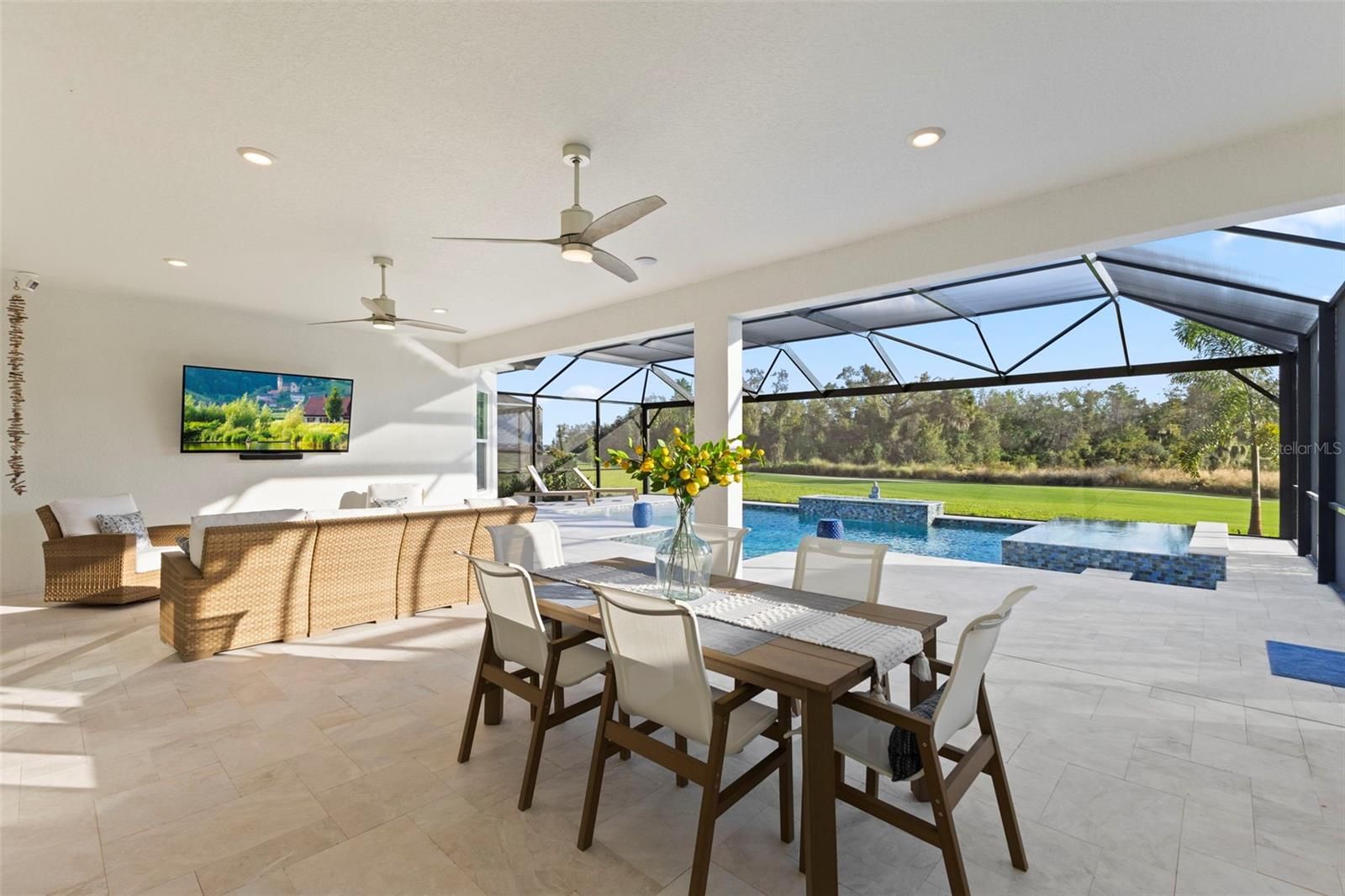 Perfectly positioned along the manicured fairways of Esplanade at Azario golf community, 15320 San Lazzaro comes completely FURNISHED. This masterfully crafted residence that embodies modern luxury and resort-style living. Spanning 3,218 square feet, this newly built 2025 home offers 4 bedrooms plus a den and 3 bathrooms. This GOLF DEEDED residence pairs hurricane-impact construction with refined design, architectural detail, and exceptional indoor-outdoor living, creating a true sanctuary in Lakewood Ranch. The garage has 3 spaces, a tandem garage with epoxy flooring. The home makes a striking first impression with its elevated presence. A wide paver driveway leads to a coastal-inspired façade accented by soft lighting and lush landscaping. Inside, a stone-tiled foyer welcomes you through glass double doors into a bright, open layout filled with natural light. Extra-wide plank flooring, crown molding, designer feature walls and ceilings, and a custom barn door add warmth and character. Every finish is thoughtfully selected, balancing timeless style with modern elegance. At the heart of the home, the gourmet kitchen is designed for both beauty and function. A massive quartz-topped island with abundant storage anchors the space, complemented by a Sub-Zero refrigerator, Wolf gas cooktop and ovens, Bosch dishwasher, slow-close cabinetry, custom marble tile backsplash, under-cabinet lighting, appliance pantry, and designer pendant lighting. The kitchen overlooks the great room and lanai, making it ideal for everyday living and entertaining. The great room features coffered tray ceilings and a custom shiplap accent wall framing the entertainment area. A full wall of glass opens to the expansive outdoor retreat, where a panoramic screen enclosure surrounds a heated saltwater pool, waterfall spa, sun shelf with bubblers, dramatic fire feature, and multiple covered lounge and dining areas. This space seamlessly blends comfort and luxury for unforgettable gatherings. The primary suite is a peaceful retreat with custom ceiling and wall details, a bay window overlooking the pool, a custom-designed walk-in closet, and a spa-inspired bathroom with seated vanity and oversized tiled shower. Three additional bedrooms and beautifully finished bathrooms provide flexible space for guests, family, hobbies, or a private office, all filled with natural light. Beyond the home, Azario delivers one of Florida’s most complete lifestyle experiences. Residents enjoy a signature restaurant with refined dining, a wellness-focused spa with serene relaxation spaces, and a resort-style complex featuring a lagoon pool, cabanas, palm-lined decks, and multiple lounging areas. As a golf-deeded home, full access to the professional-caliber championship course is included, along with scenic walking paths, pickleball, tennis, bocce ball courts, fitness centers, and vibrant social clubs. 15320 San Lazzaro is more than a home—it’s a lifestyle statement. From Wolf appliances to the fire-lit pool, every detail reflects a commitment to quality, comfort, and elevated living within one of the area’s most sought-after resort communities. Request your private tour today.