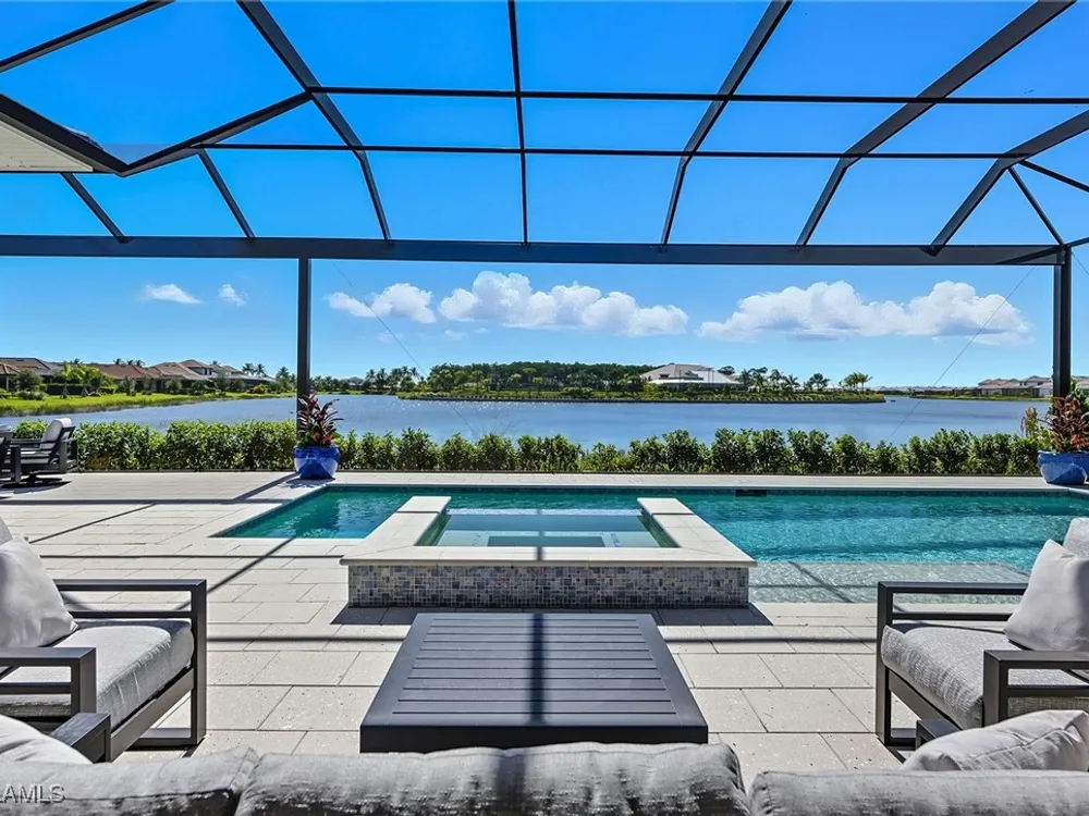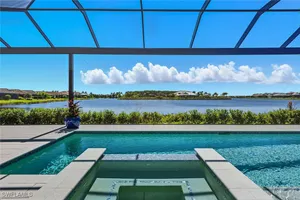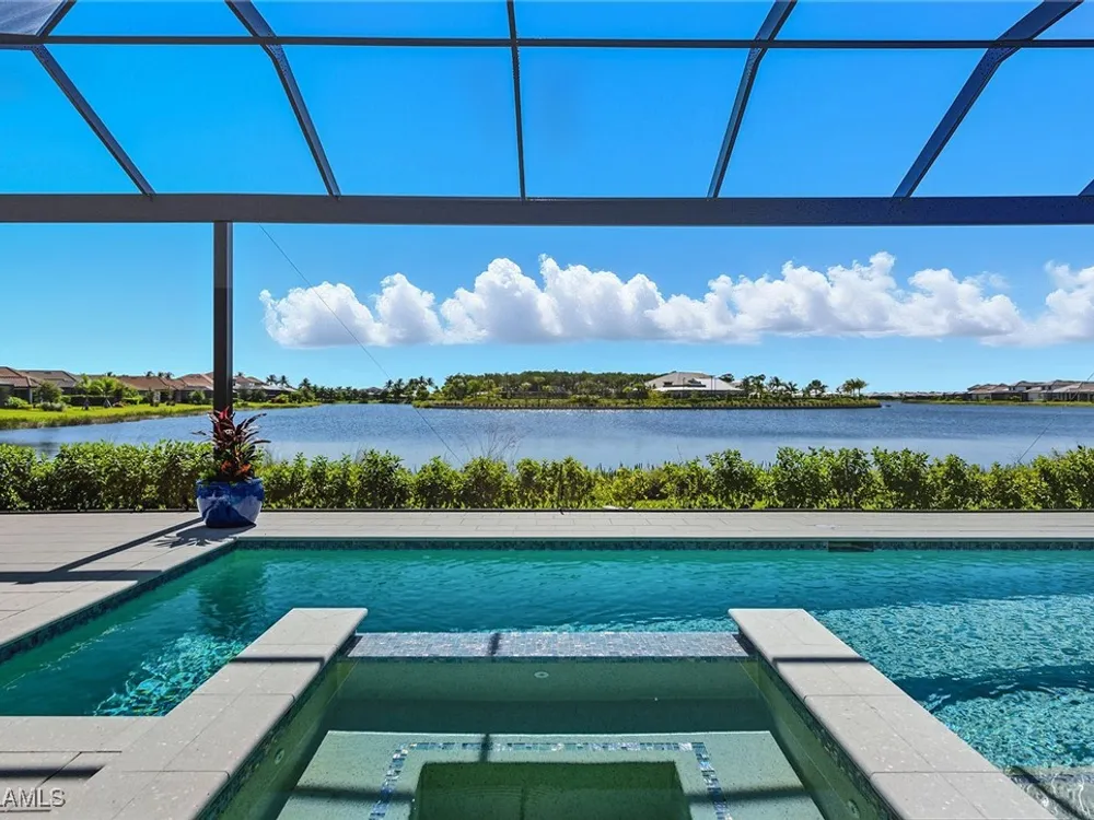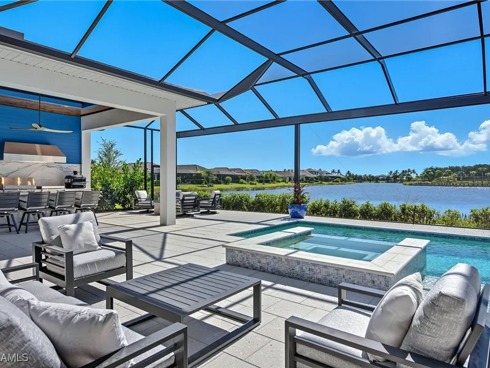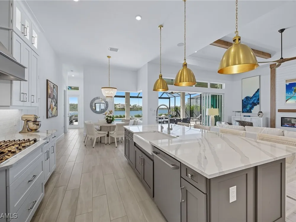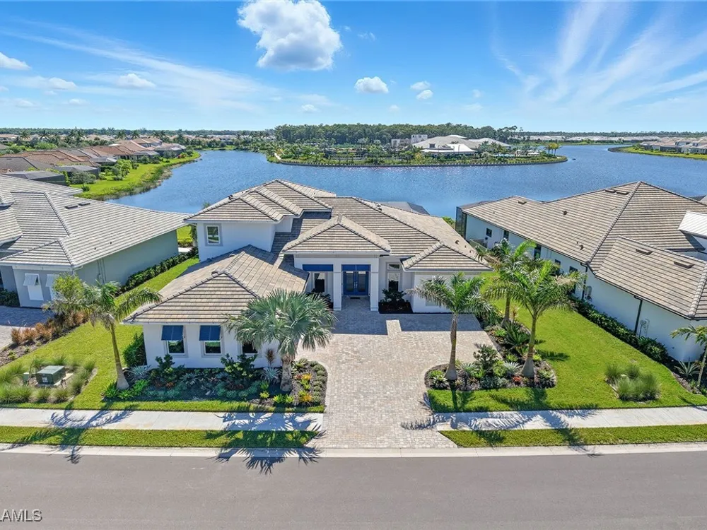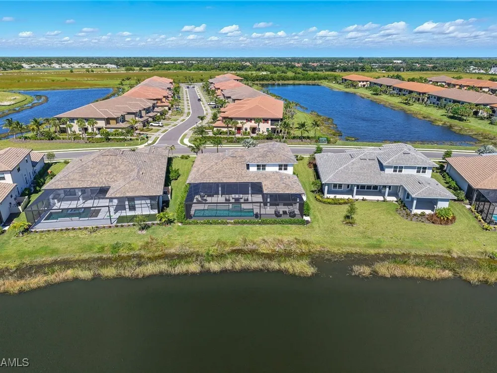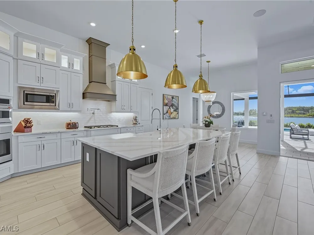 Experience modern luxury and breathtaking wide-water vistas from this magnificent newly built and fully furnished two-story residence in the popular gated community of Esplanade by the Islands. Completed in 2024, this better-than-new masterpiece was designed to capture unobstructed lake views from nearly every room-offering a serene and elegant backdrop for everyday living. Exquisite craftsmanship is evident throughout, with extensive millwork, refined finishes, and upgraded landscaping and lighting that elevate its exceptional curb appeal. Featuring four bedrooms plus a den, four full and two half baths, and a three-car garage, this residence seamlessly combines sophistication, comfort and functionality. Go through impressive impact-rated double doors into an open-concept living space highlighted by tray ceilings, designer chandeliers, transom windows and recessed lighting. The great room showcases a shiplap accent wall, built-in fireplace, and expansive glass sliders that open to the lanai for effortless indoor-outdoor living. The gourmet kitchen is a chef’s dream, complete with white shaker cabinetry, in- and under-cabinet lighting, quartz counters, white subway tile backsplash, dual beverage refrigerators and GE Café stainless appliances, including a natural gas cooktop. A large island with pendant lighting and an adjacent dining area create an inviting space for gatherings. The den, accented with French doors and a shiplap feature wall, offers a private workspace or cozy retreat. The primary suite is a peaceful sanctuary with panoramic pool and lake views, lanai access, dual walk-in closets and a spa-inspired bath featuring a soaking tub, dual quartz vanities and a frameless glass shower. Two main-level guest suites each offer walk-in closets and beautifully appointed en-suite baths, one with pool access. Upstairs, a spacious loft serves as an additional living and entertainment area, complete with a sleek wet bar featuring quartz counters, GE stainless appliances (mini refrigerator, dishwasher, microwave and sink), and an adjacent powder bath. A private guest bedroom with en-suite bath completes this level, providing a comfortable retreat with stunning lake views. The outdoor living area is an entertainer’s dream. Enjoy a panoramic screen enclosure, paver-tiled lanai, and a covered seating area with tongue-and-groove ceiling, recessed lighting, and a full outdoor kitchen complete with quartz counters and backsplash, grill, double-drawer refrigerator and island seating. Additional highlights include a wide brick-paver driveway, impact-resistant doors and windows, a tankless natural gas water heater, three Lennox air handlers, and a climate-controlled three-car garage with epoxy flooring, natural light and an air-conditioning mini split. Residents enjoy resort-style amenities, including a pool and spa, fitness center, pickleball and tennis courts, salon and spa services, and poolside dining at The Bahama Bar, with Culinary Center coming soon.